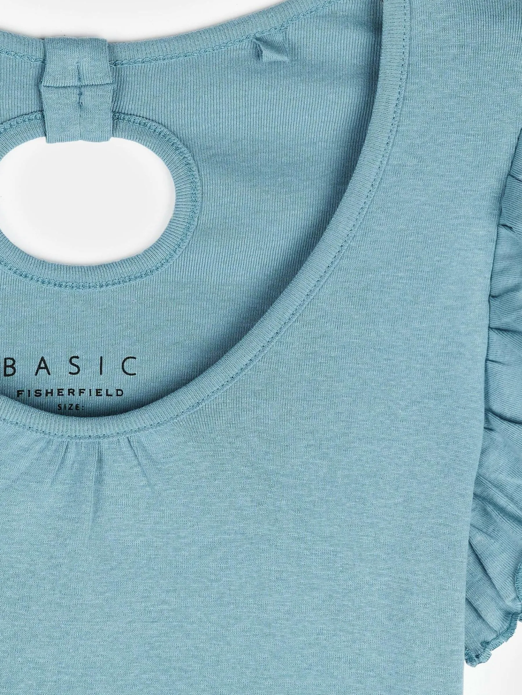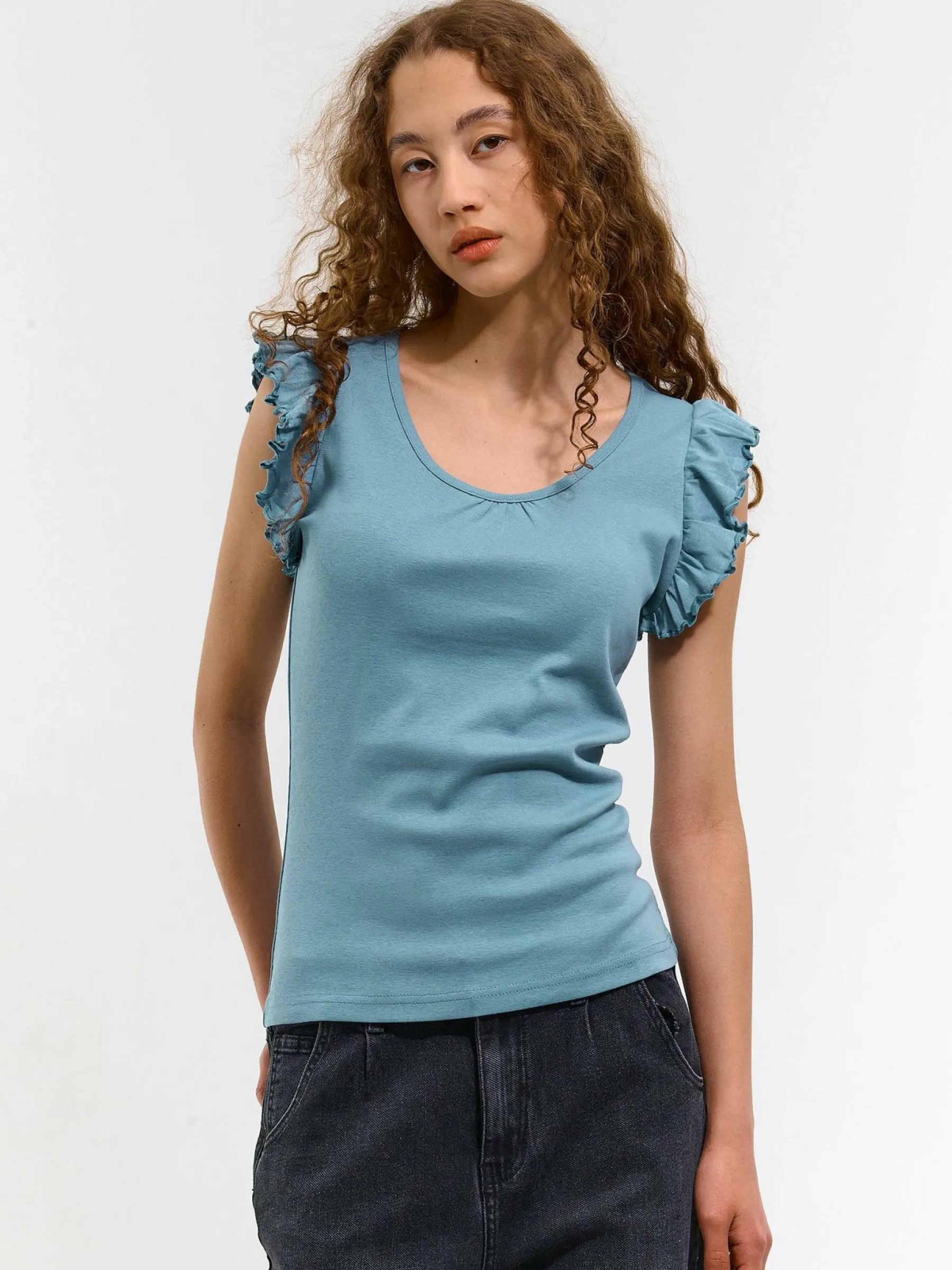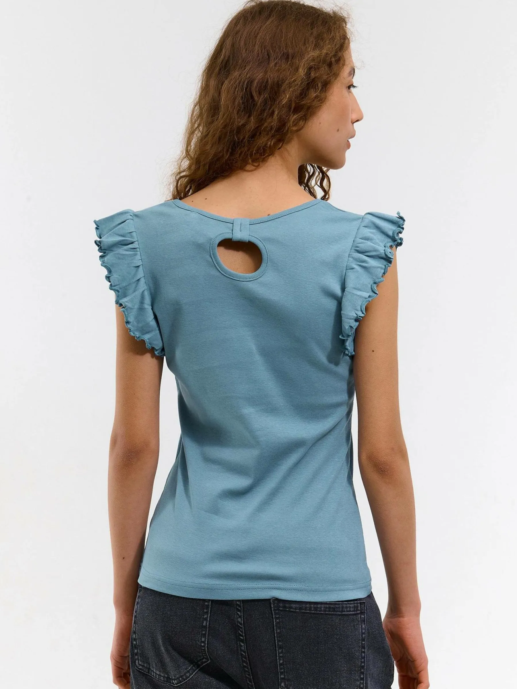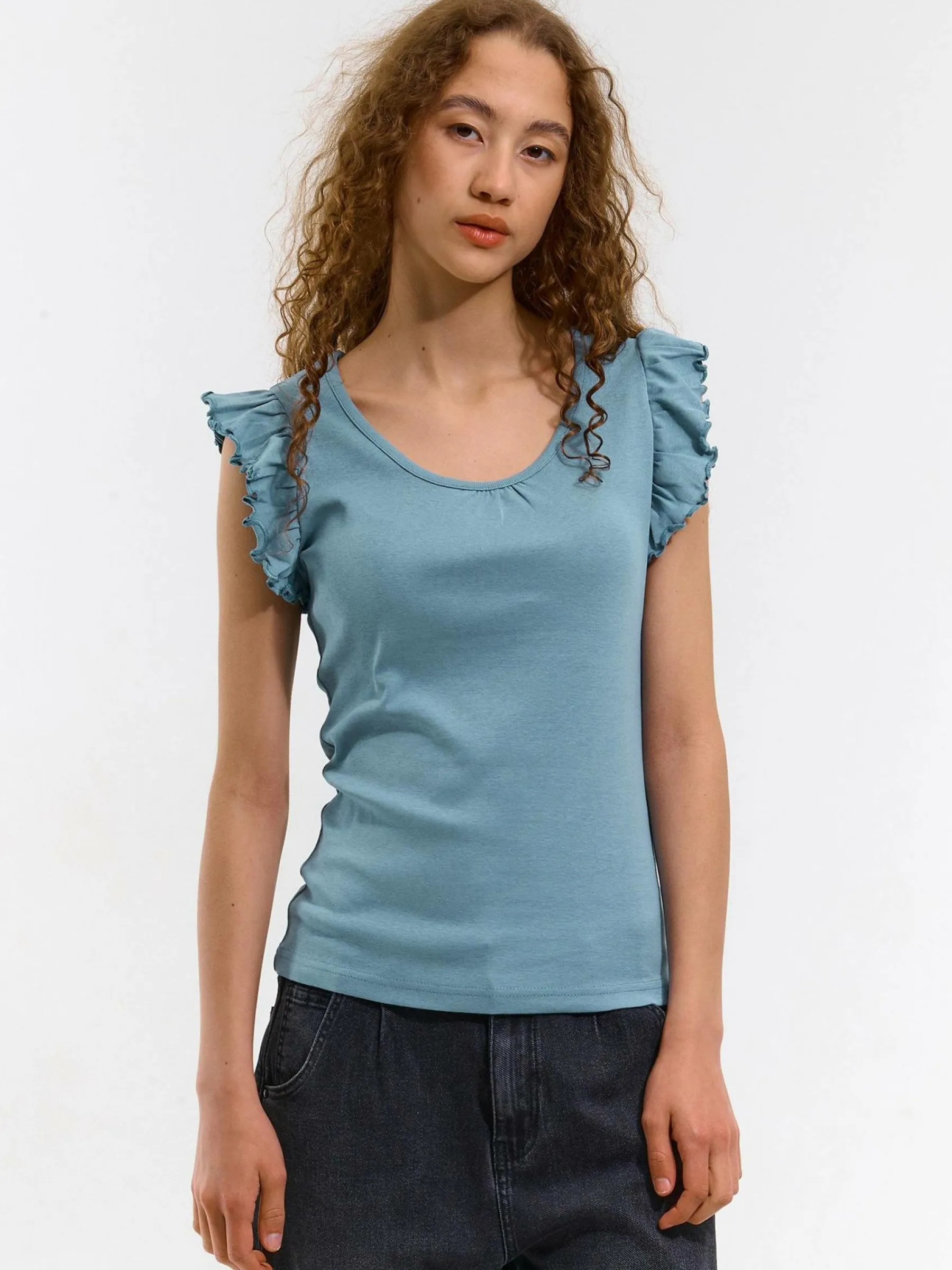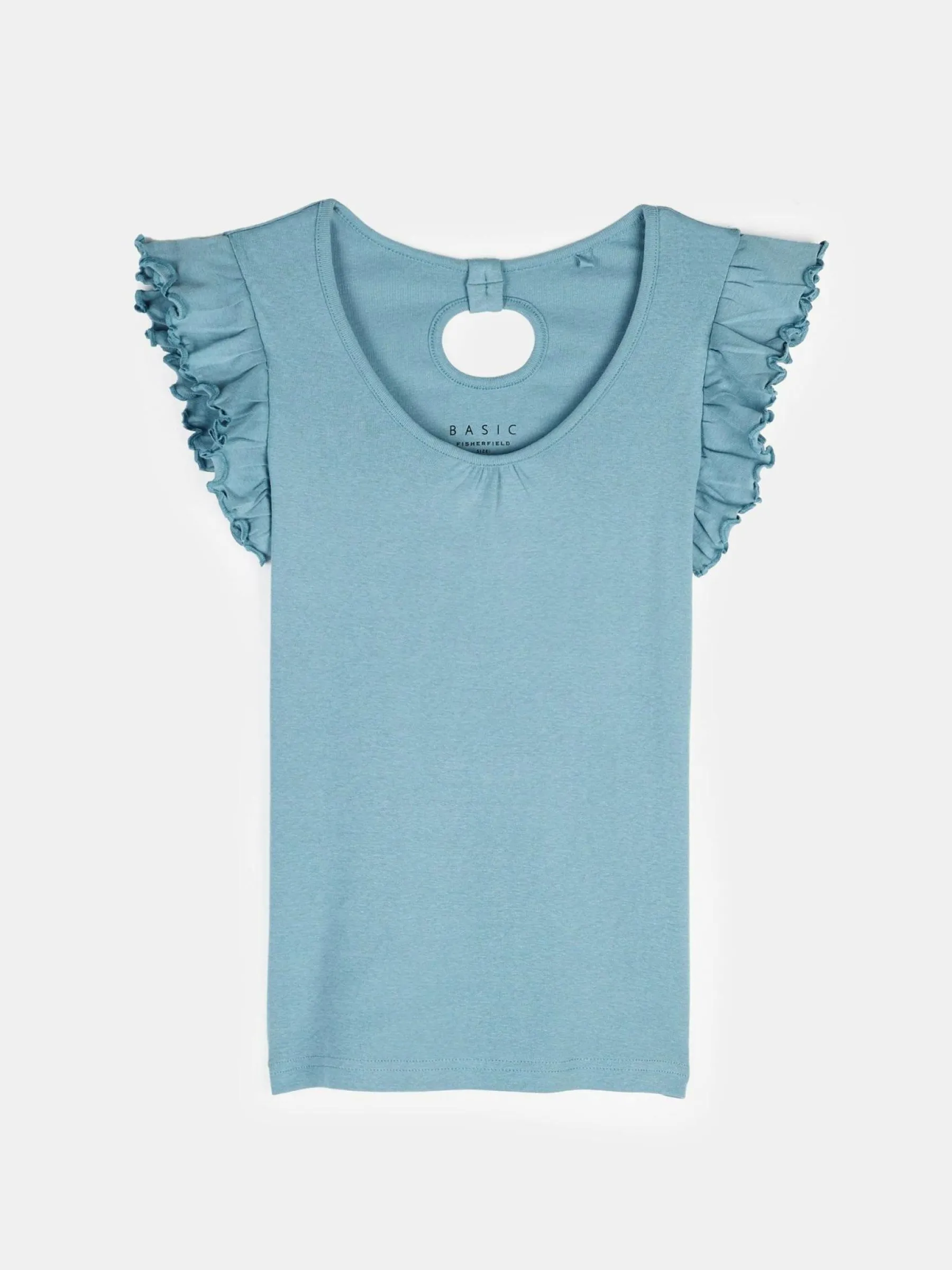 Kolor: niebieskiKrój: z falbanąTyp: koszulkaRekaw: krótki rękawDługość: krótkiPattern style: pojedynczy kolorDet…
