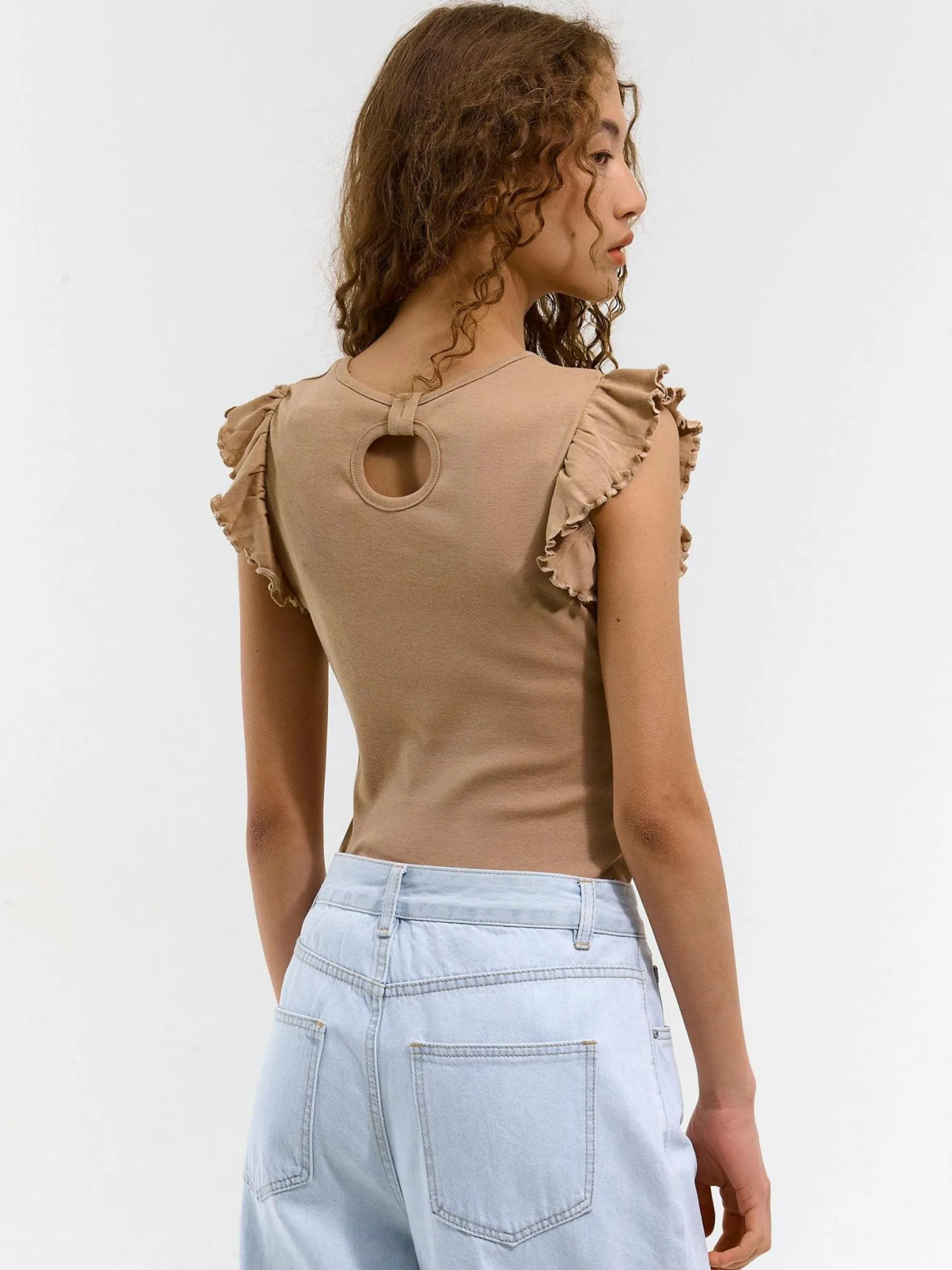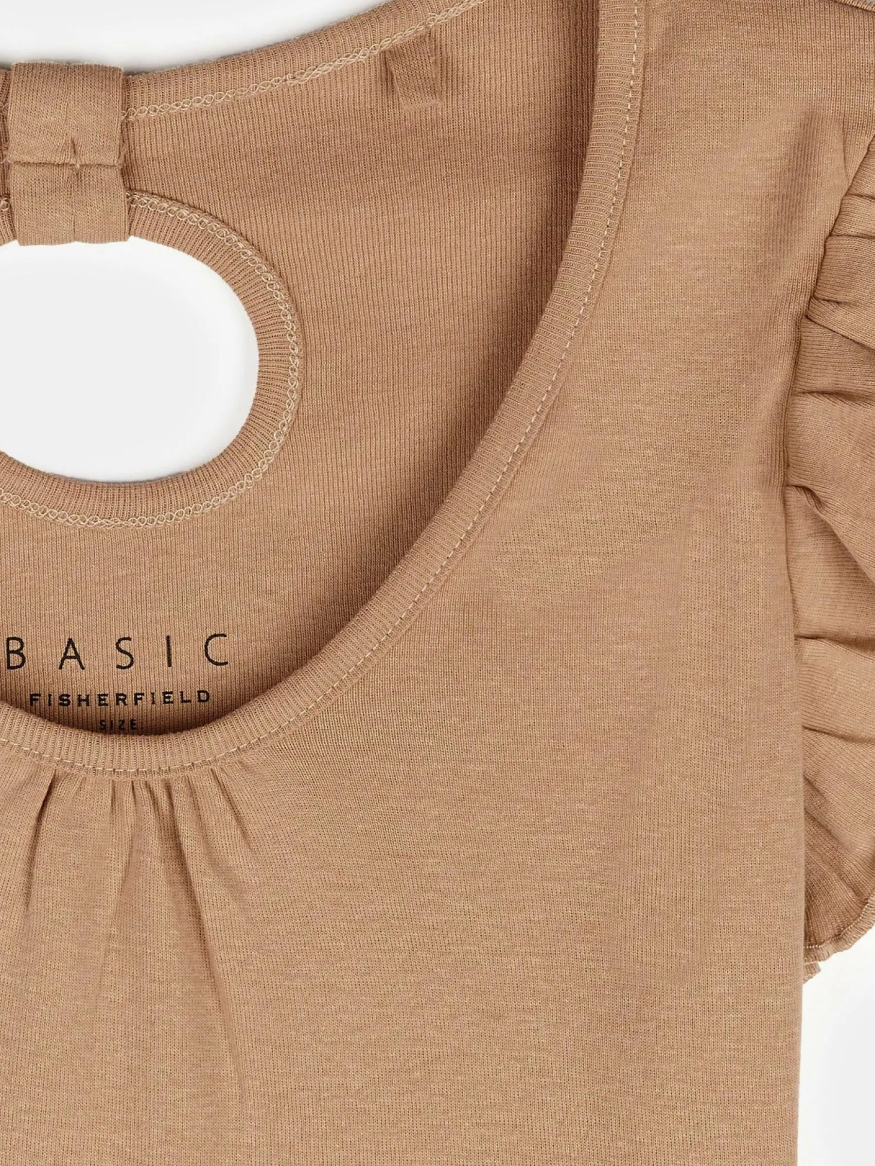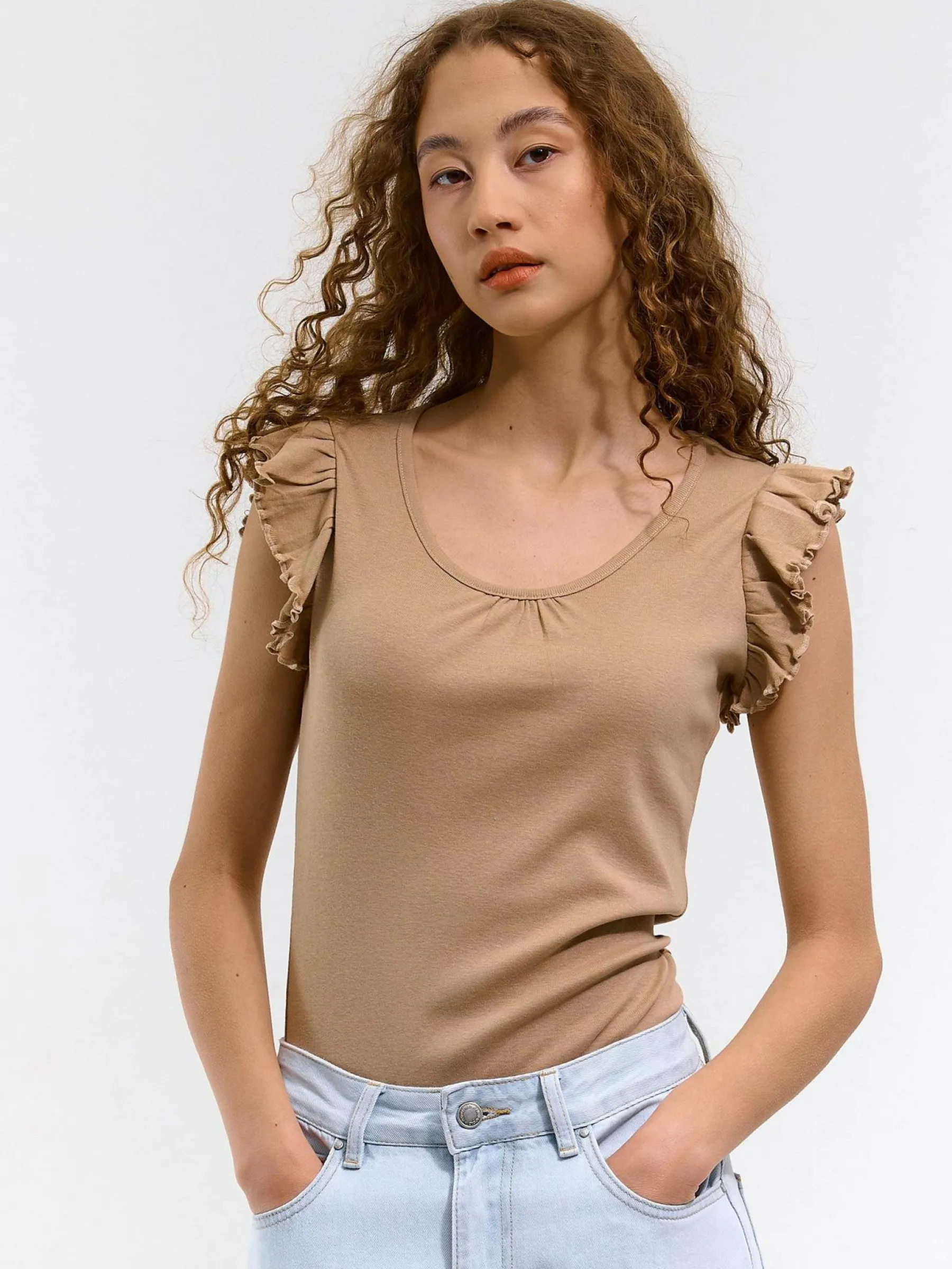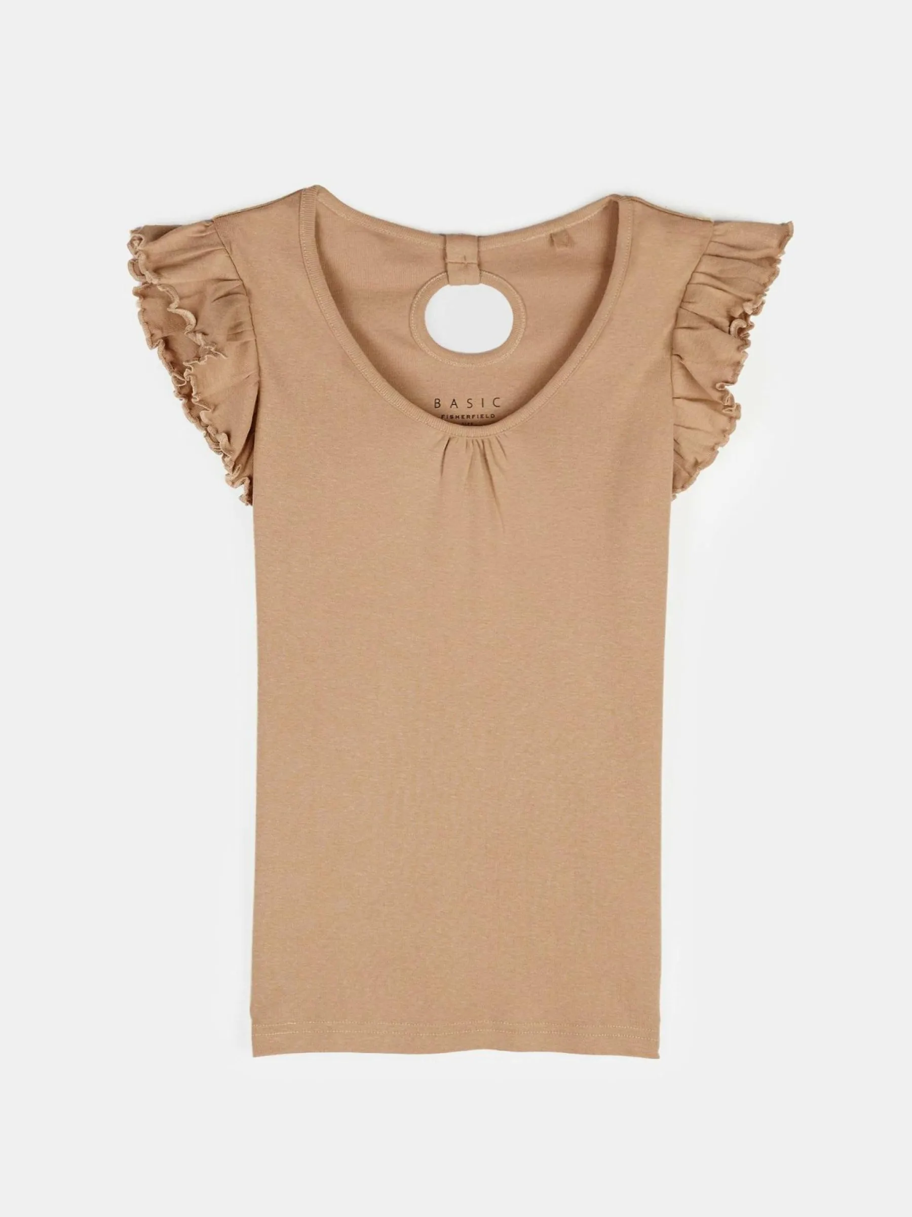 Kolor: beżowy, brązowyKrój: z falbanąTyp: koszulkaRekaw: krótki rękawDługość: krótkiPattern style: pojedynczy …
