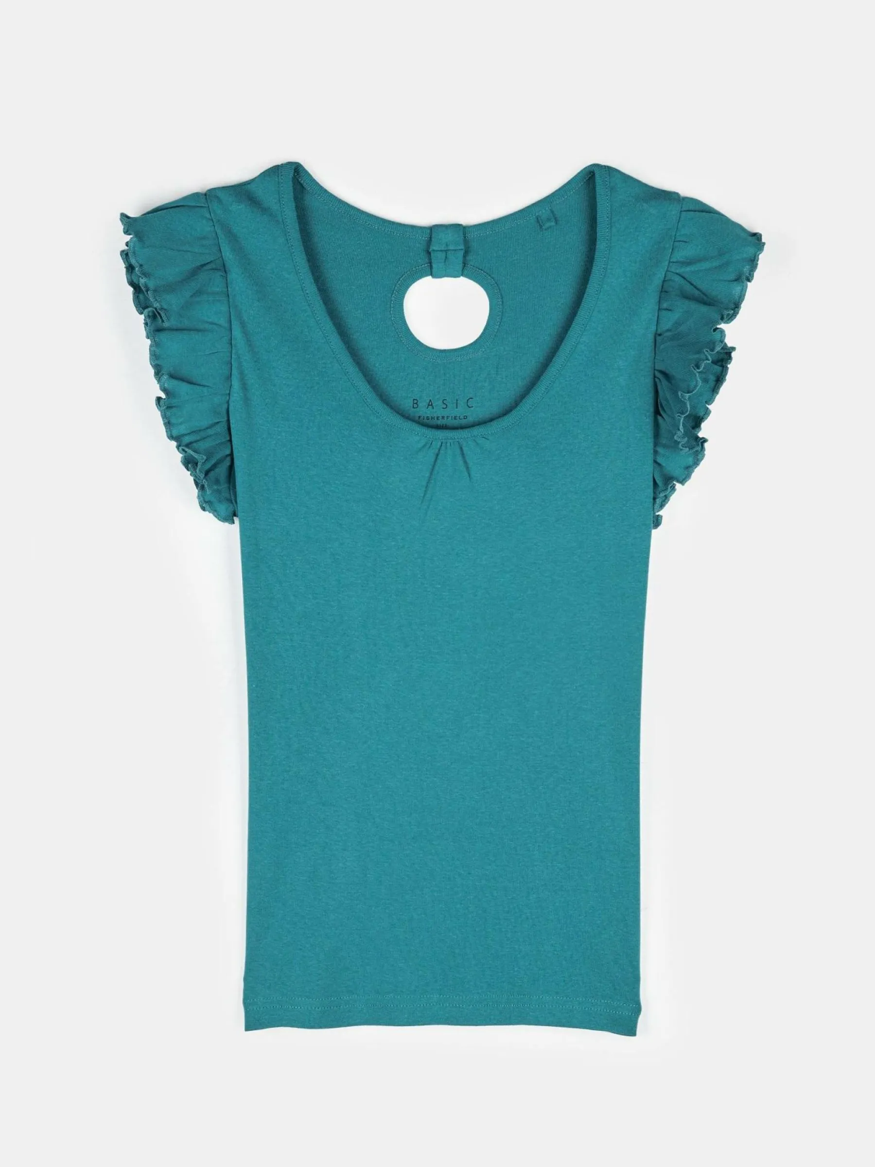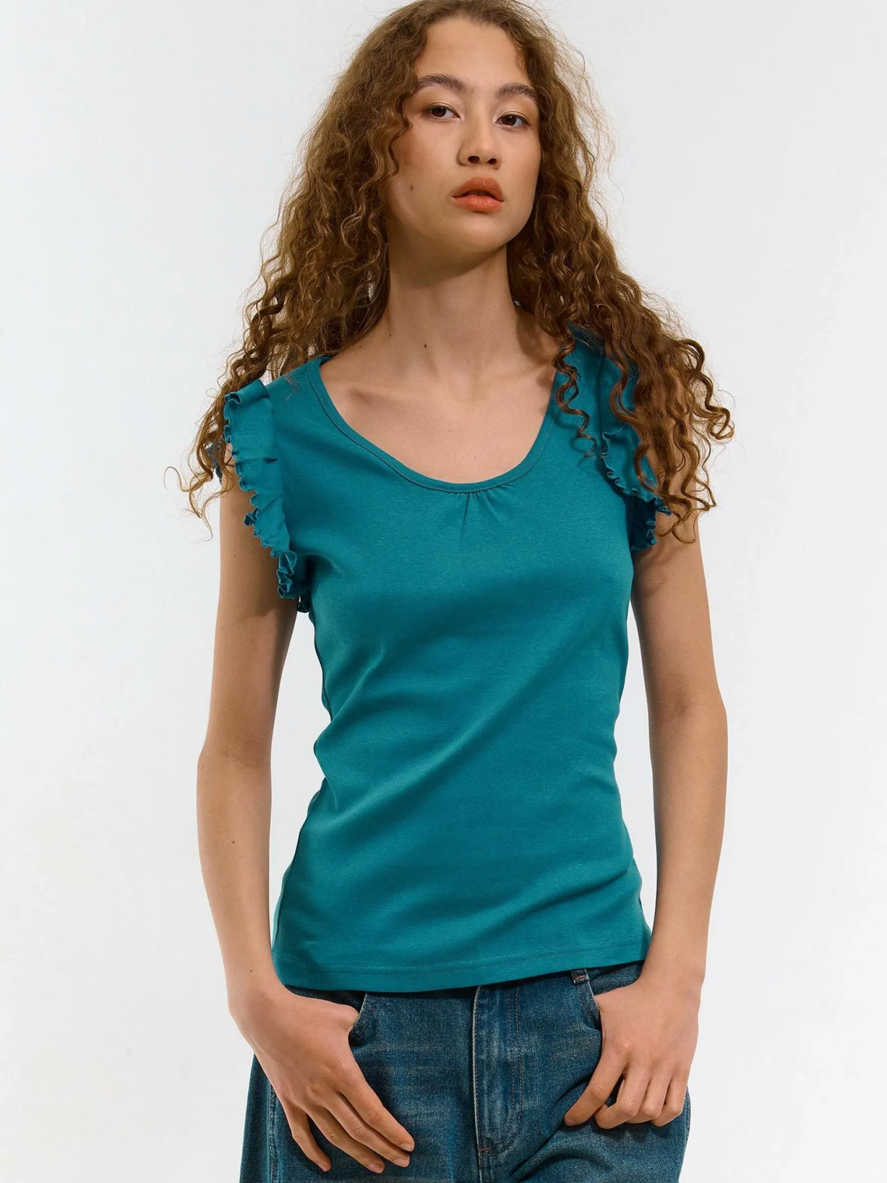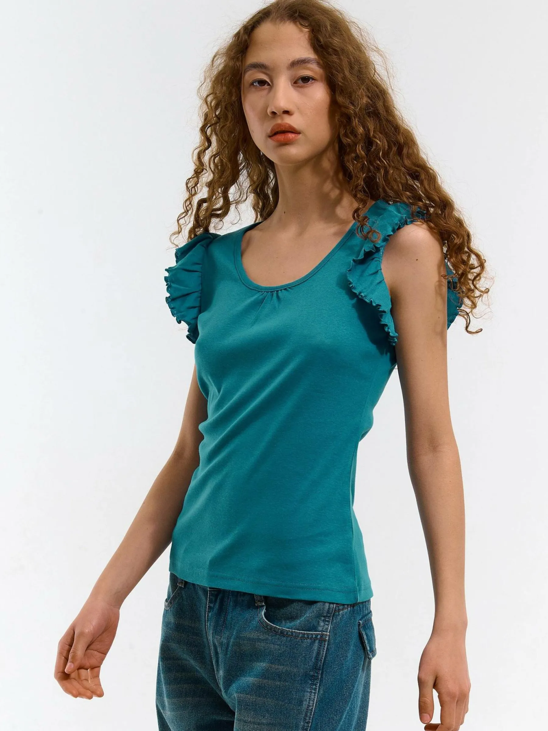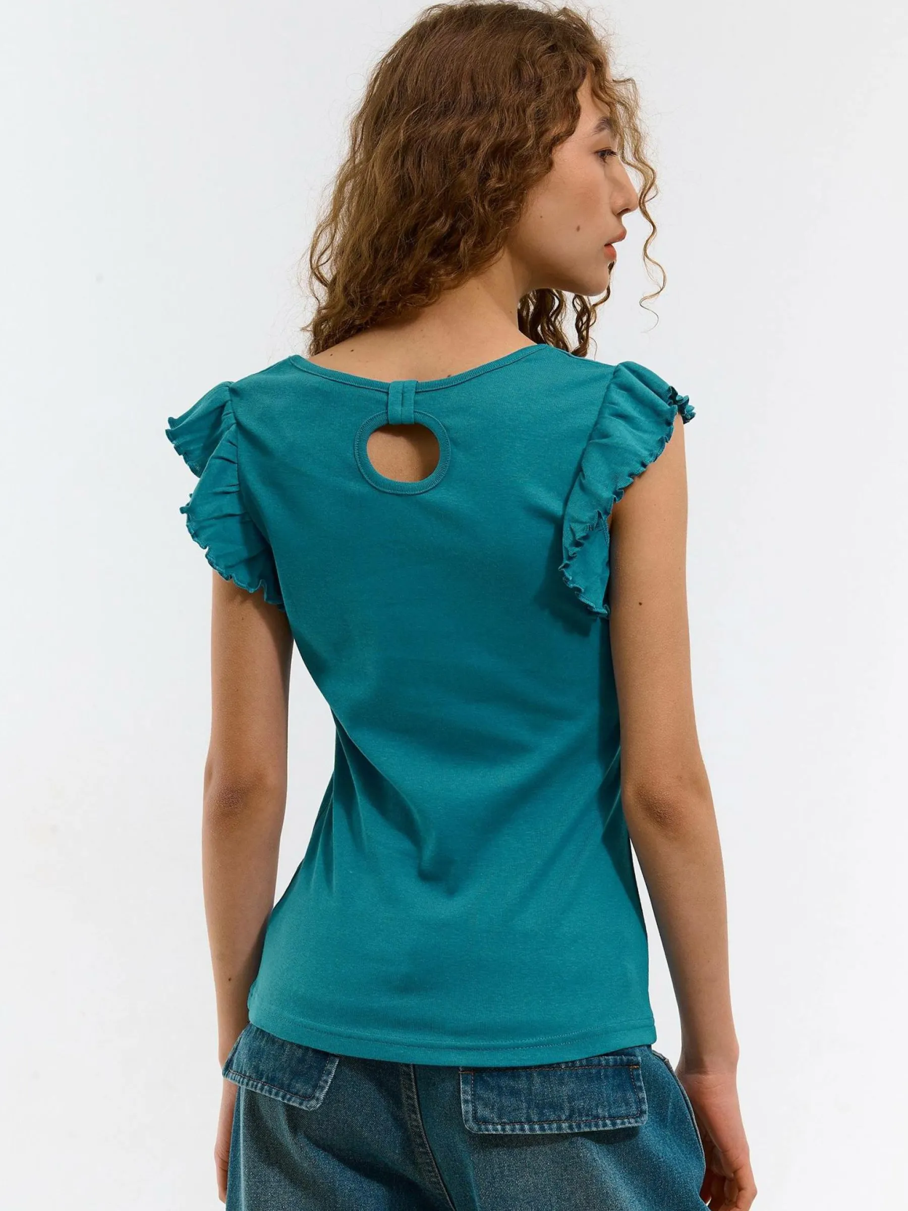 Kolor: zielonyKrój: z falbanąTyp: koszulkaRekaw: krótki rękawDługość: krótkiPattern style: pojedynczy kolorDetal…