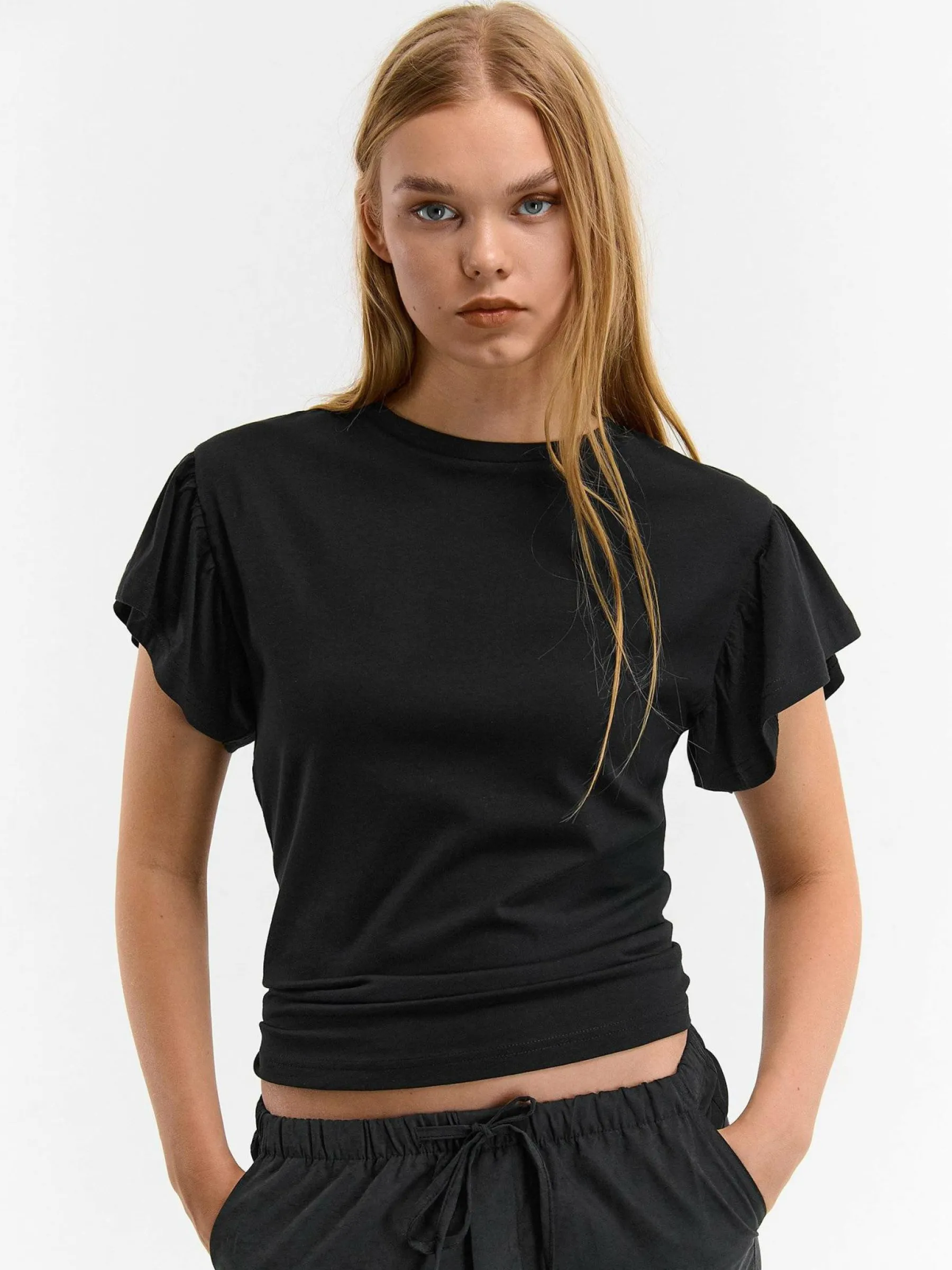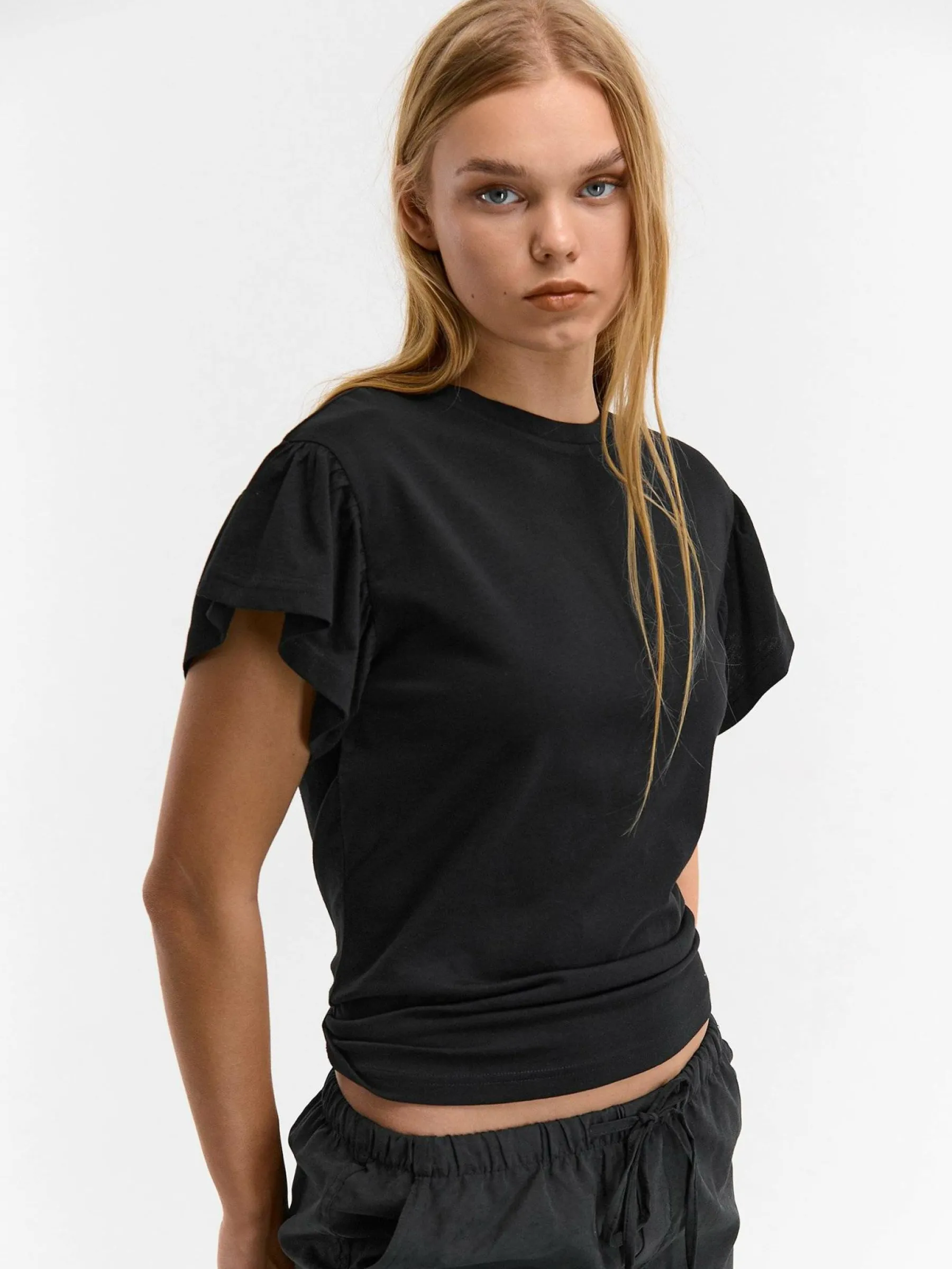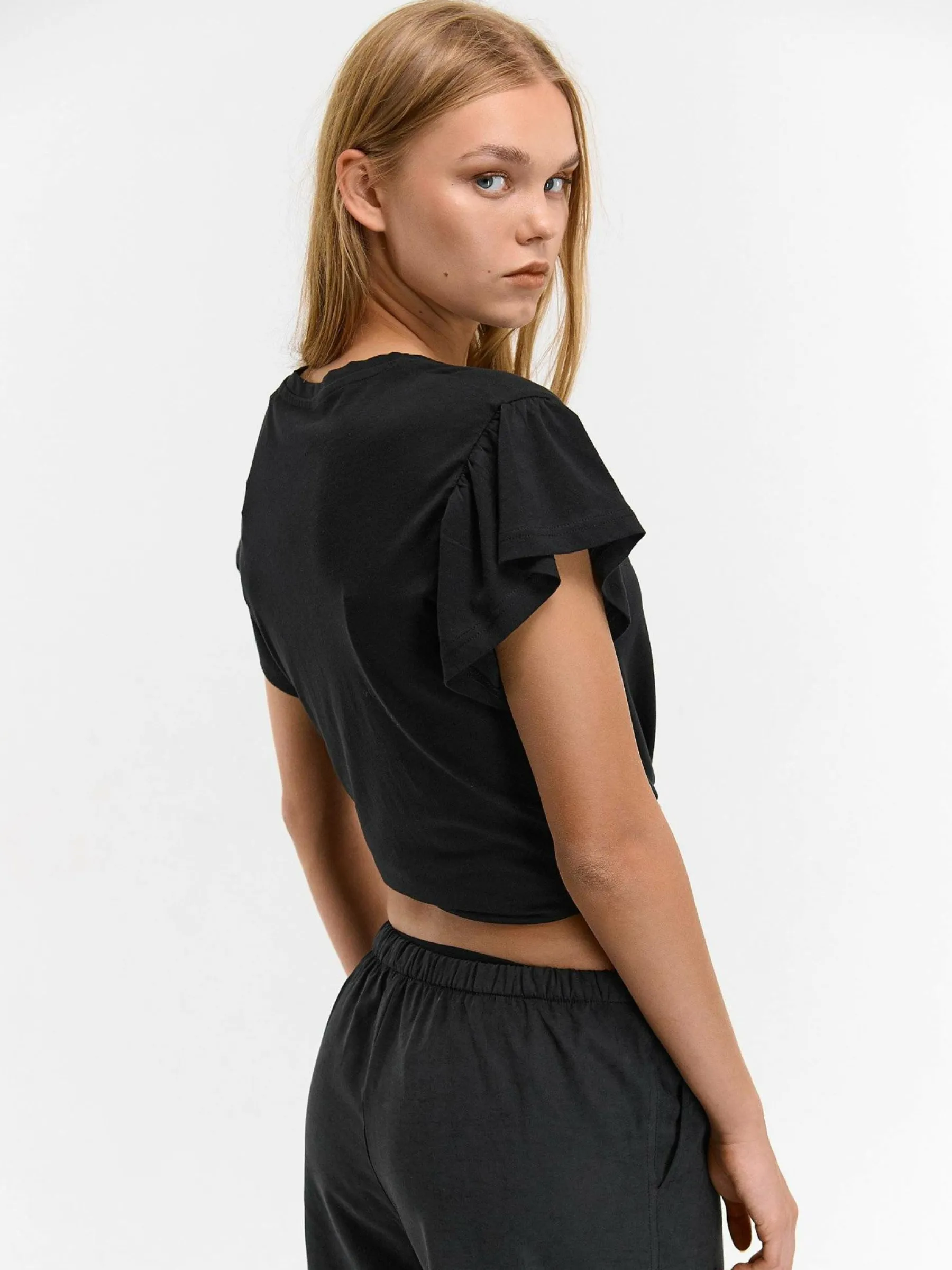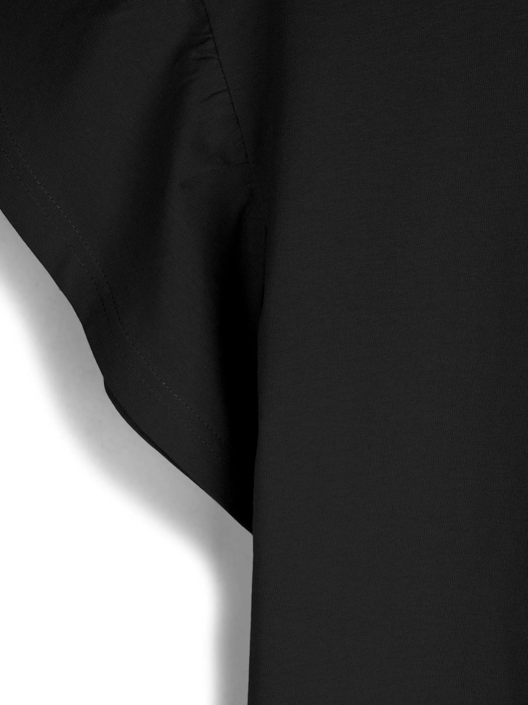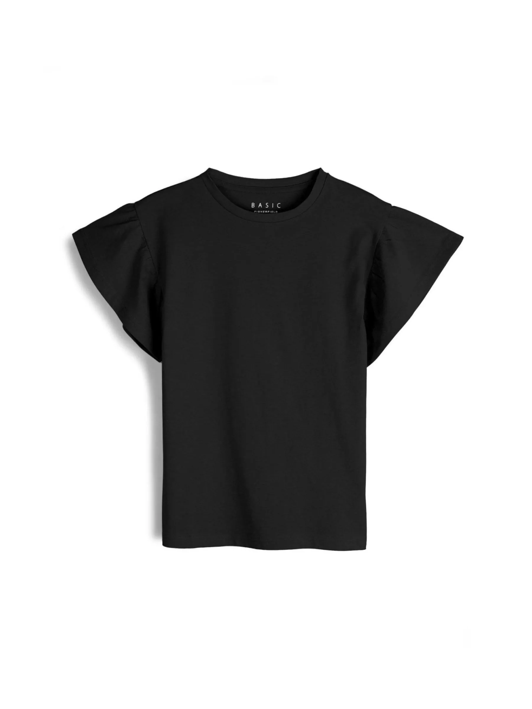 Kolor: czarnyKrój: z falbanąTyp: koszulkaRekaw: krótki rękawDługość: krótkiPattern style: pojedynczy kolorDetal:…