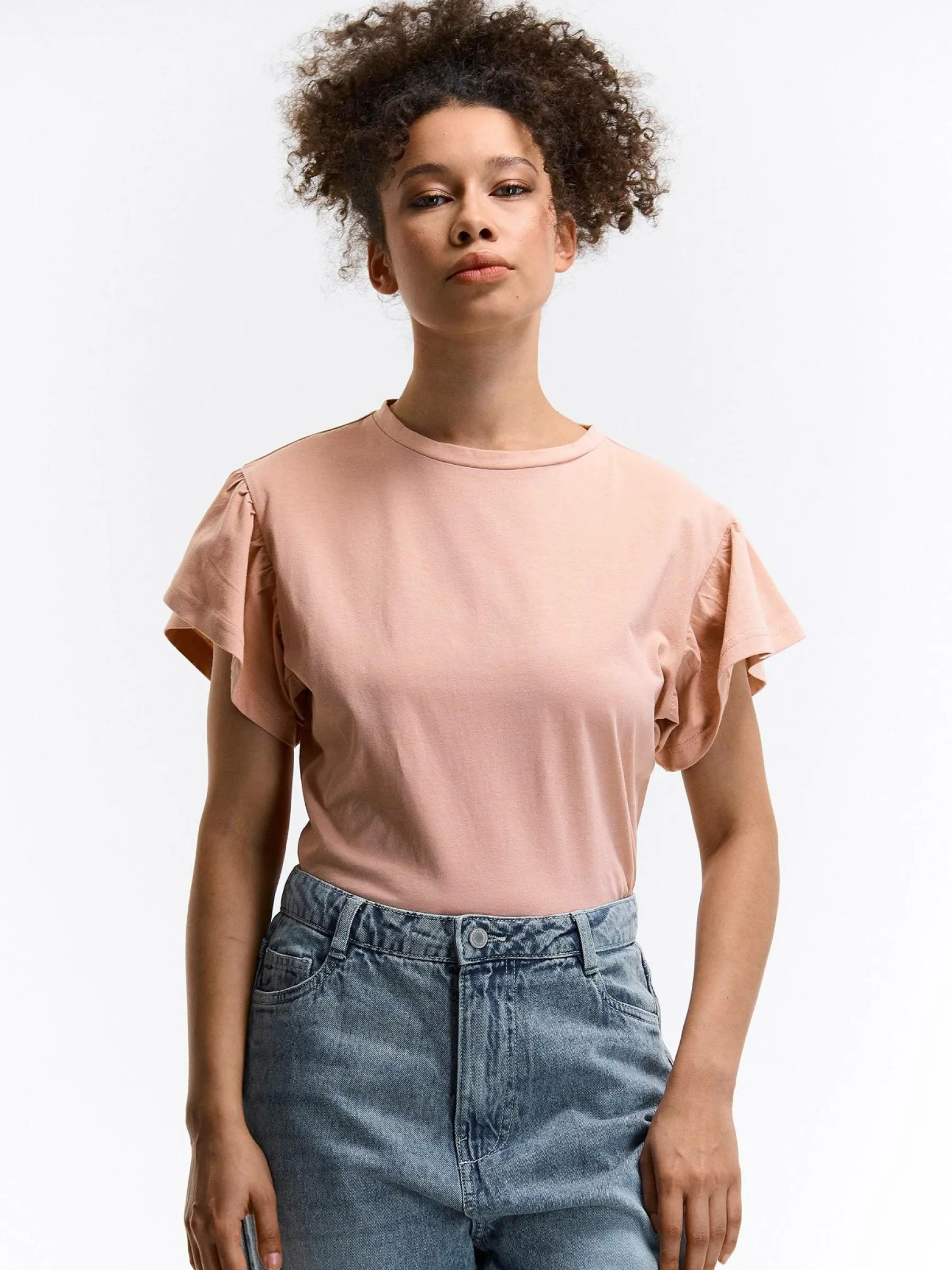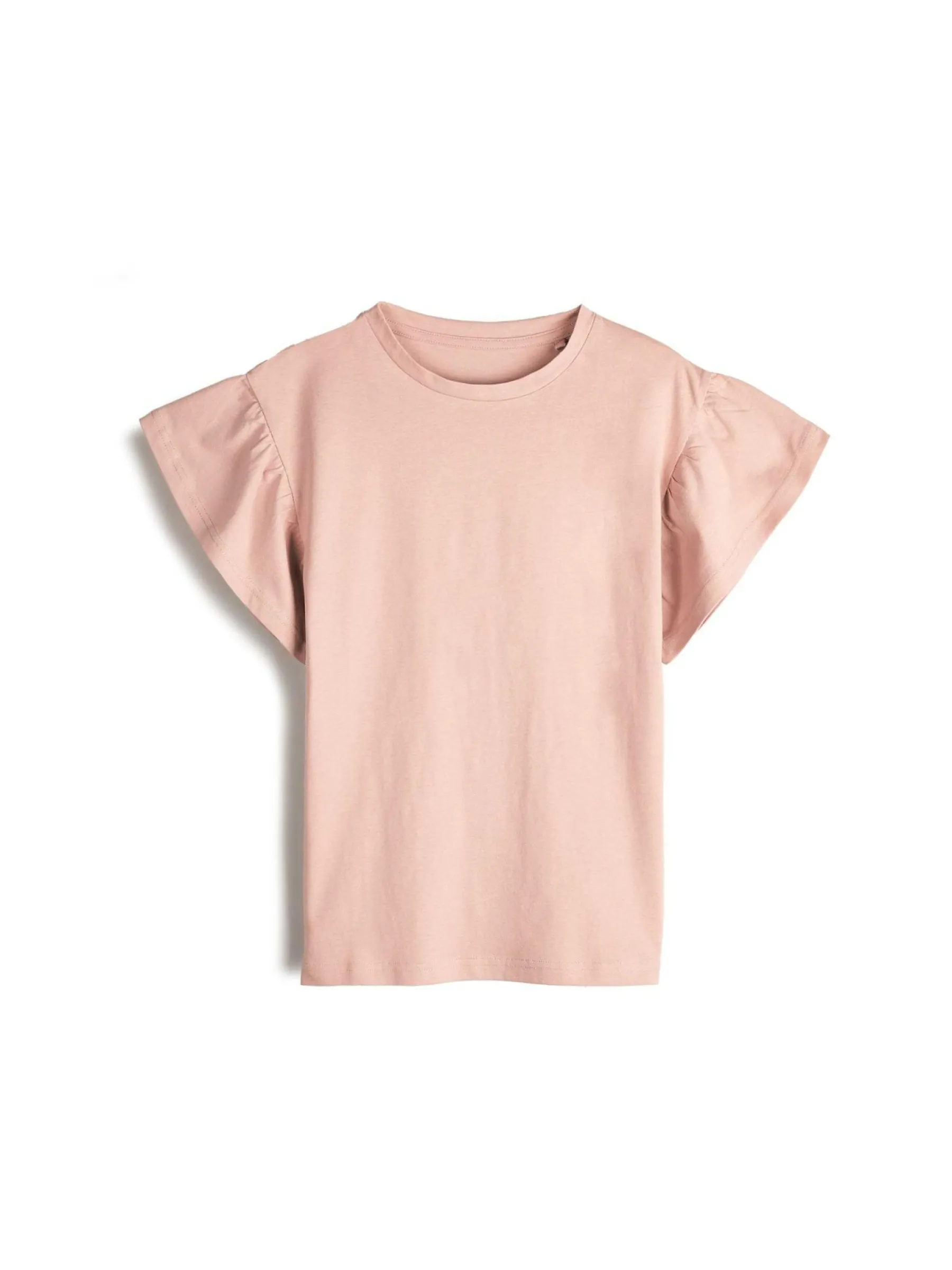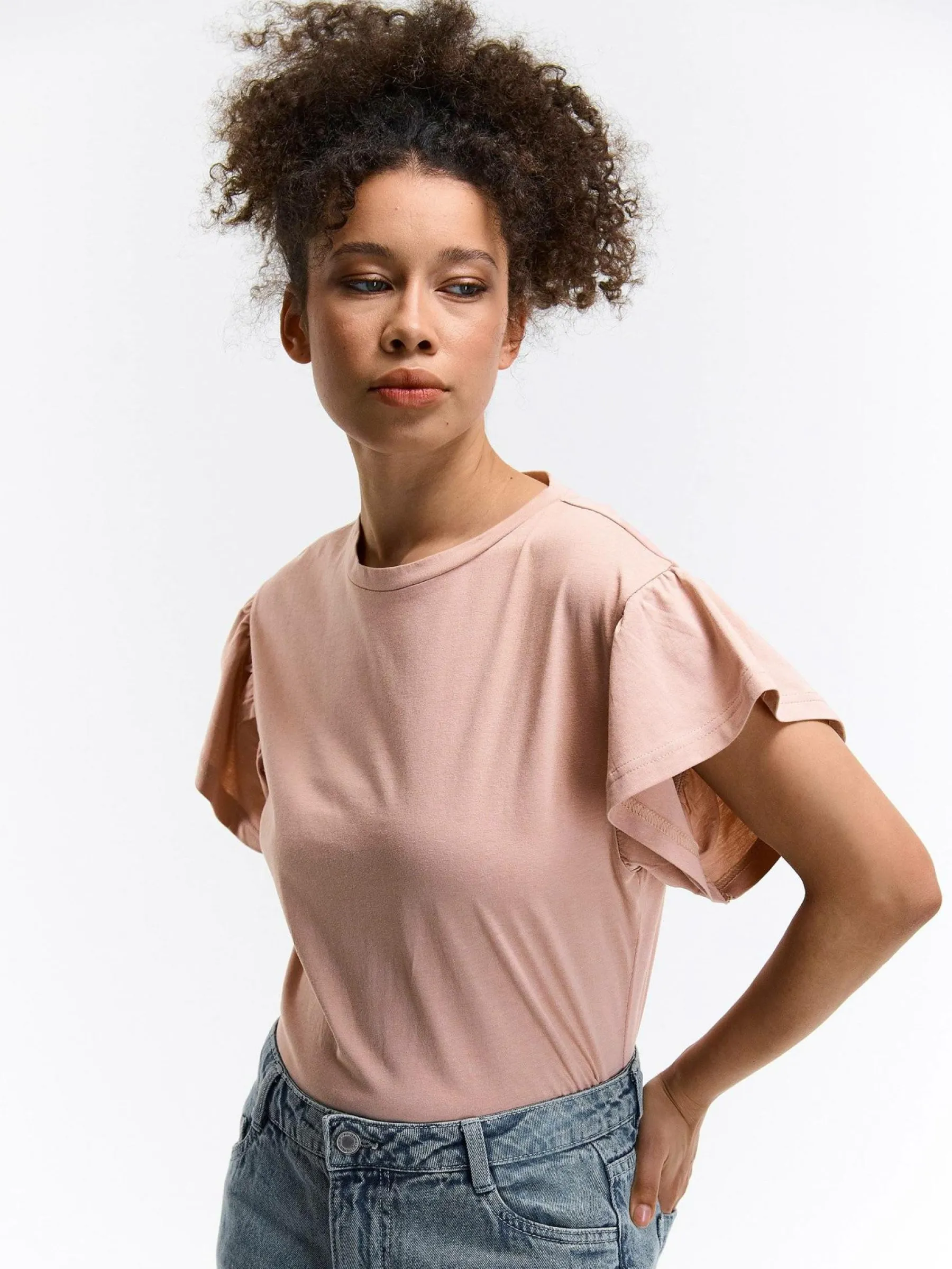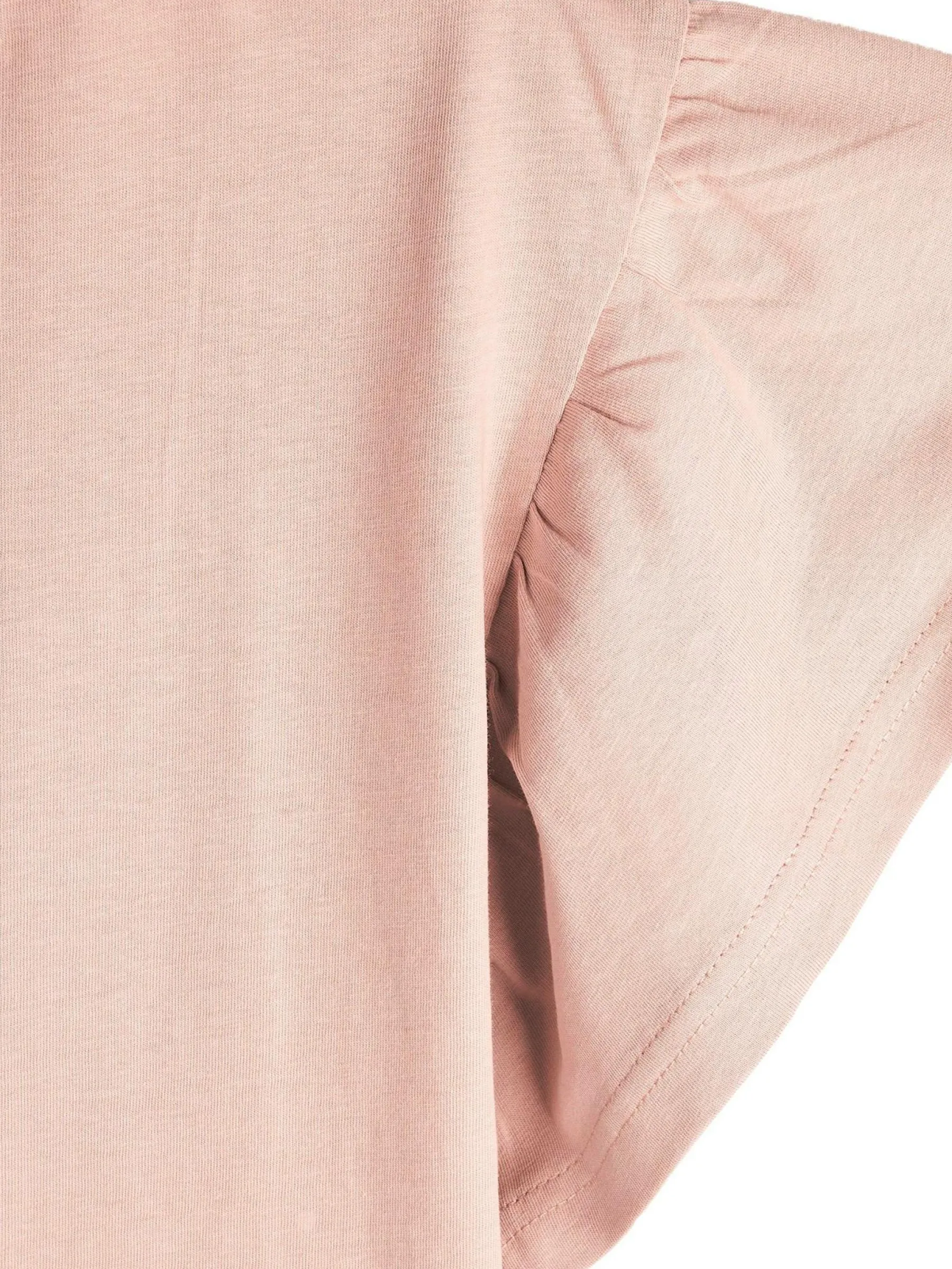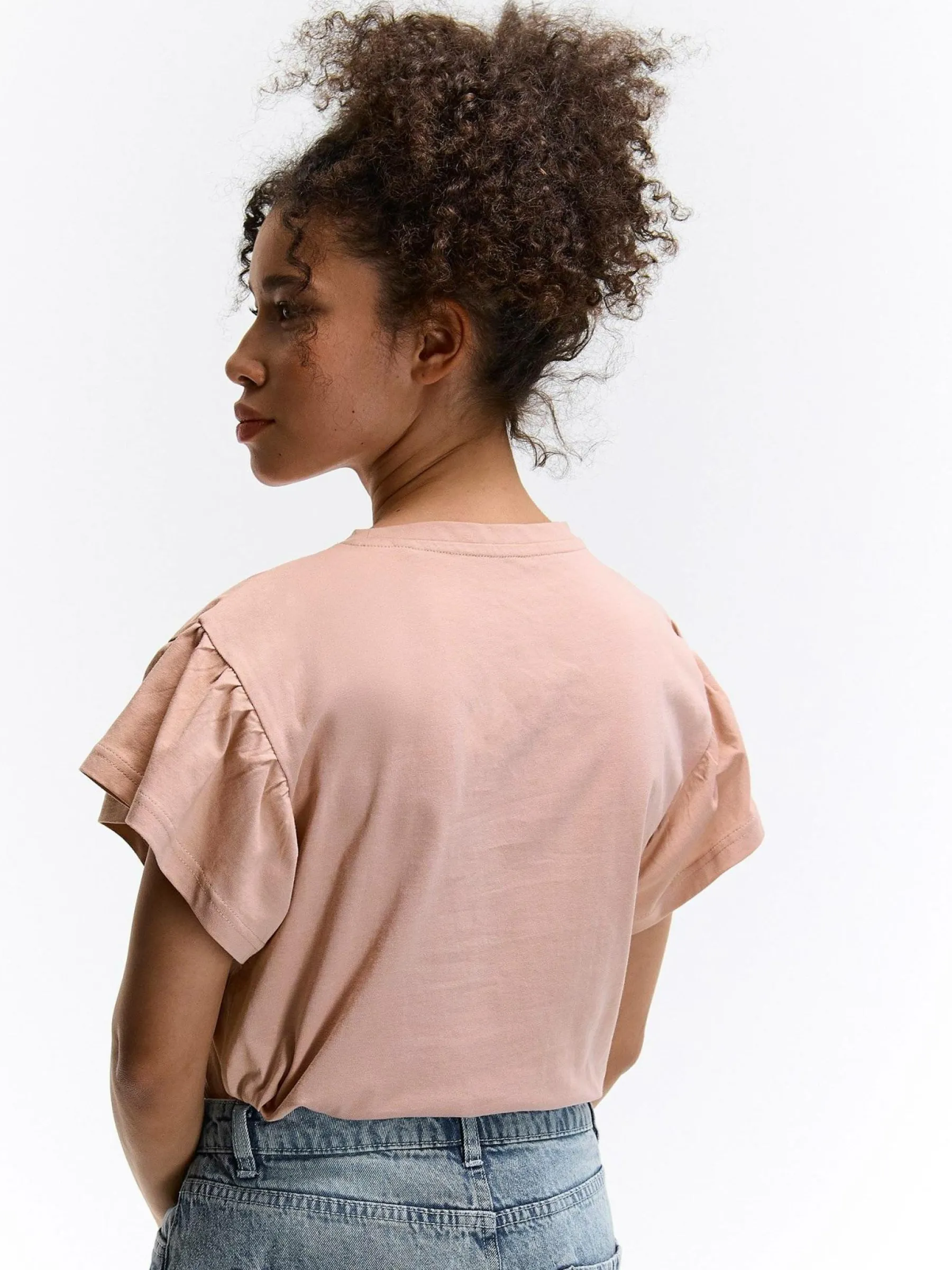 Kolor: różowyKrój: z falbanąTyp: koszulkaRekaw: krótki rękawDługość: krótkiPattern style: pojedynczy kolorDeta…