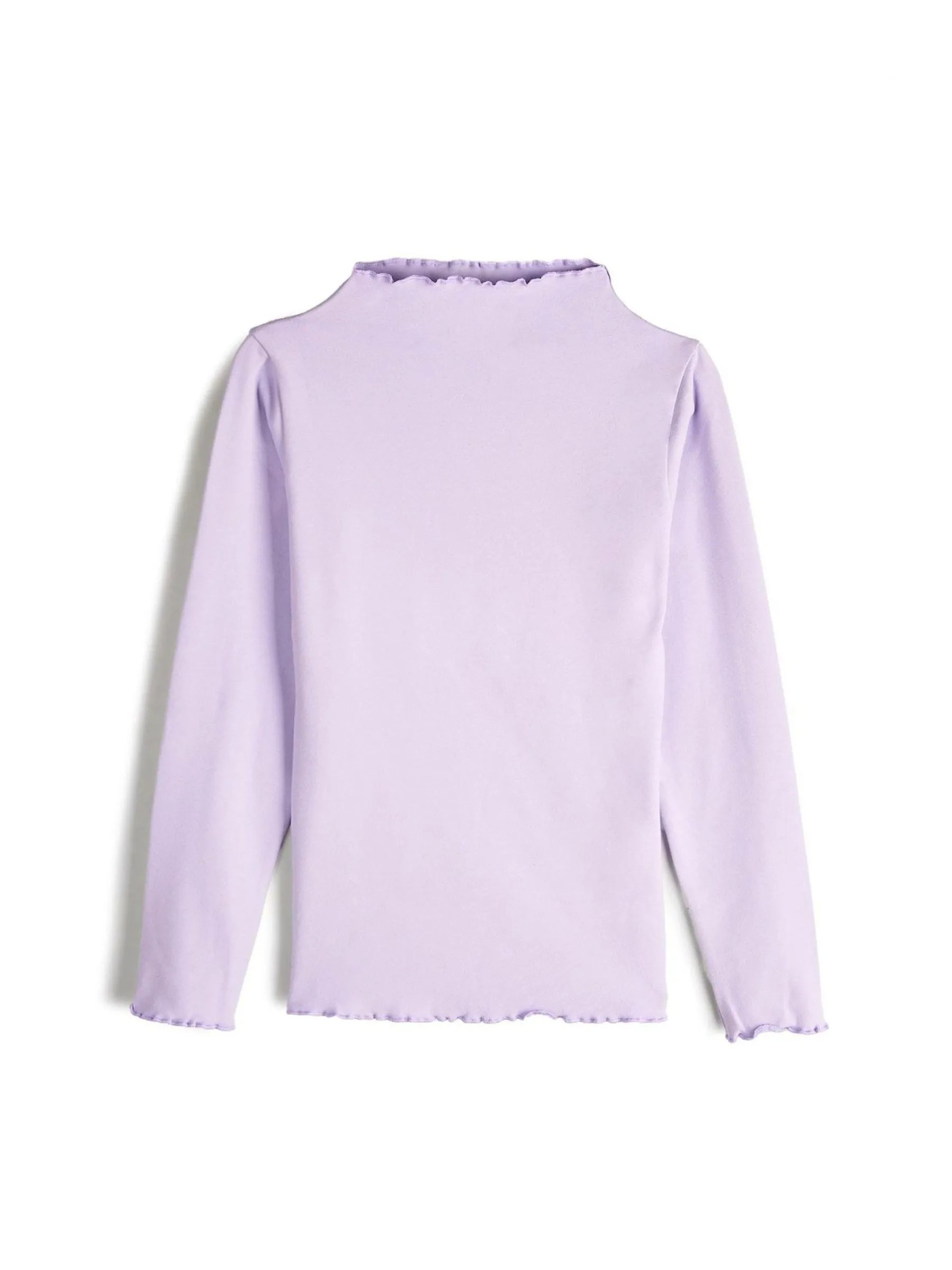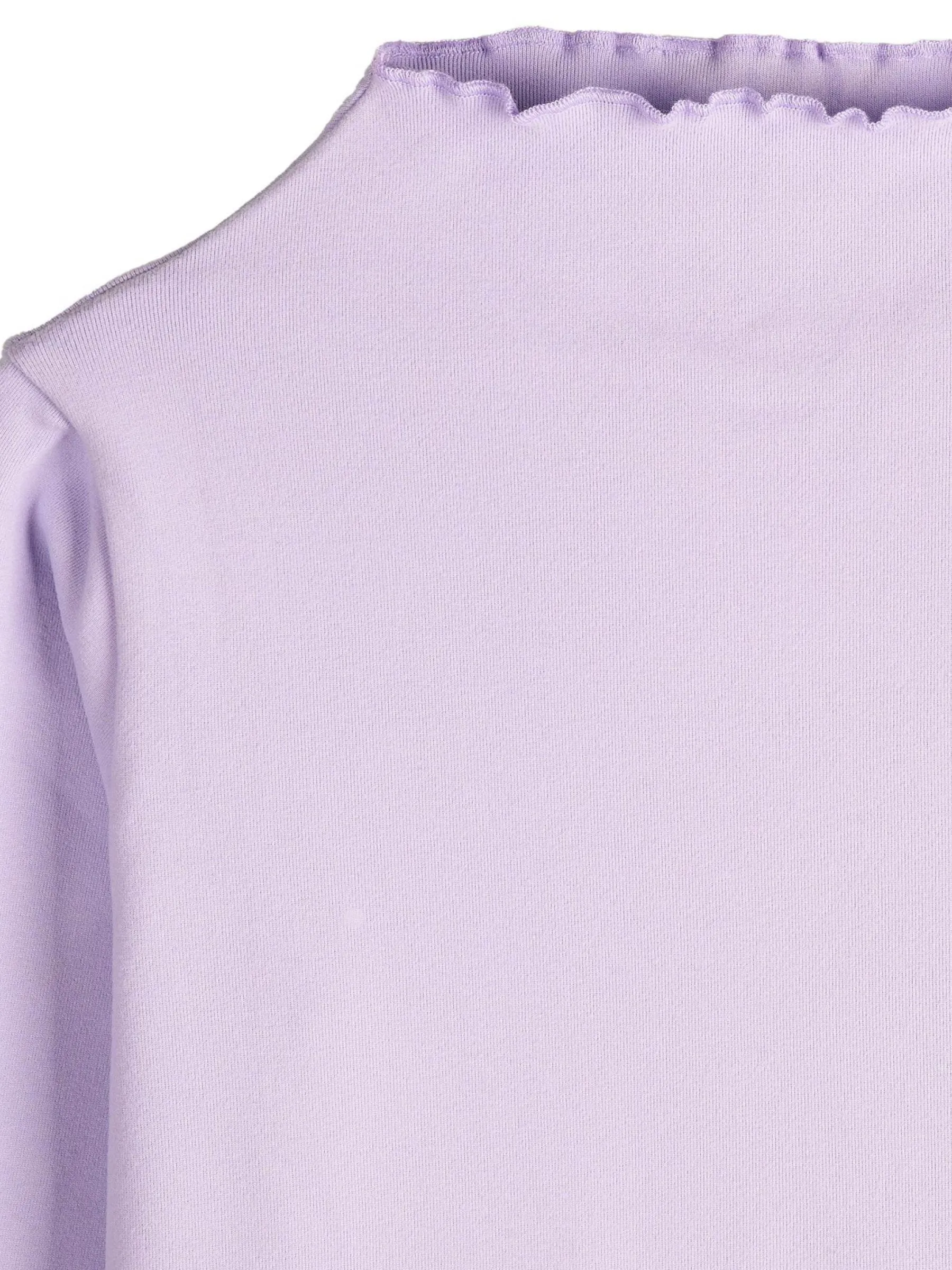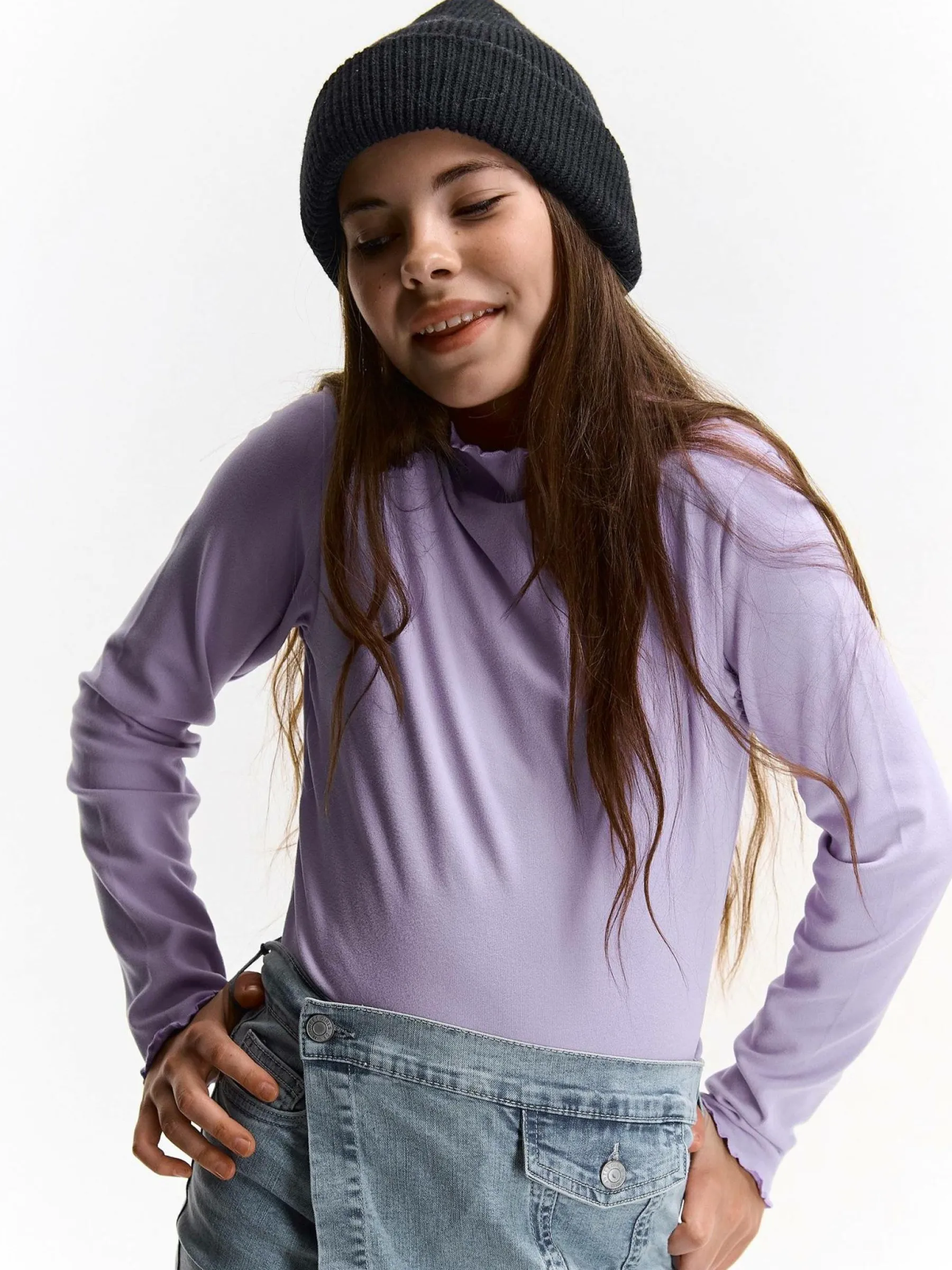 Kolor: purpurowyKrój: z falbanąTyp: koszulkaRekaw: długi rękawDługość: krótkiPattern style: pojedynczy kolorDeta…