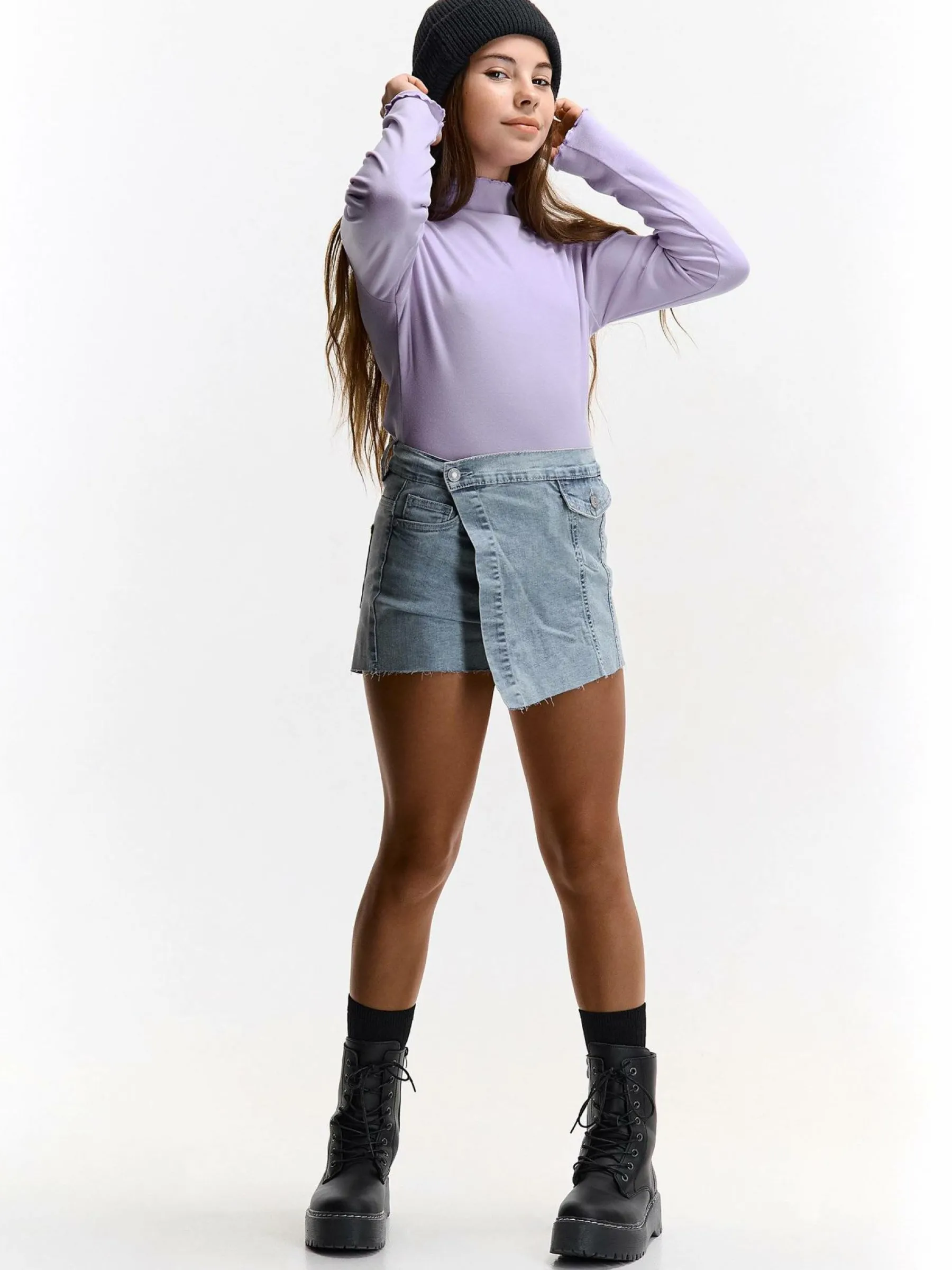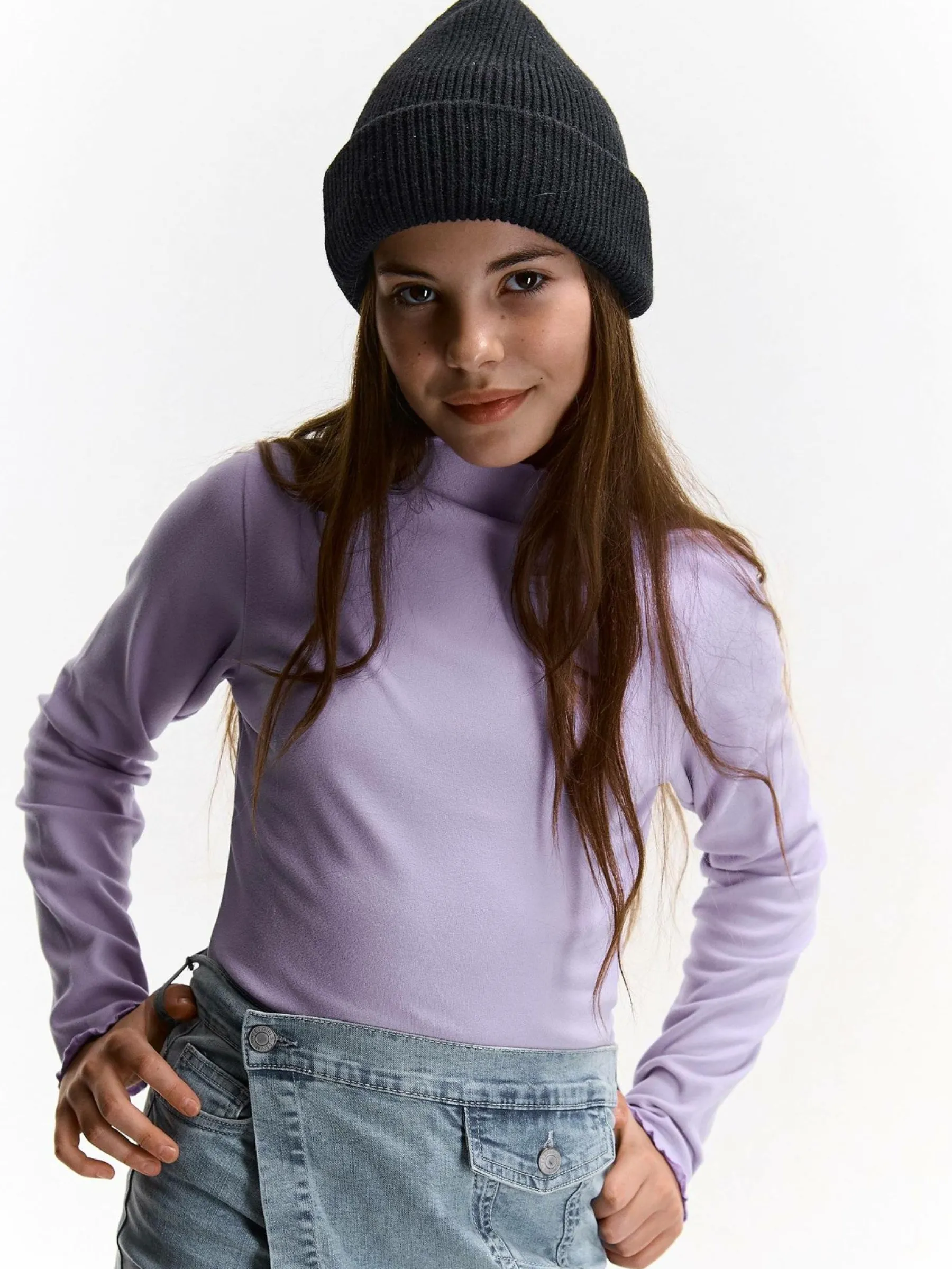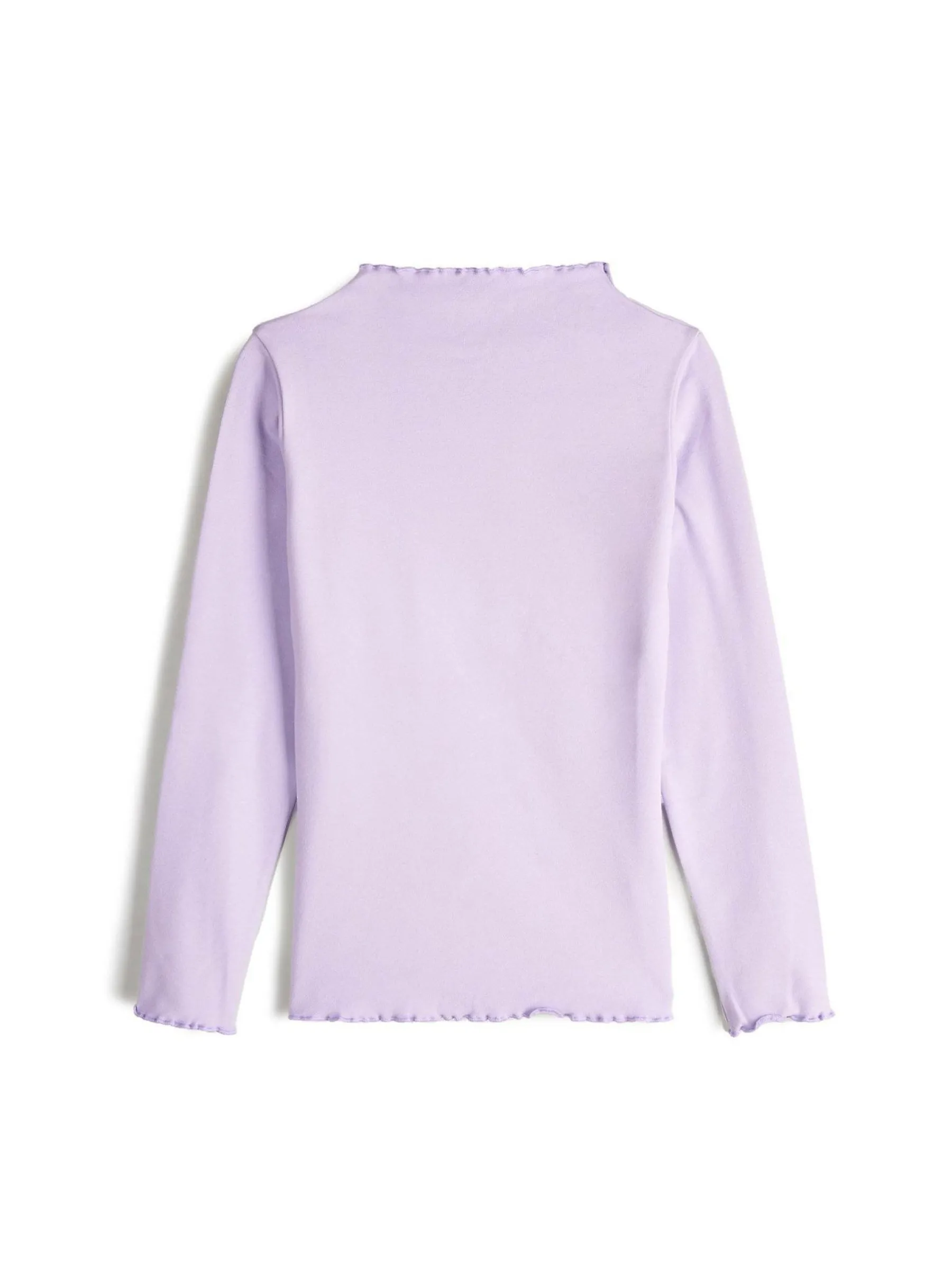 Kolor: purpurowyKrój: z falbanąTyp: koszulkaRekaw: długi rękawDługość: krótkiPattern style: pojedynczy kolorDeta…
