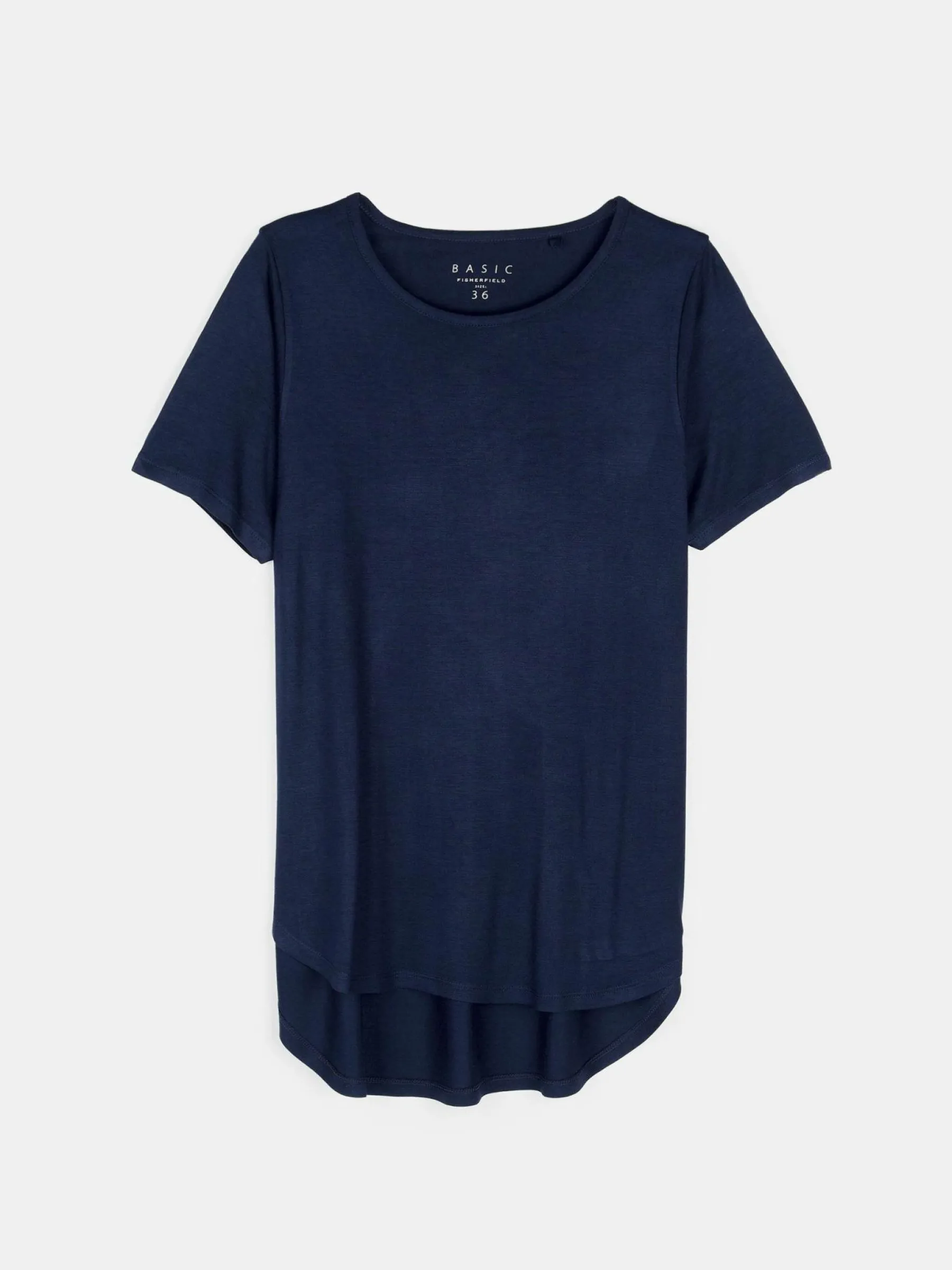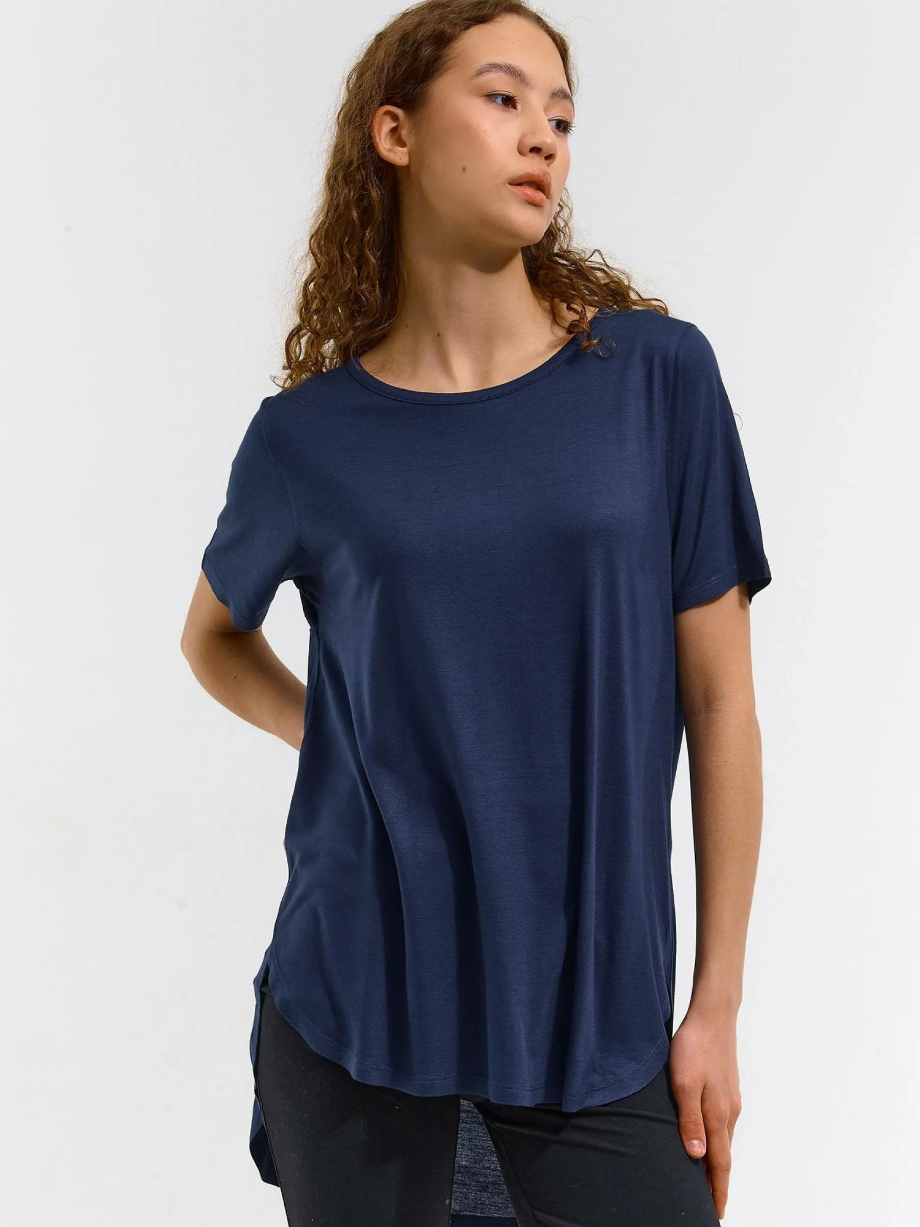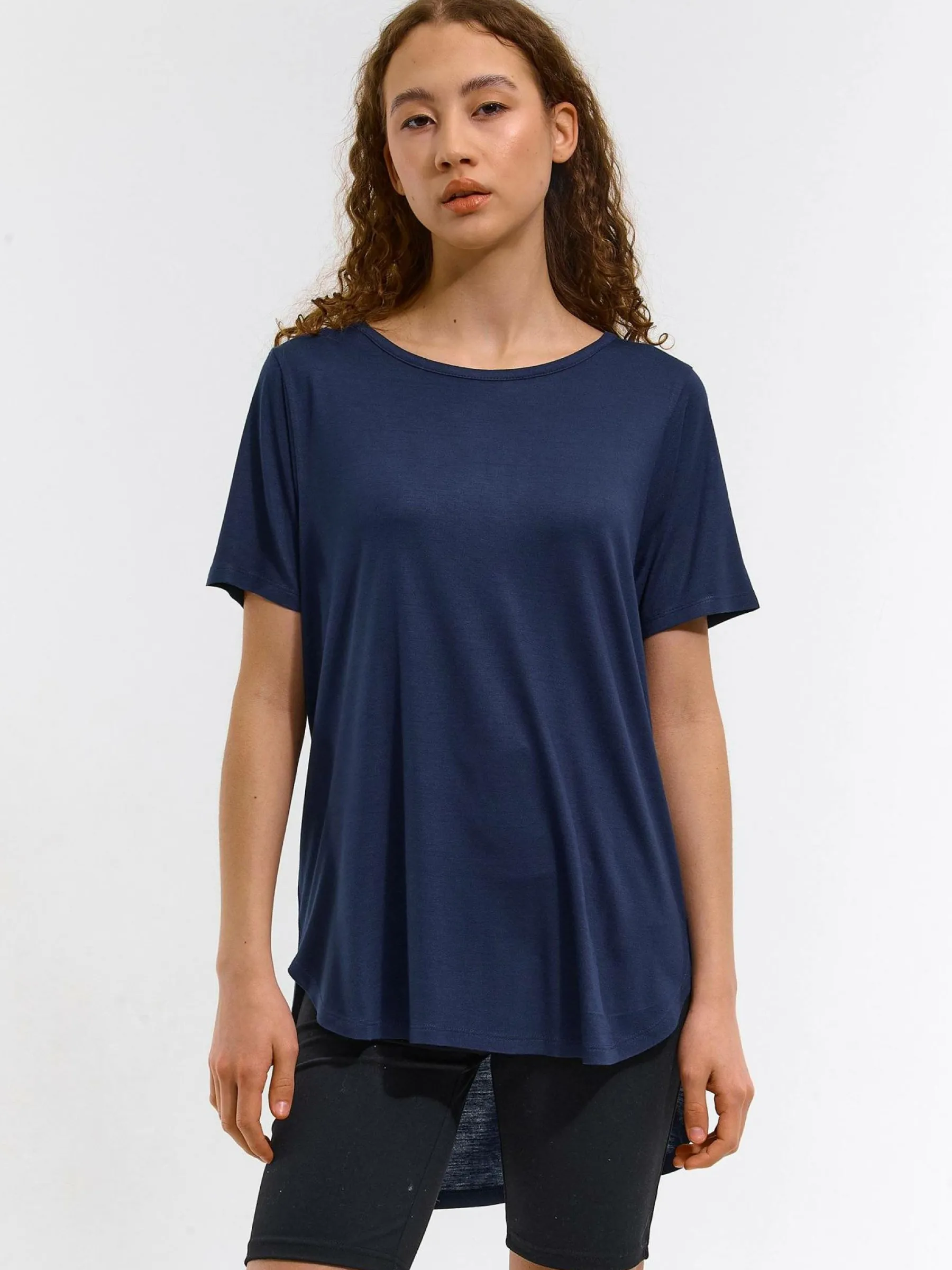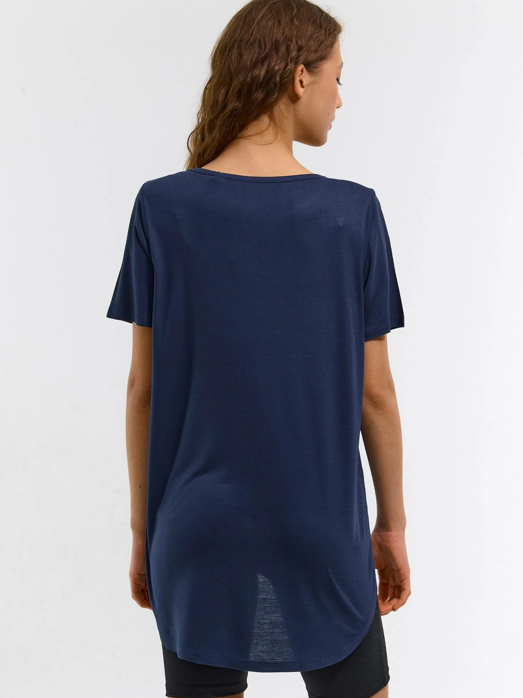 Kolor: granatowyKrój: asymetryczneTyp: koszulkaRekaw: krótki rękawDługość: dlugiePattern style: pojedynczy kolorDe…