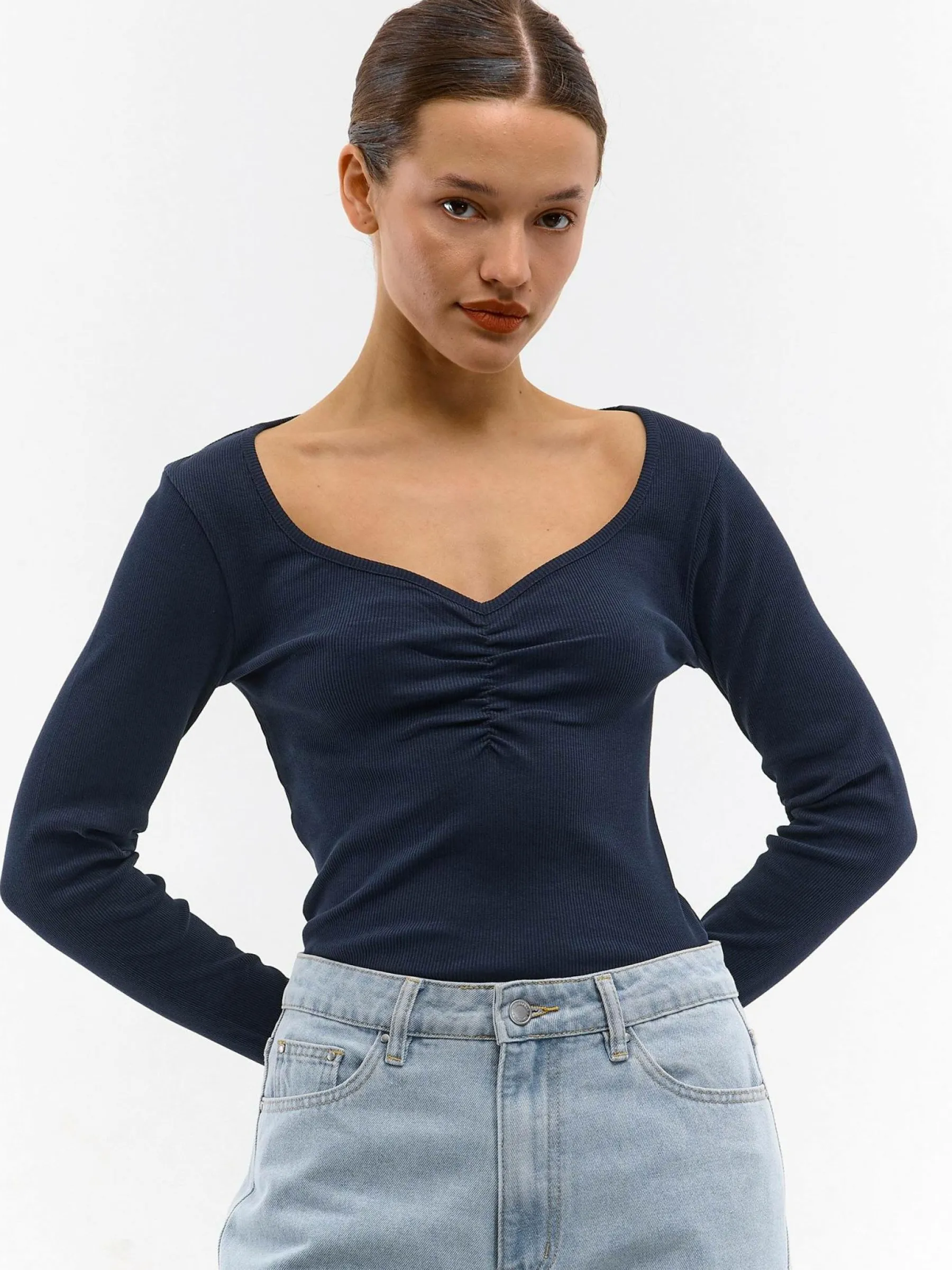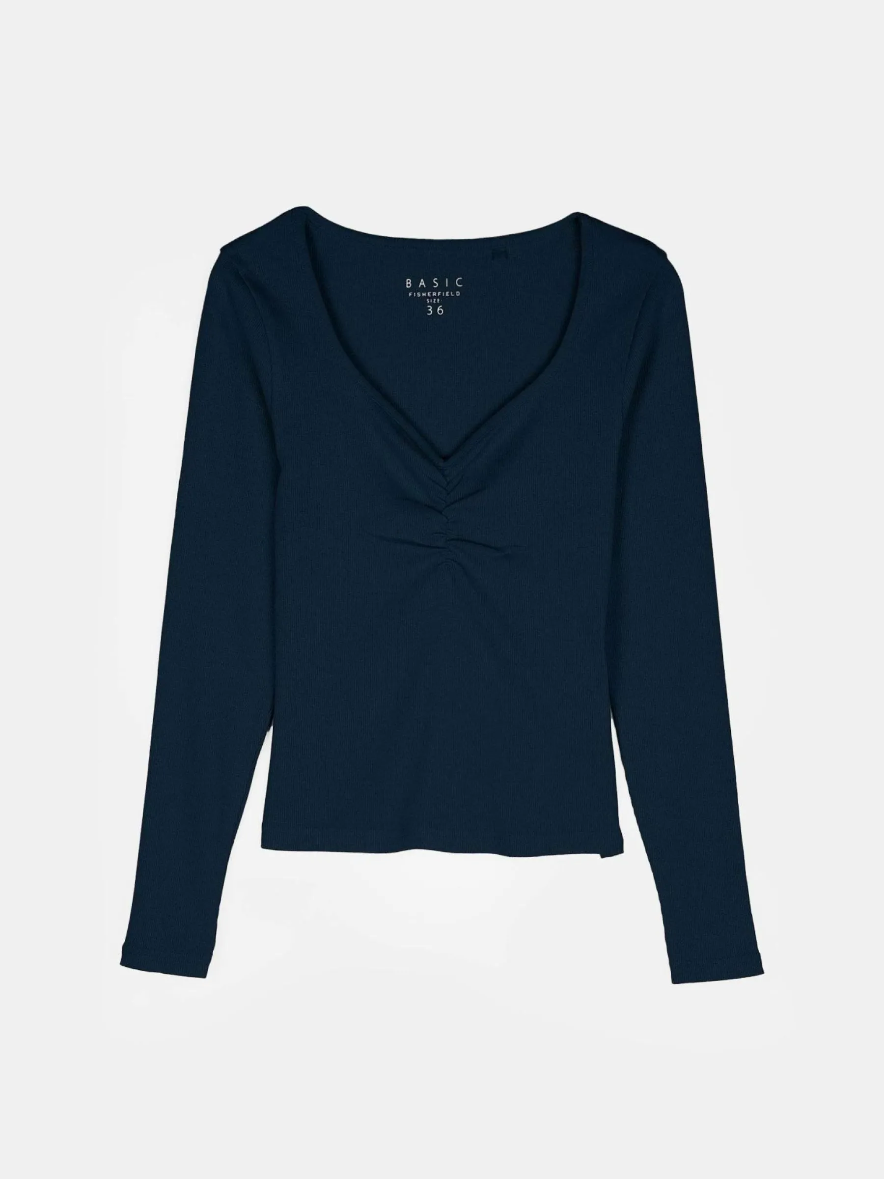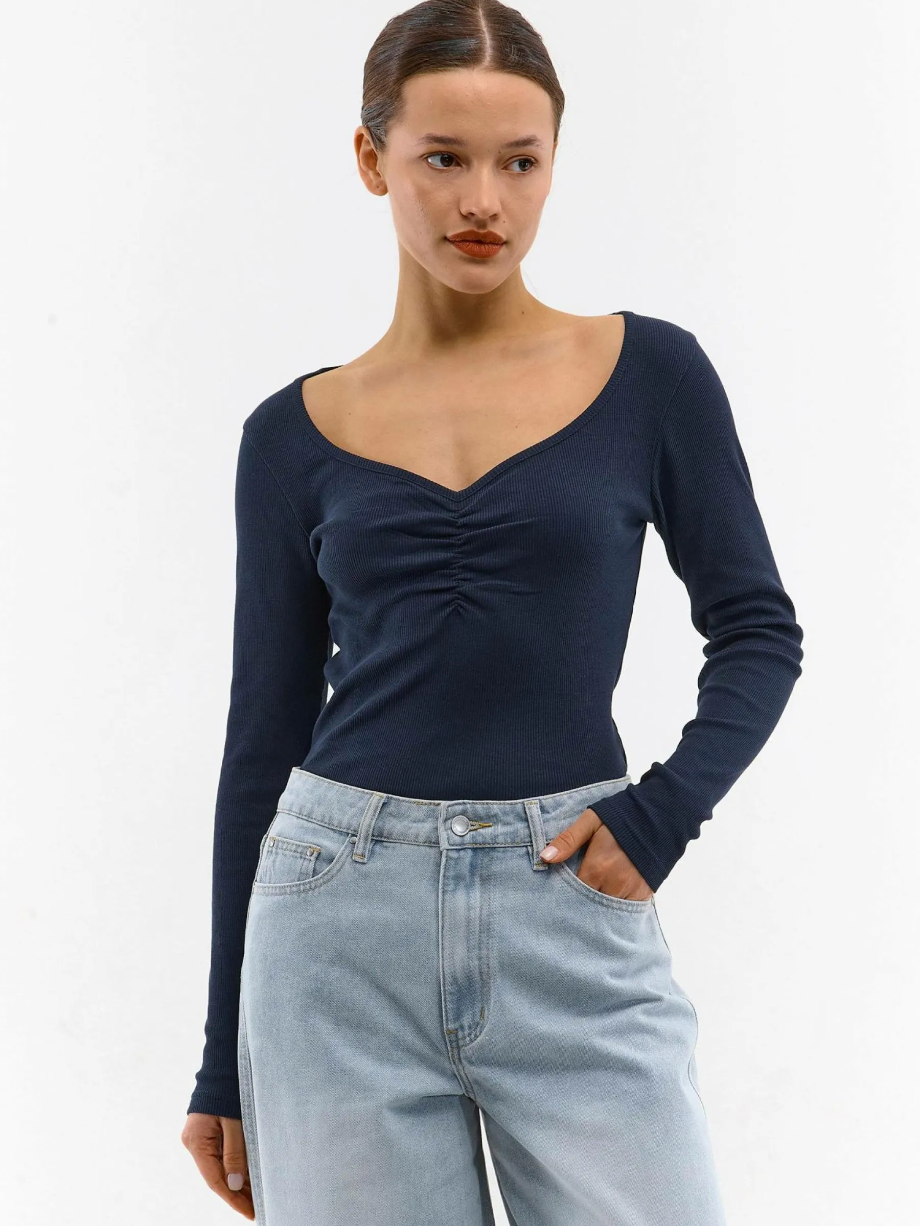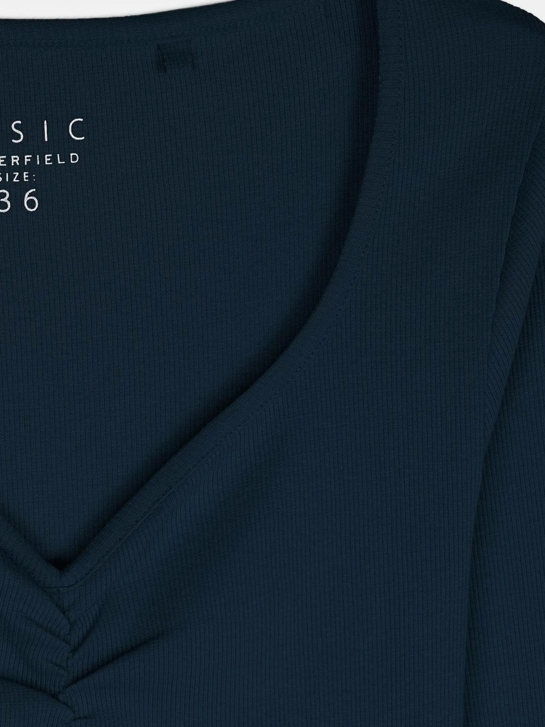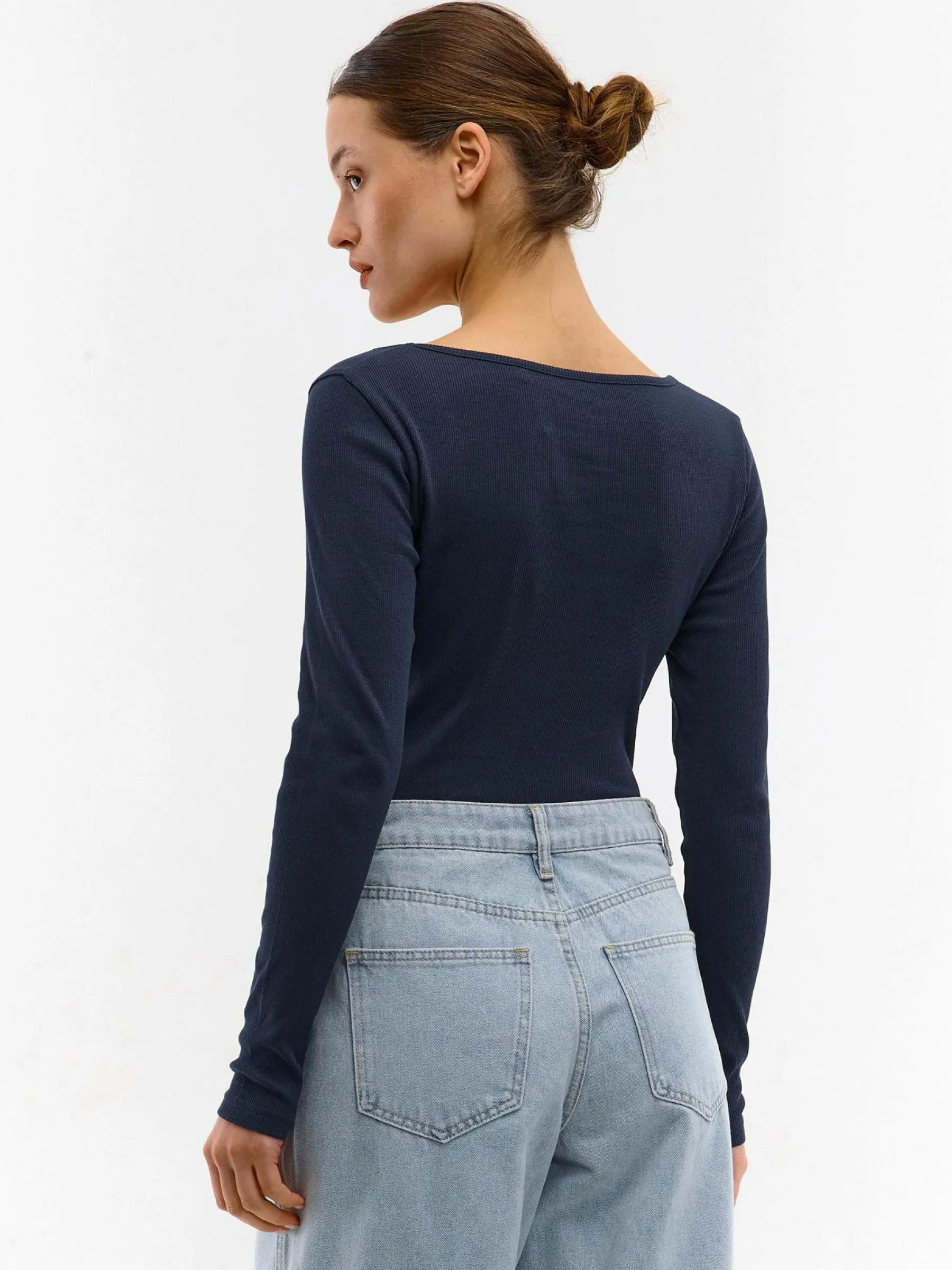 Kolor: granatowyKrój: regularTyp: koszulkaRekaw: długi rękawDługość: krótkiPattern style: pojedynczy kolor, żebr…