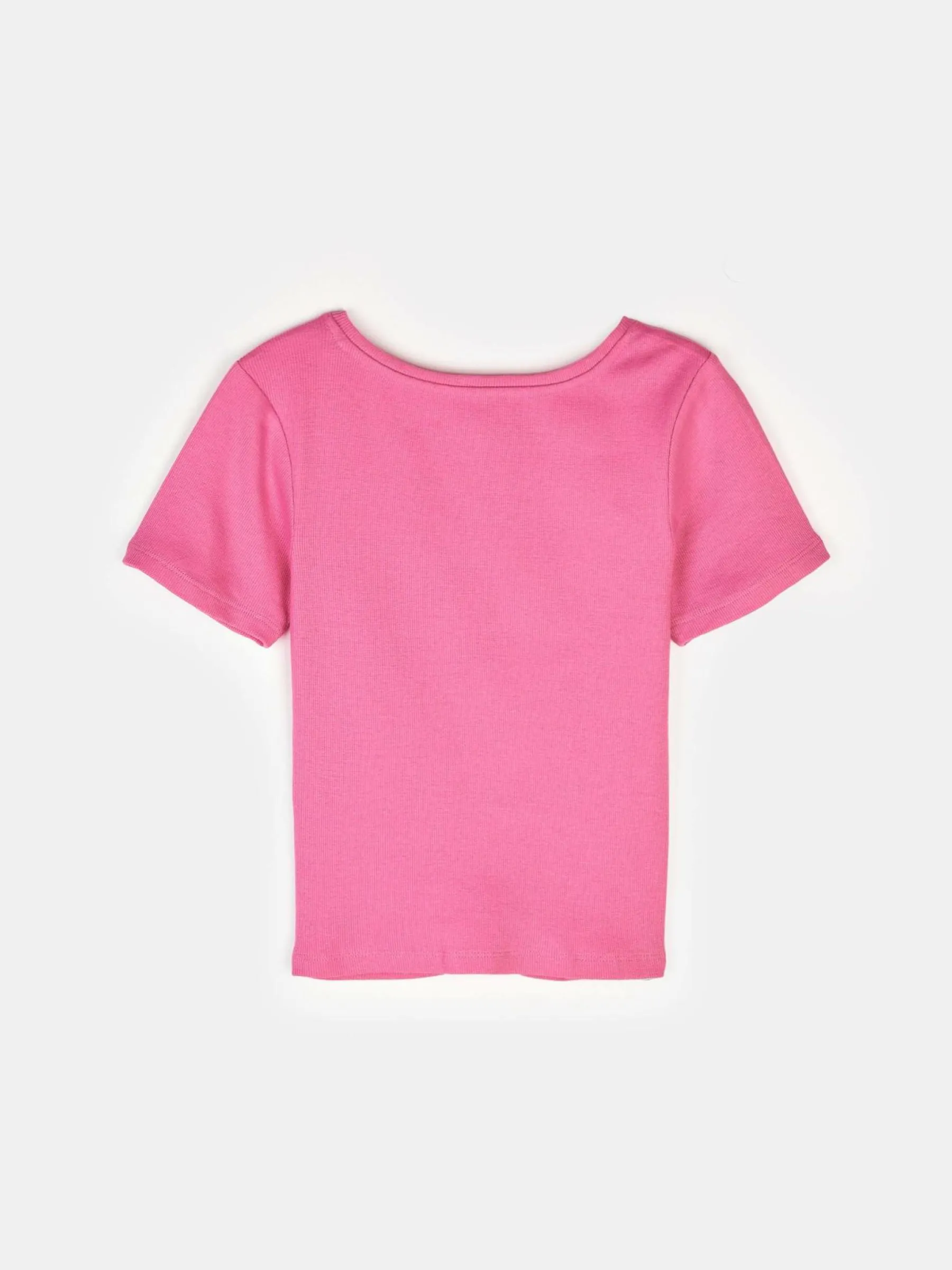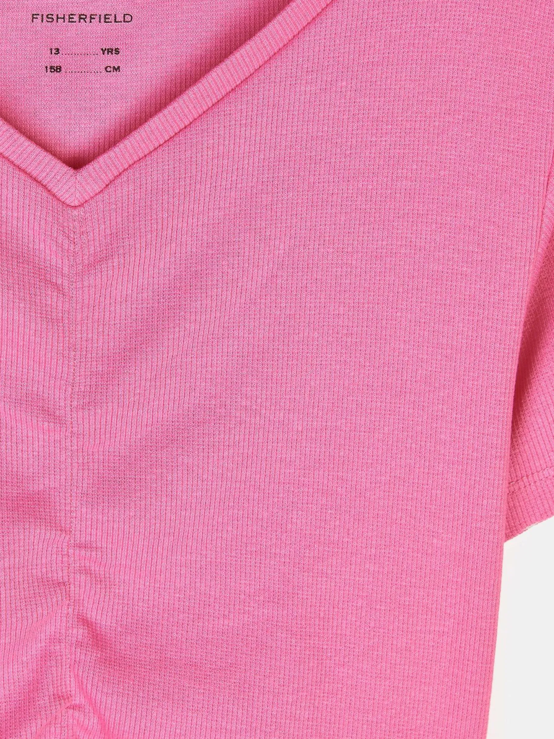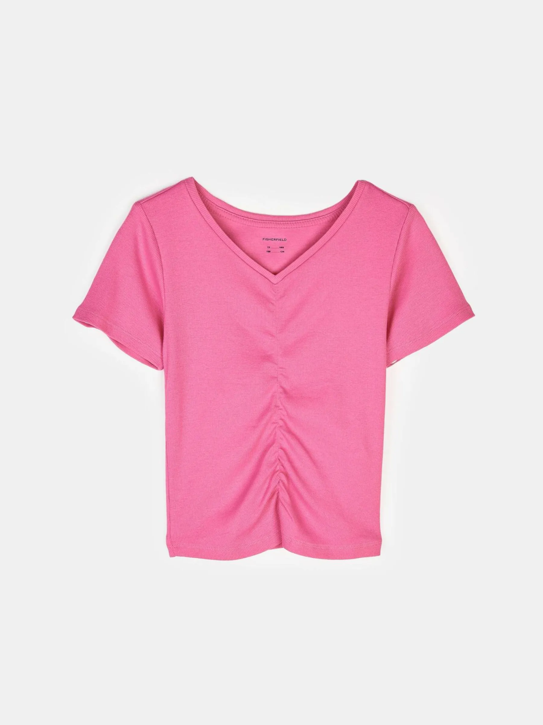 Kolor: różowyKrój: z marszczeniemTyp: koszulkaRekaw: krótki rękawDługość: krótkiPattern style: pojedynczy kolor…