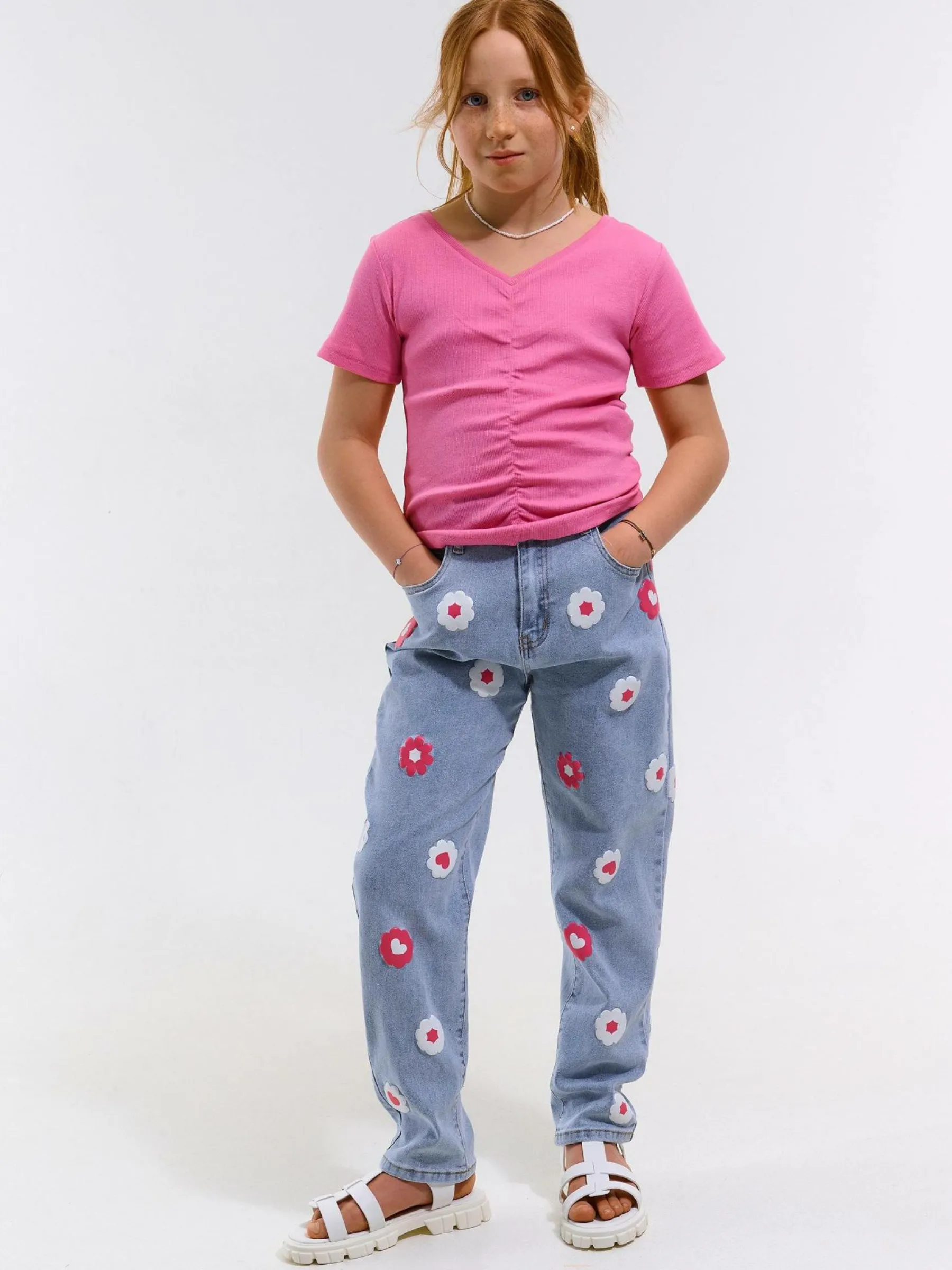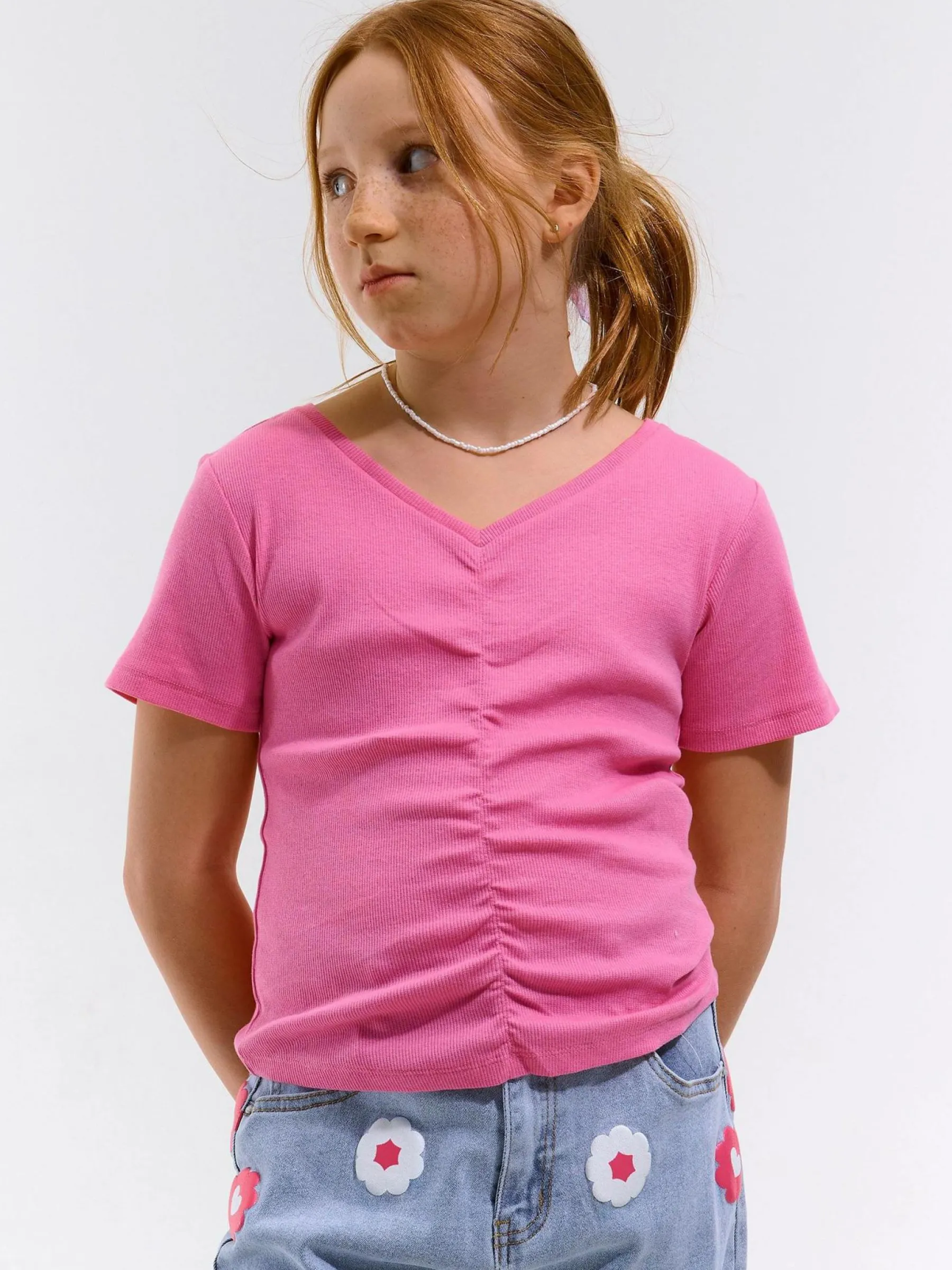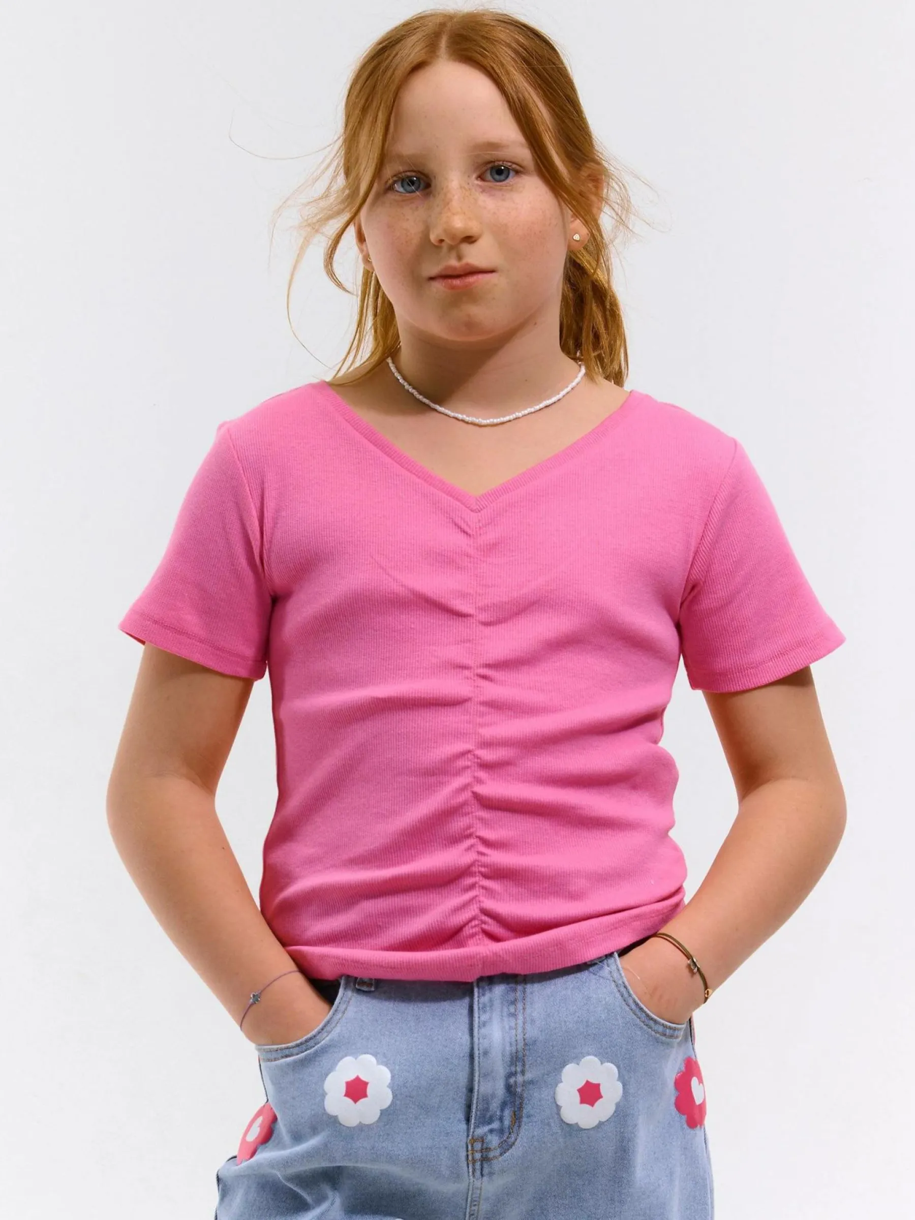 Kolor: różowyKrój: z marszczeniemTyp: koszulkaRekaw: krótki rękawDługość: krótkiPattern style: pojedynczy kolor…