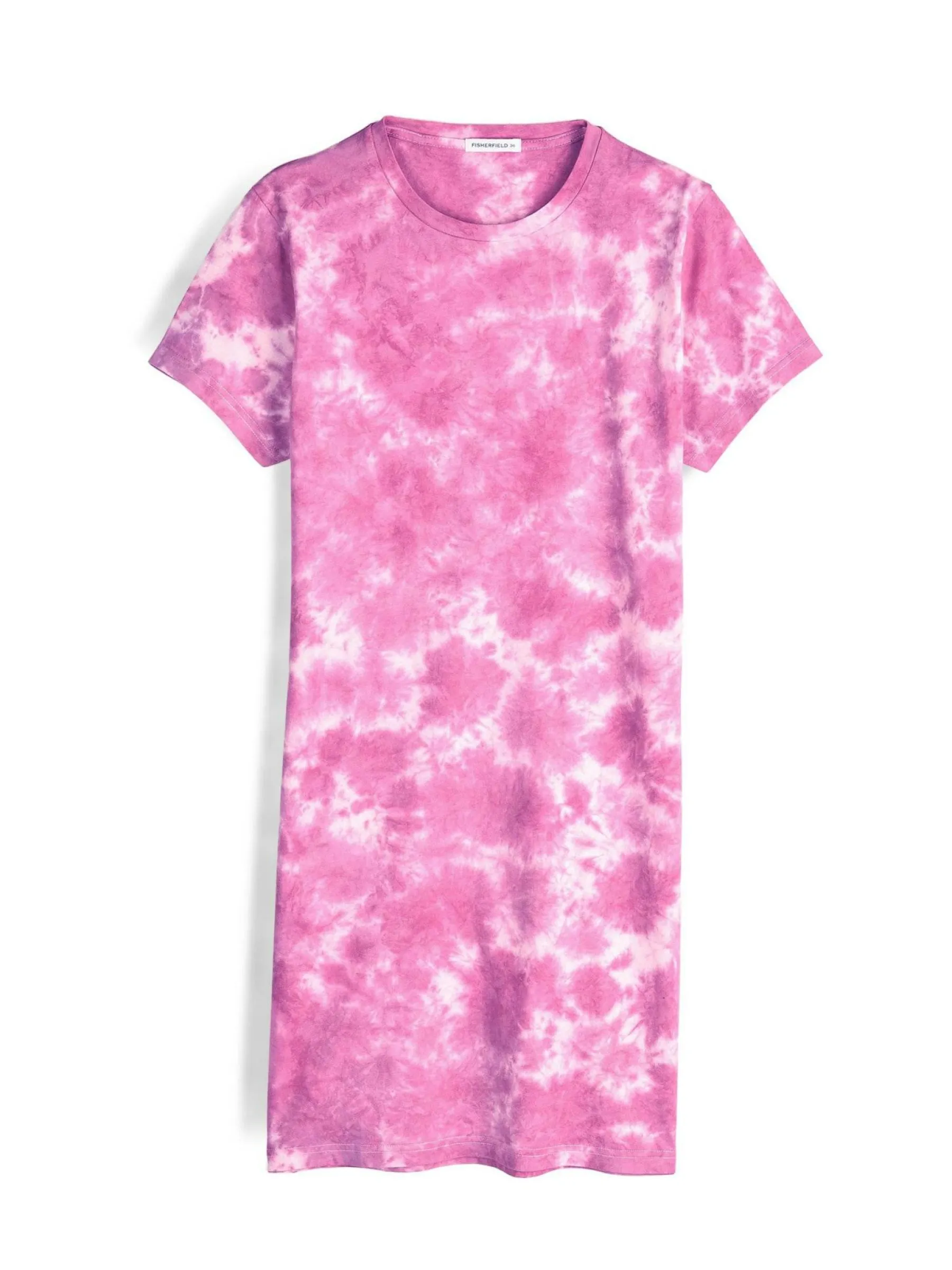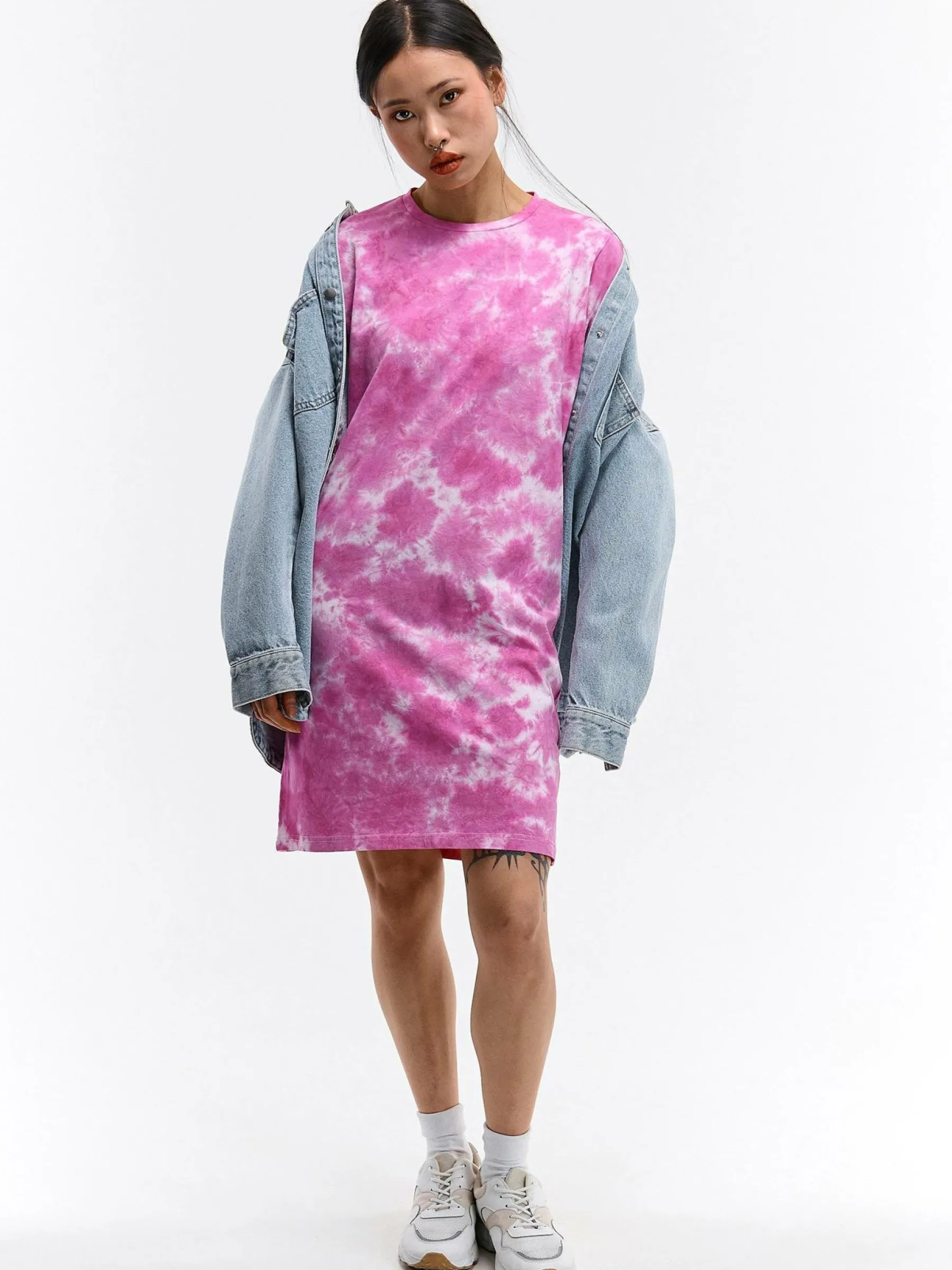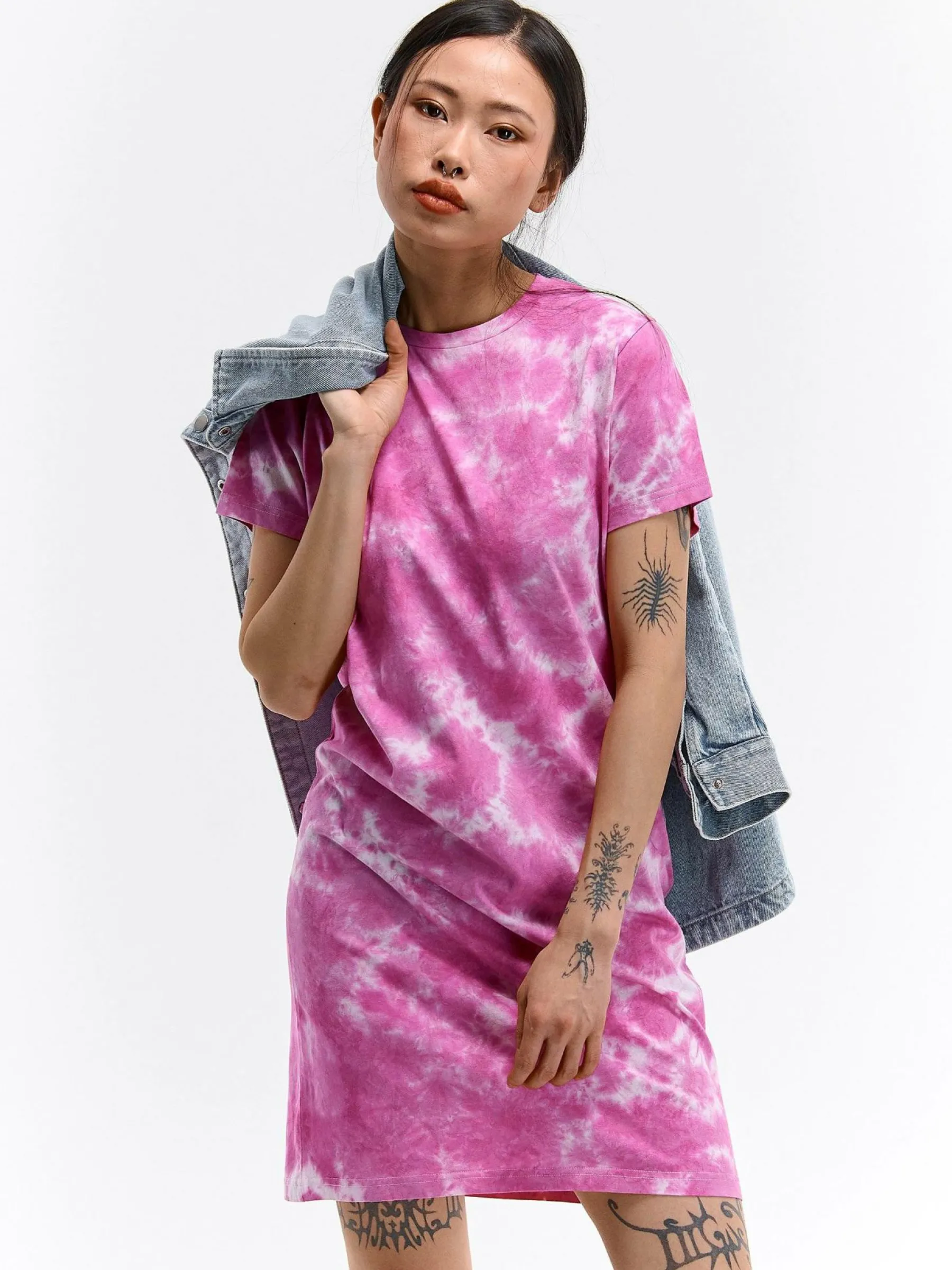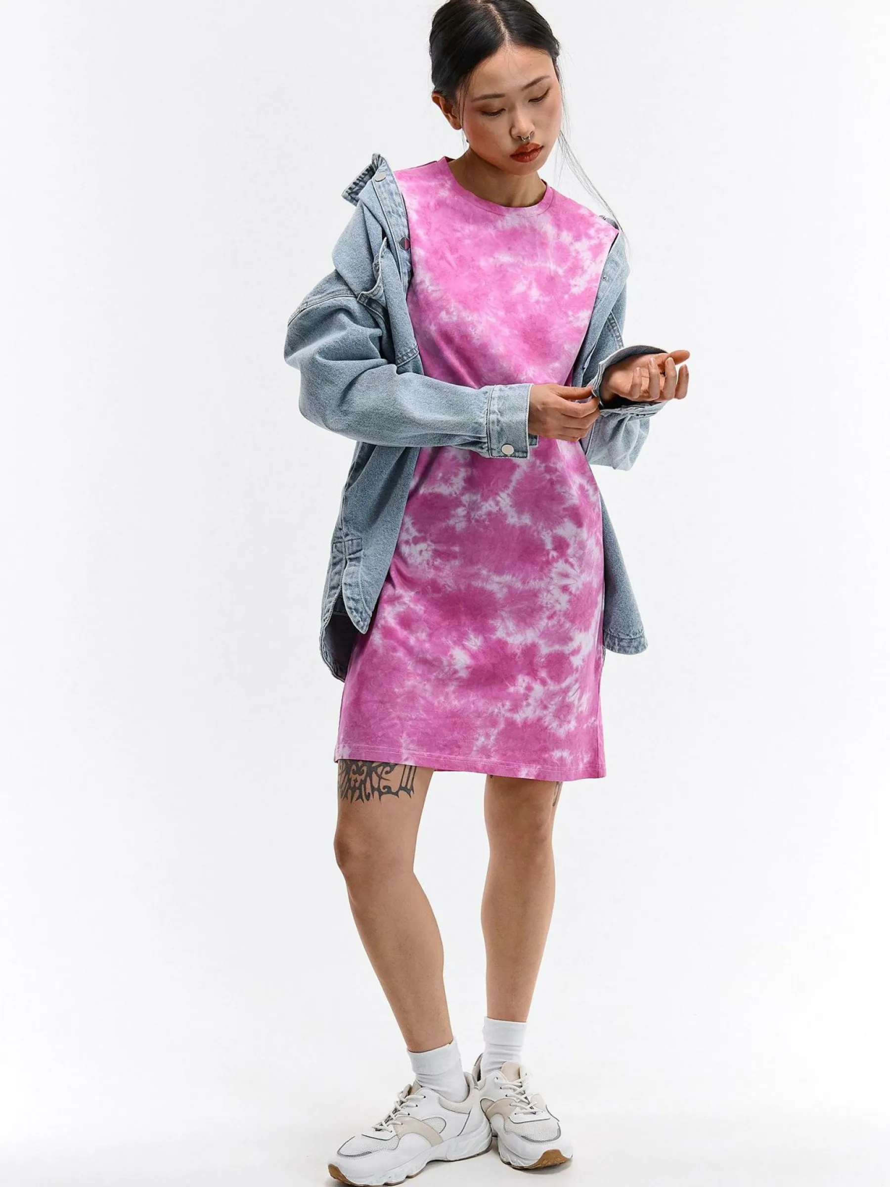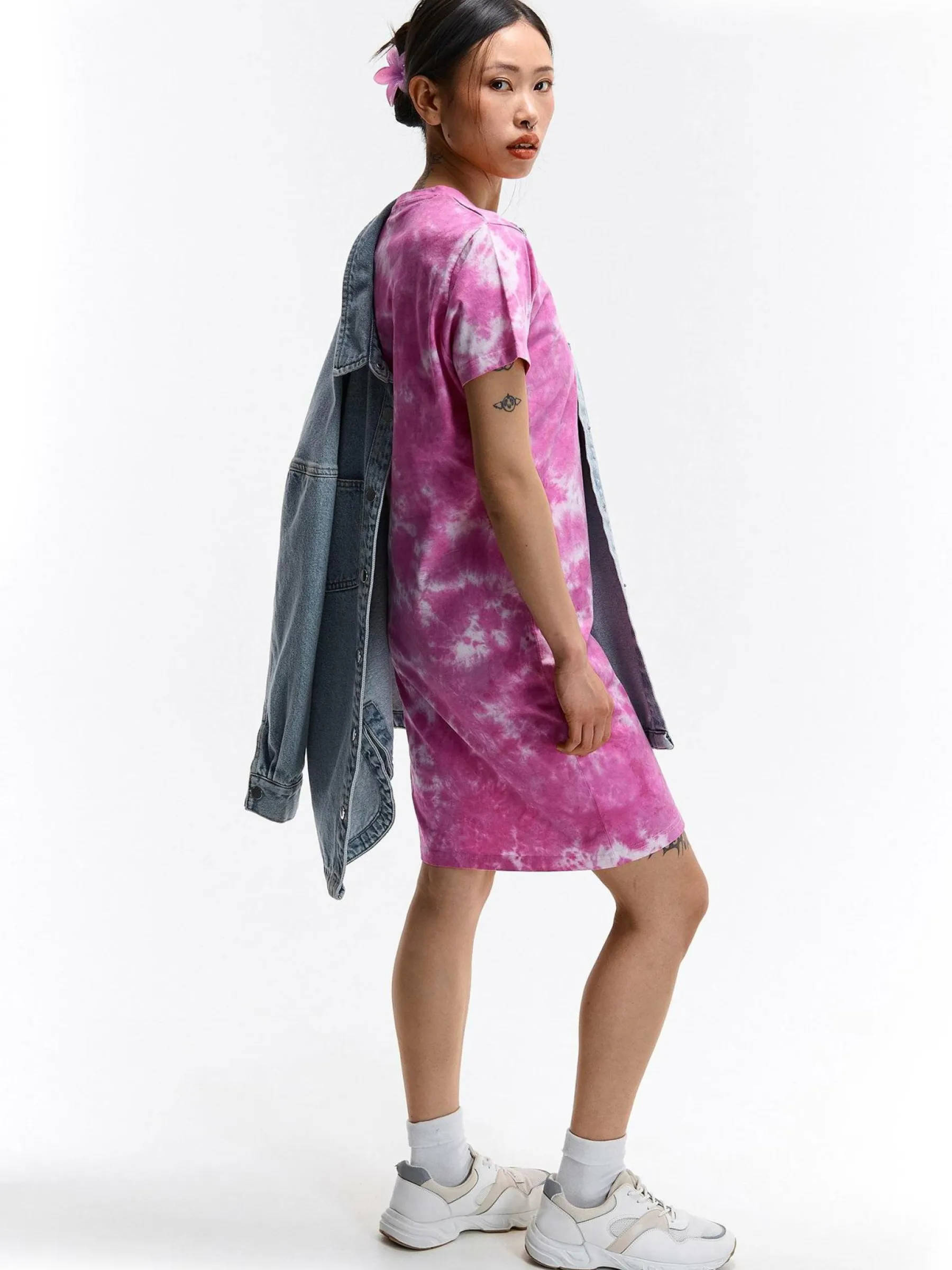 Kolor: różowyKrój: koszulkoweTyp: sukienkaRekaw: krótki rękawDługość: miniPattern style: tie dyeDetal: nad głow…