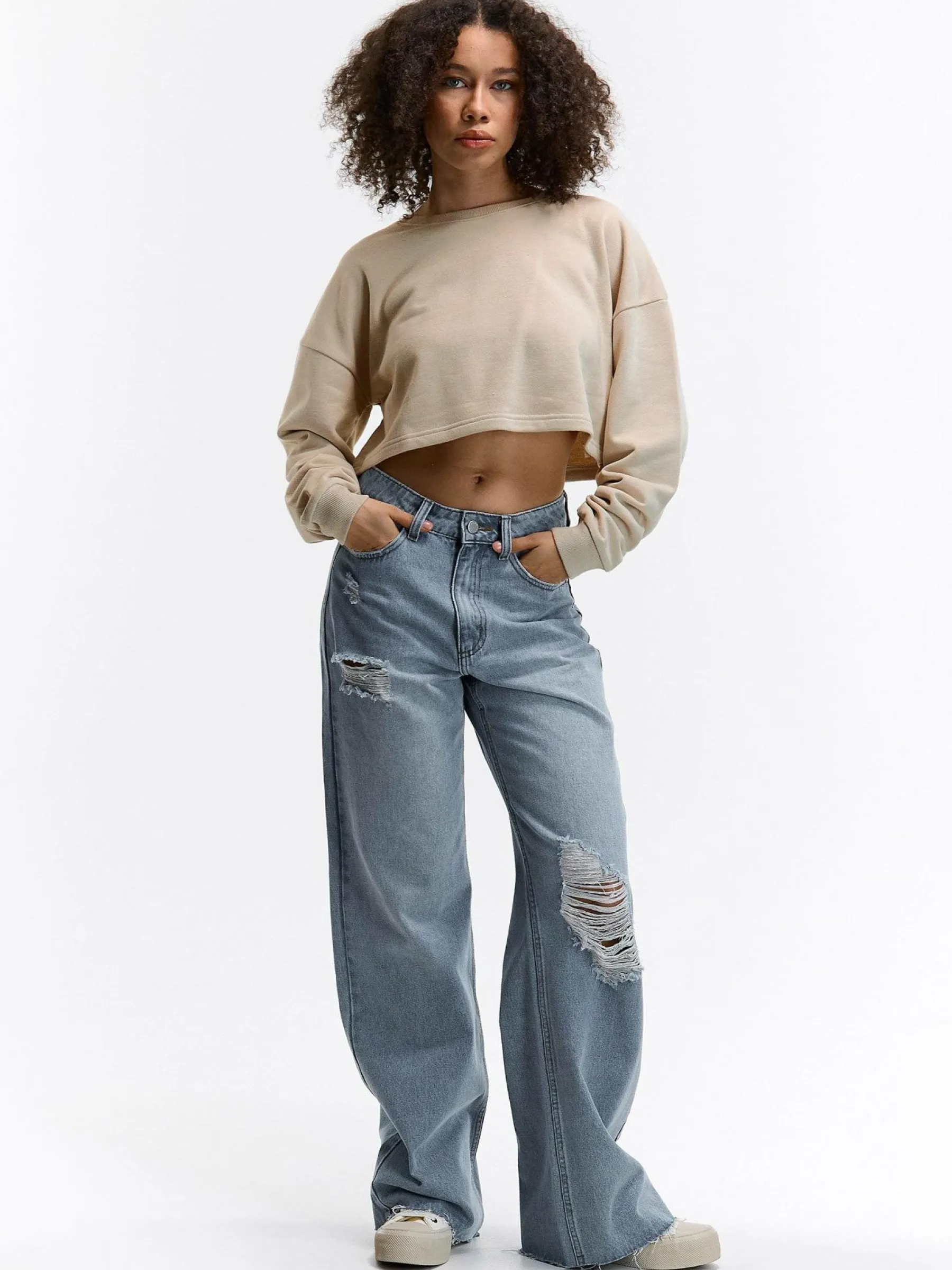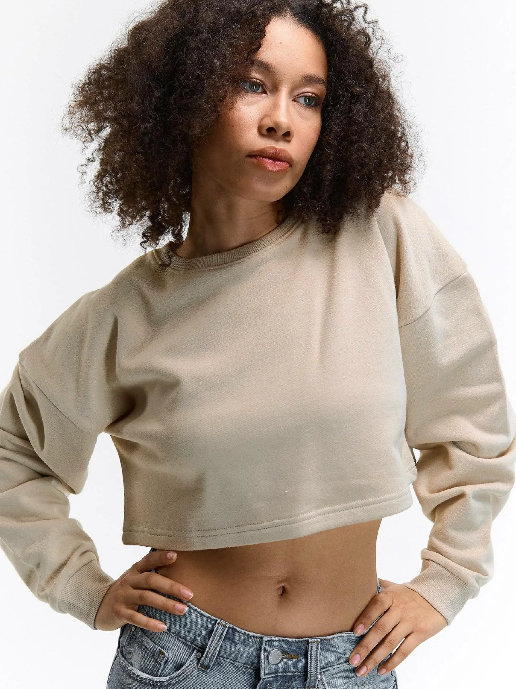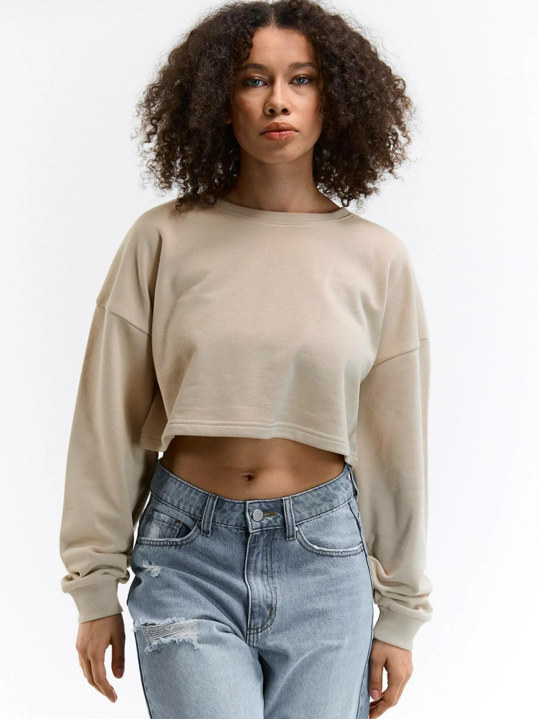 Kolor: beżowyKrój: regularTyp: bluzaRekaw: długi rękawDługość: krótki topPattern style: pojedynczy kolorDetal: n…