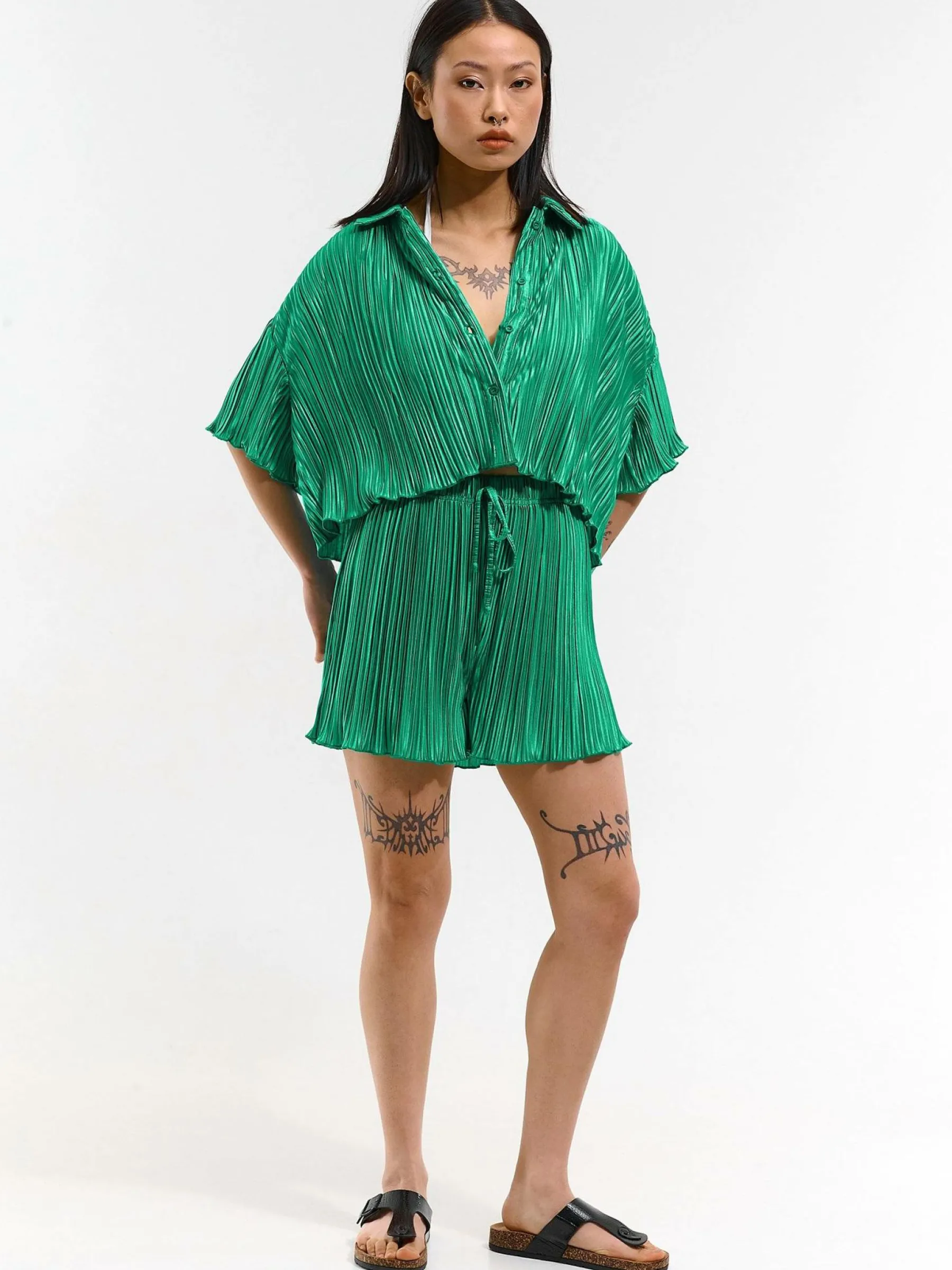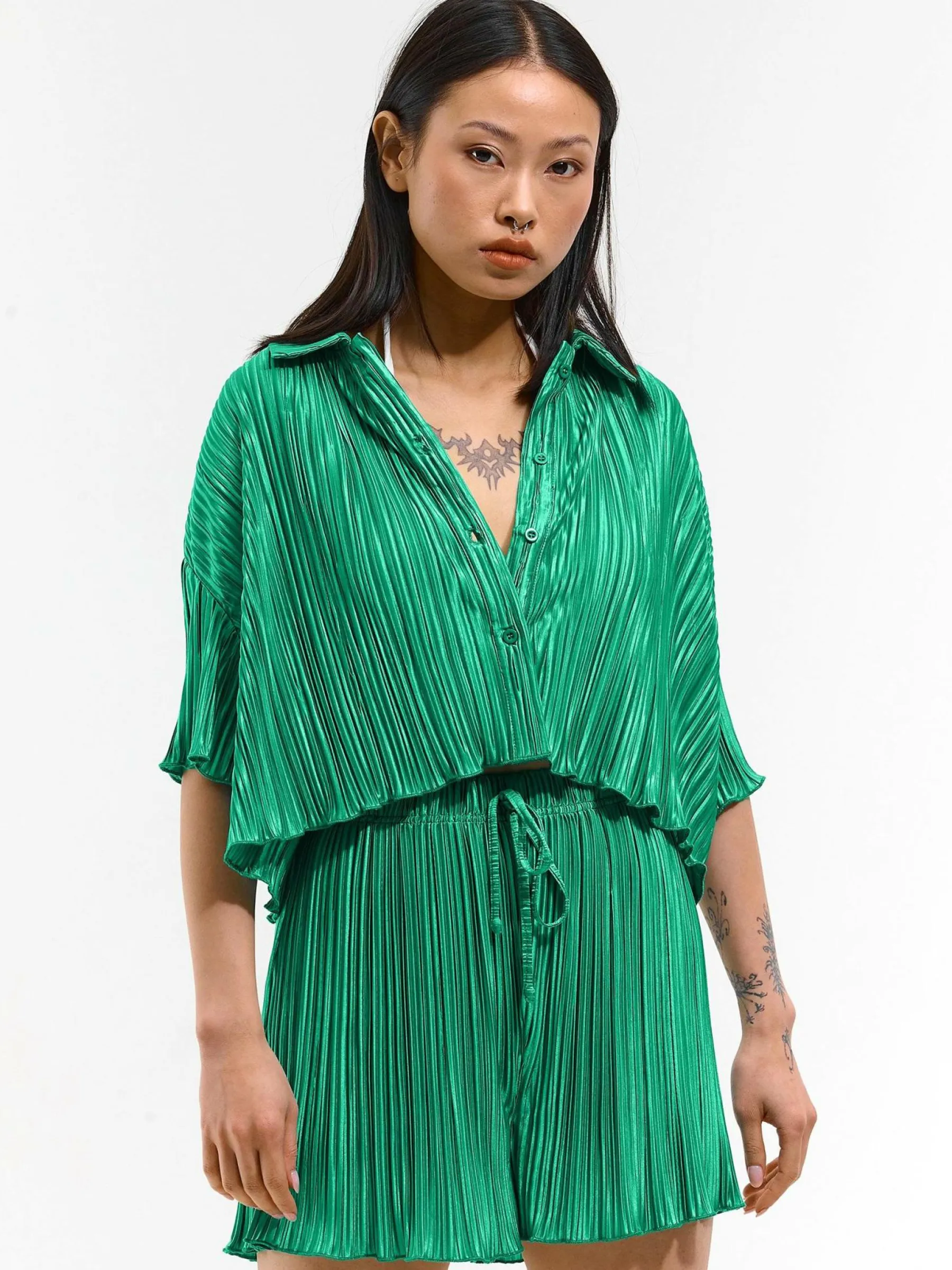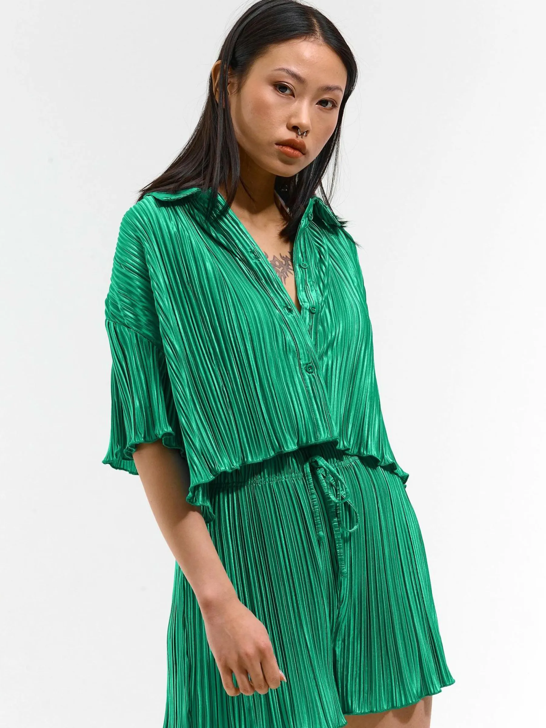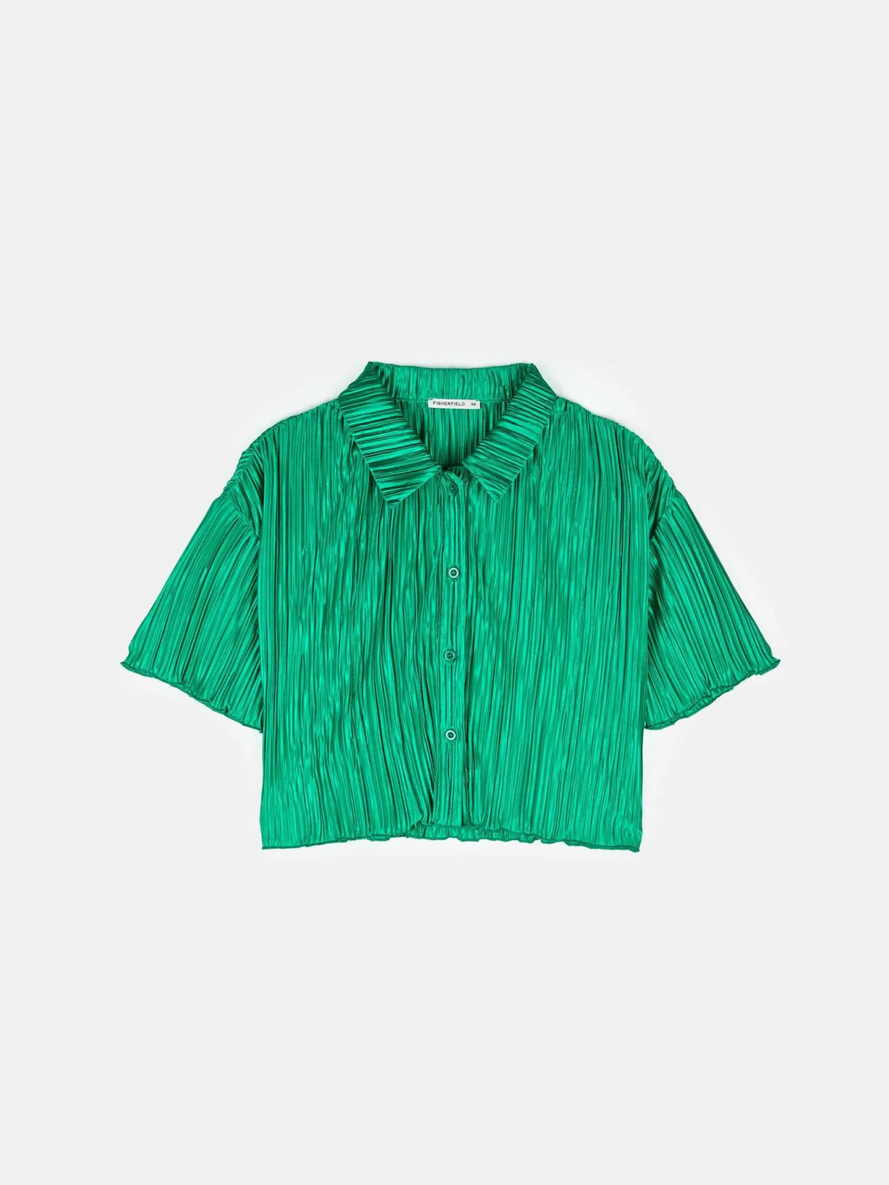Kolor: zielonyKrój: plisowaneTyp: bluzkaRekaw: krótki rękawDługość: krótkiPattern style: pojedynczy kolorDetal: n…
