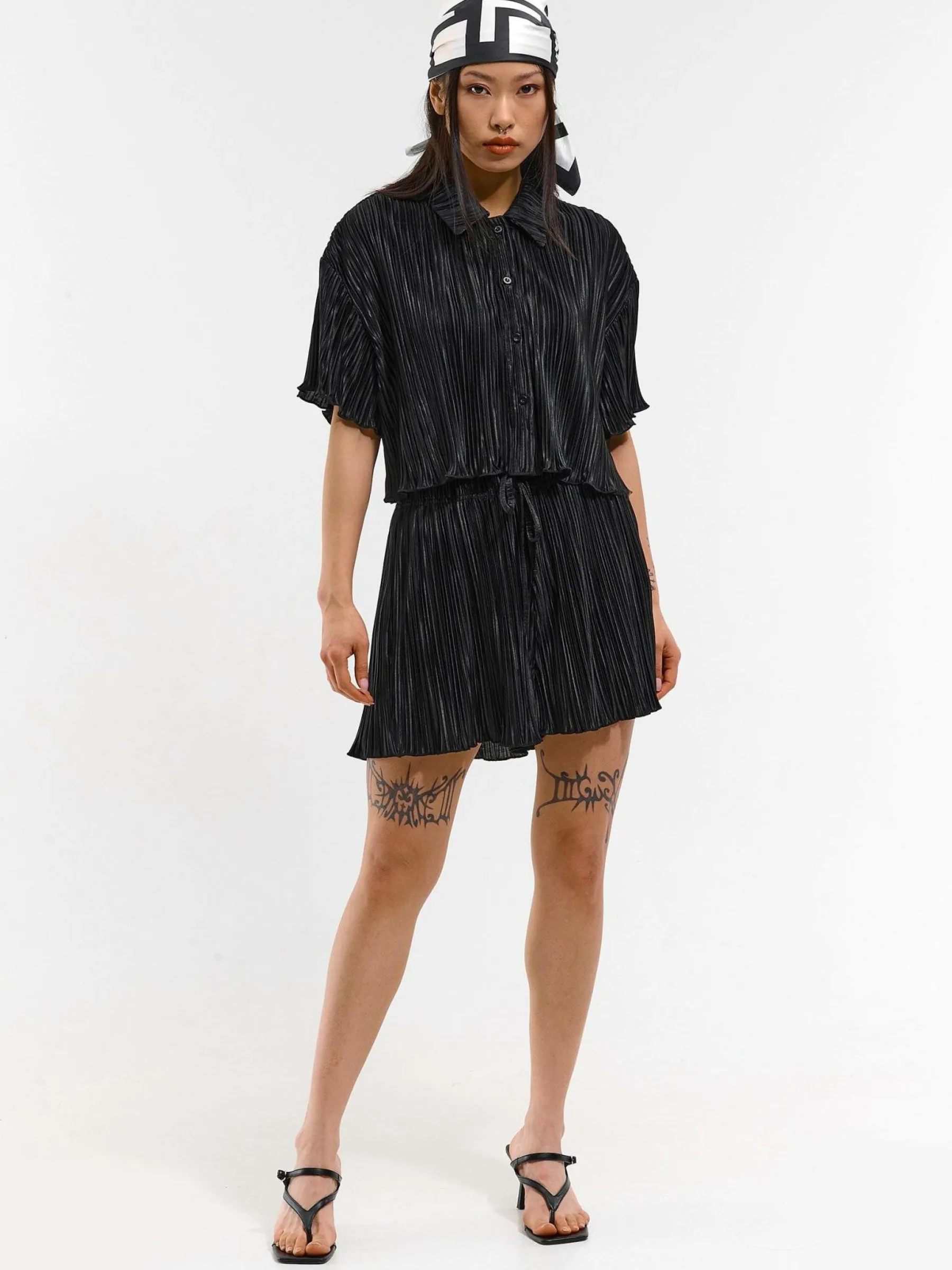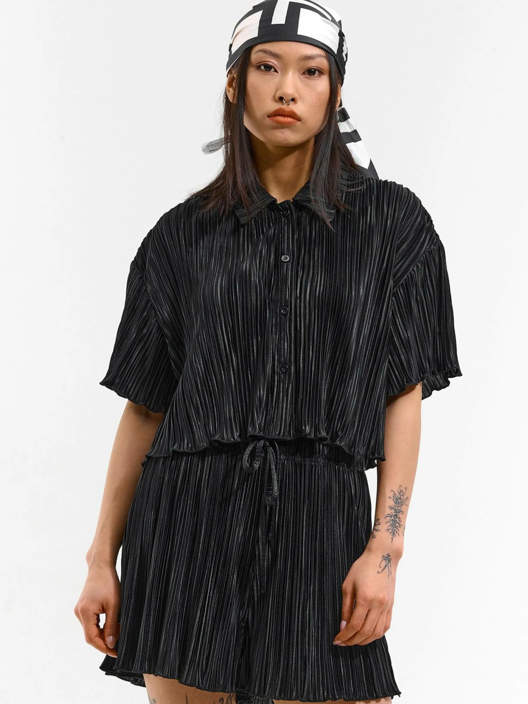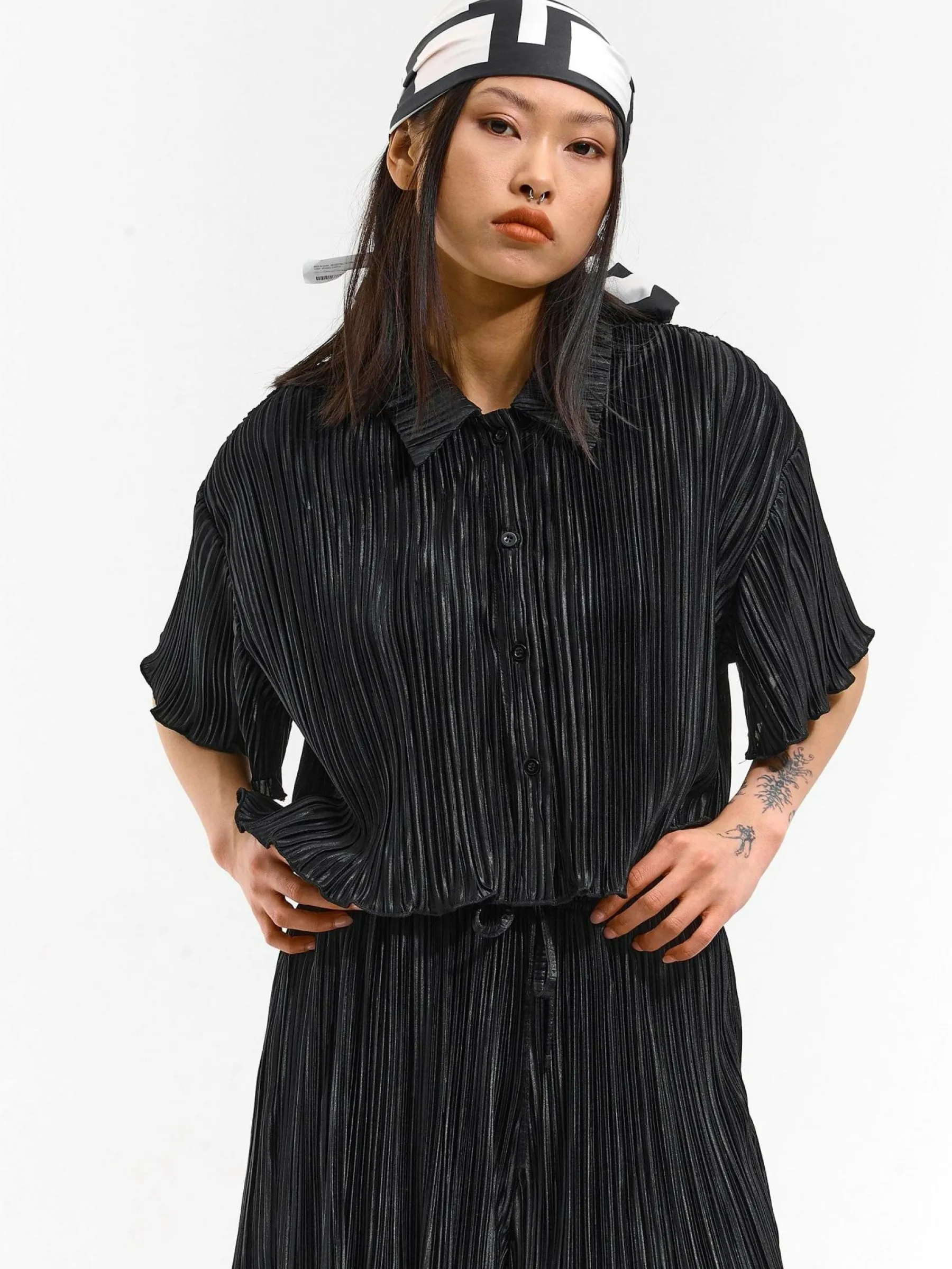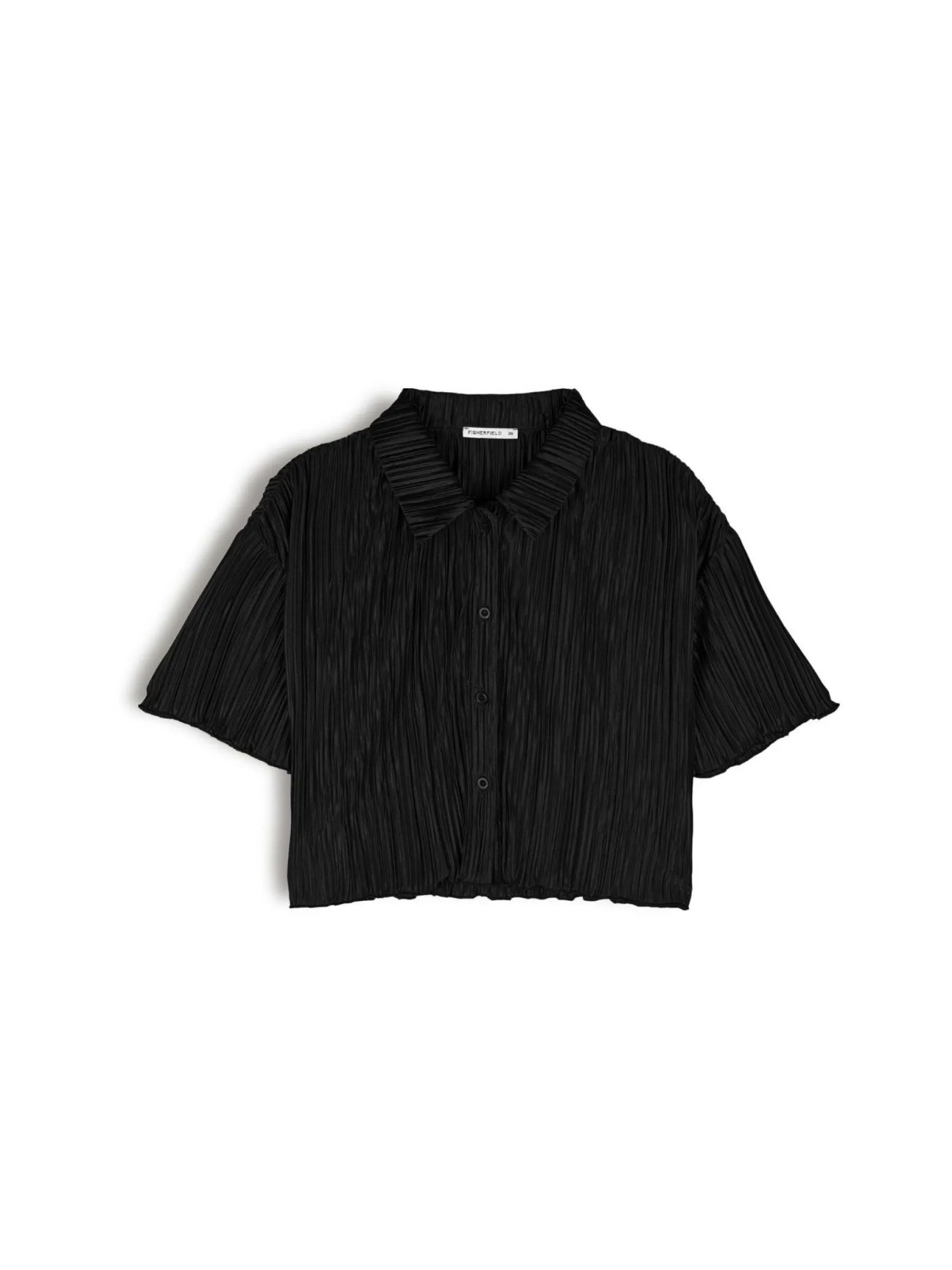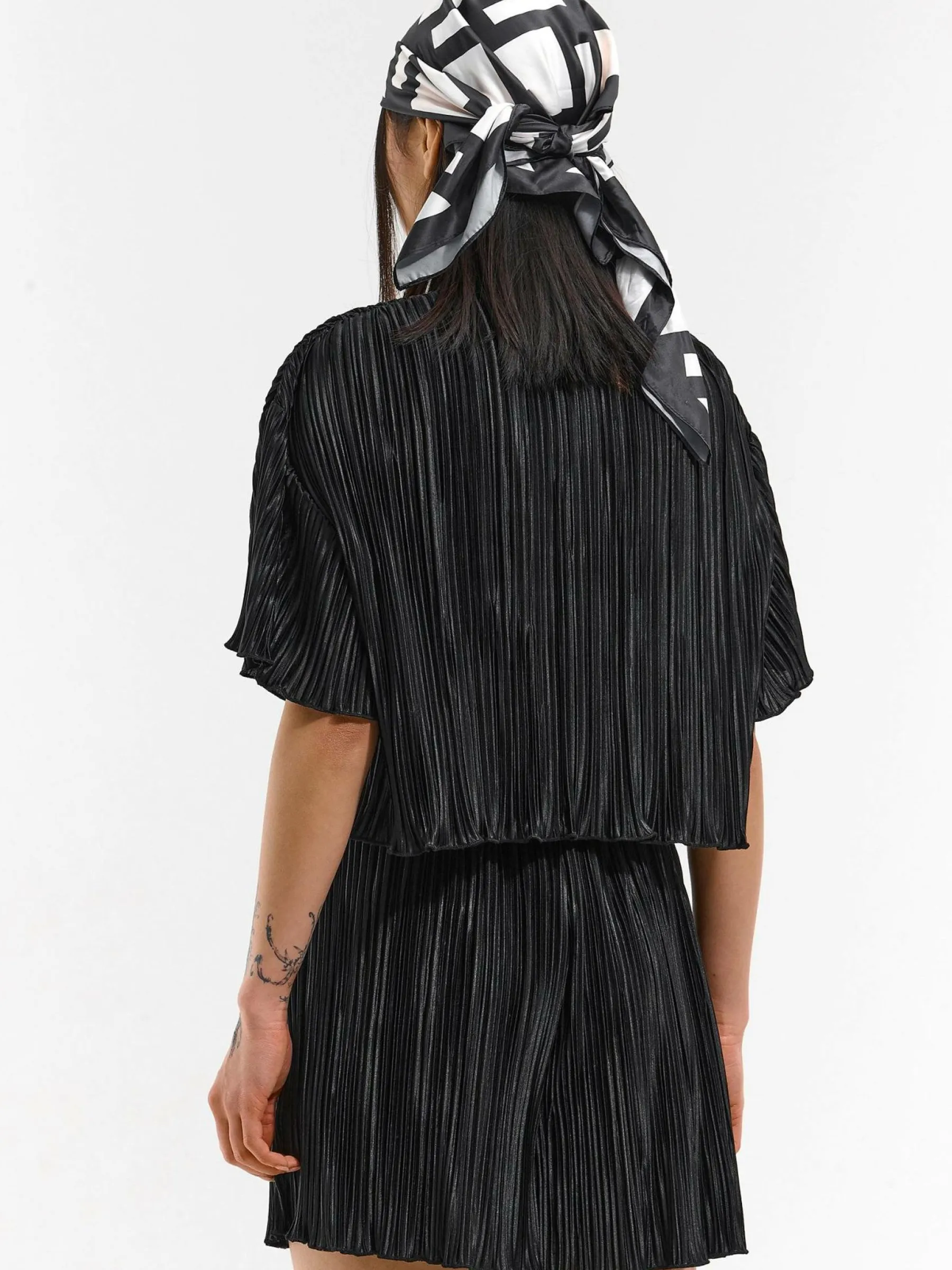Kolor: czarnyKrój: plisowaneTyp: bluzkaRekaw: krótki rękawDługość: krótkiPattern style: pojedynczy kolorDetal: na…
