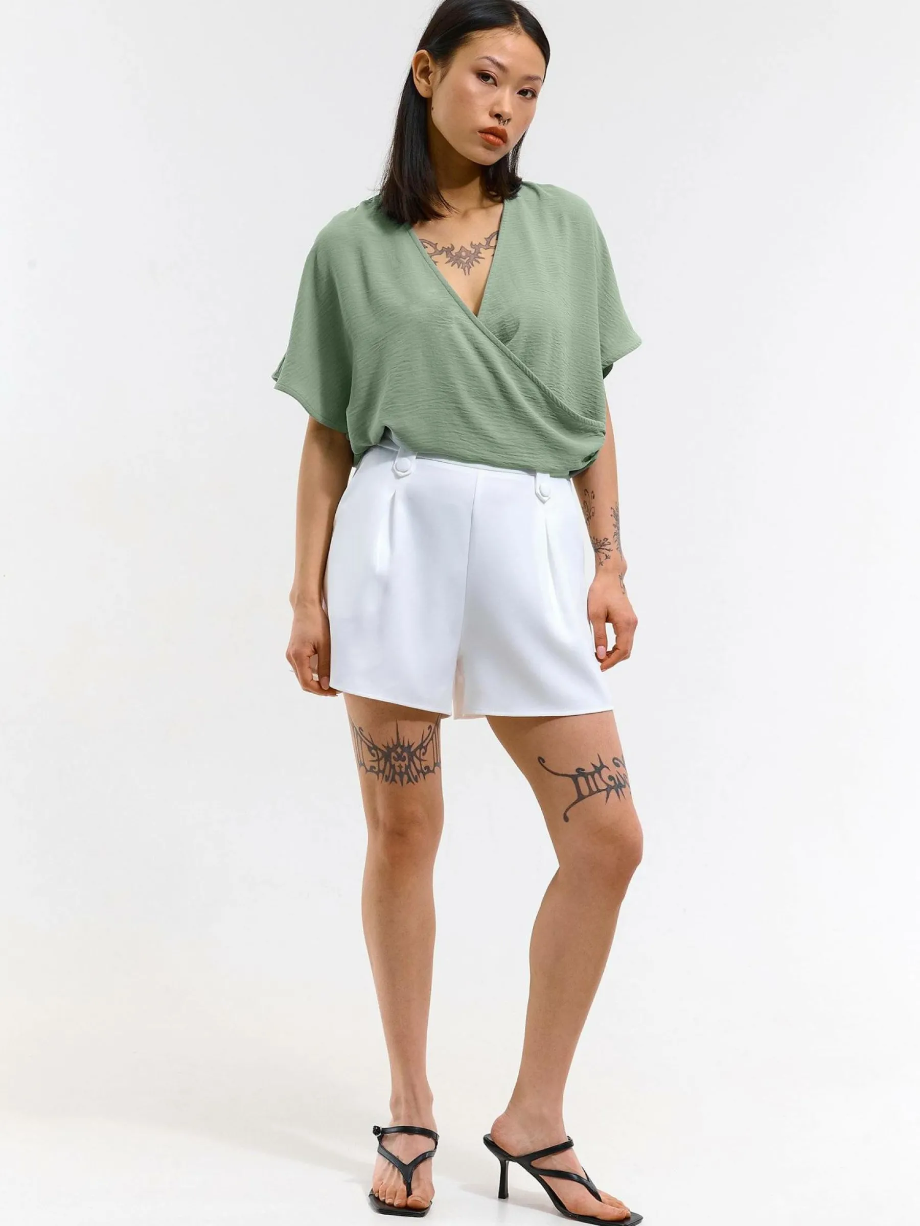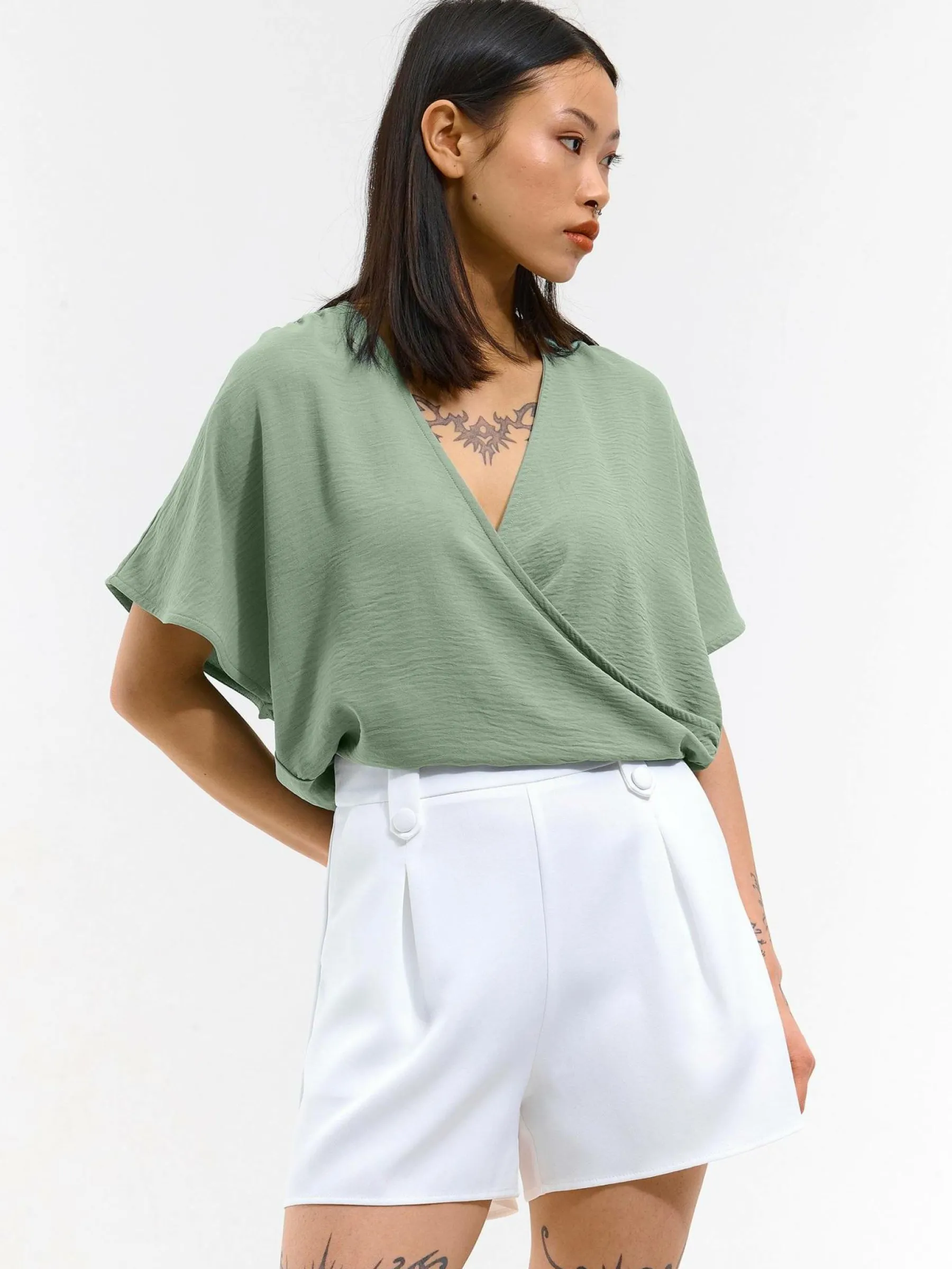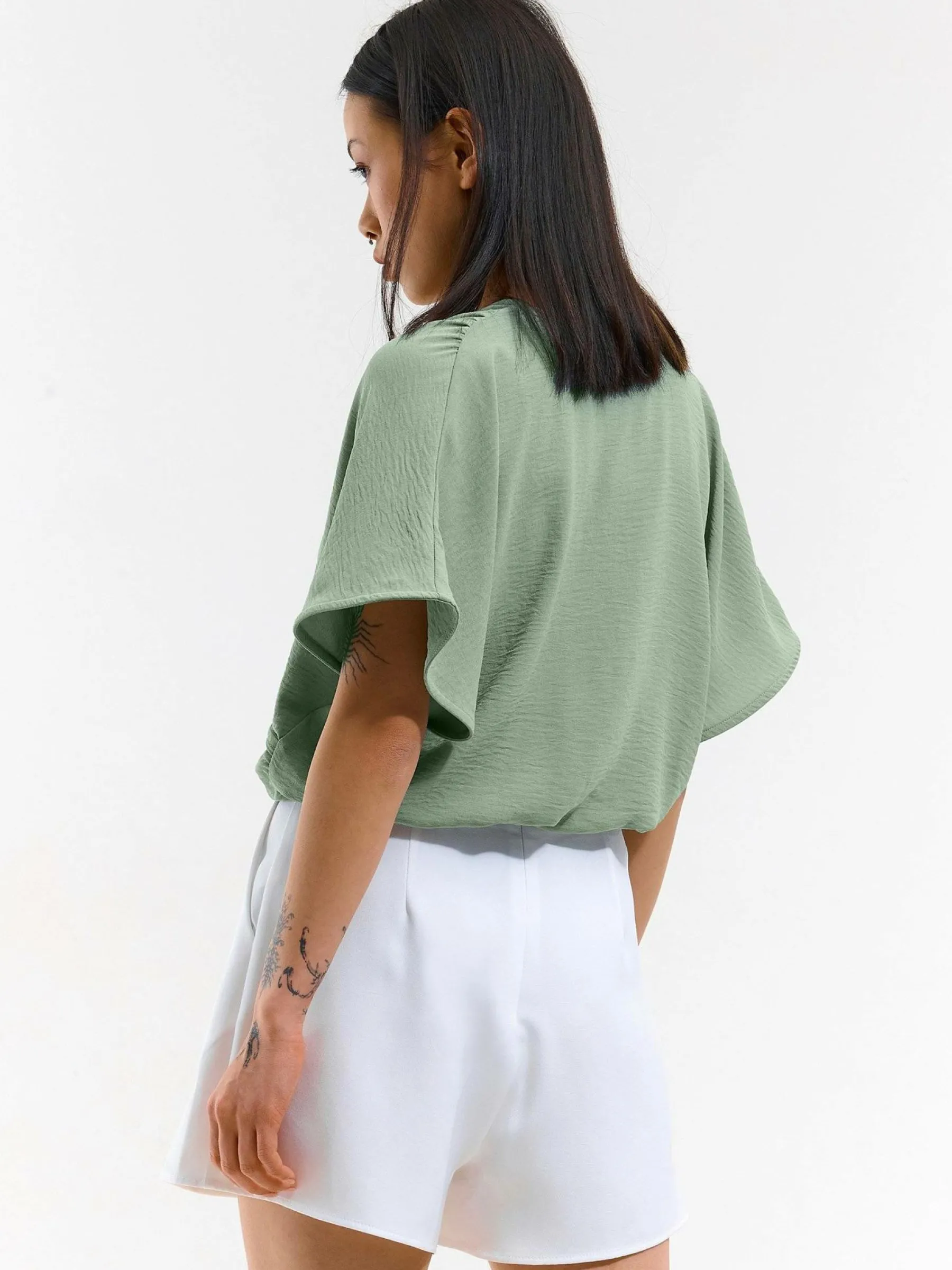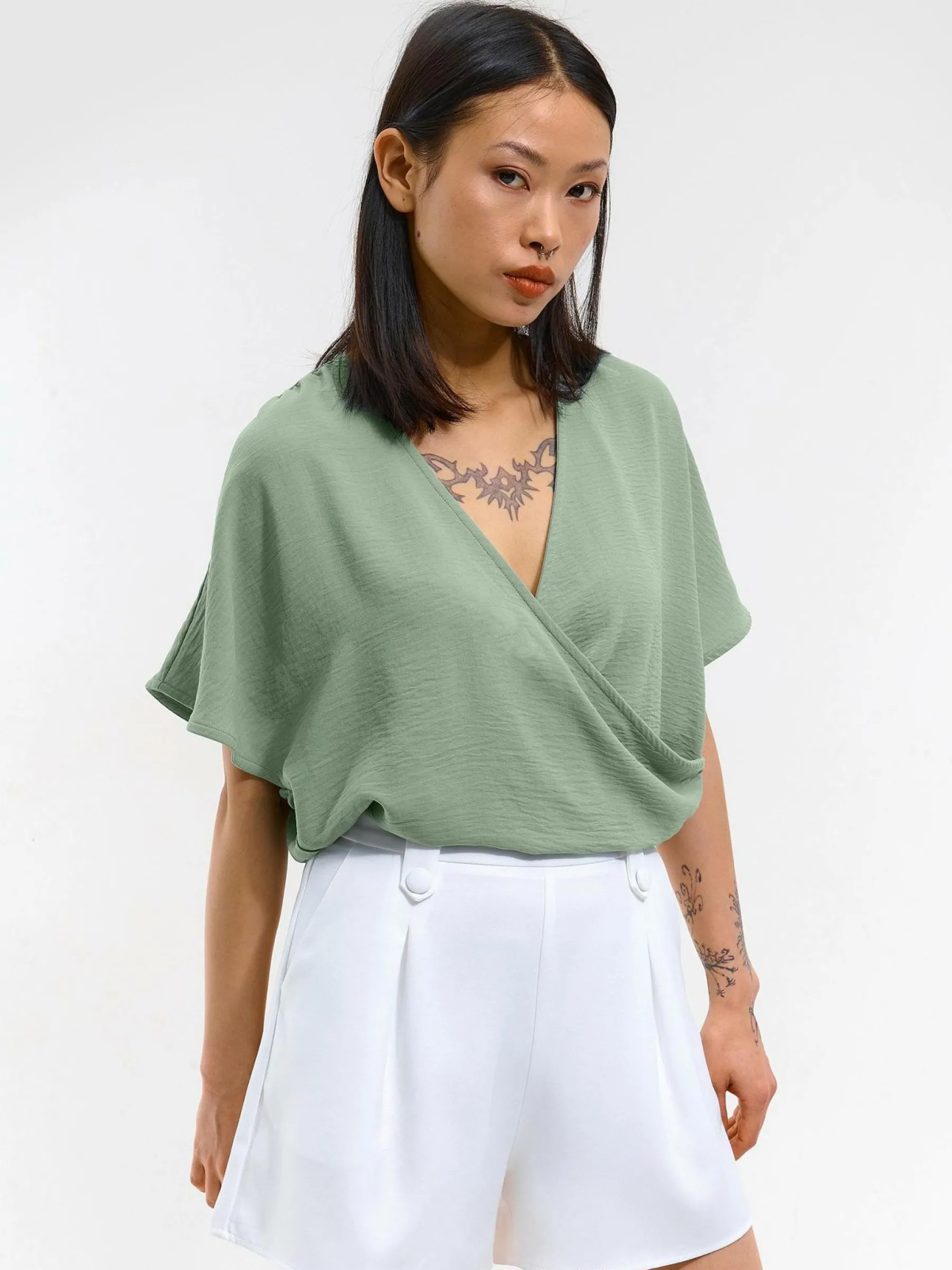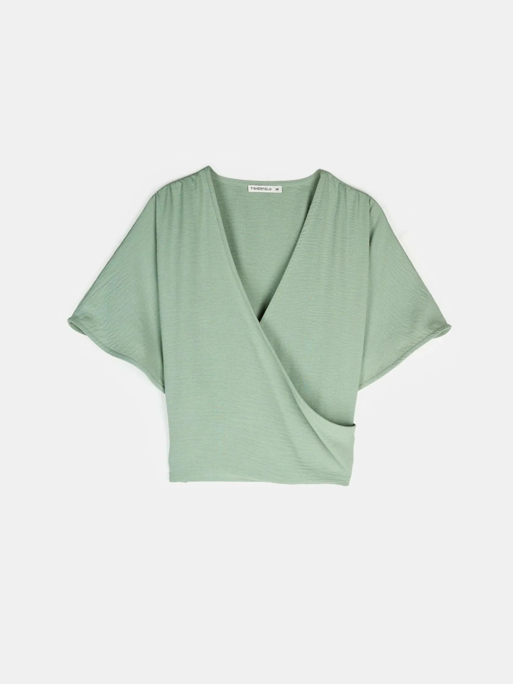 Kolor: zielonyKrój: kopertówkiTyp: bluzka, topRekaw: krótki rękawDługość: krótkiPattern style: pojedynczy kolorD…