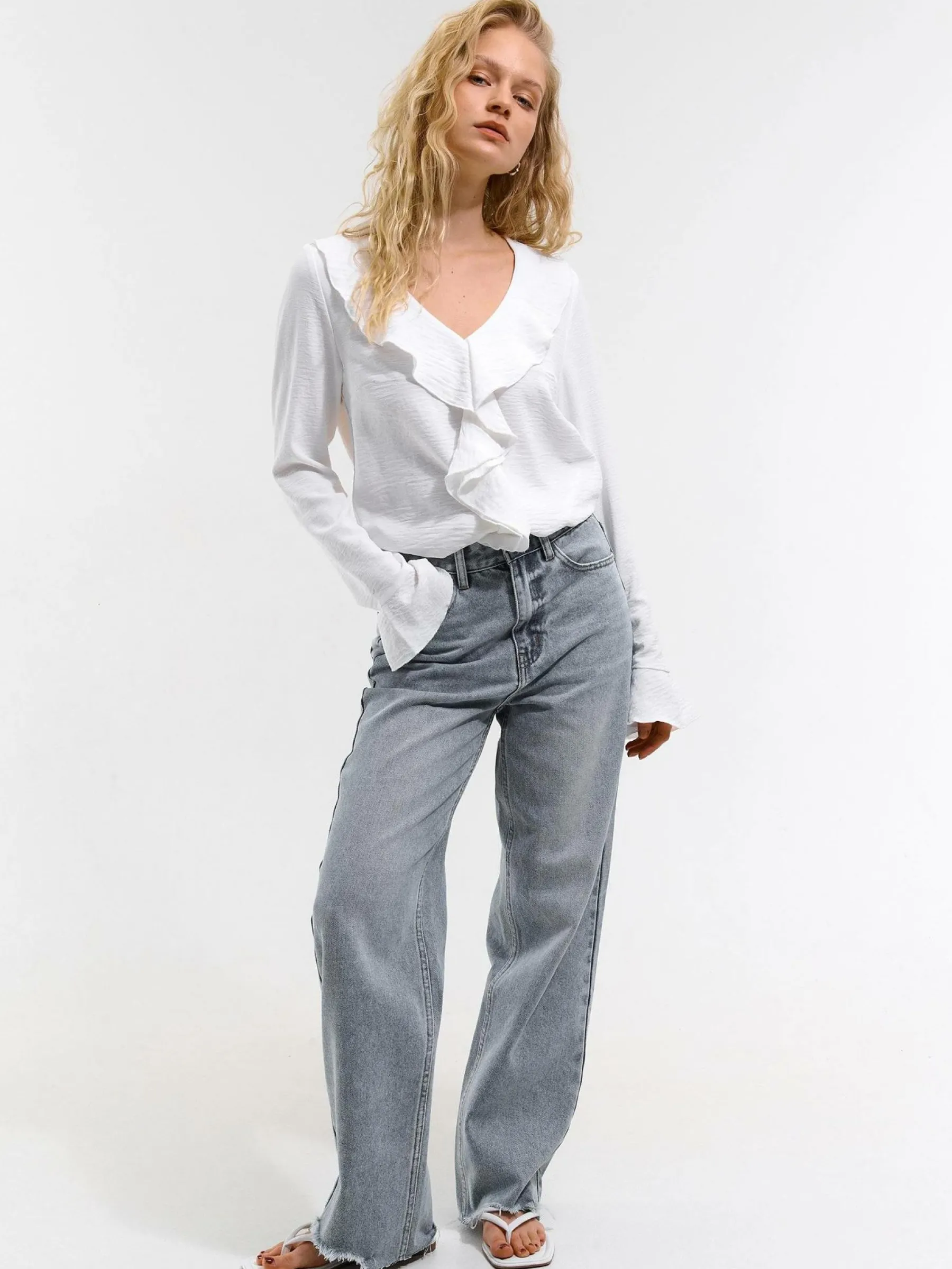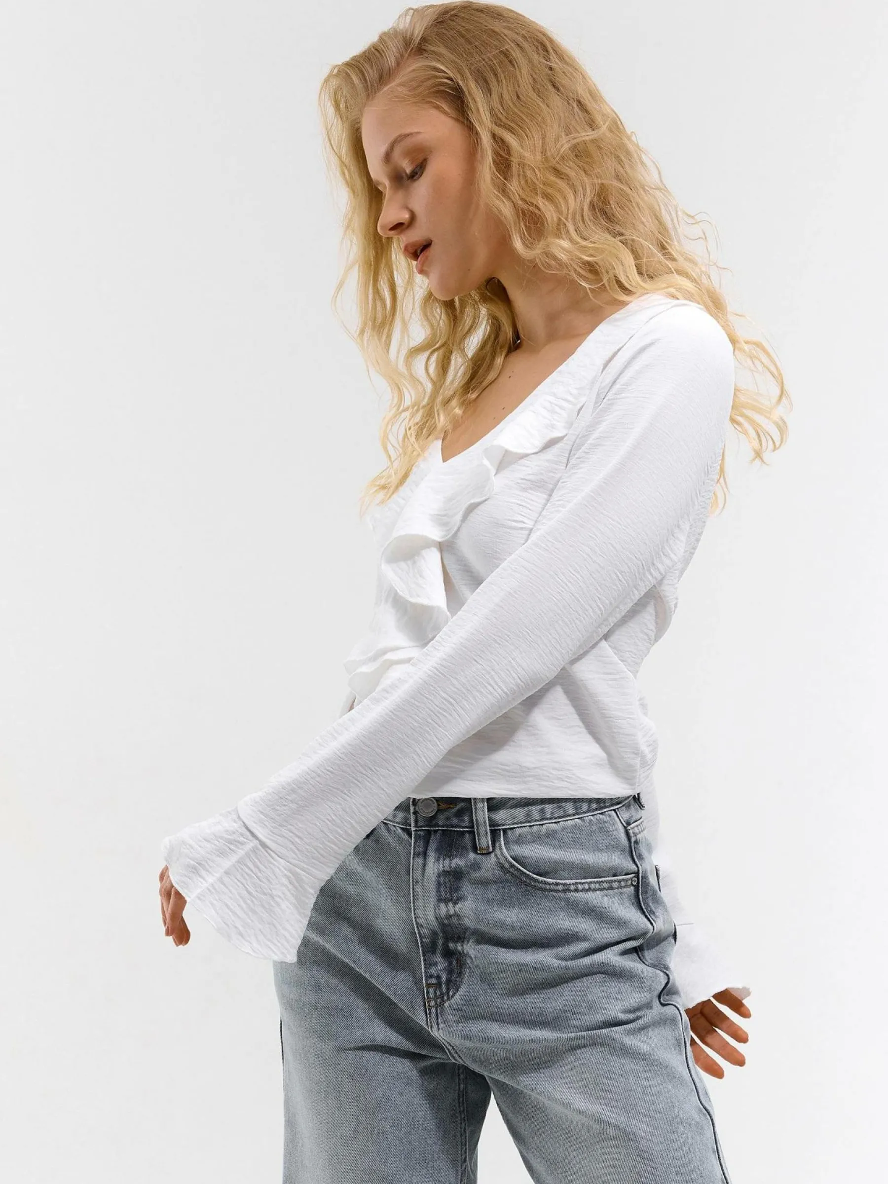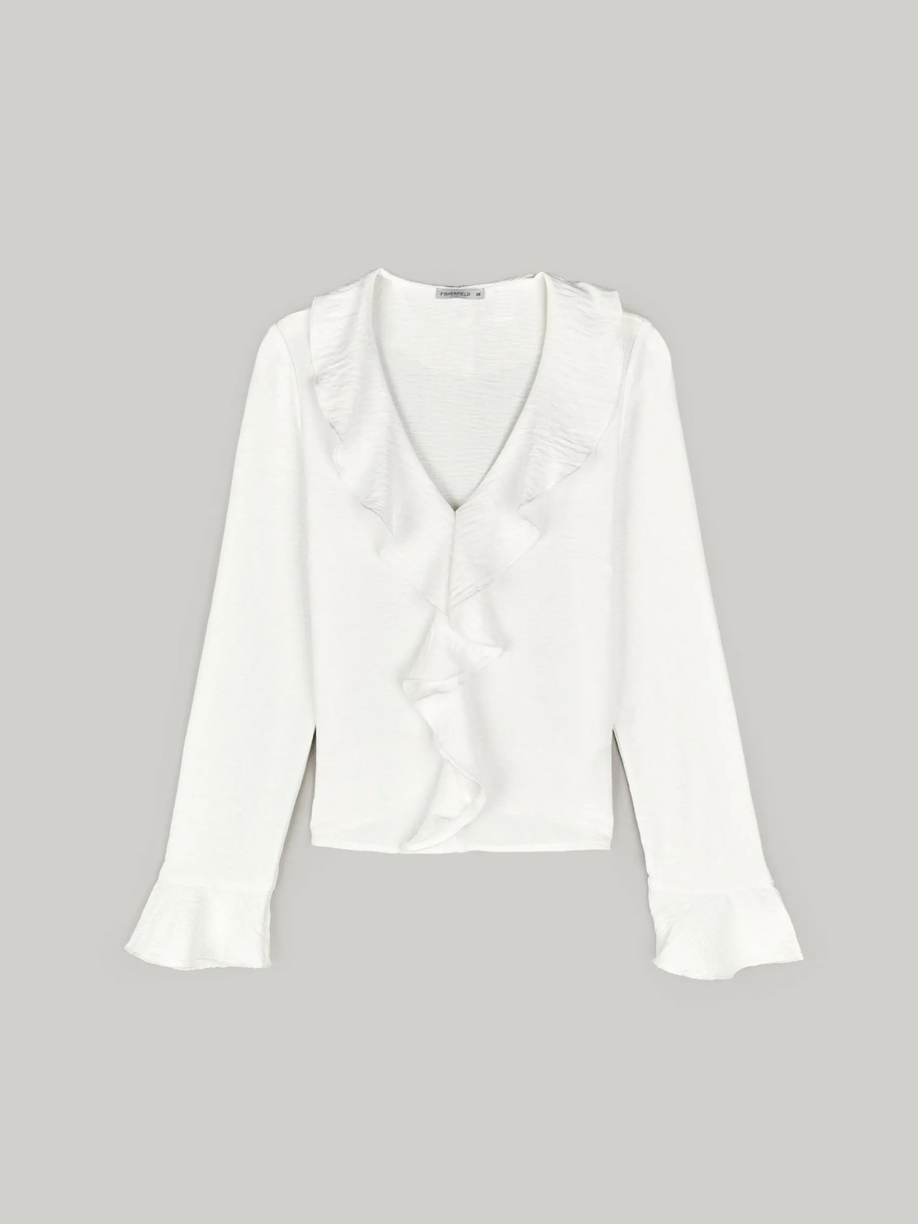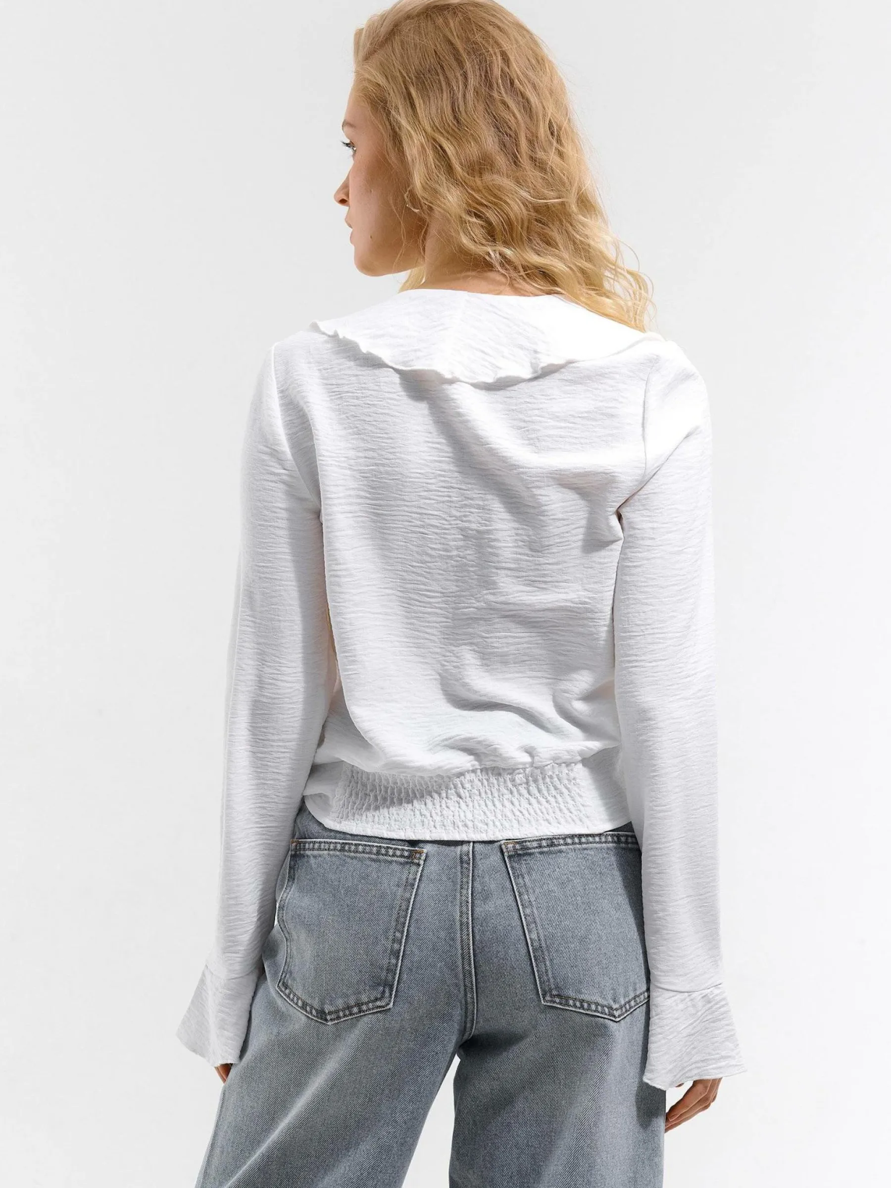 Kolor: białyKrój: z falbanąTyp: bluzkaRekaw: długi rękawDługość: krótkiPattern style: pojedynczy kolorDetal: v-…