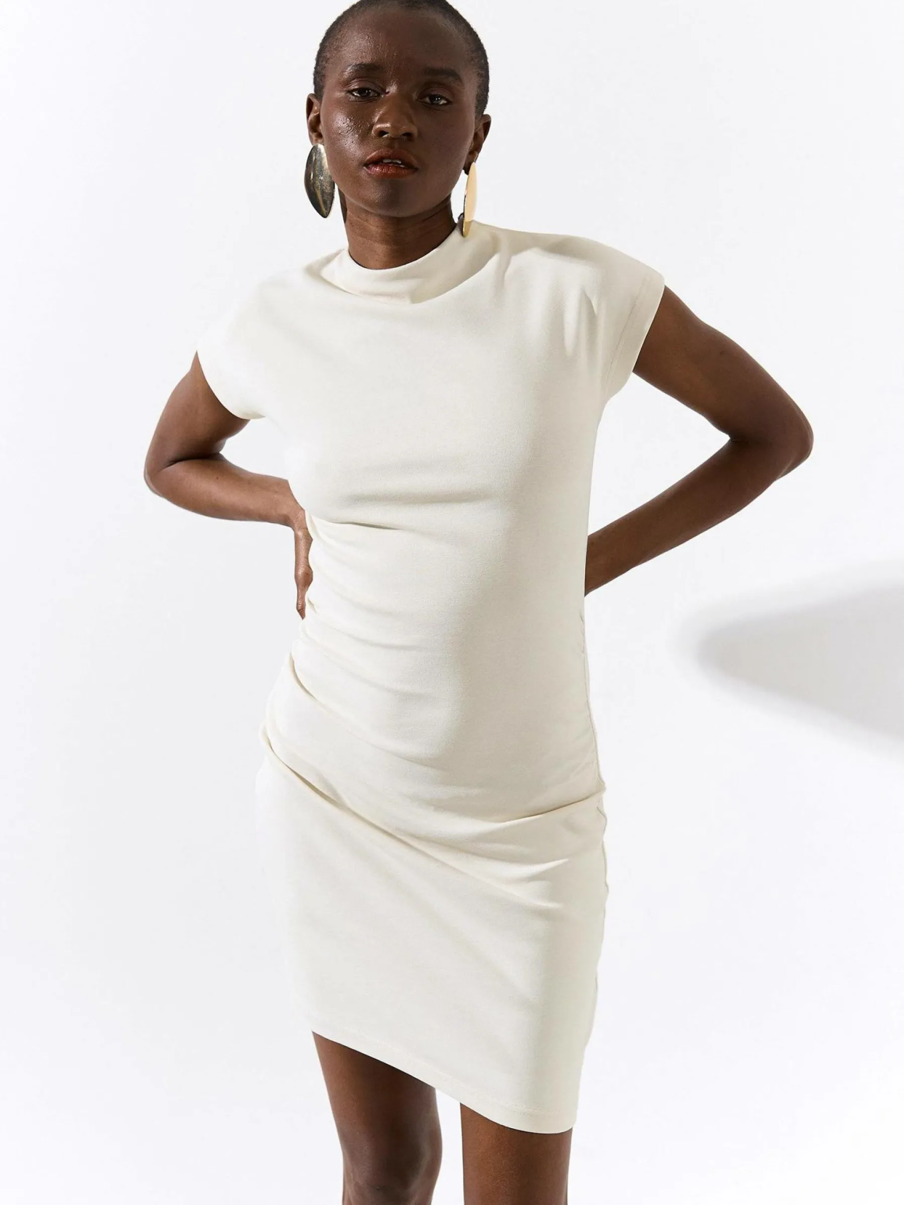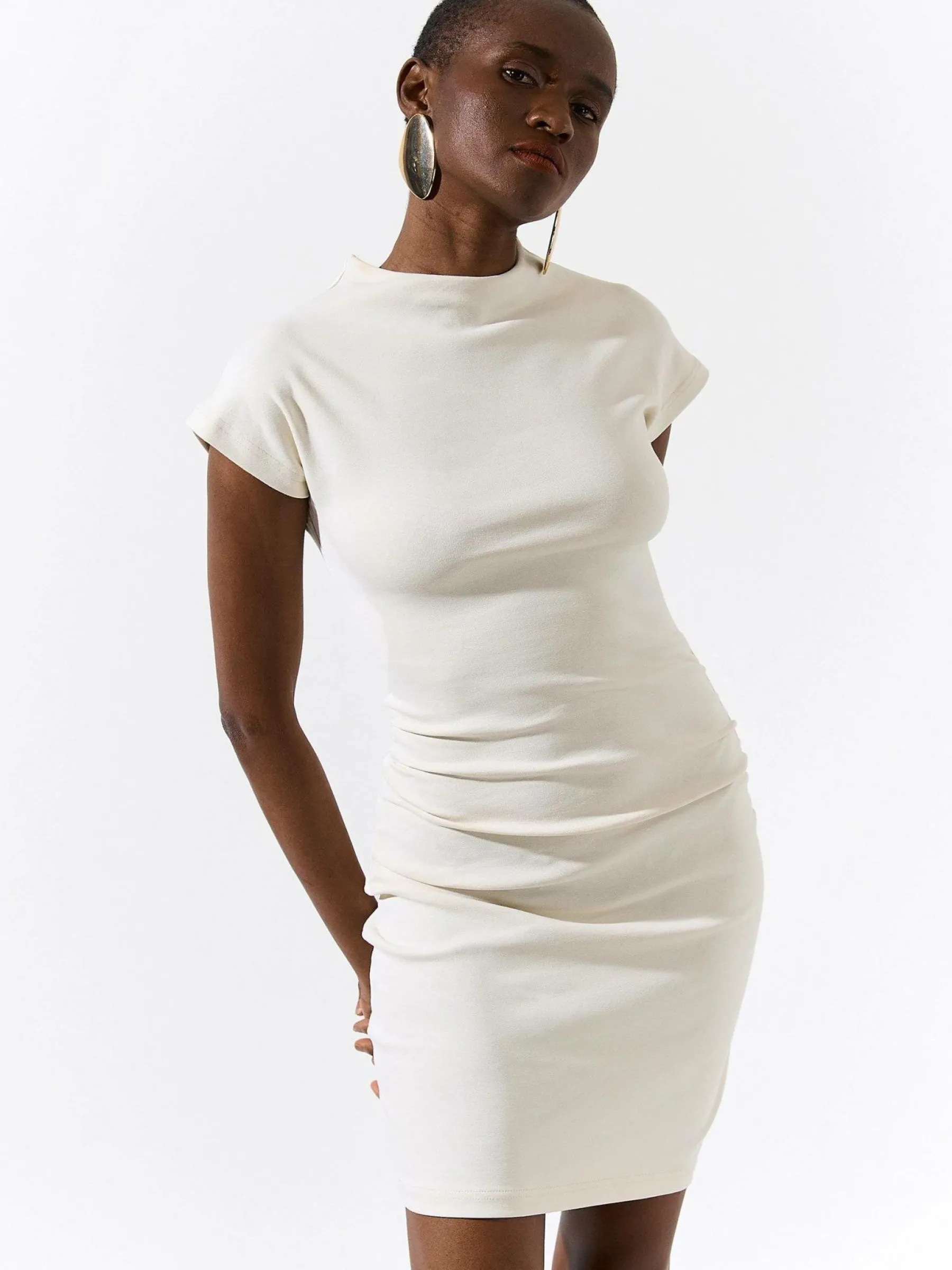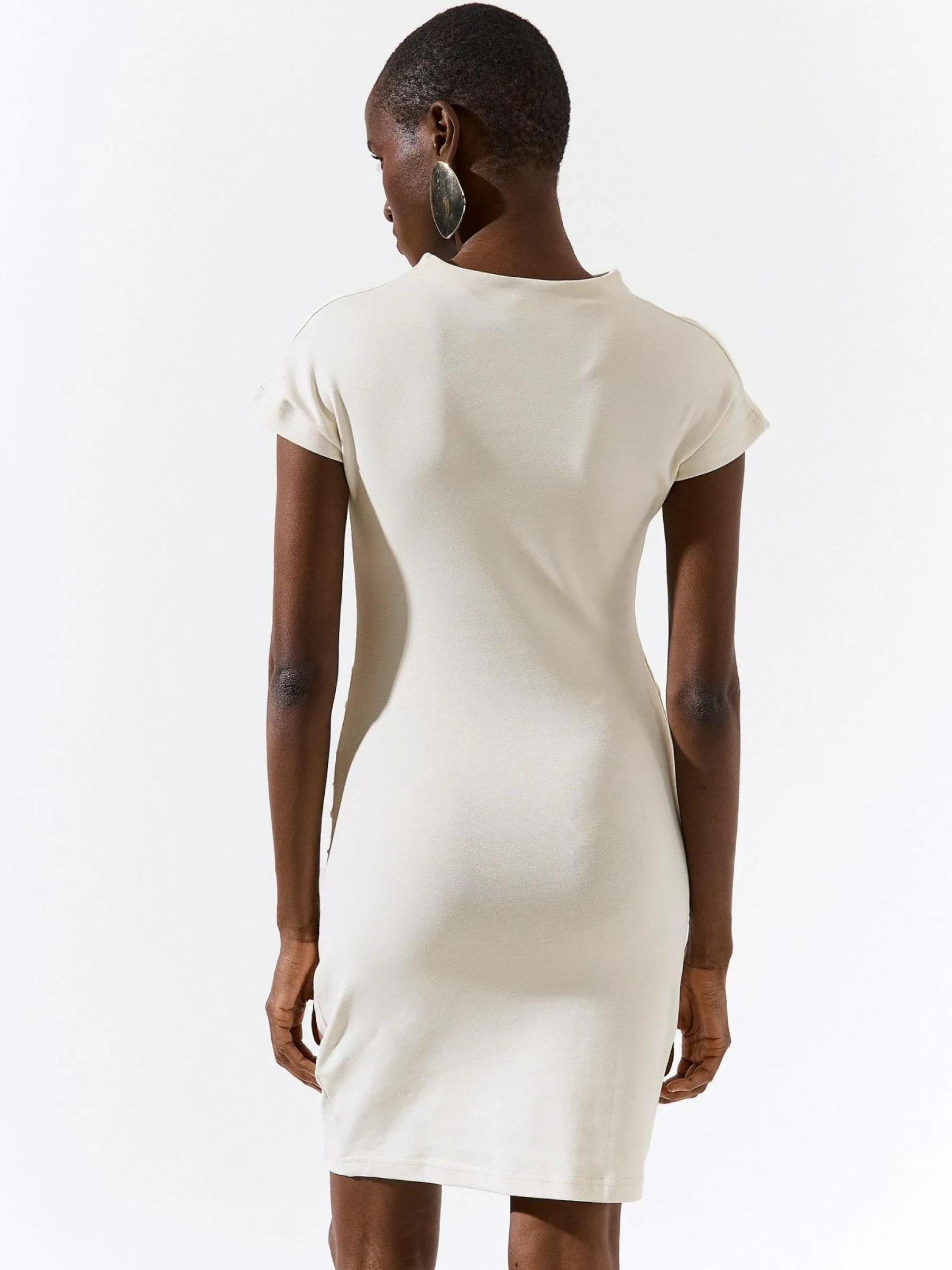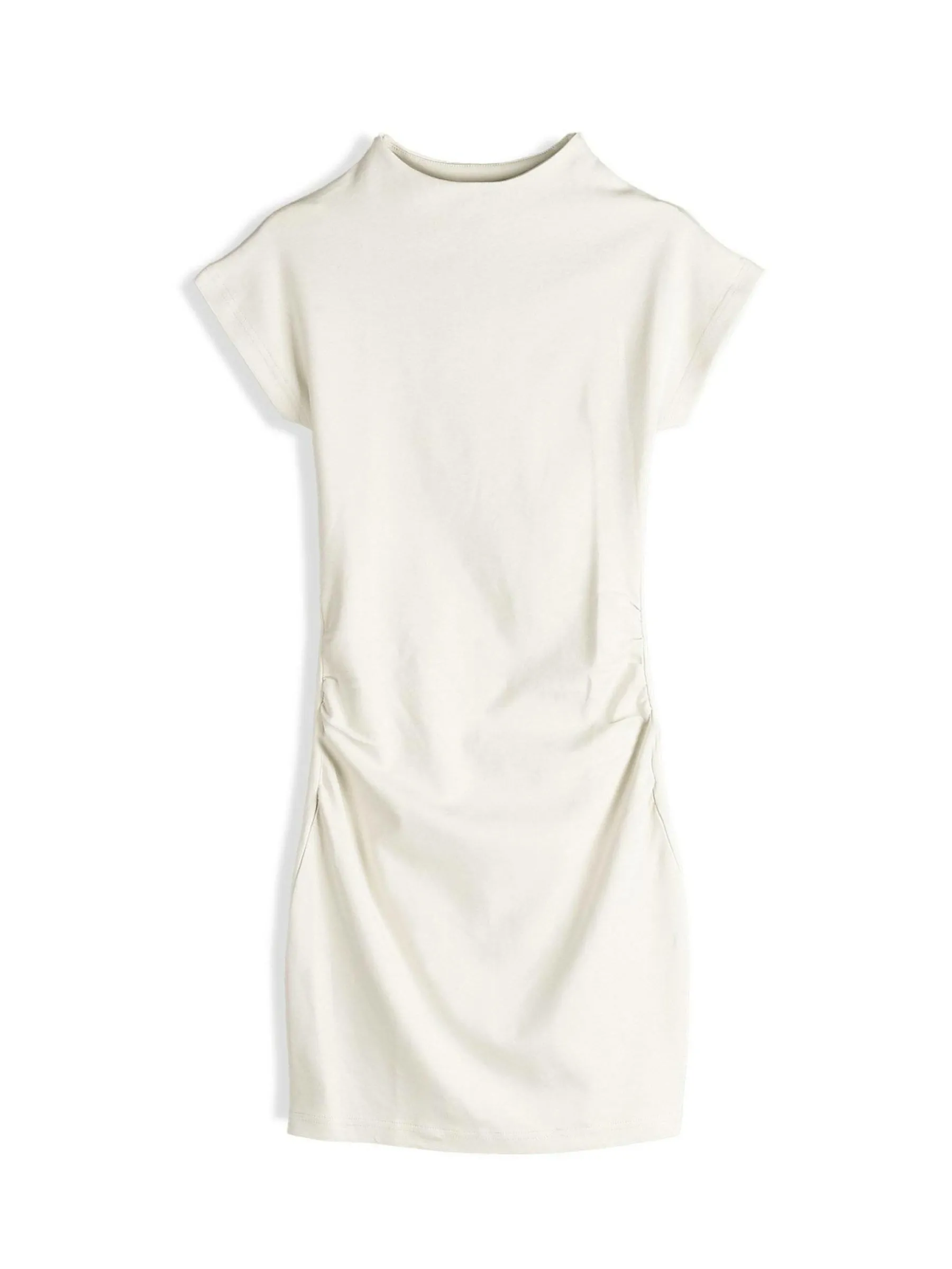 Kolor: beżowyKrój: z marszczeniemTyp: sukienkaRekaw: krótki rękawDługość: miniPattern style: pojedynczy kolorDeta…