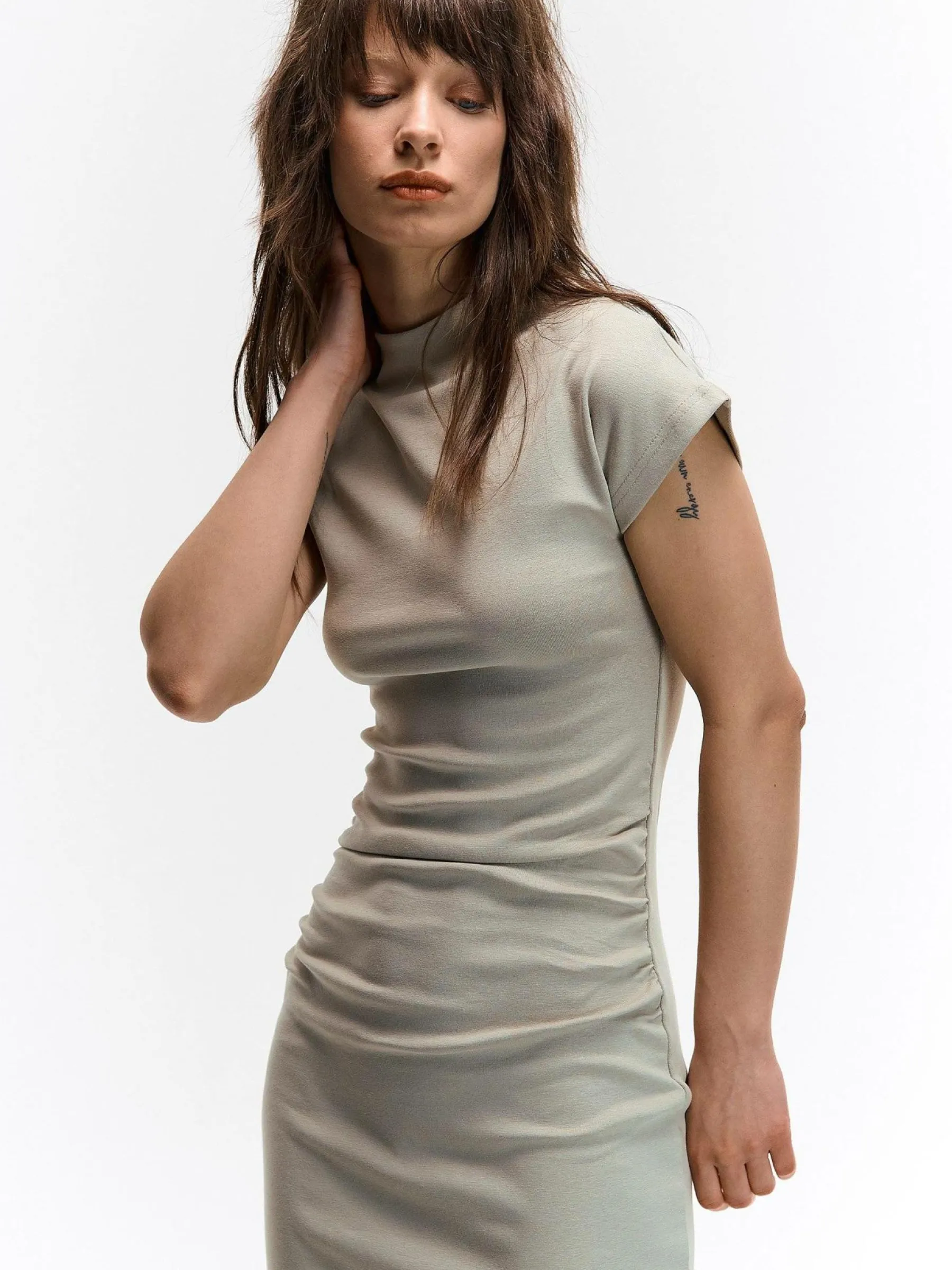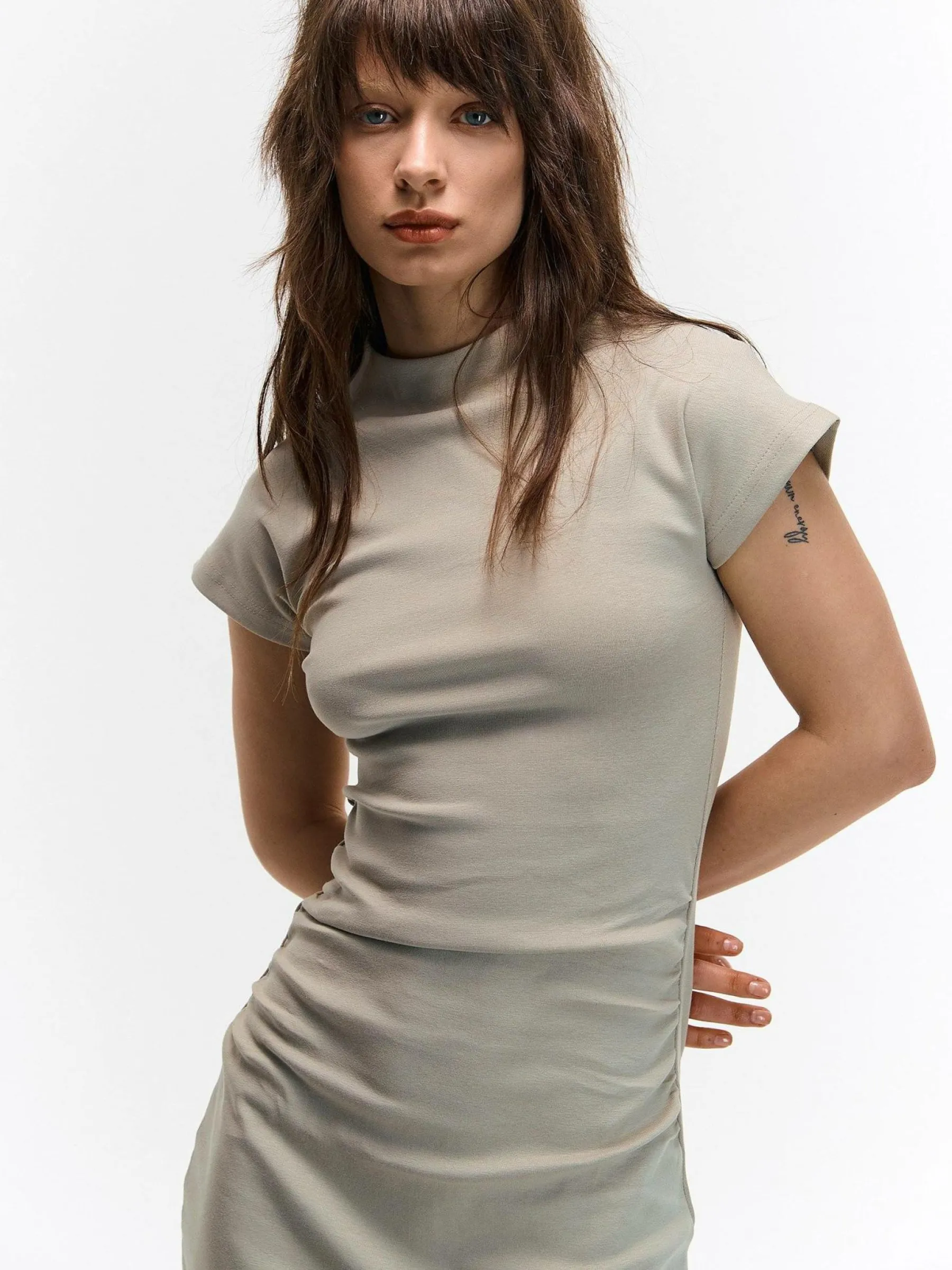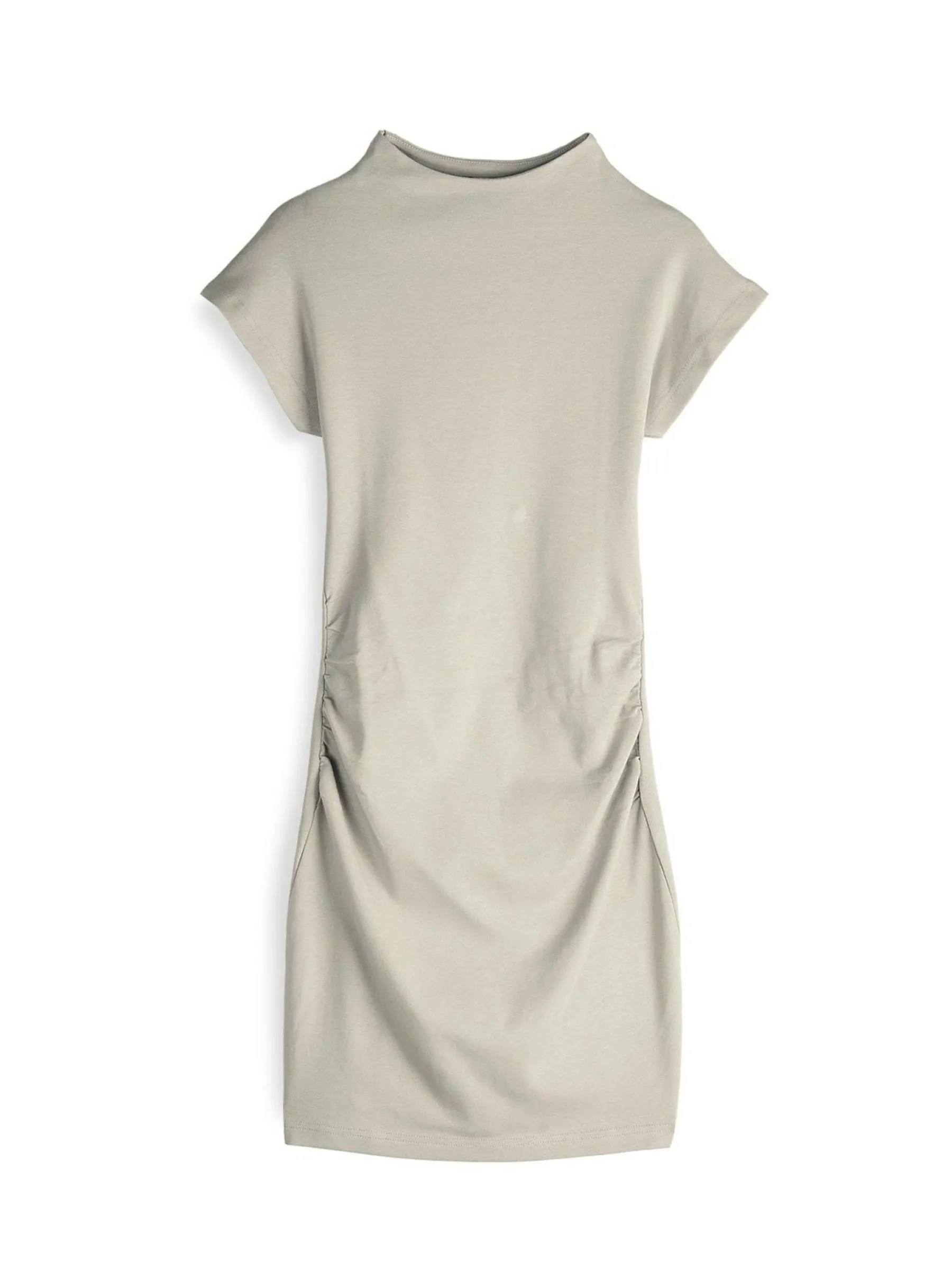 Kolor: beżowyKrój: z marszczeniemTyp: sukienkaRekaw: krótki rękawDługość: miniPattern style: pojedynczy kolorDeta…