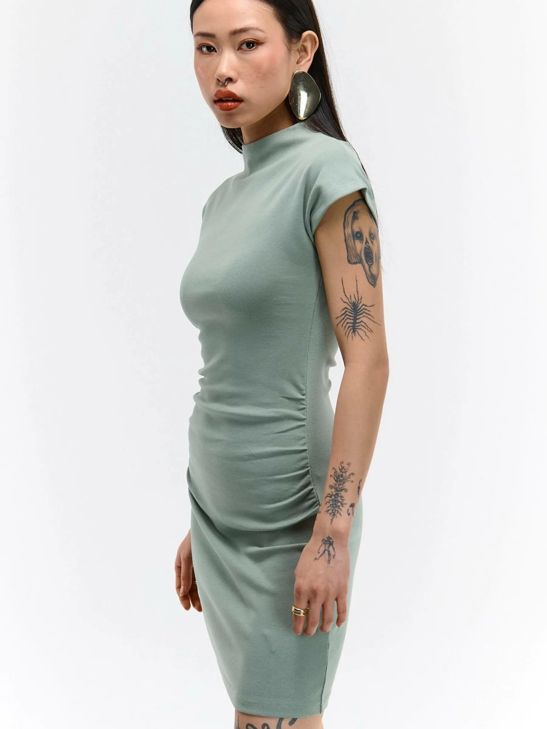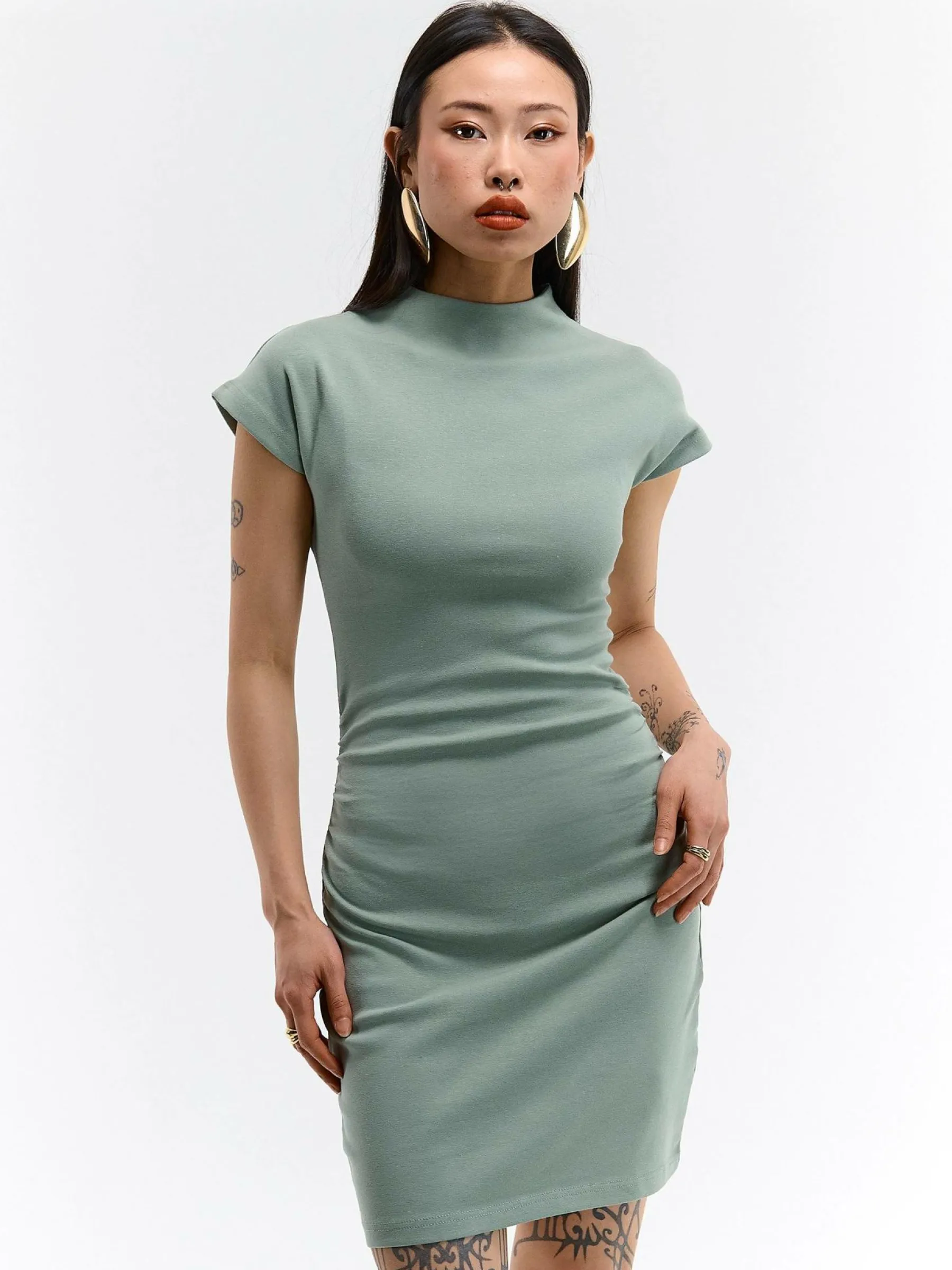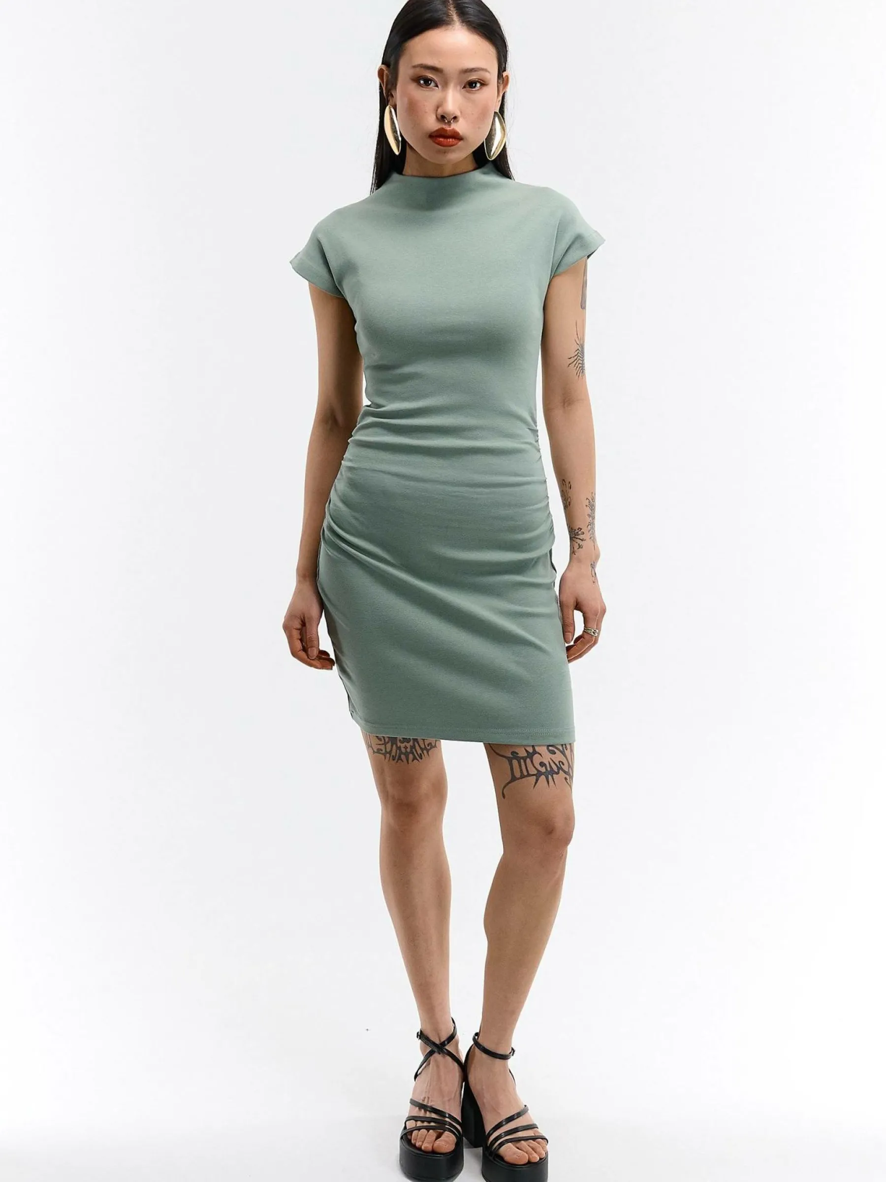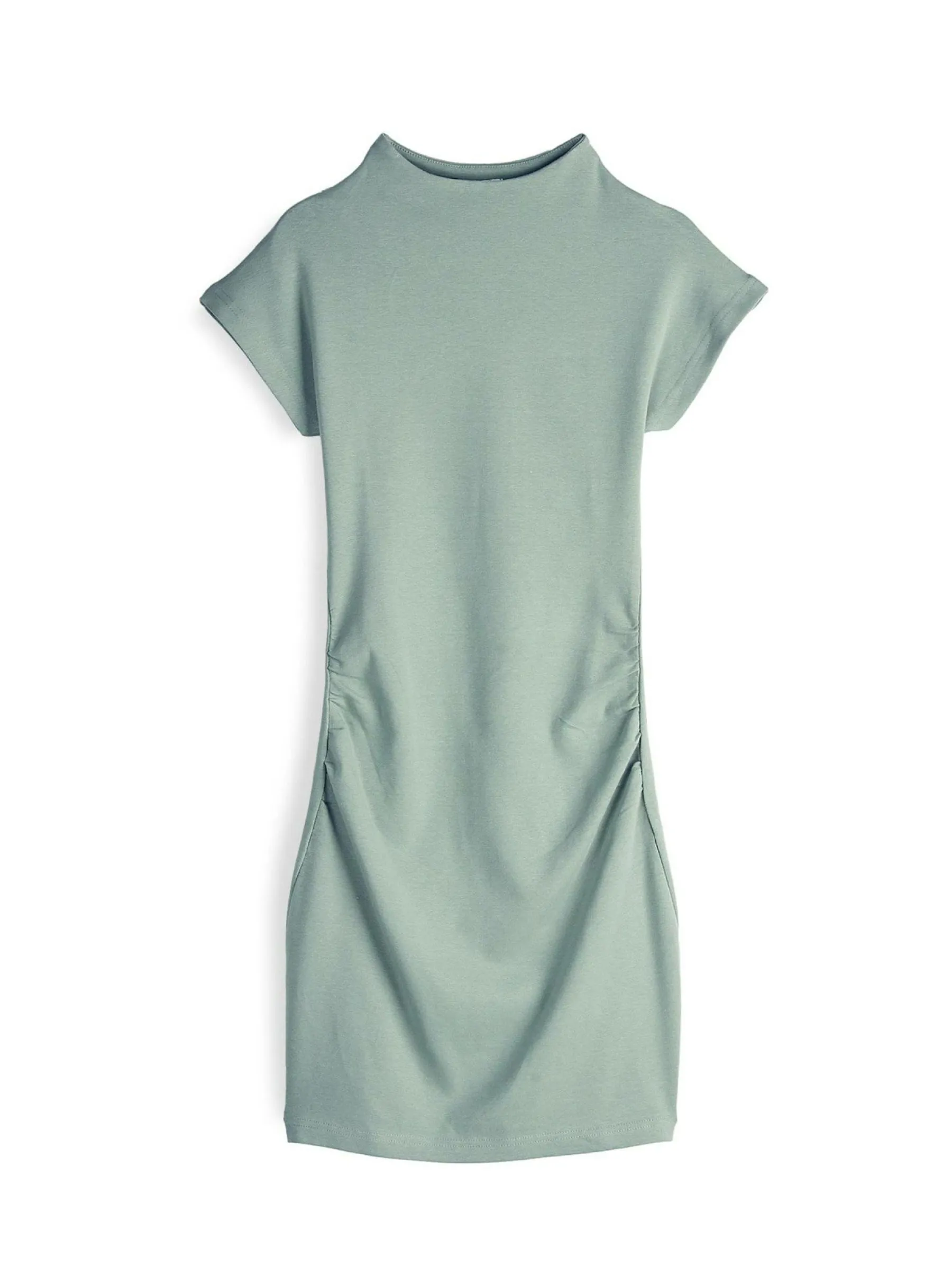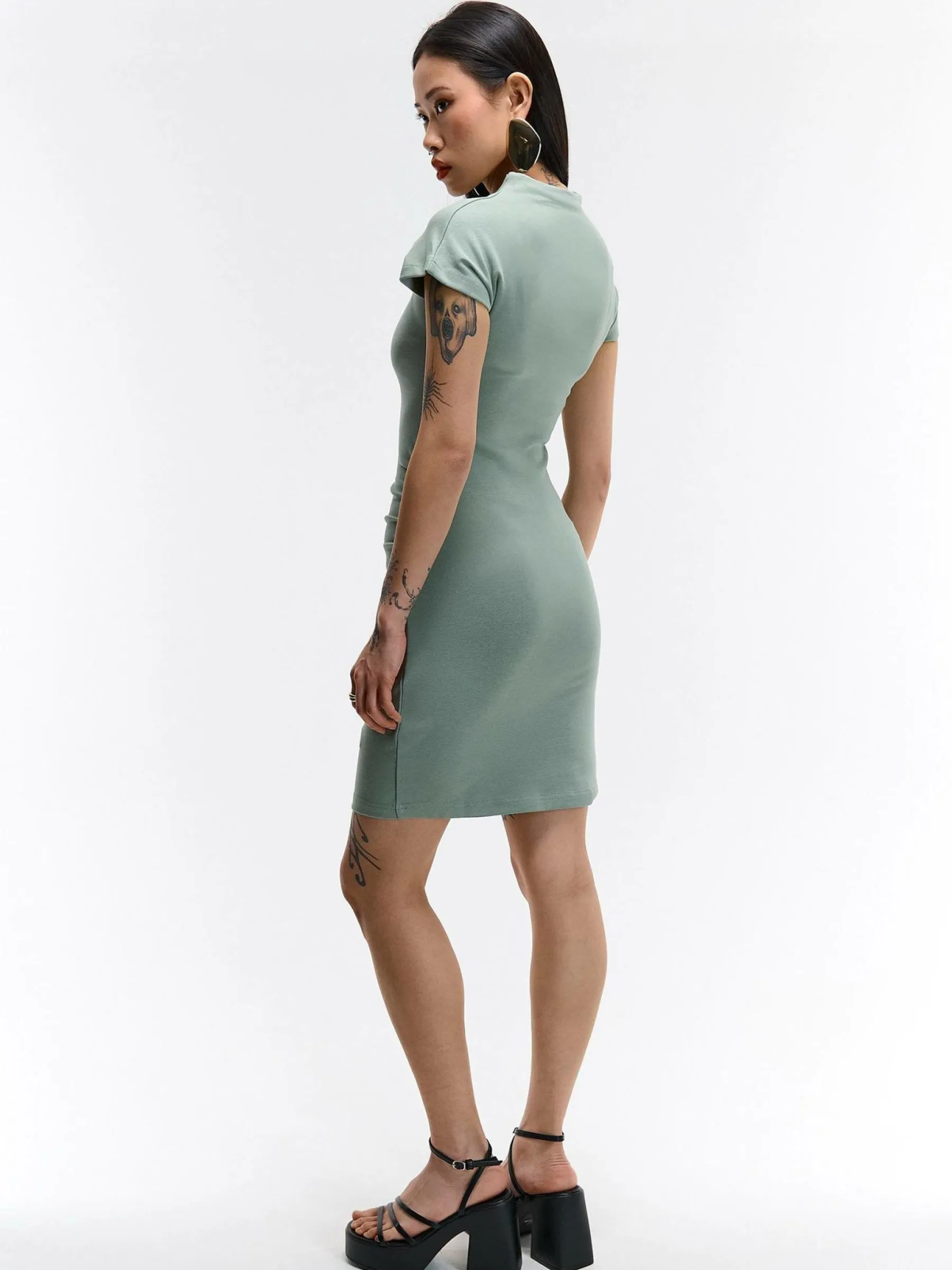 Kolor: zielonyKrój: z marszczeniemTyp: sukienkaRekaw: krótki rękawDługość: miniPattern style: pojedynczy kolorDeta…