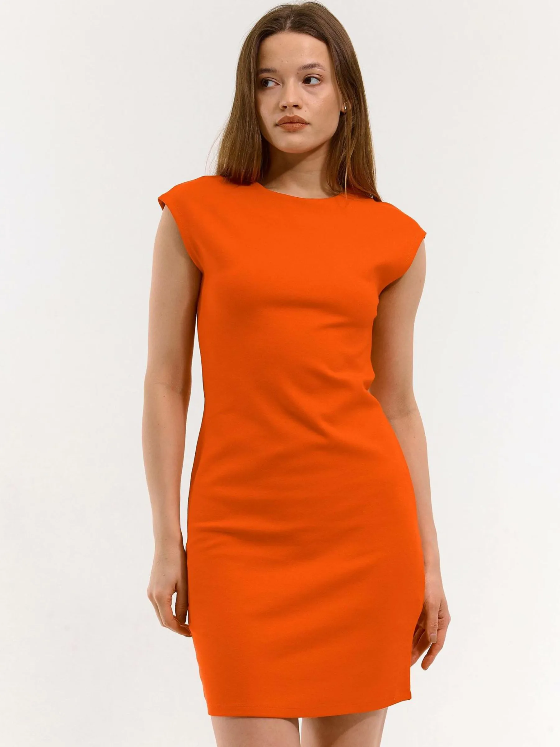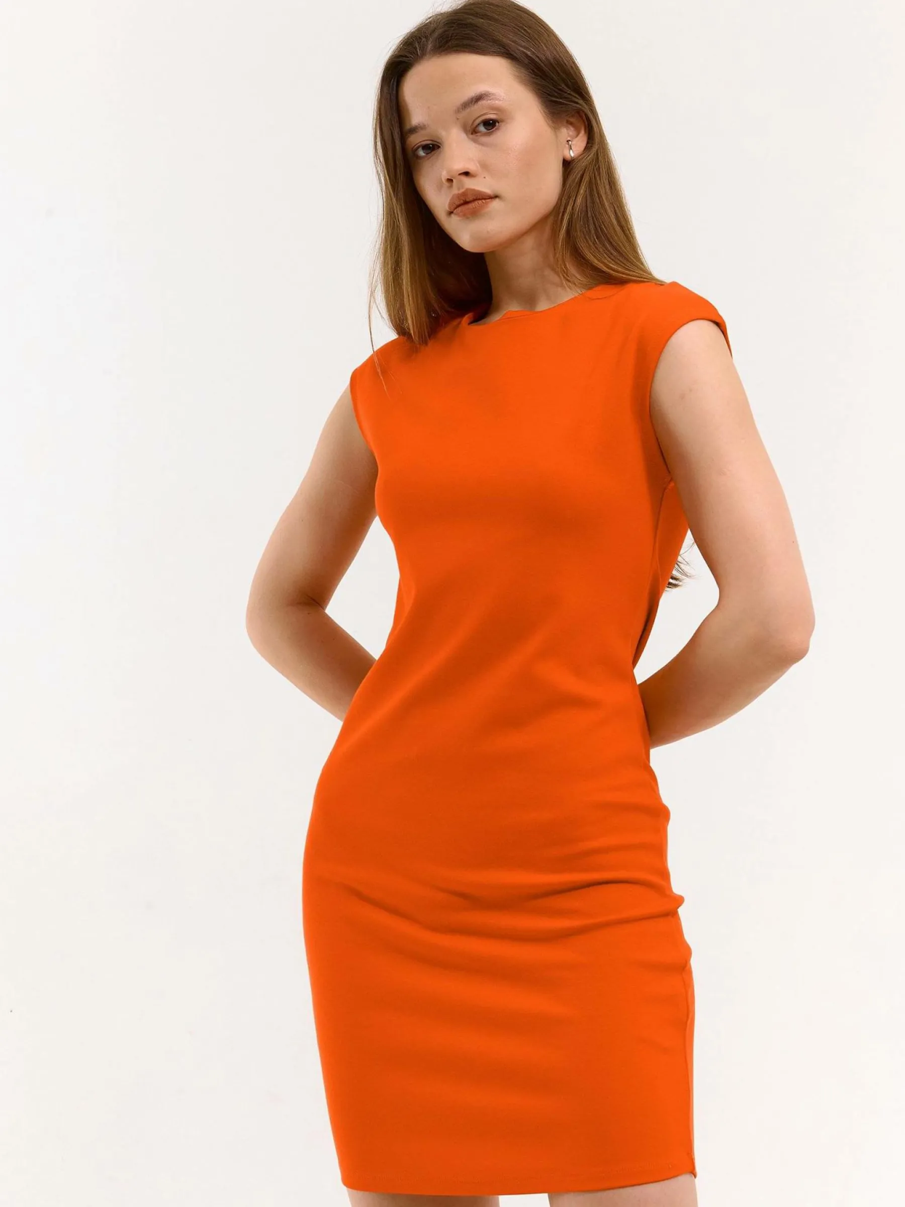 Kolor: czerwonyKrój: ołówkoweTyp: sukienkaRekaw: bez rękawówDługość: miniPattern style: pojedynczy kolorDetal: n…