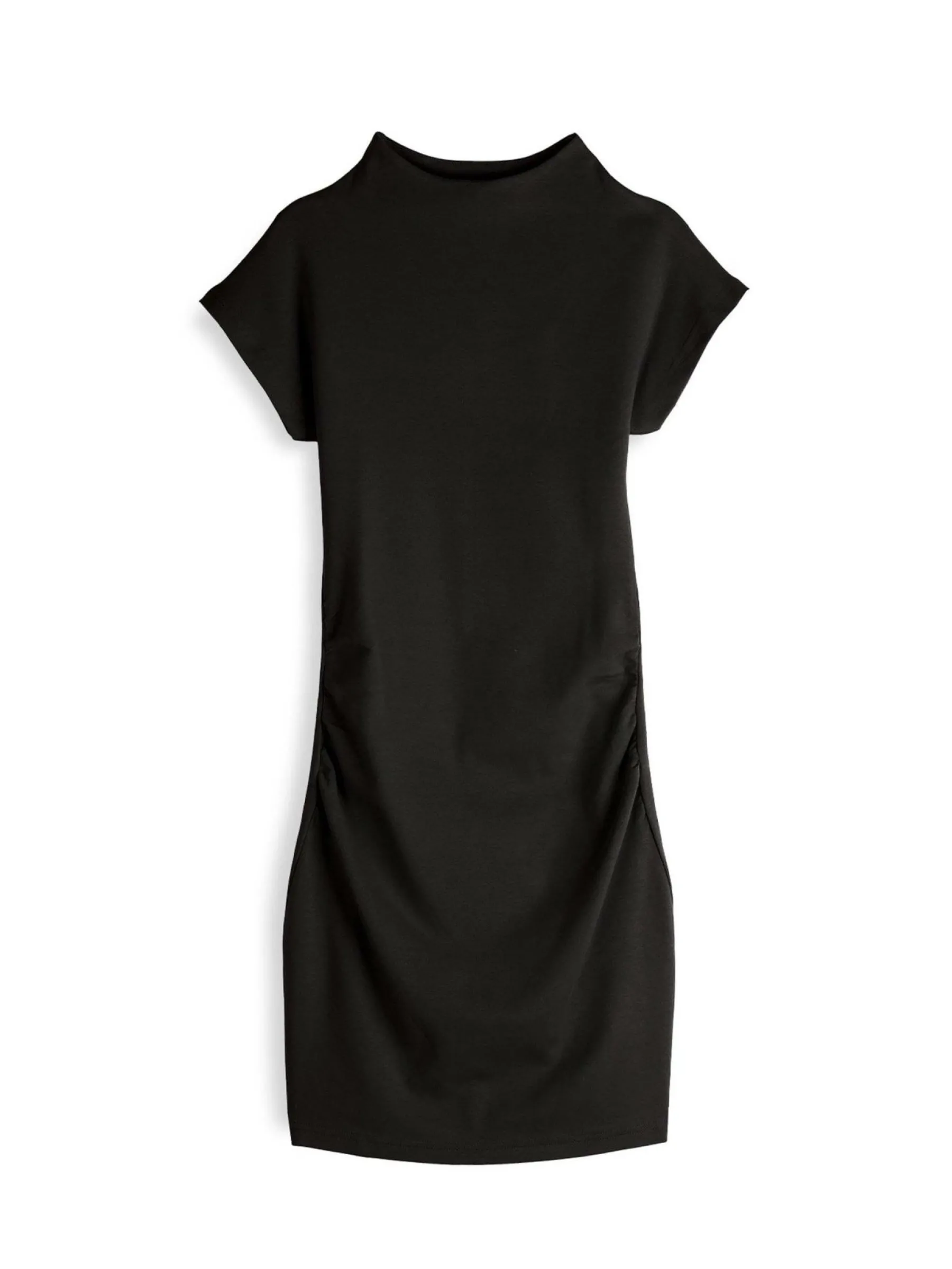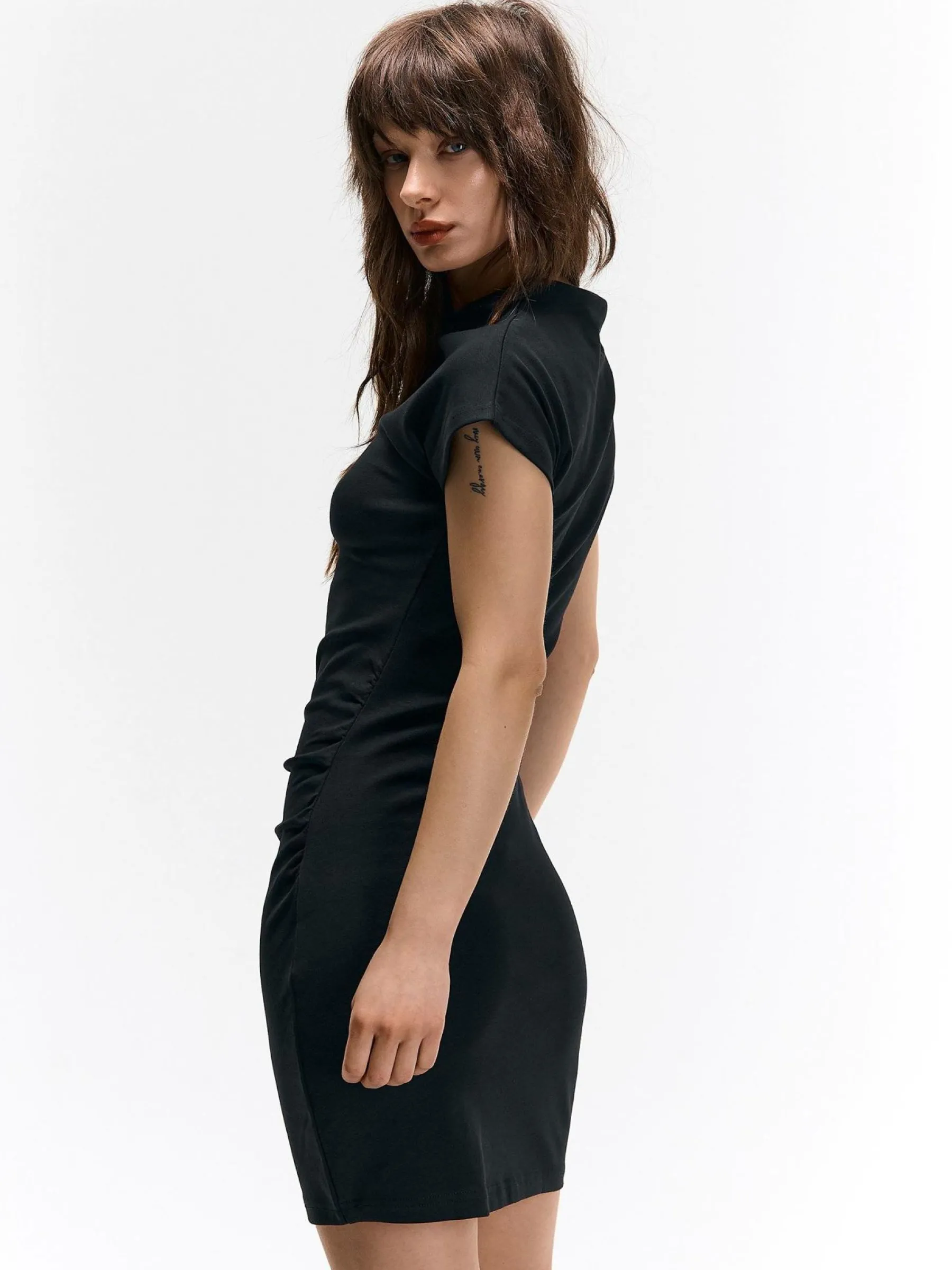 Kolor: czarnyKrój: z marszczeniemTyp: sukienkaRekaw: krótki rękawDługość: miniPattern style: pojedynczy kolorDetal…