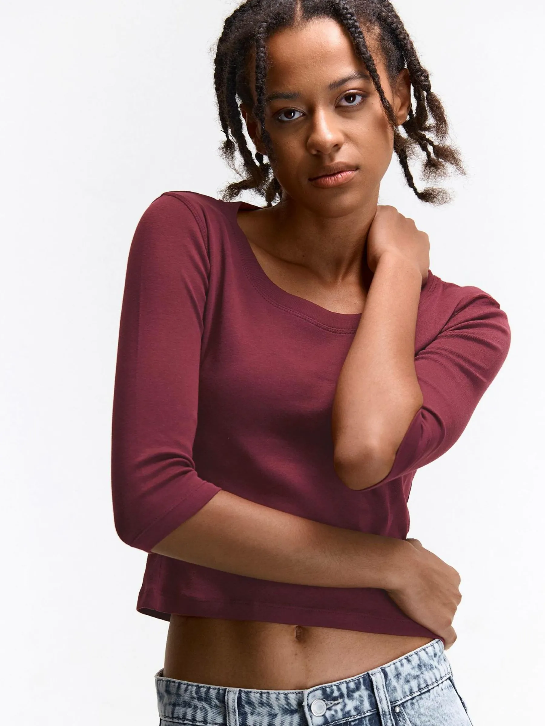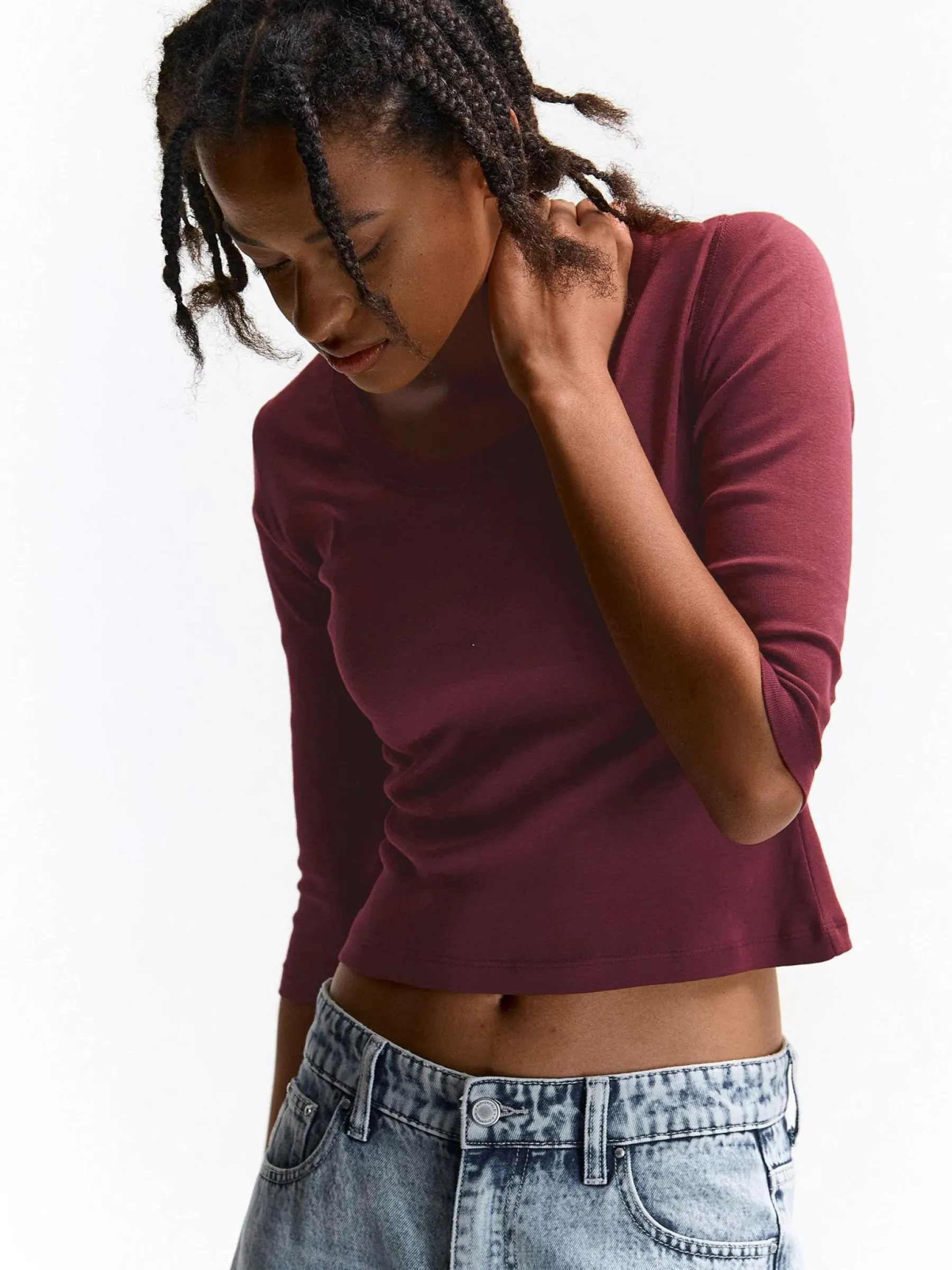 Kolor: burgundyKrój: podstawowyTyp: koszulkaRekaw: rękaw 3/4Długość: krótki topPattern style: pojedynczy kolorDeta…