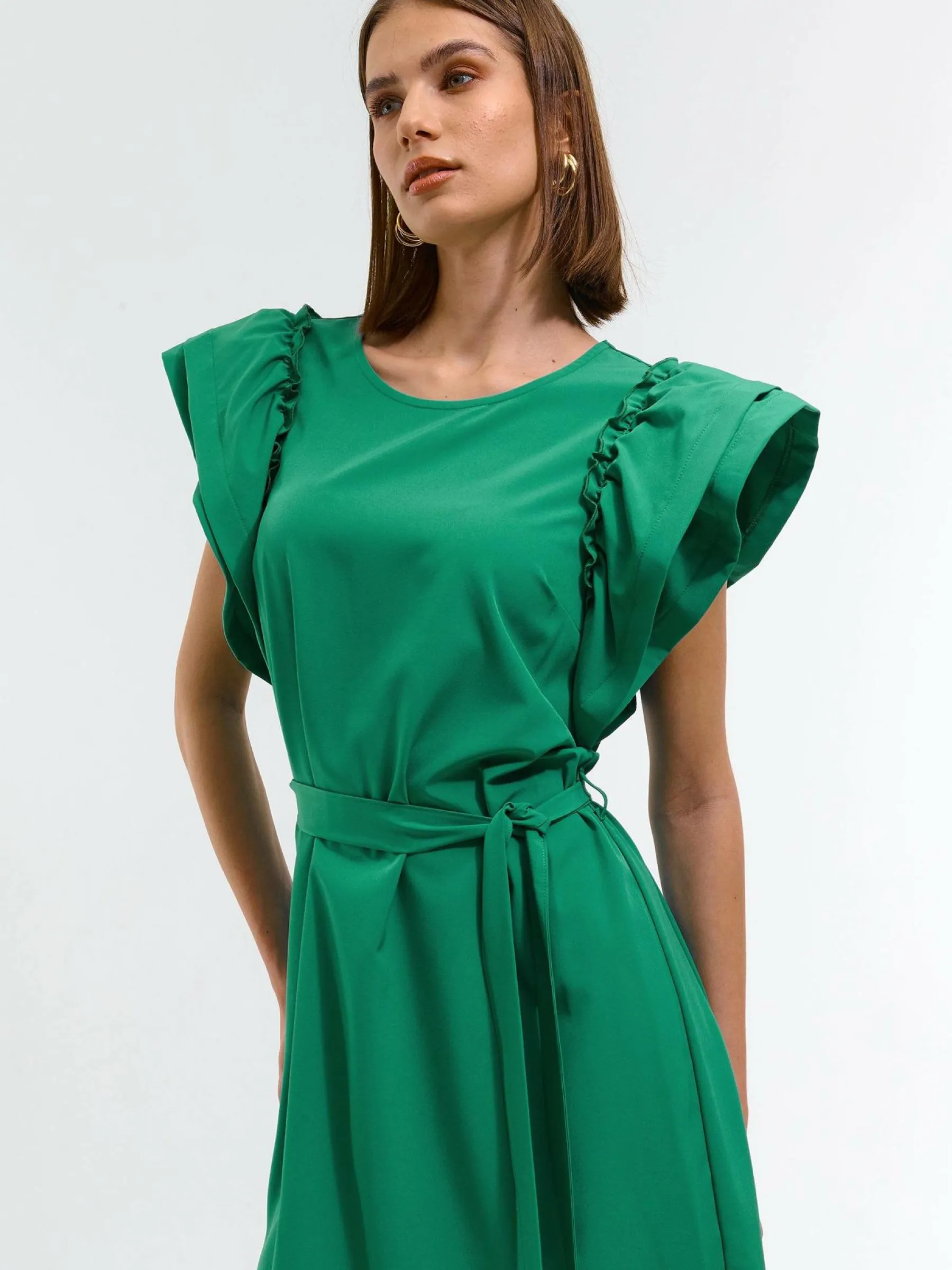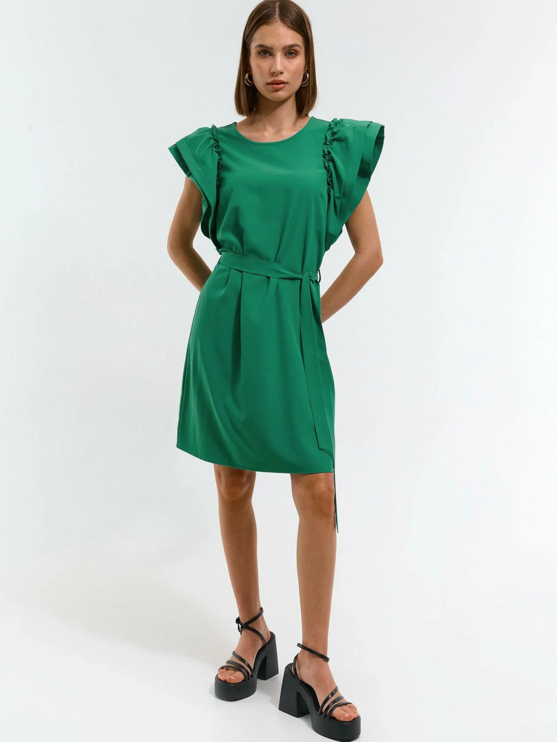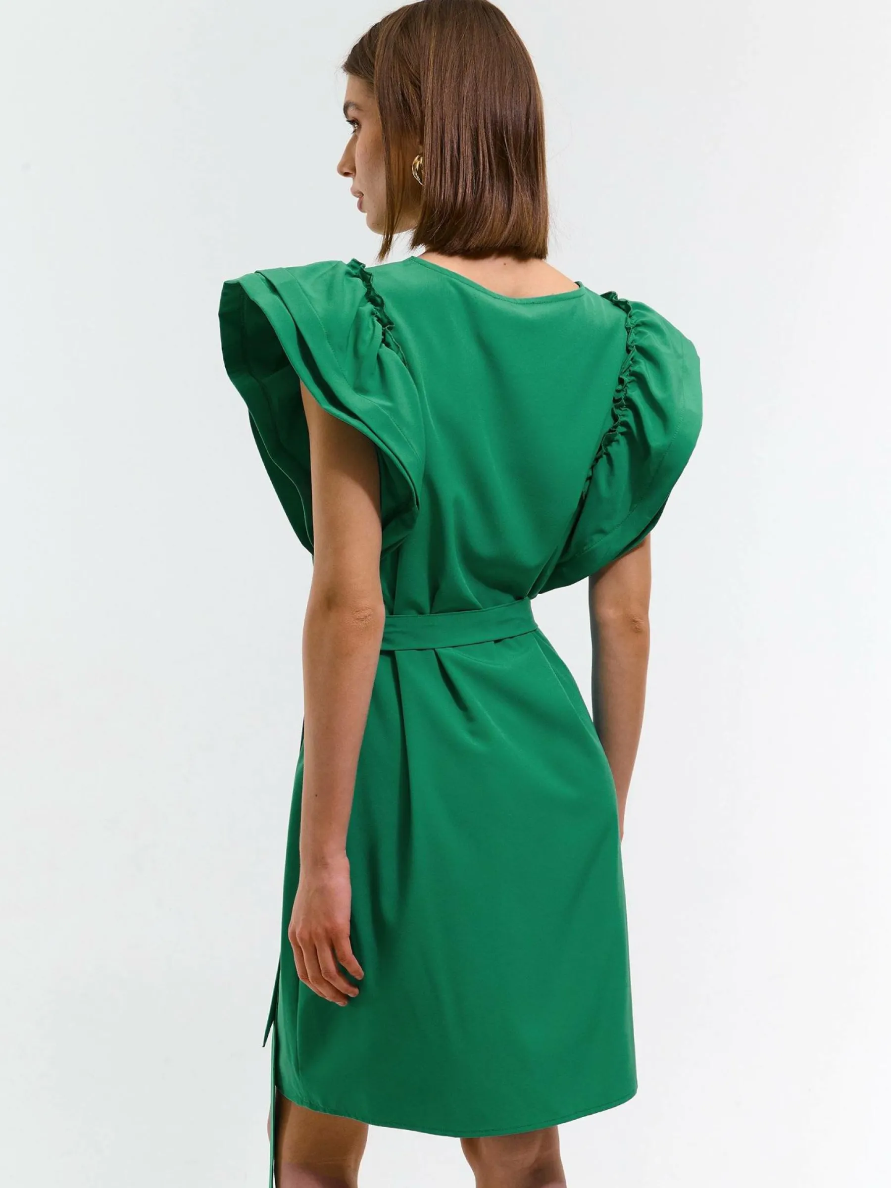 Kolor: zielonyKrój: z falbanąTyp: sukienkaRekaw: krótki rękawDługość: miniPattern style: pojedynczy kolorDetal: z…