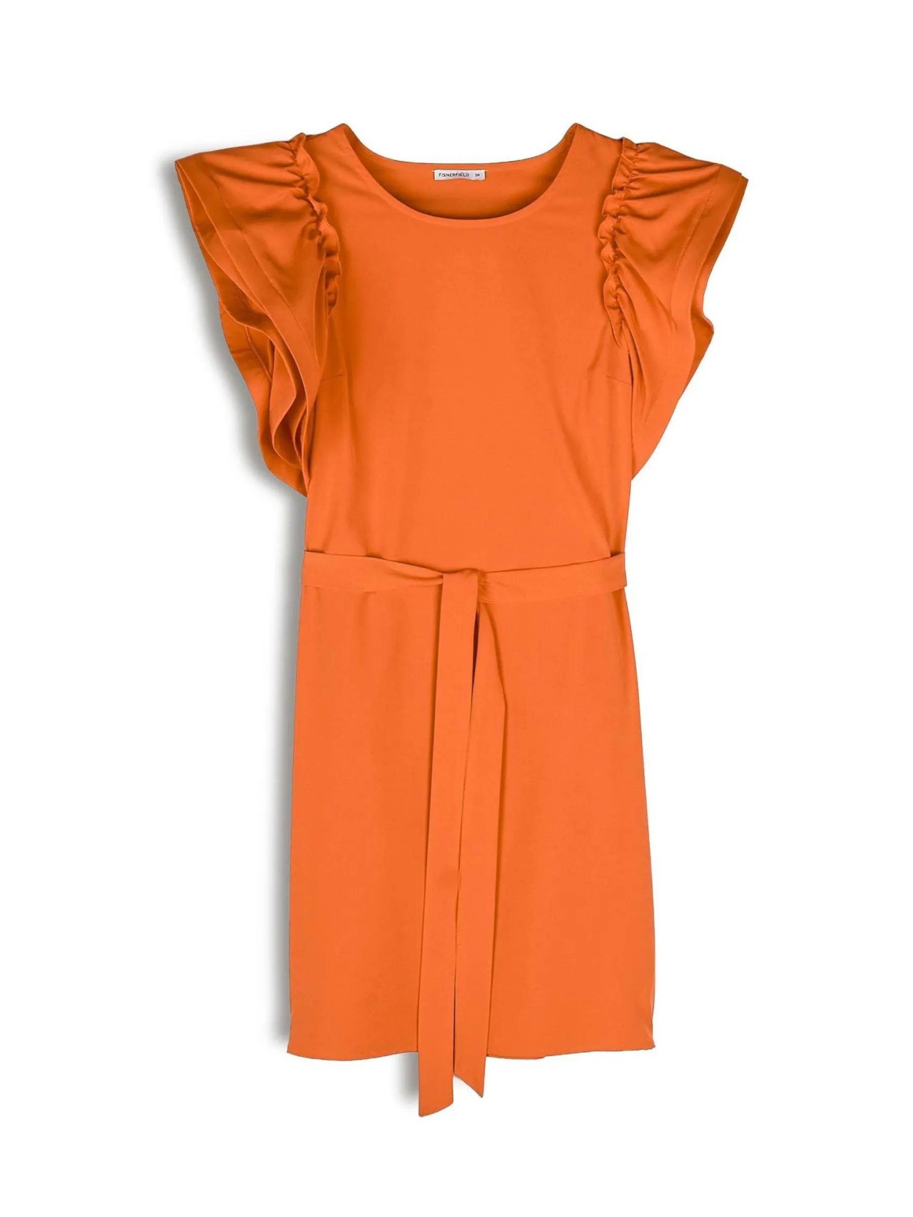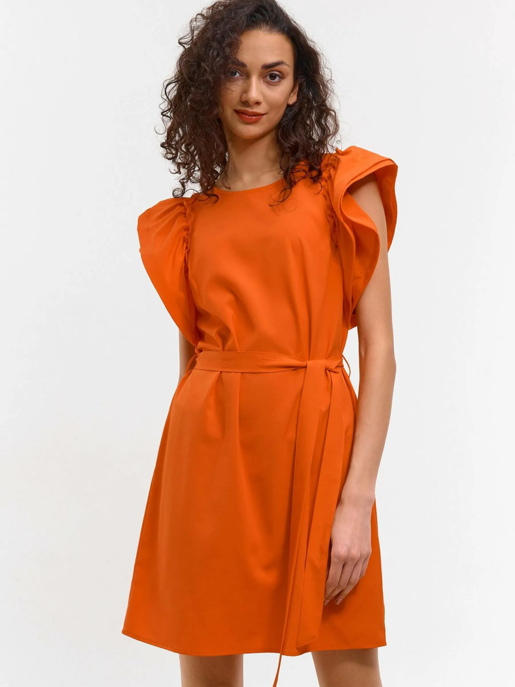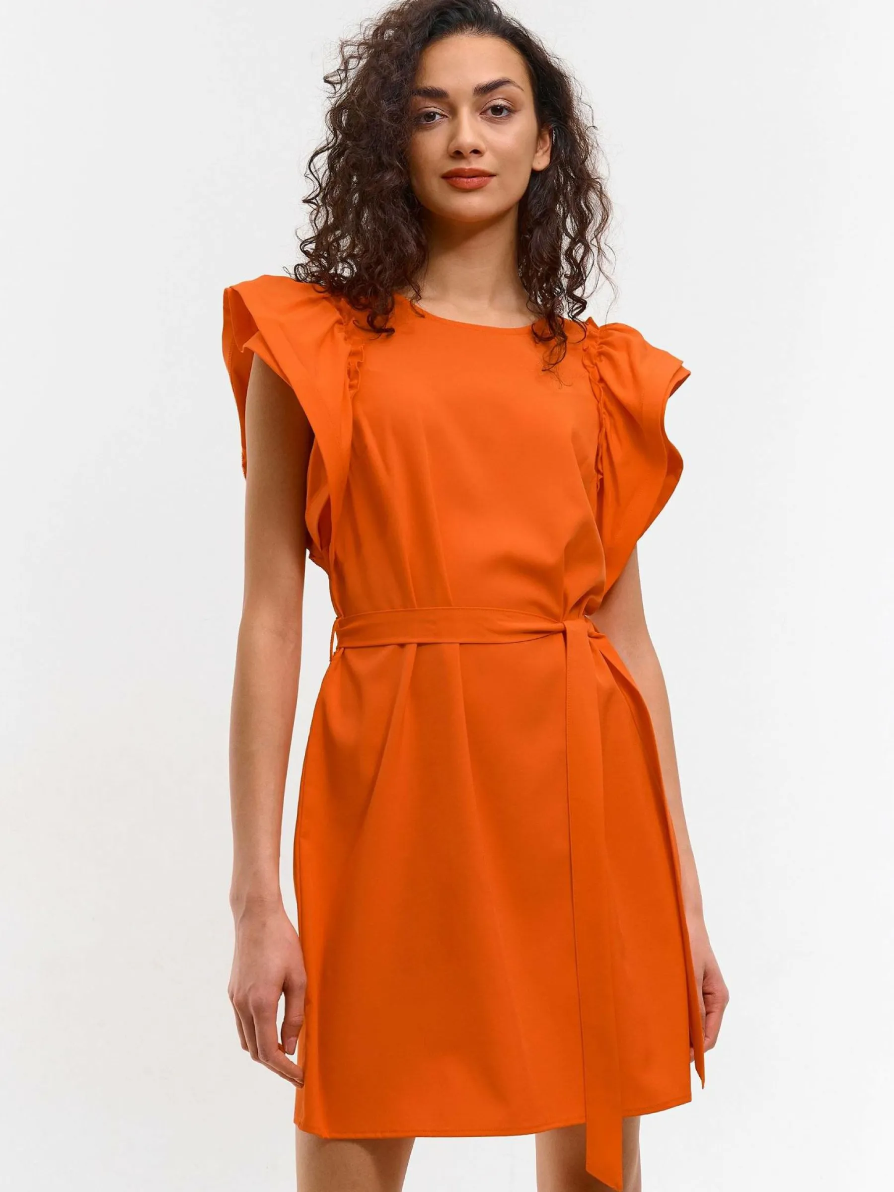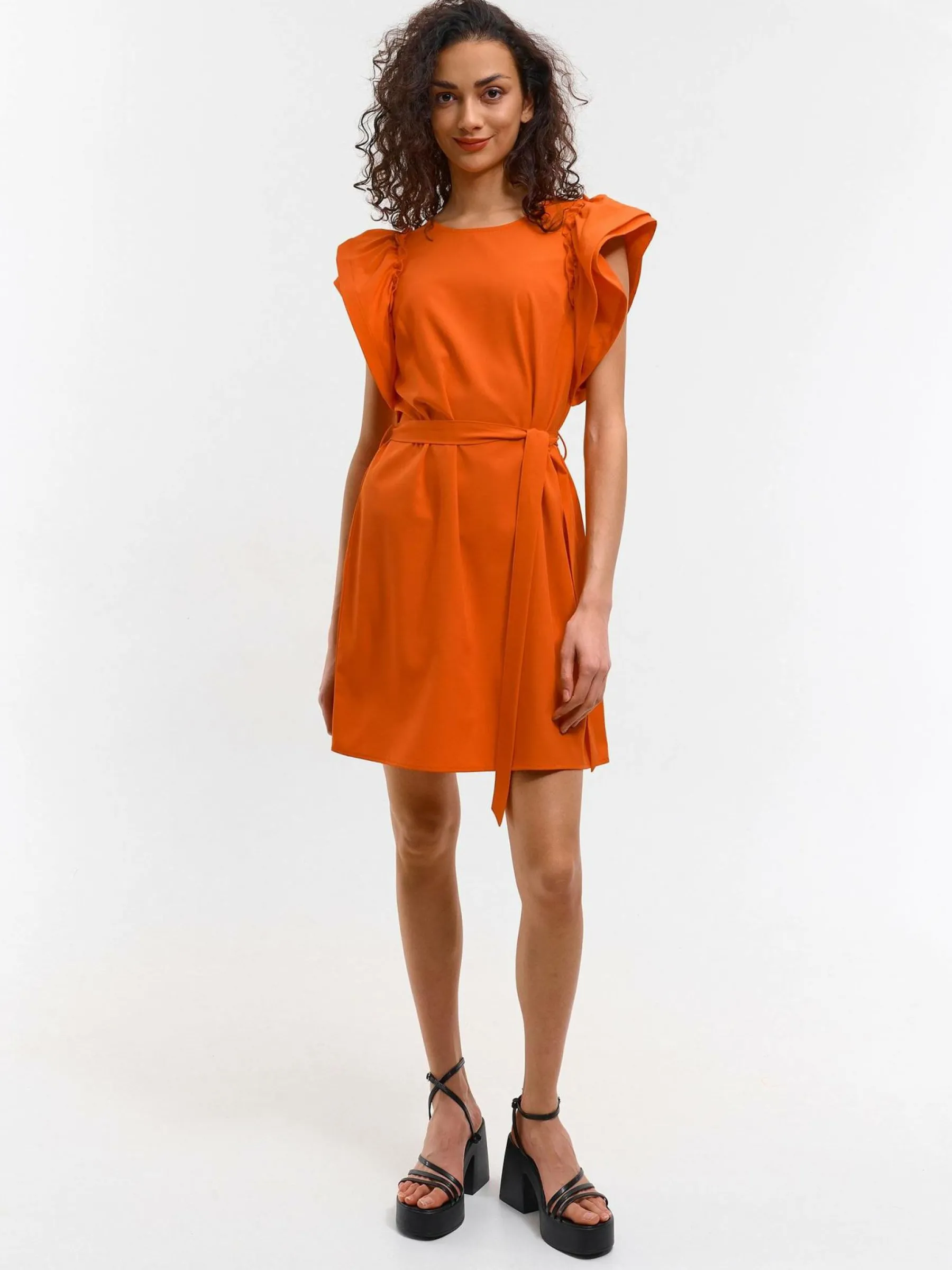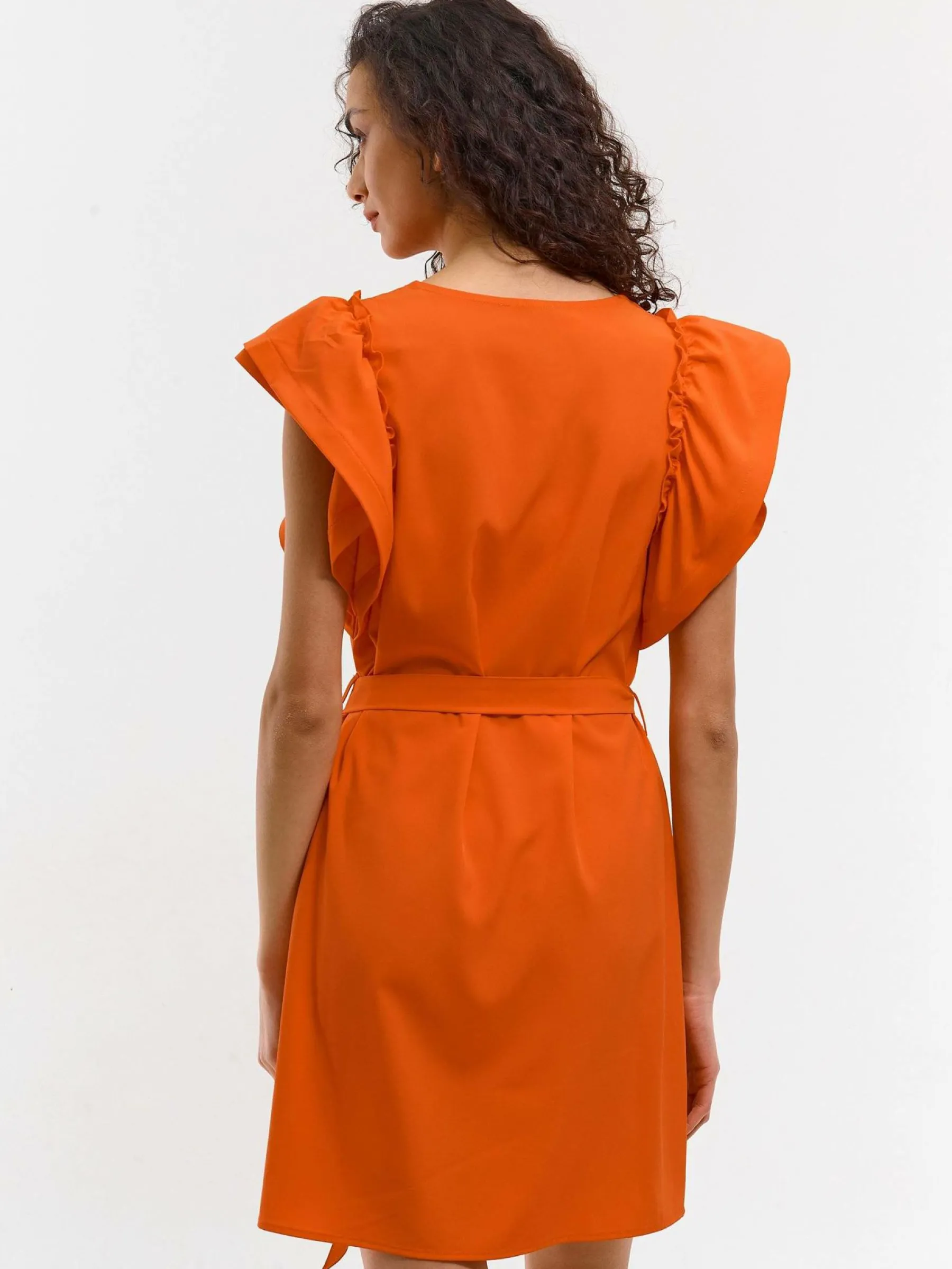 Kolor: pomarańczowyKrój: z falbanąTyp: sukienkaRekaw: krótki rękawDługość: miniPattern style: pojedynczy kolorDe…
