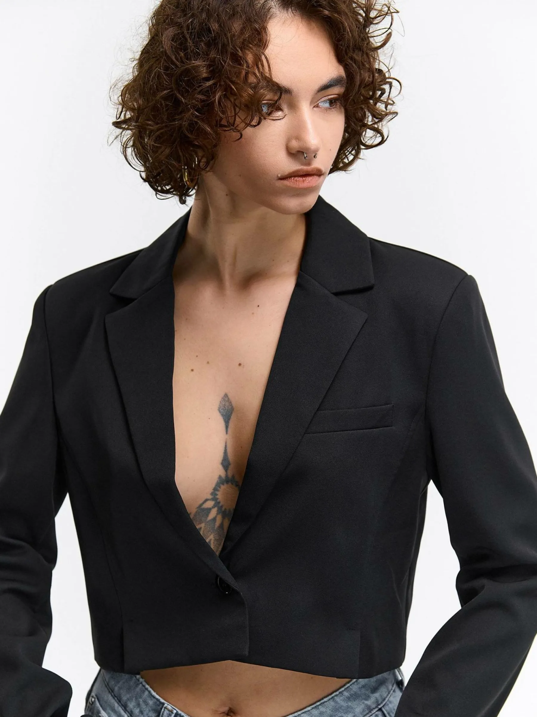 Kolor: czarnyKrój: podstawowyTyp: marynarkaRekaw: długi rękawDługość: krótki topPattern style: pojedynczy kolorDe…