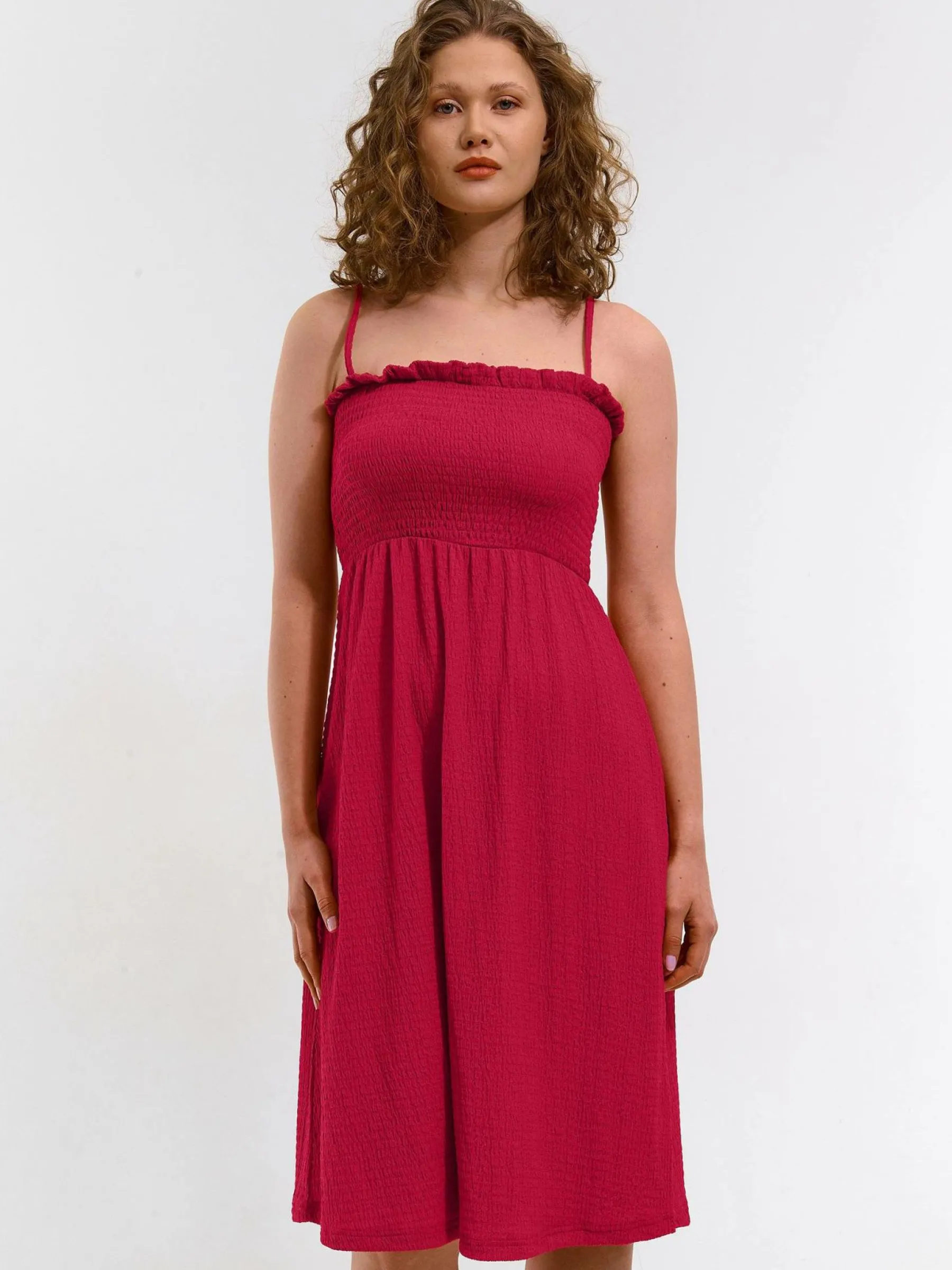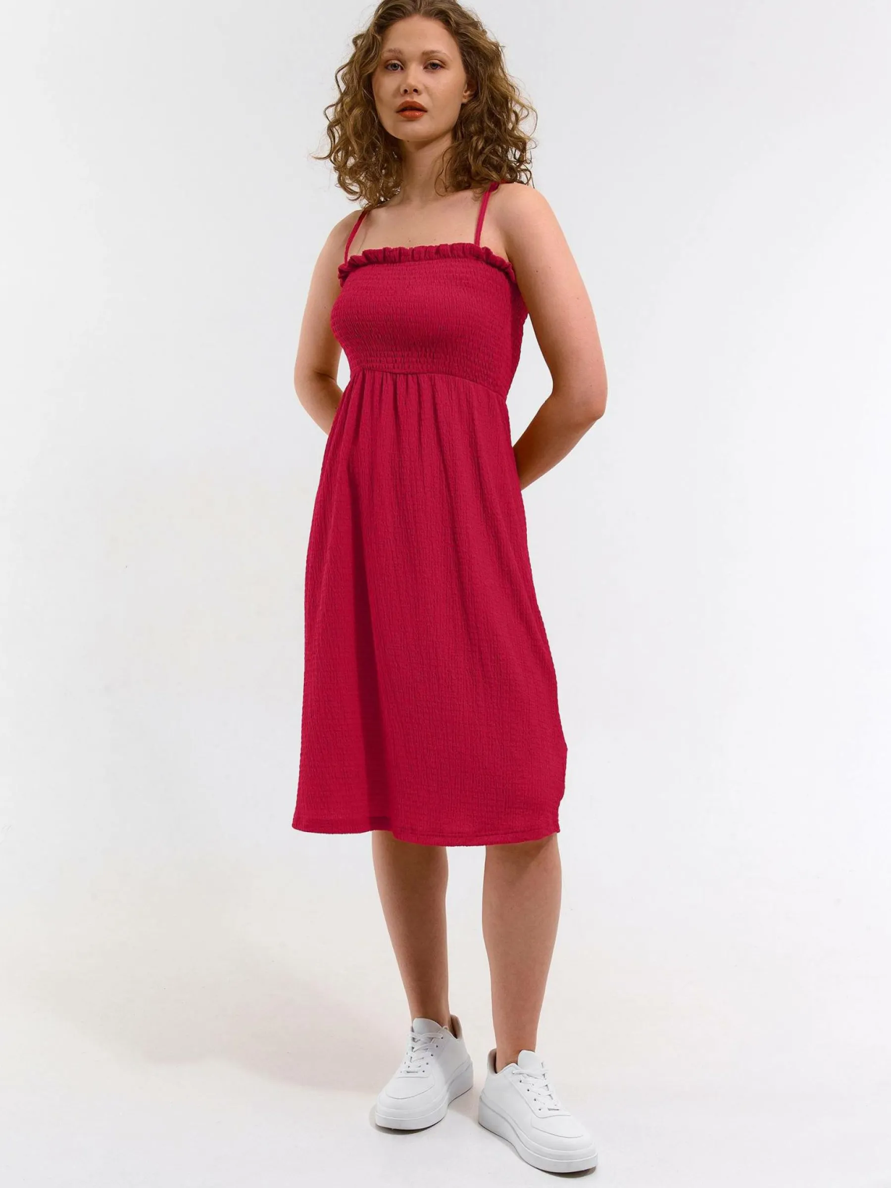 Kolor: różowyKrój: z marszczeniemTyp: sukienkaRekaw: bez rękawówDługość: midiPattern style: strukturowane, pojed…
