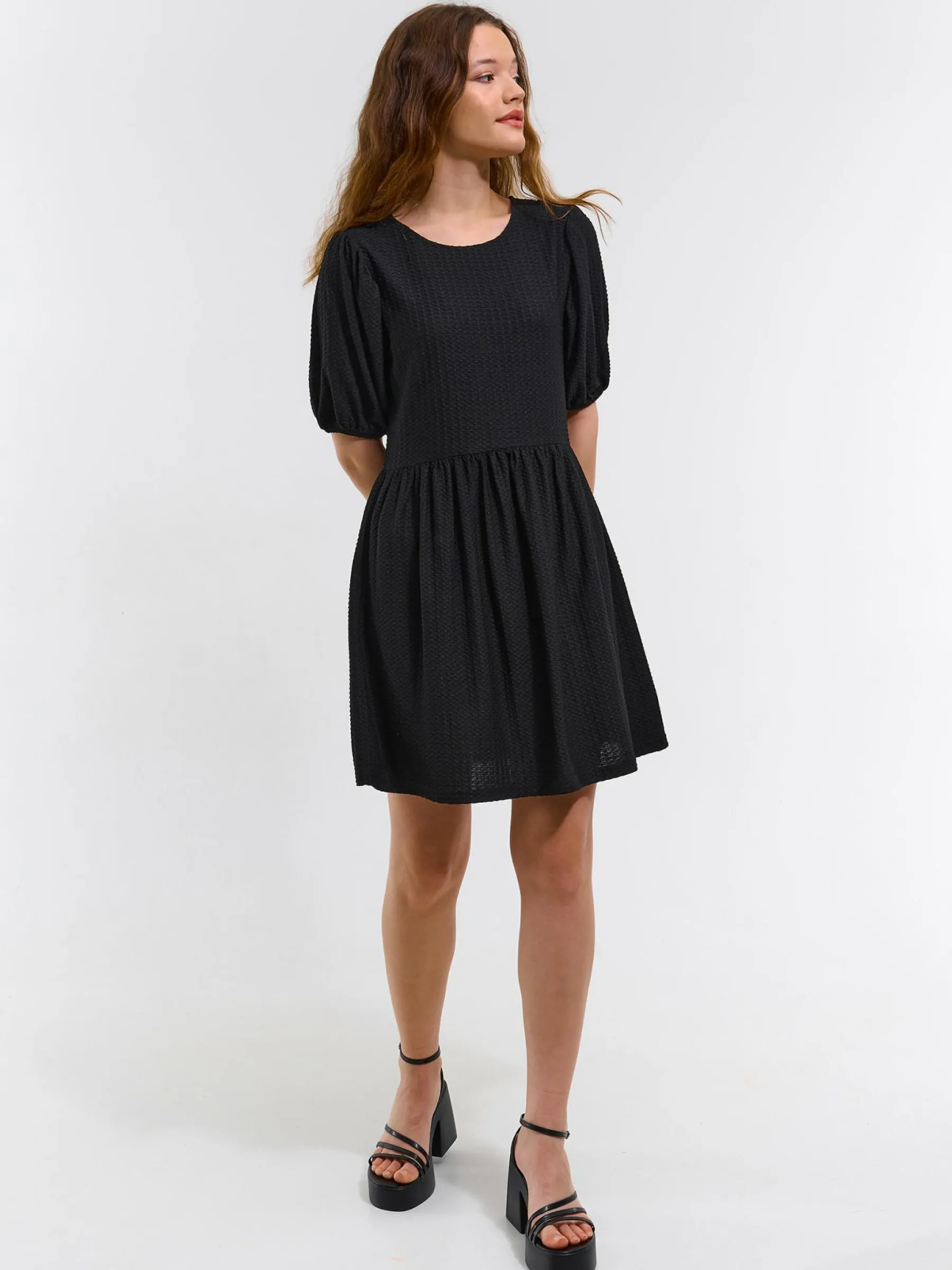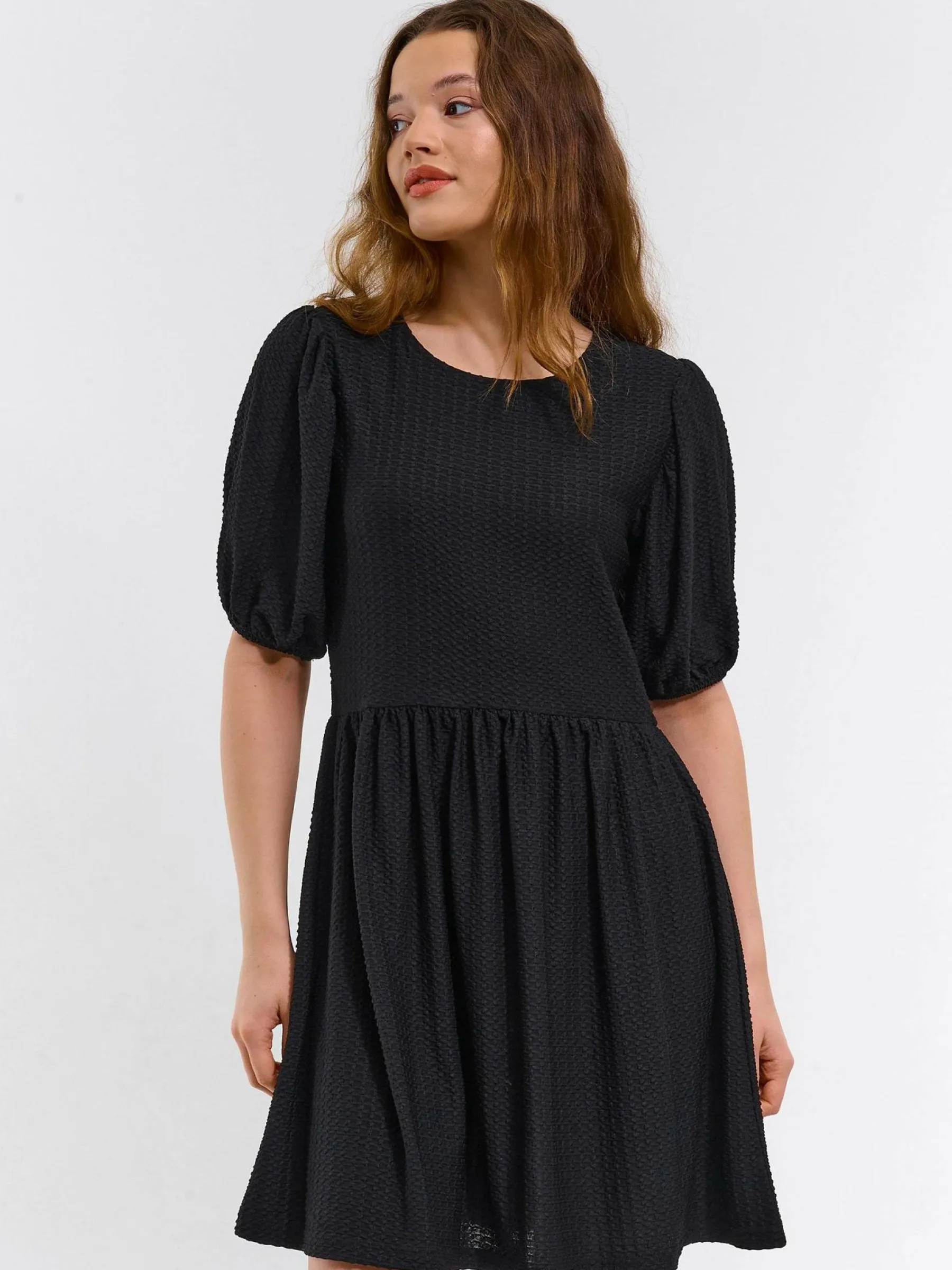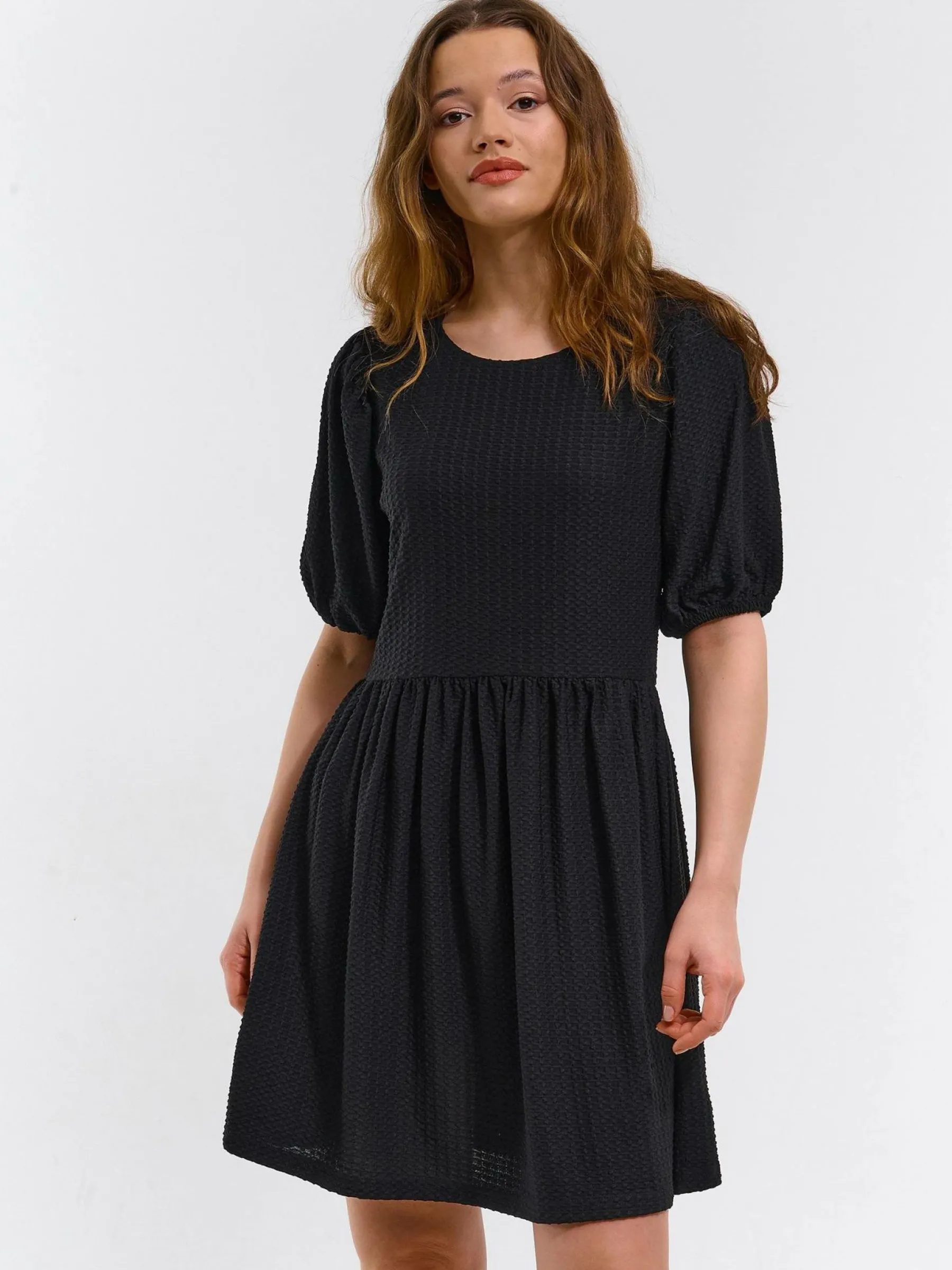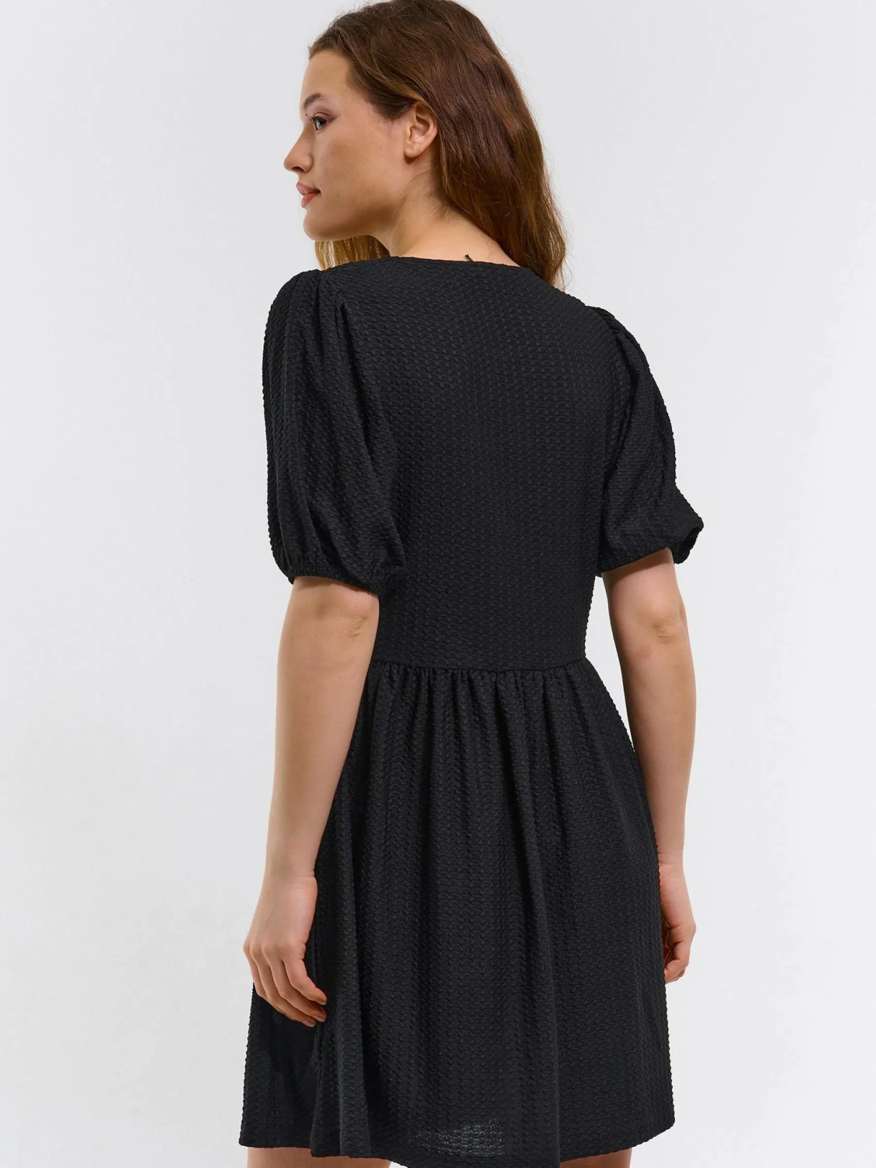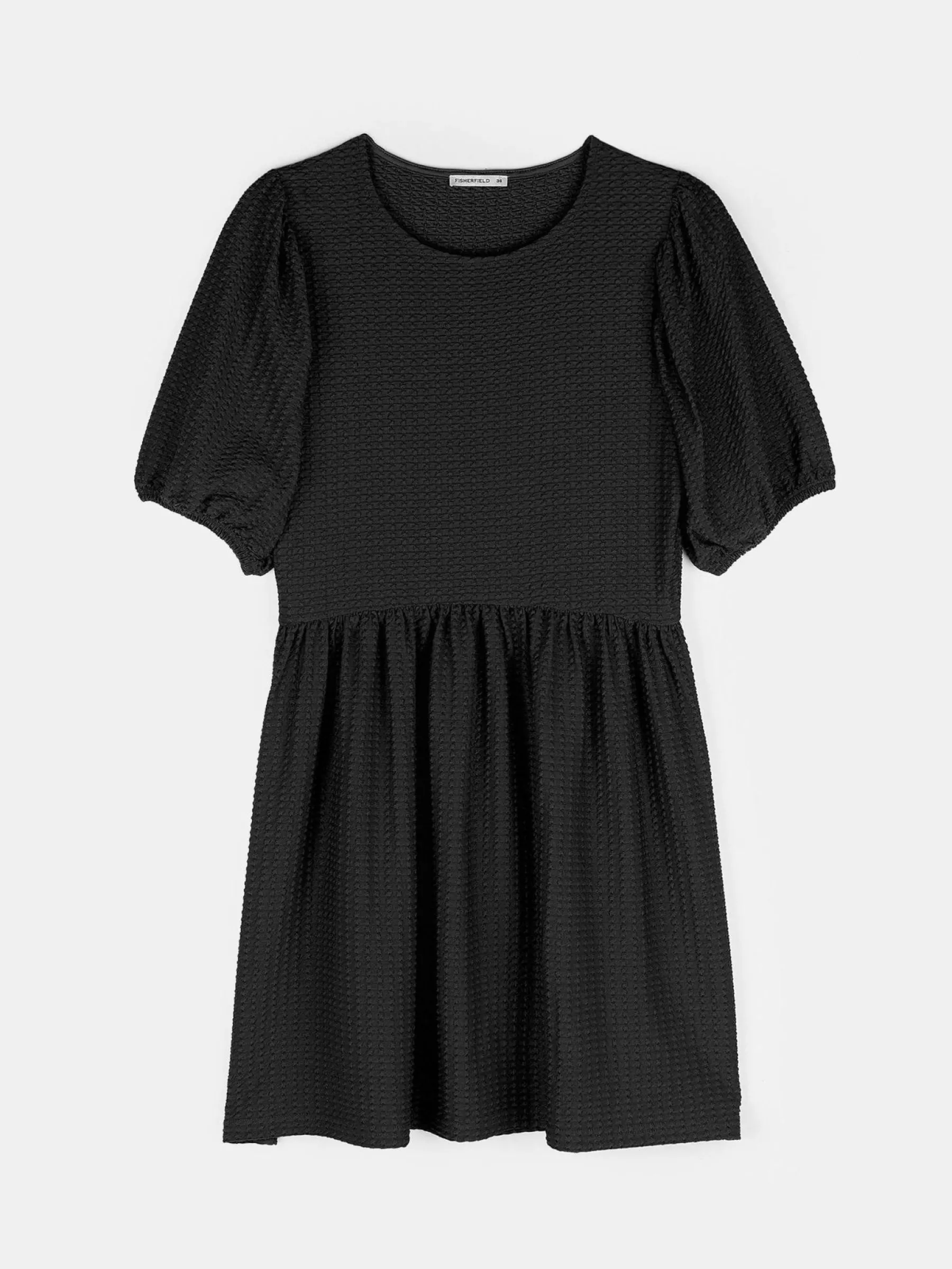 Kolor: czarnyKrój: asyTyp: sukienkaRekaw: krótki rękawDługość: miniPattern style: pojedynczy kolor, strukturowaneD…