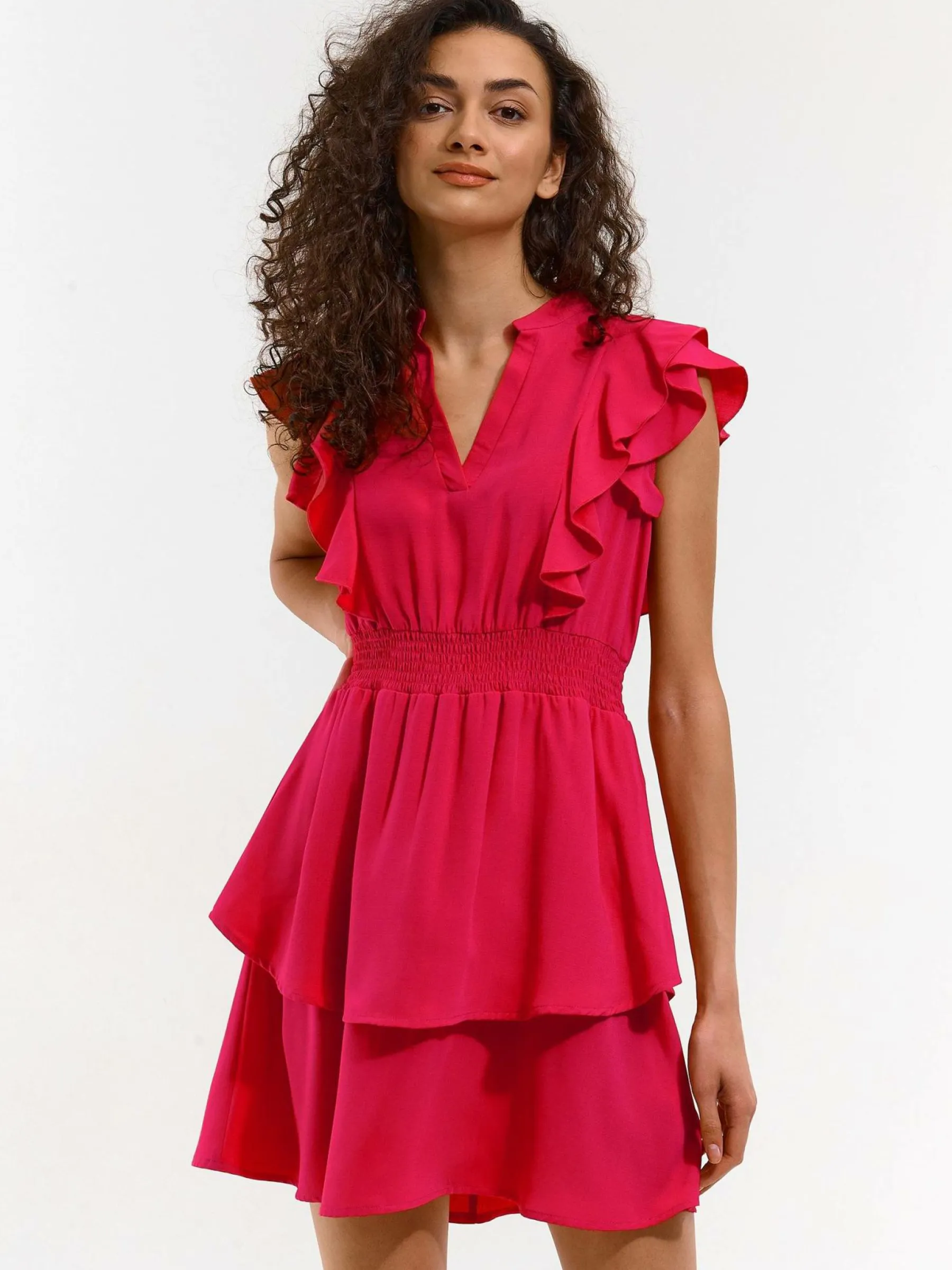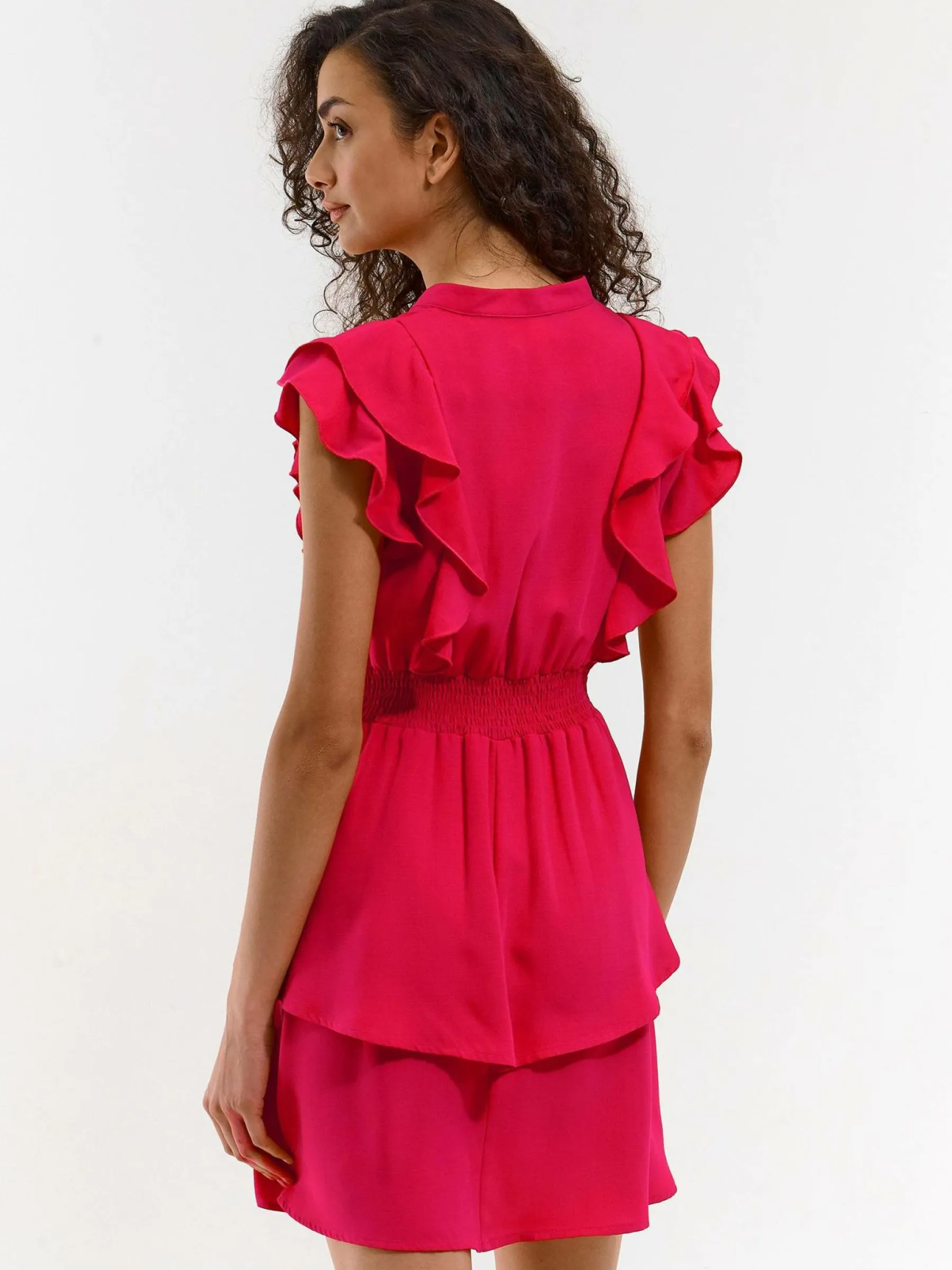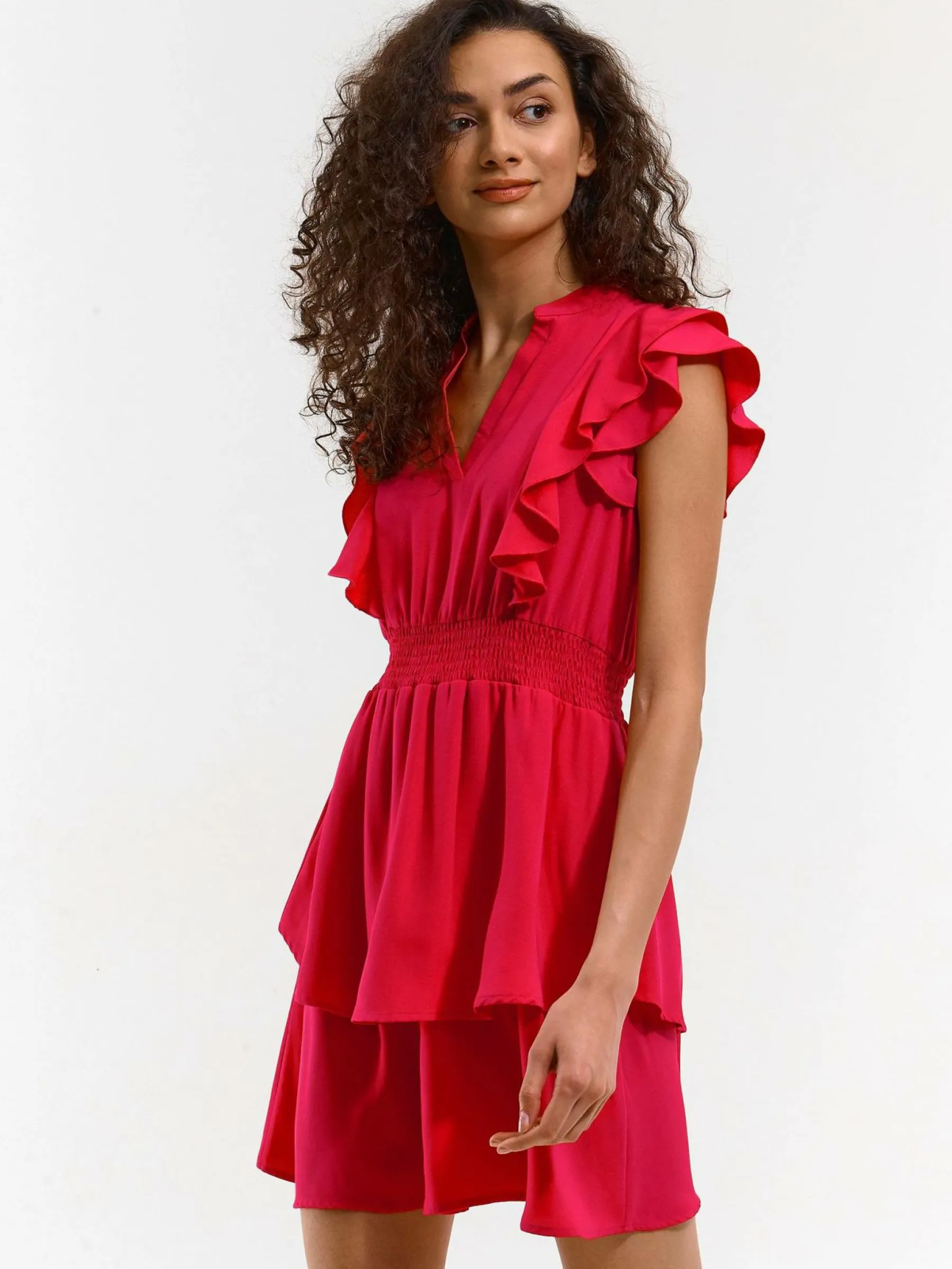 Kolor: czerwonyKrój: z falbanąTyp: sukienkaRekaw: bez rękawówDługość: miniPattern style: pojedynczy kolorDetal: n…