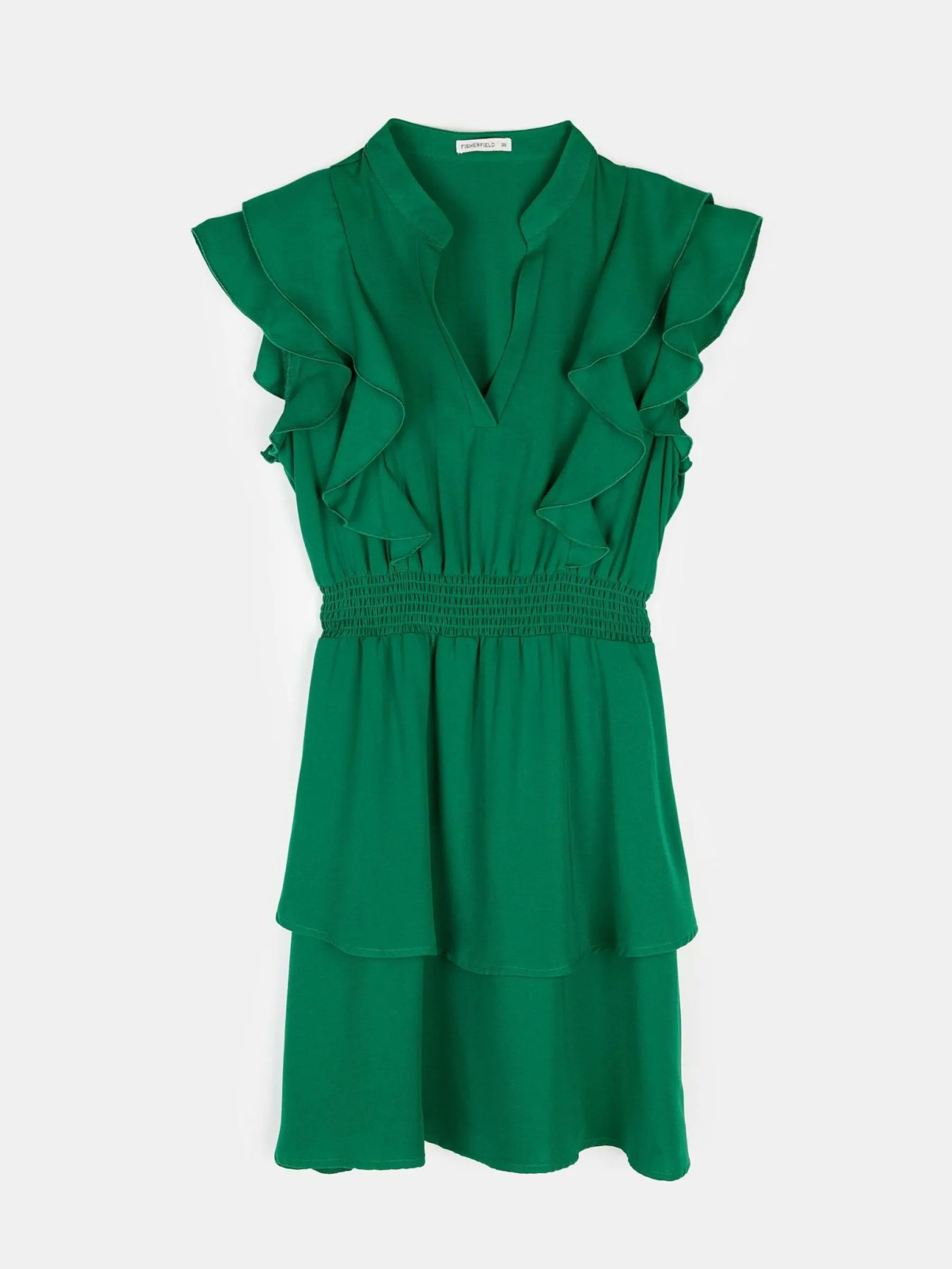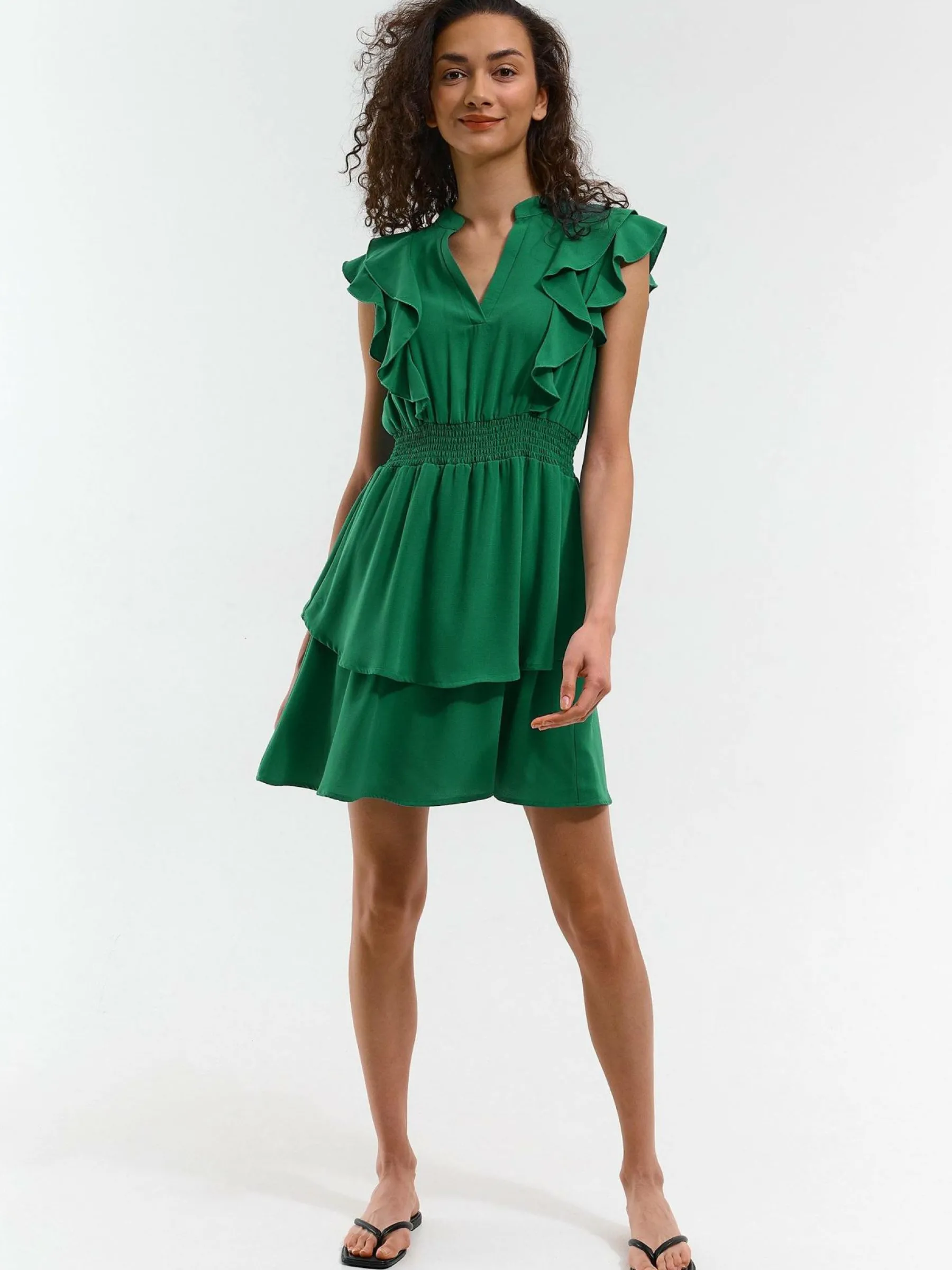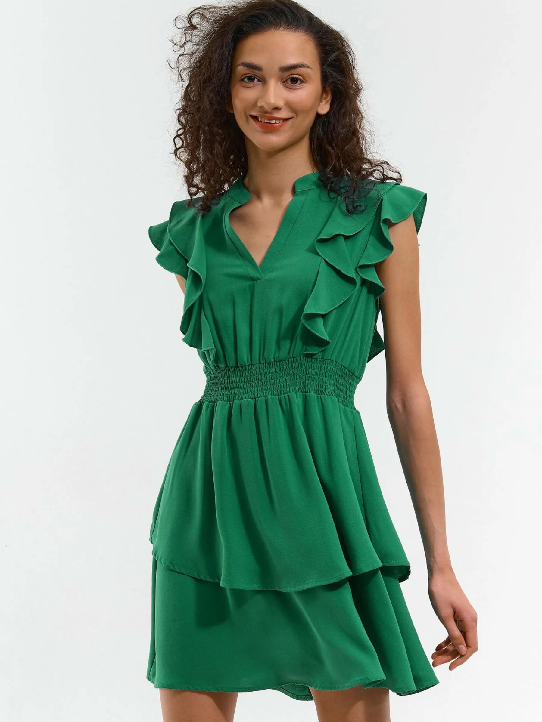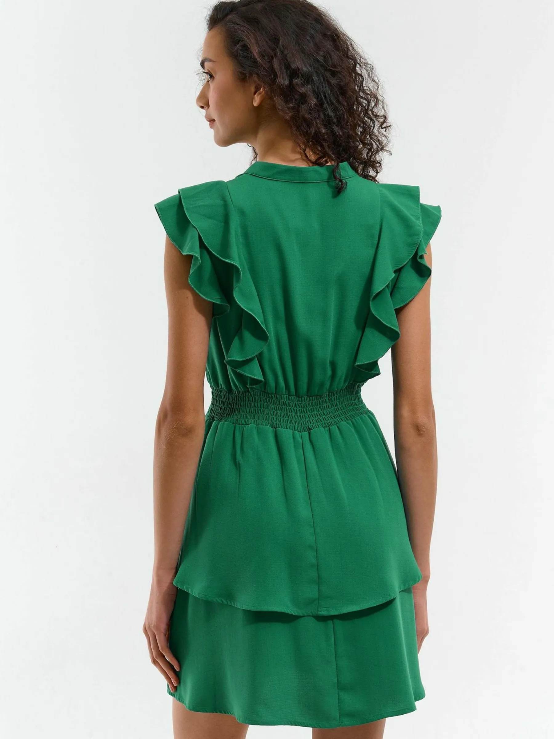 Kolor: zielonyKrój: z falbanąTyp: sukienkaRekaw: bez rękawówDługość: miniPattern style: pojedynczy kolorDetal: na…