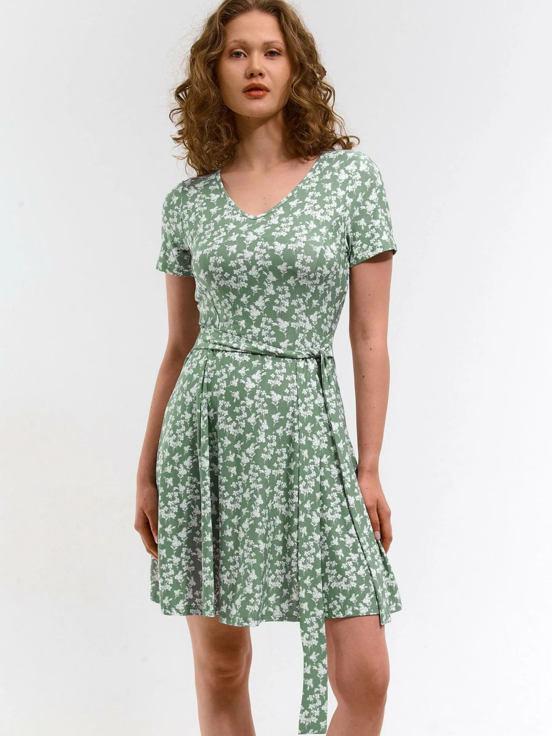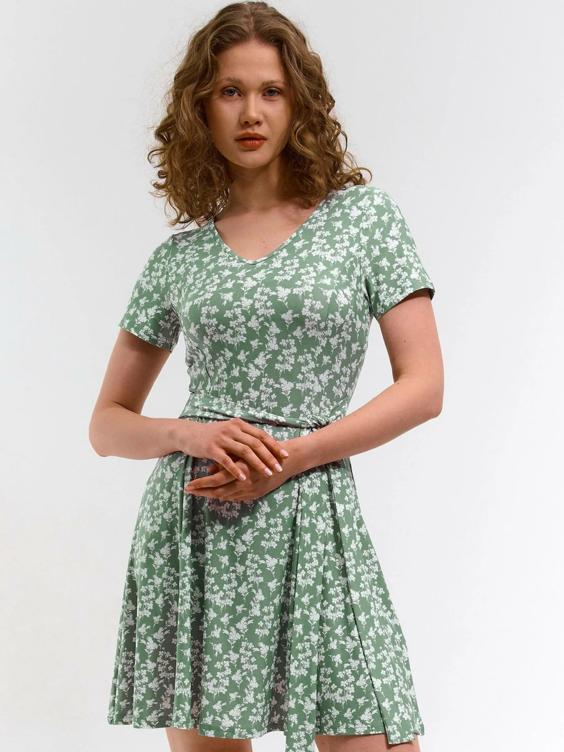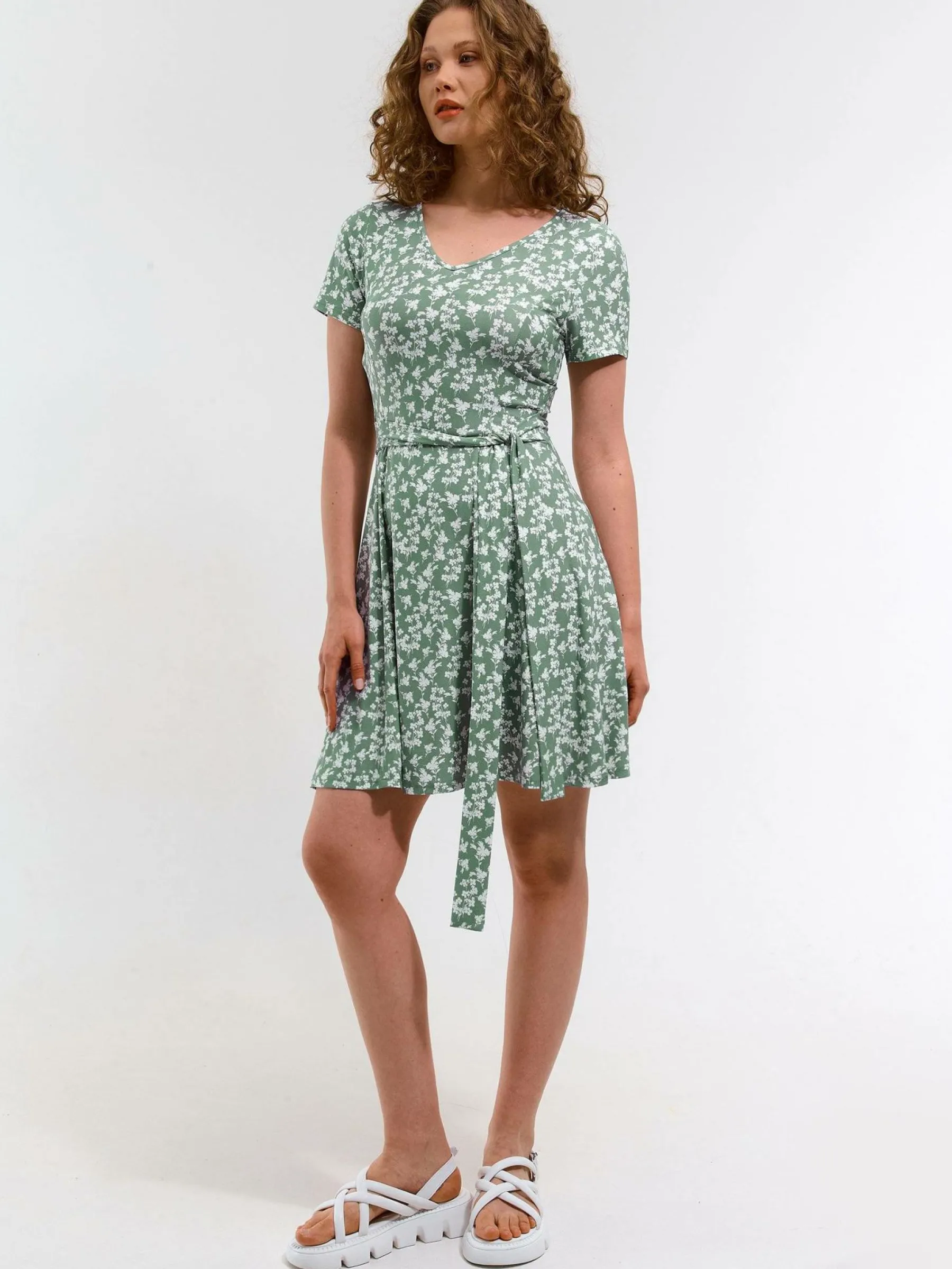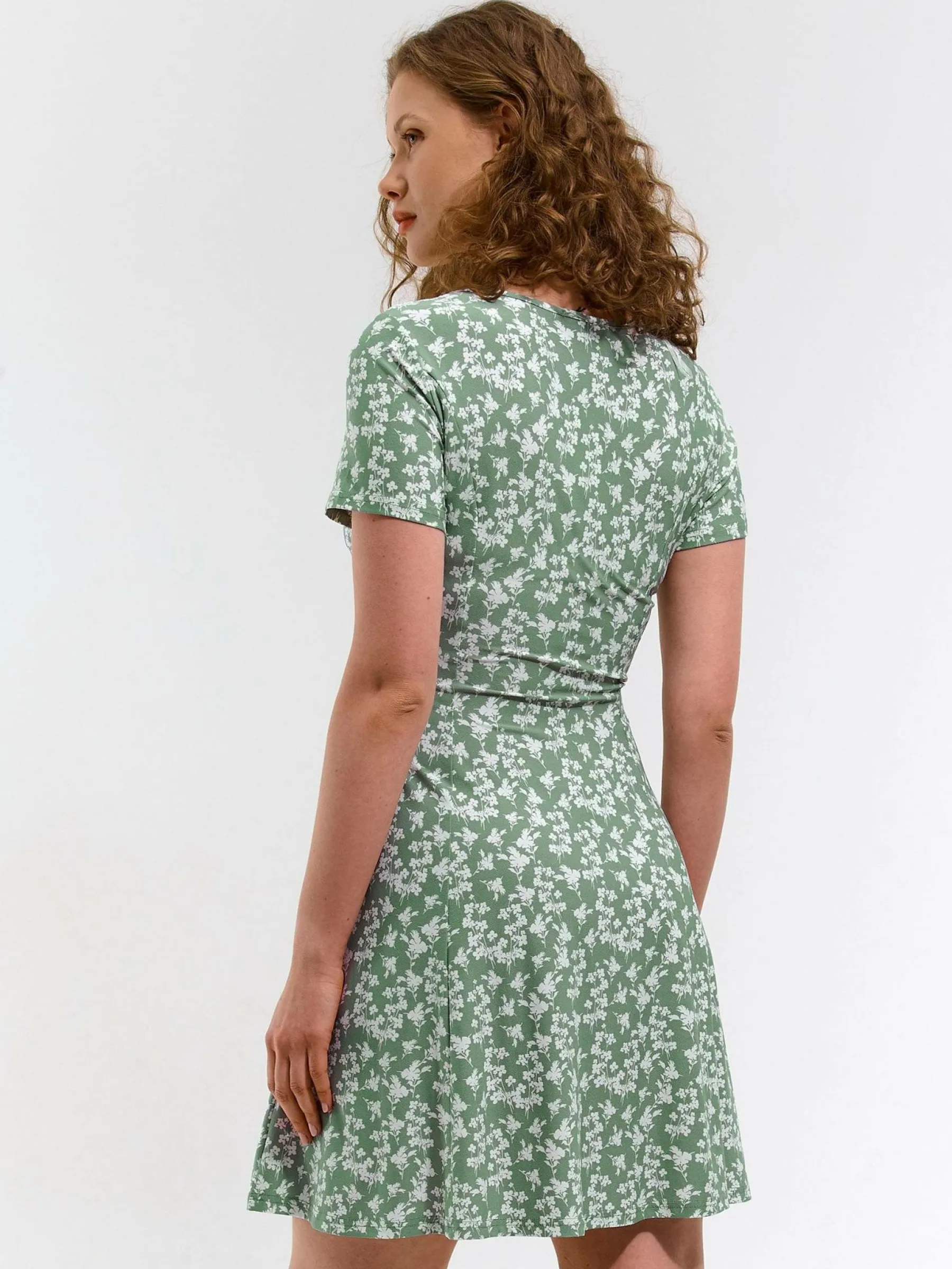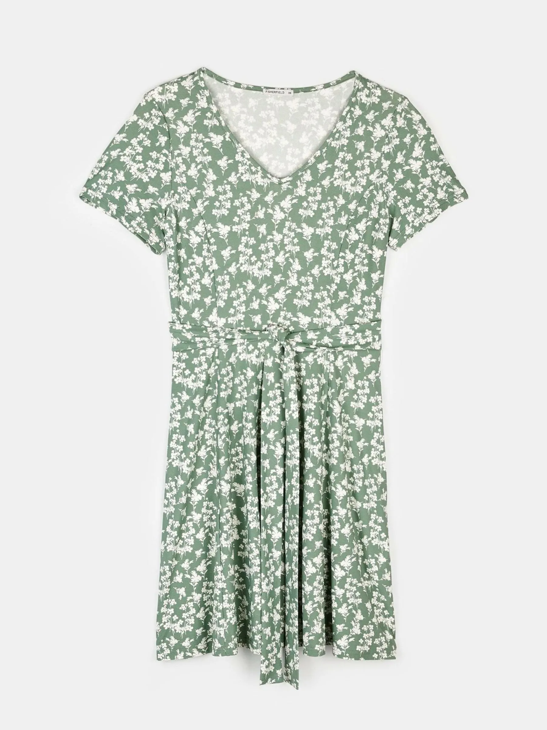Kolor: zielonyKrój: regularTyp: sukienkaRekaw: krótki rękawDługość: miniPattern style: kwiatoweDetal: v-neck, z pa…