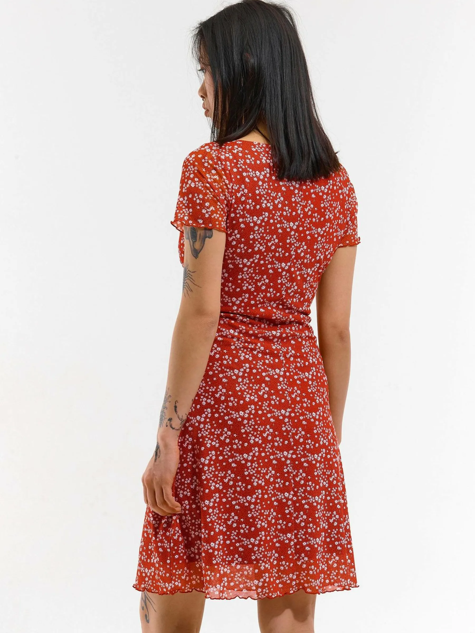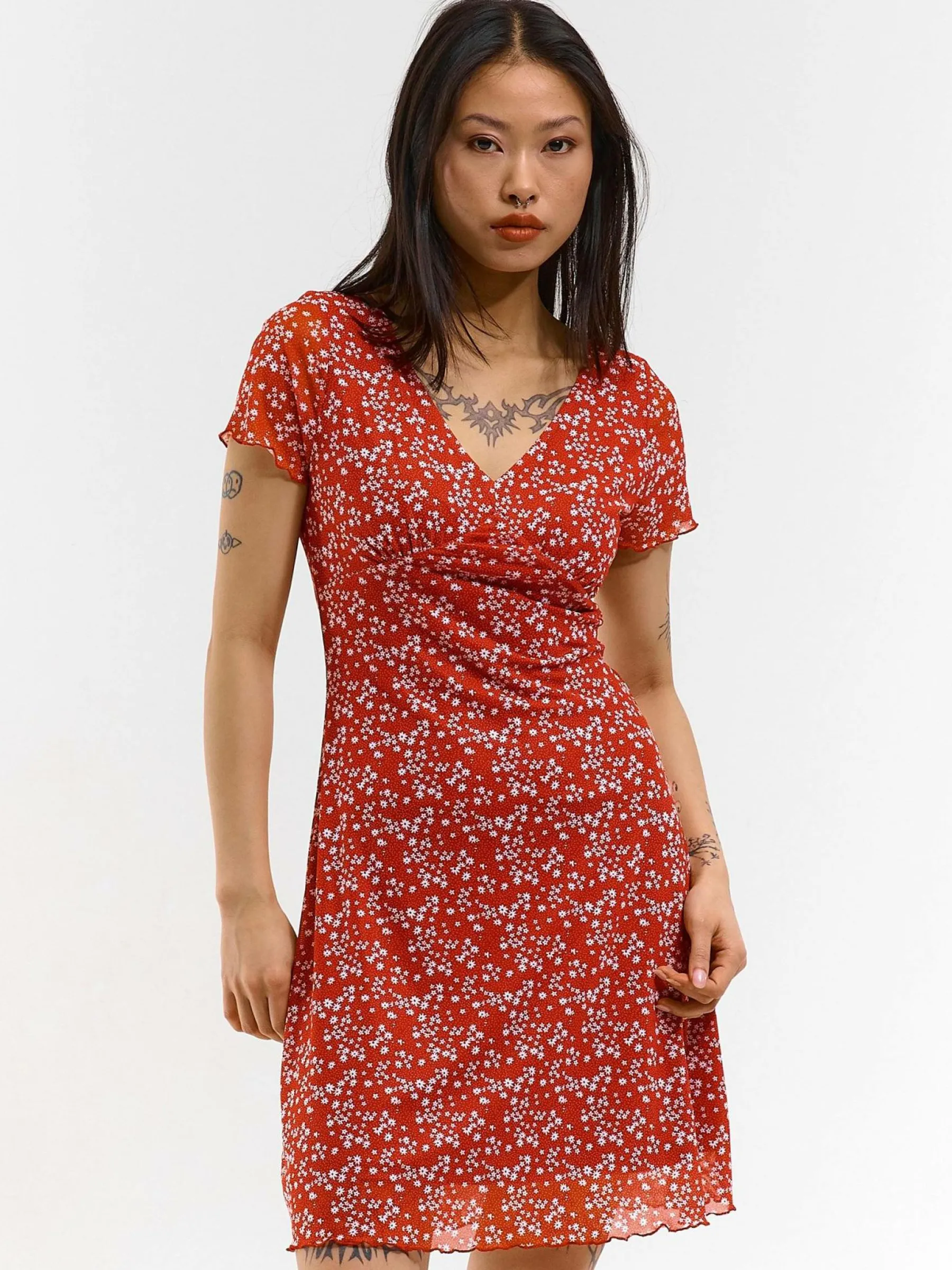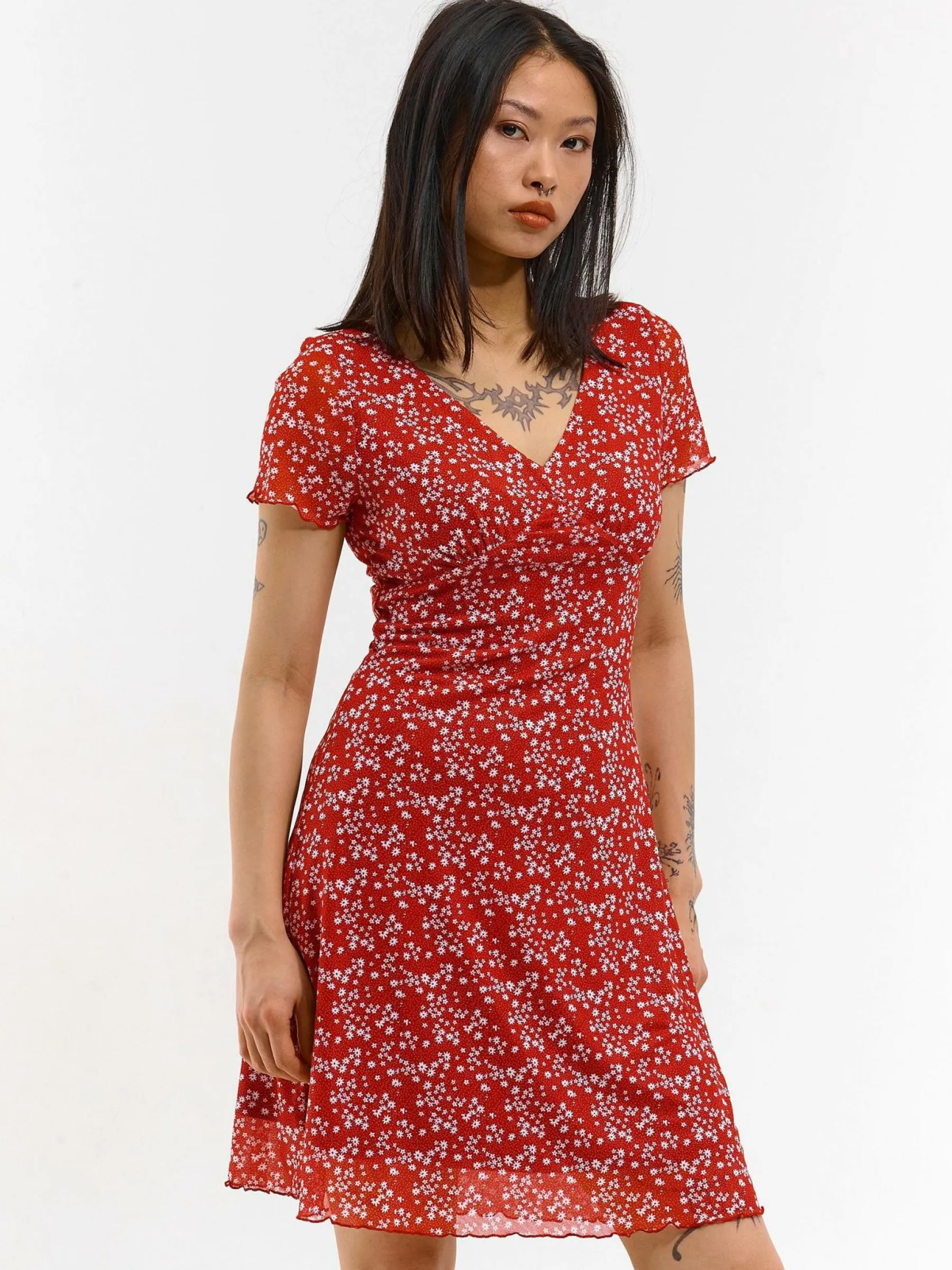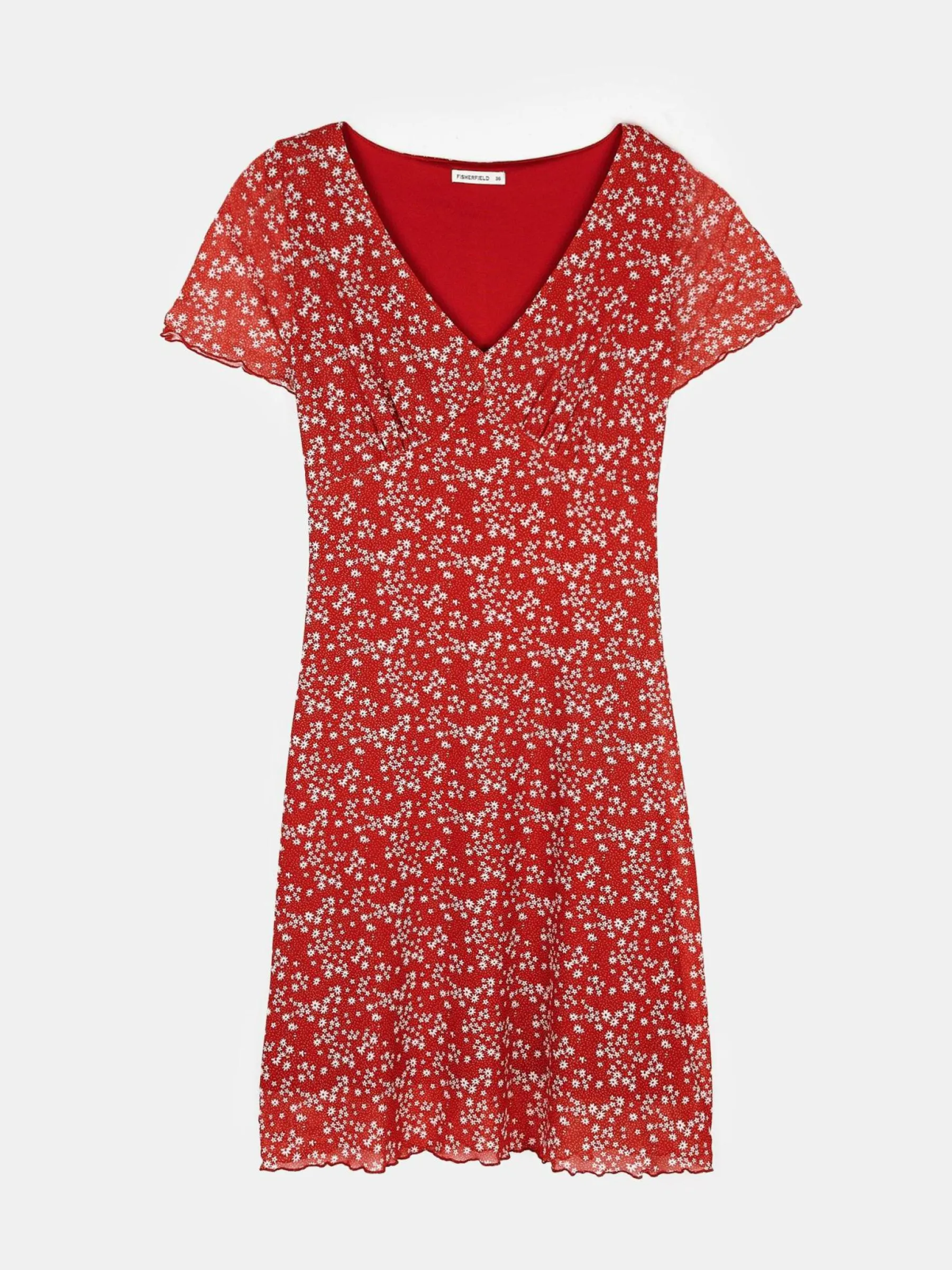 Kolor: czerwonyKrój: regularTyp: sukienkaRekaw: krótki rękawDługość: miniPattern style: kwiatoweDetal: nad głową…