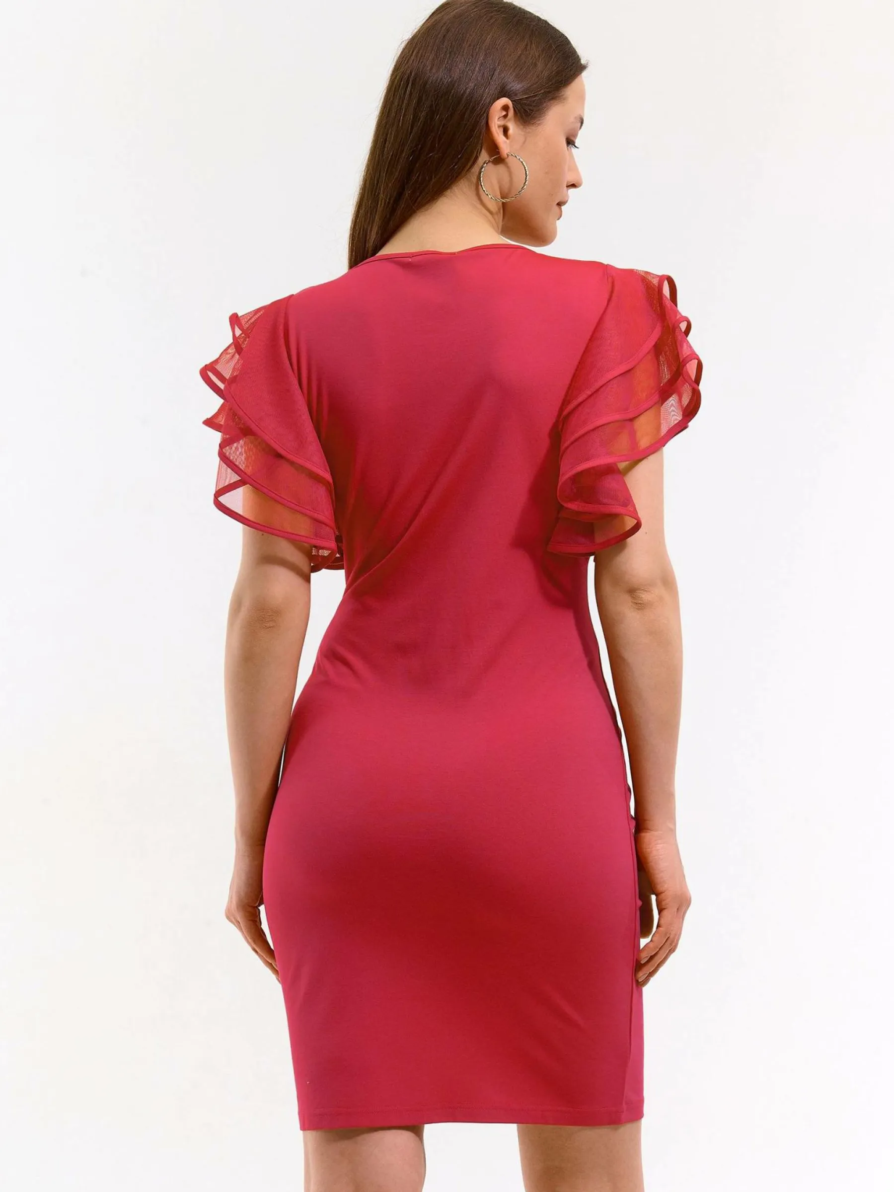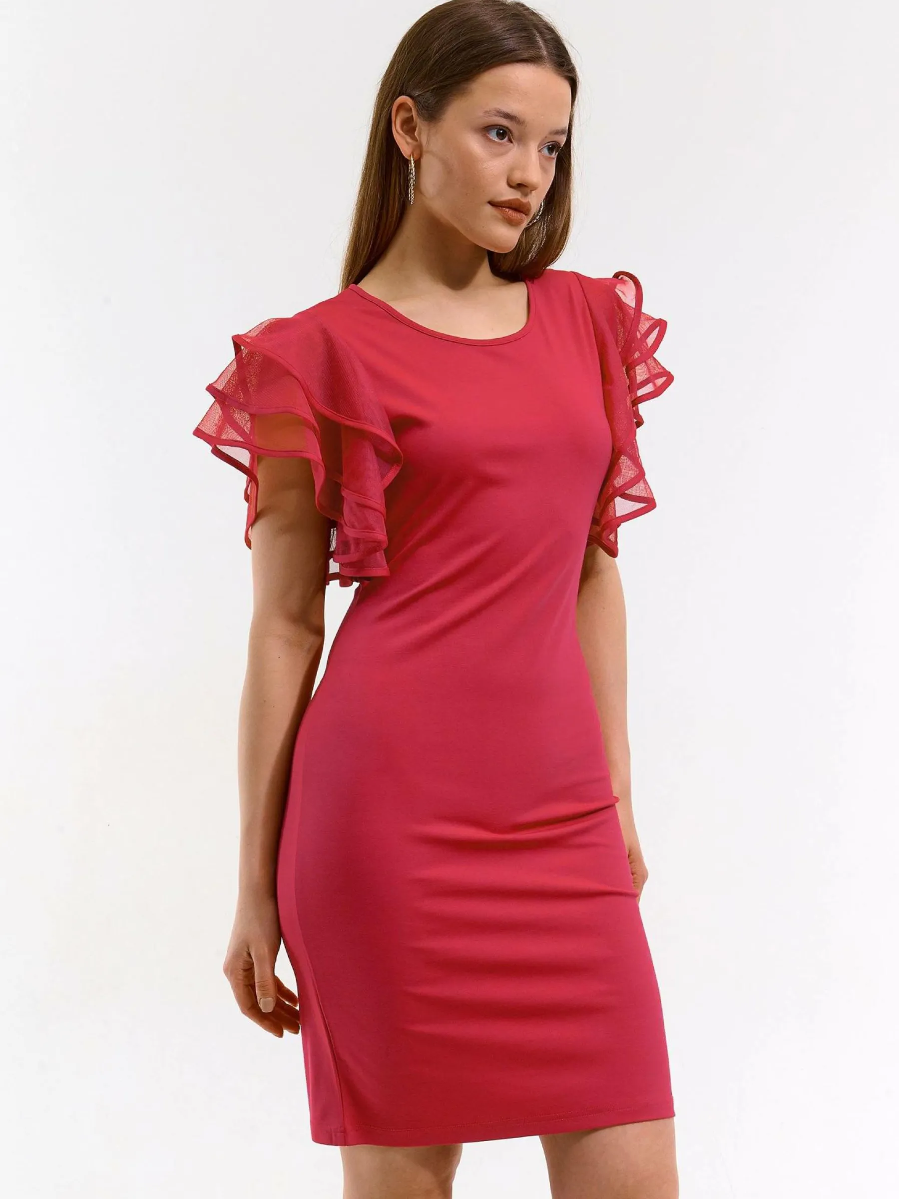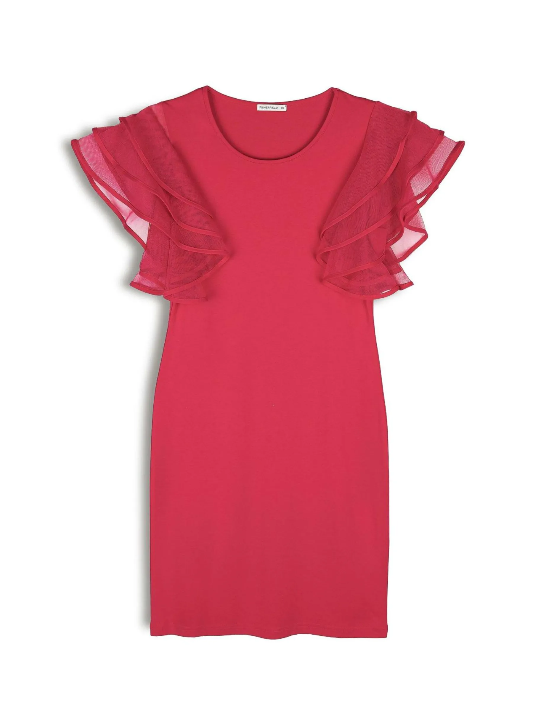 Kolor: różowyKrój: z falbanąTyp: sukienkaRekaw: krótki rękawDługość: miniPattern style: pojedynczy kolorDetal: …