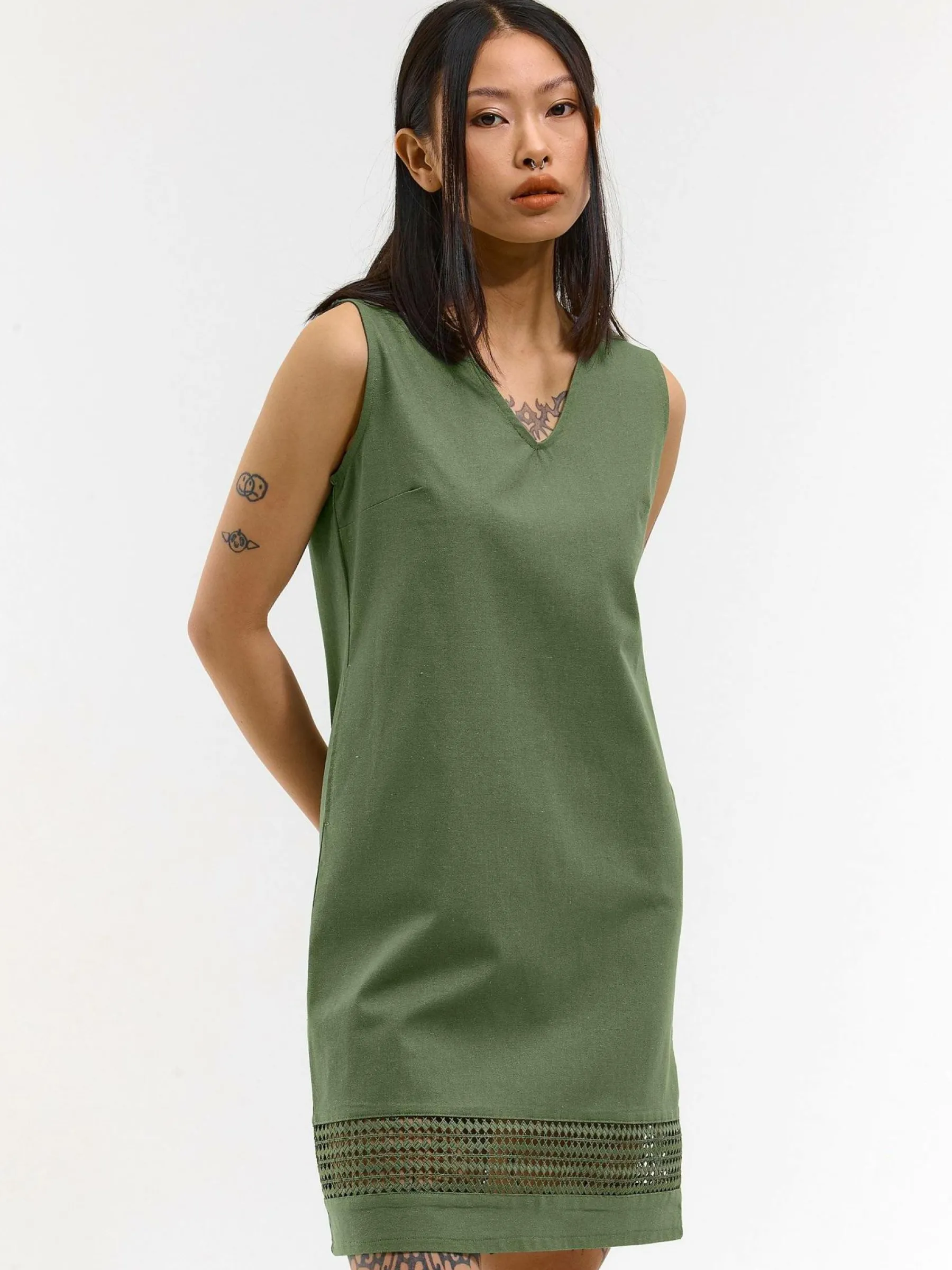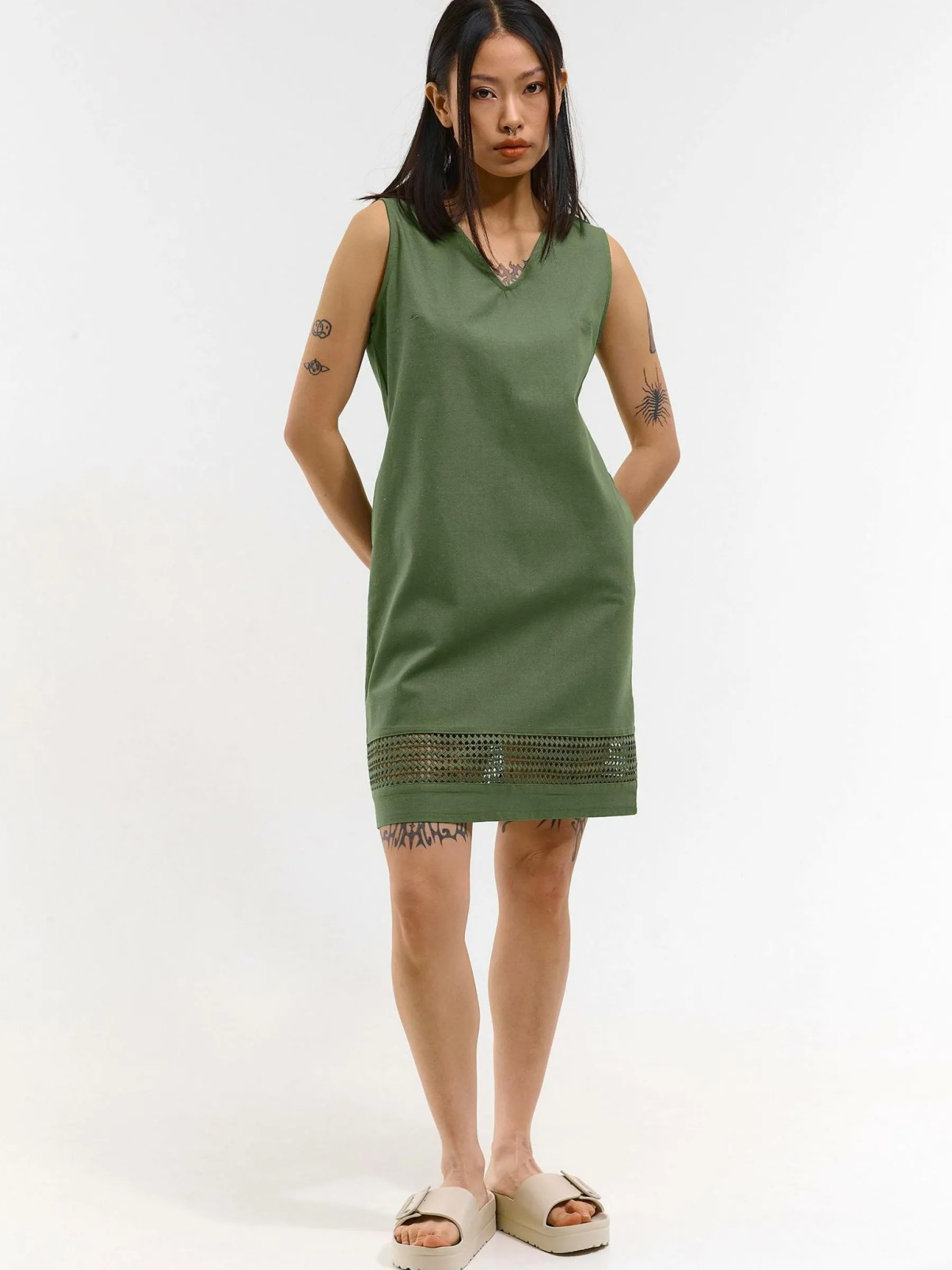 Kolor: khakiKrój: regularTyp: sukienkaRekaw: bez rękawówDługość: miniPattern style: pojedynczy kolorDetal: v-neckM…