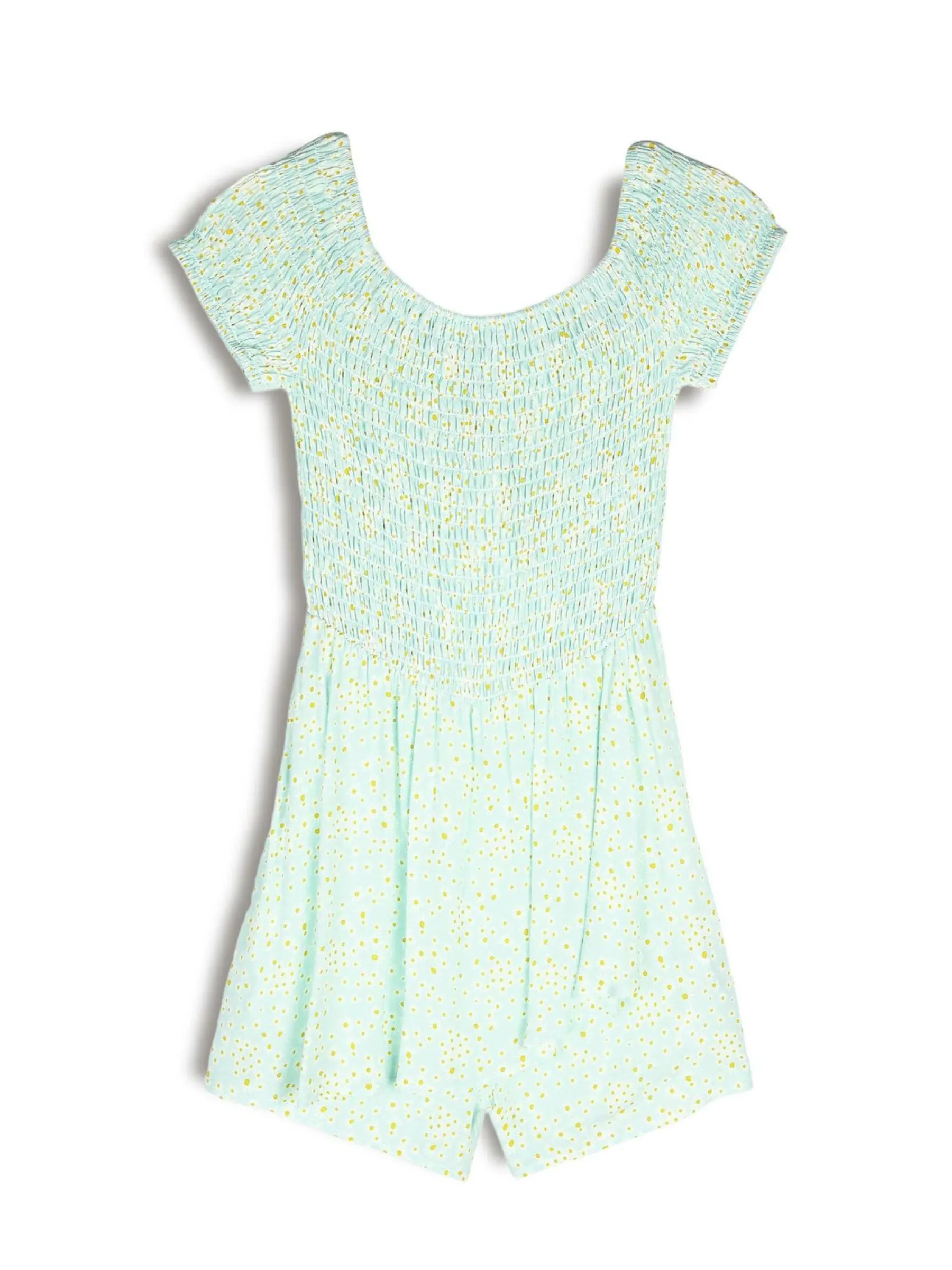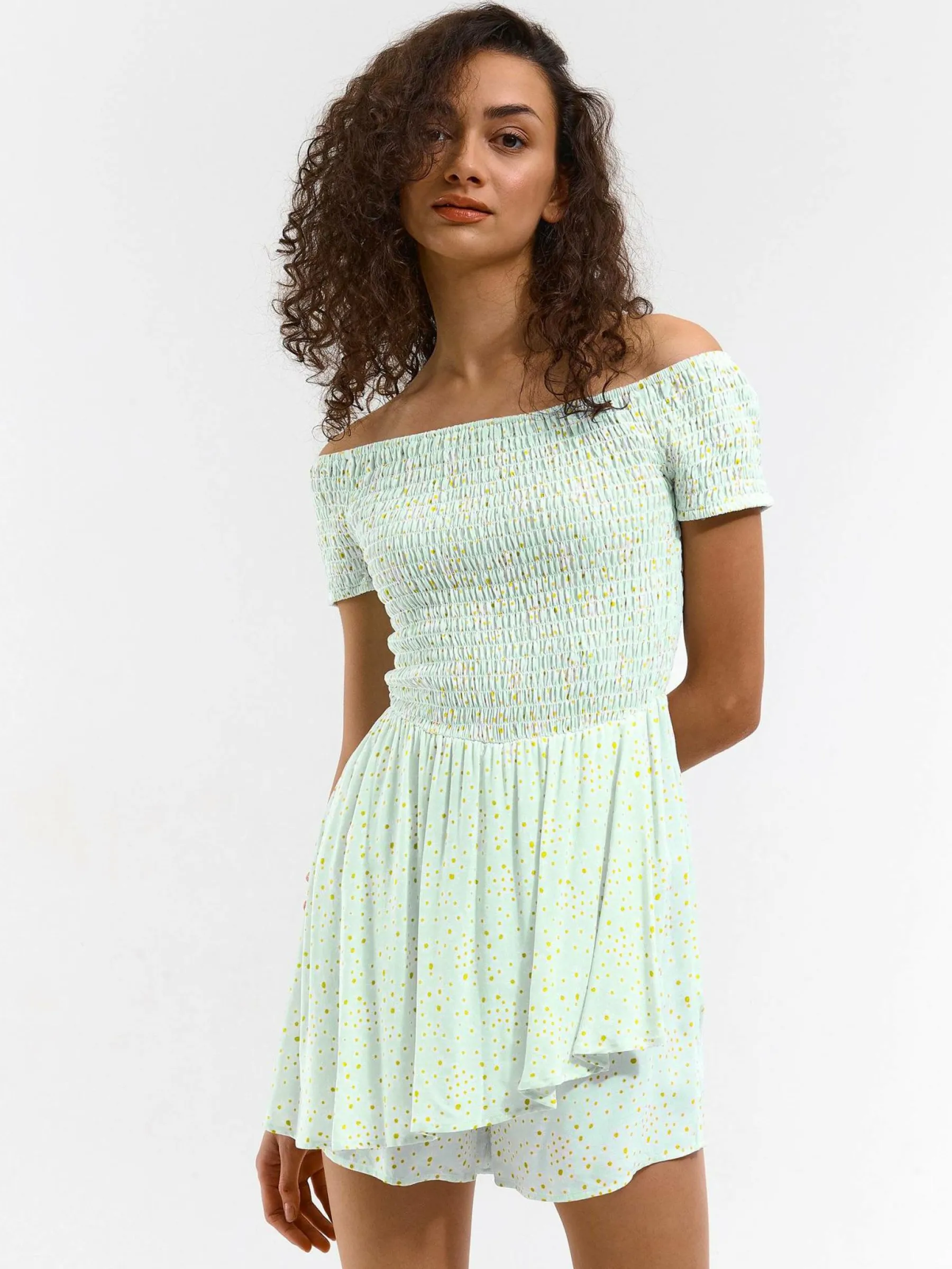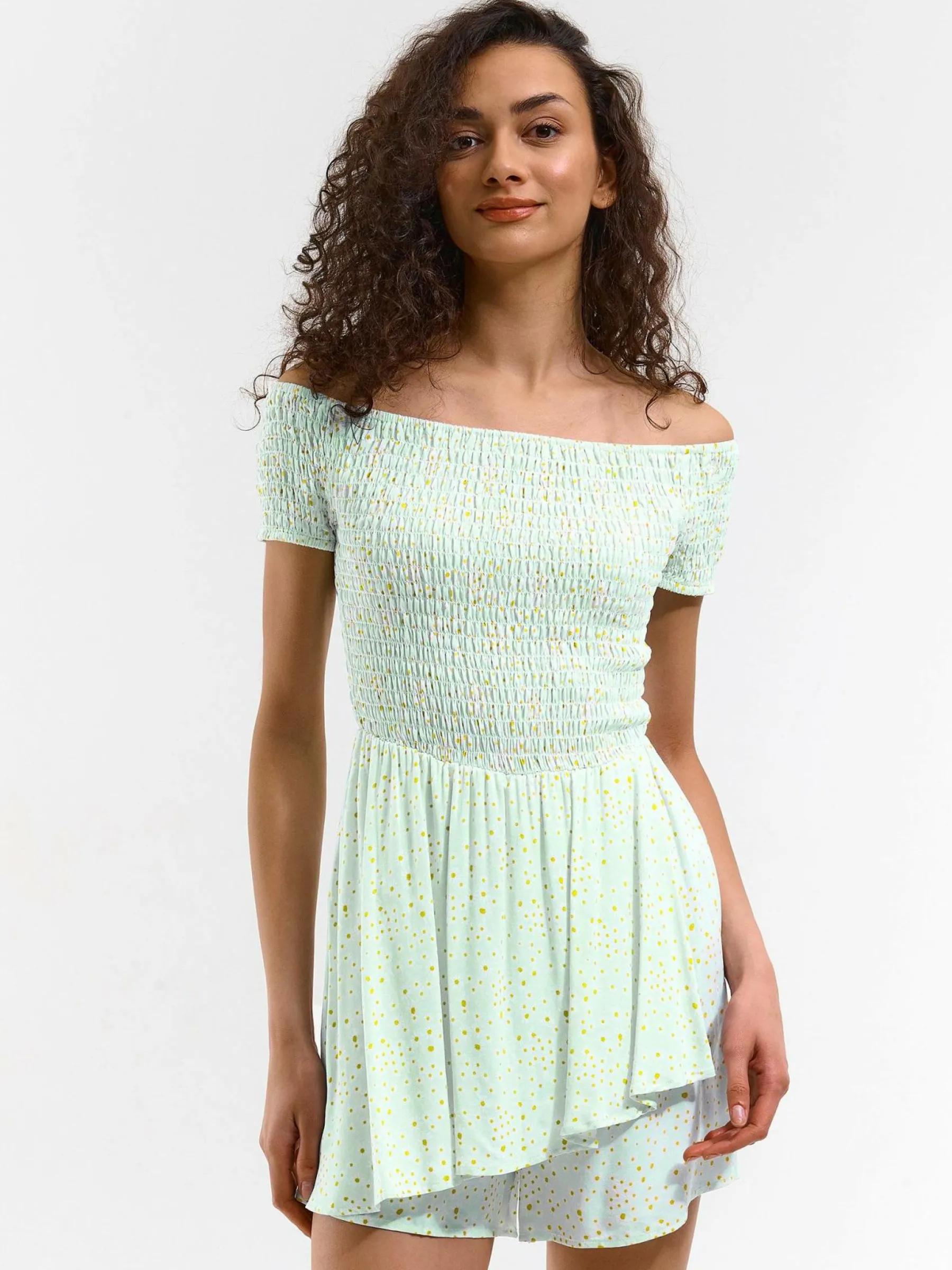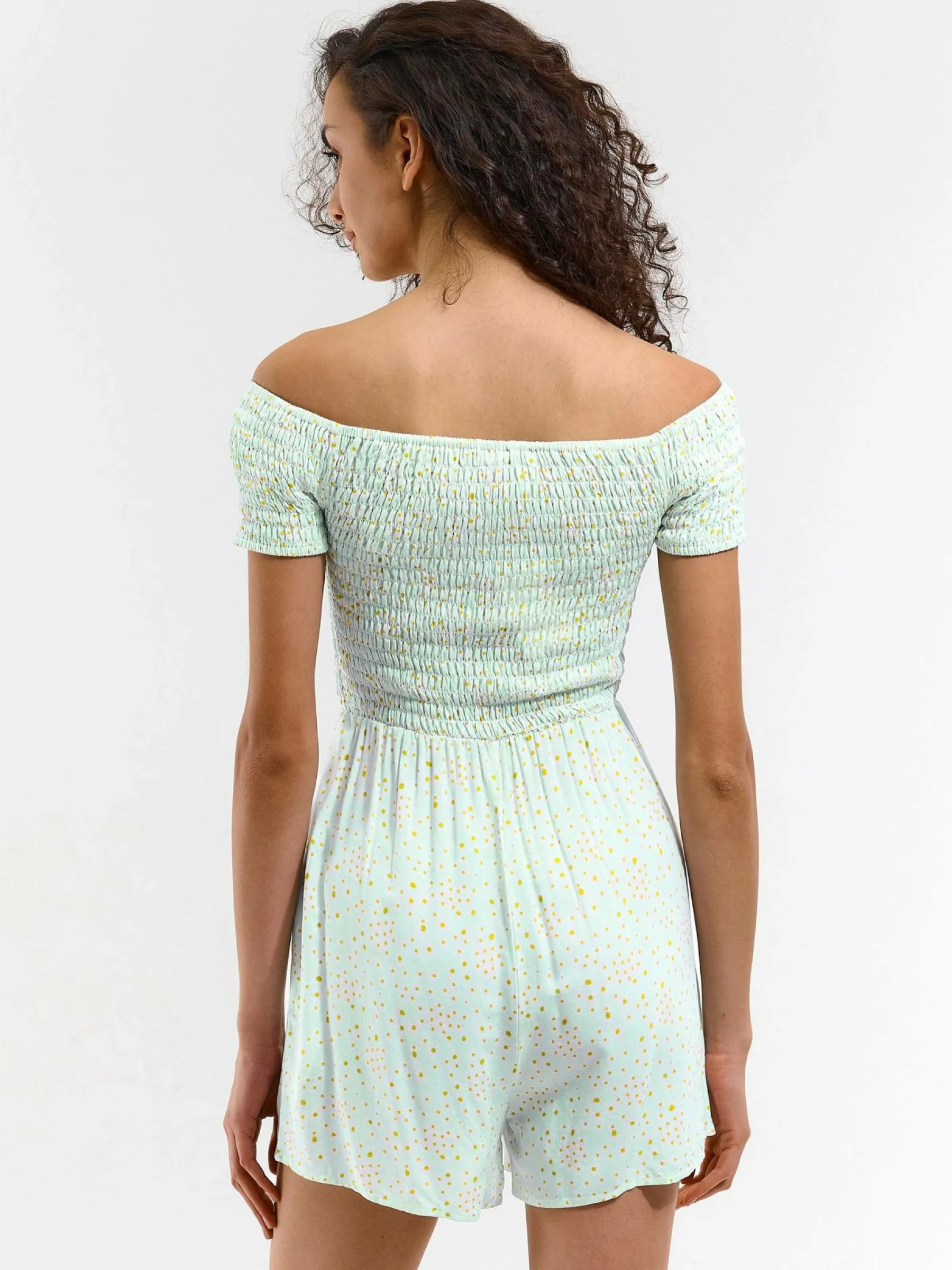 Kolor: zielonyKrój: z marszczeniemTyp: kombinezonRekaw: krótki rękawDługość: krótkiPattern style: kwiatoweMateria…