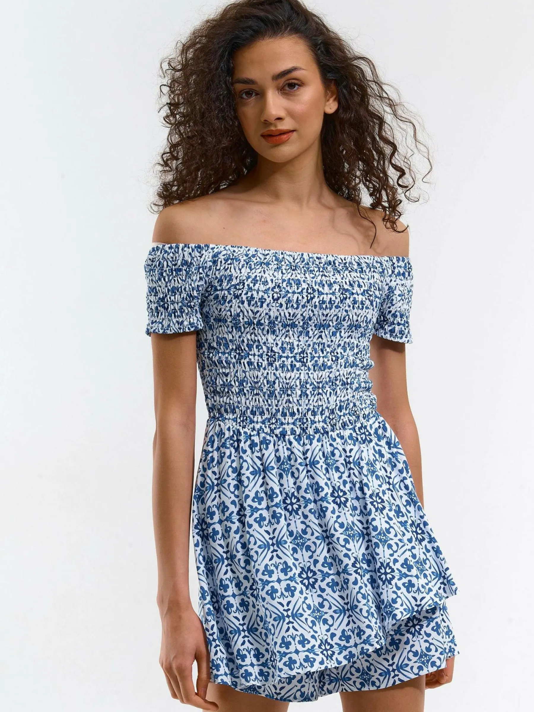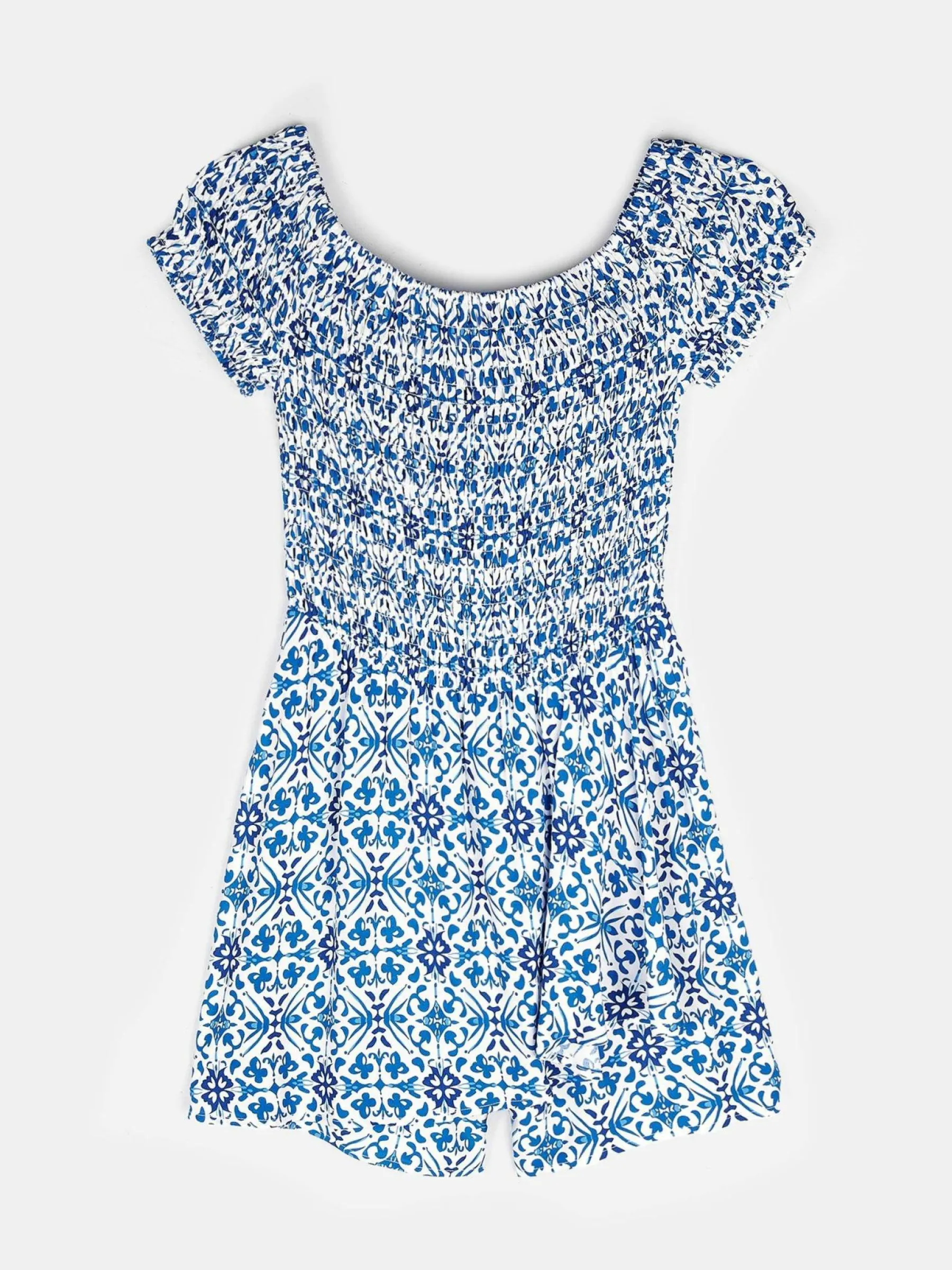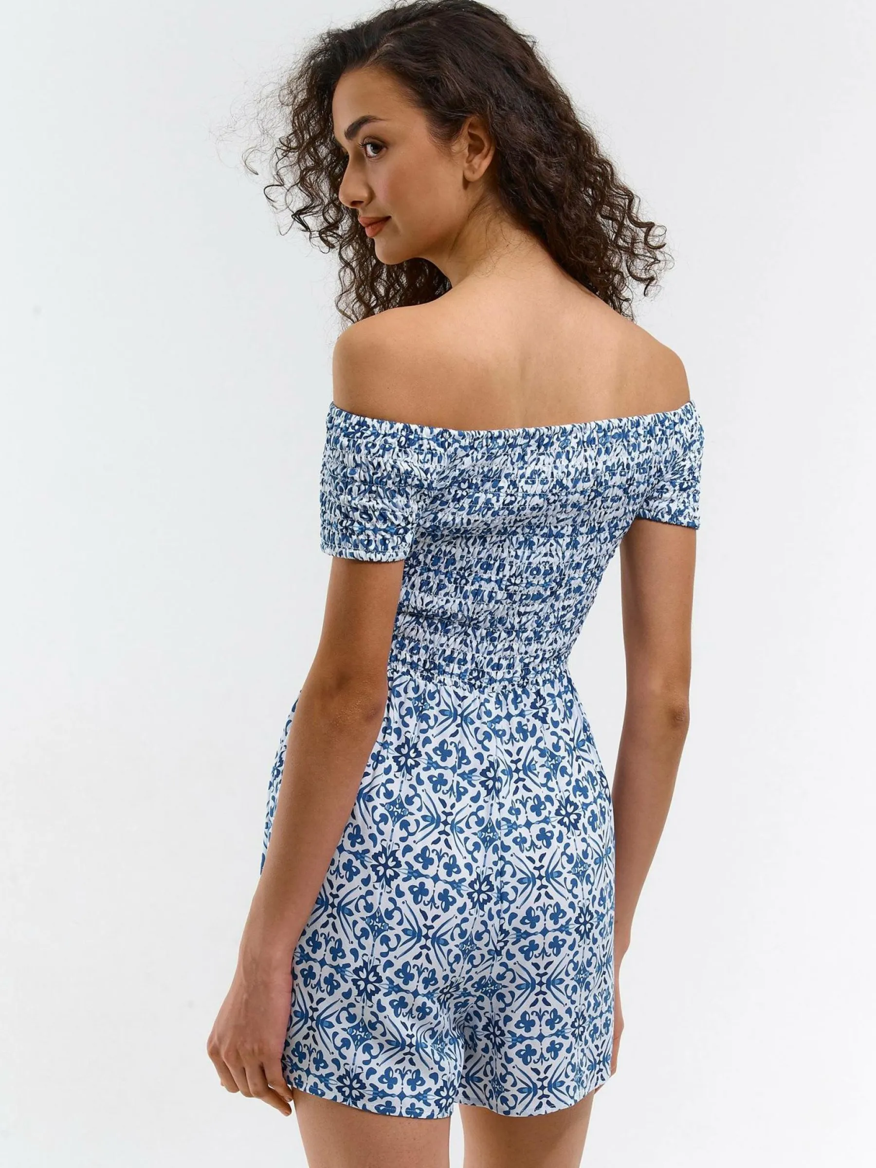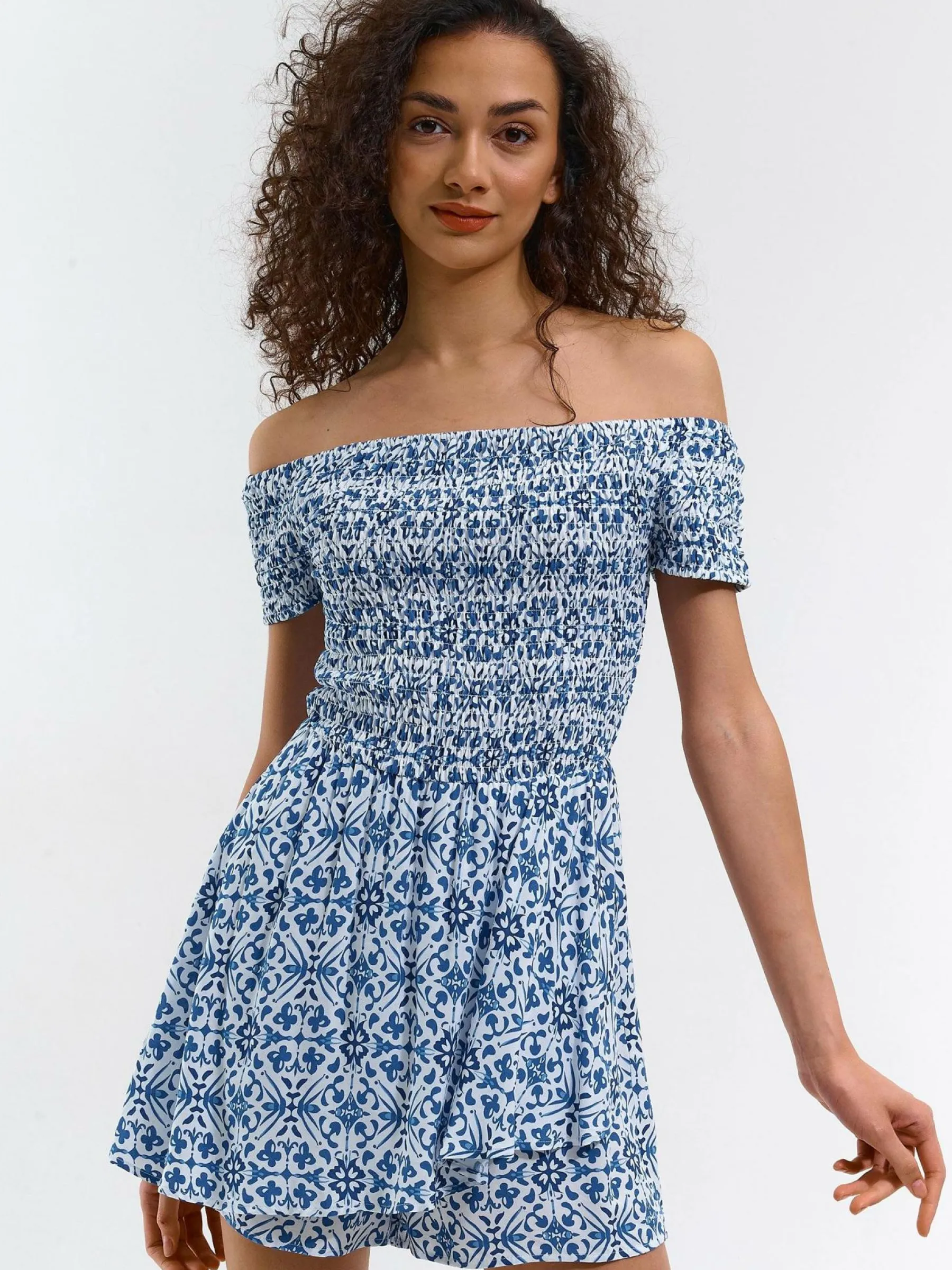 Kolor: niebieskiKrój: z marszczeniemTyp: kombinezonRekaw: krótki rękawDługość: krótkiPattern style: wzorzysteMate…