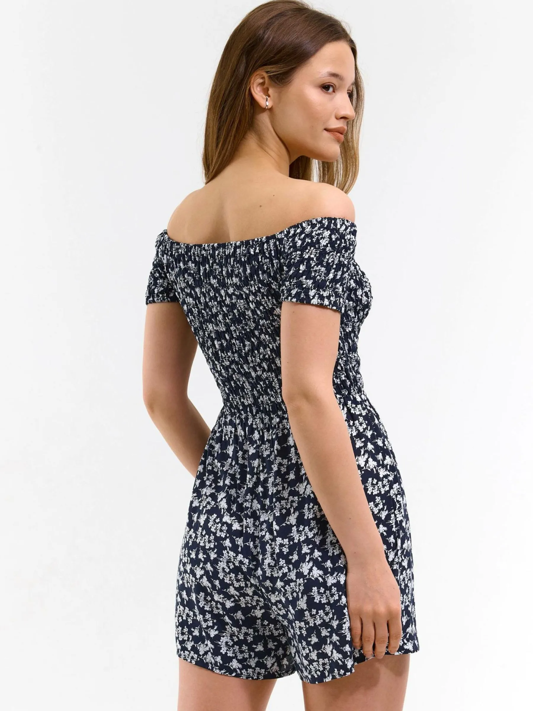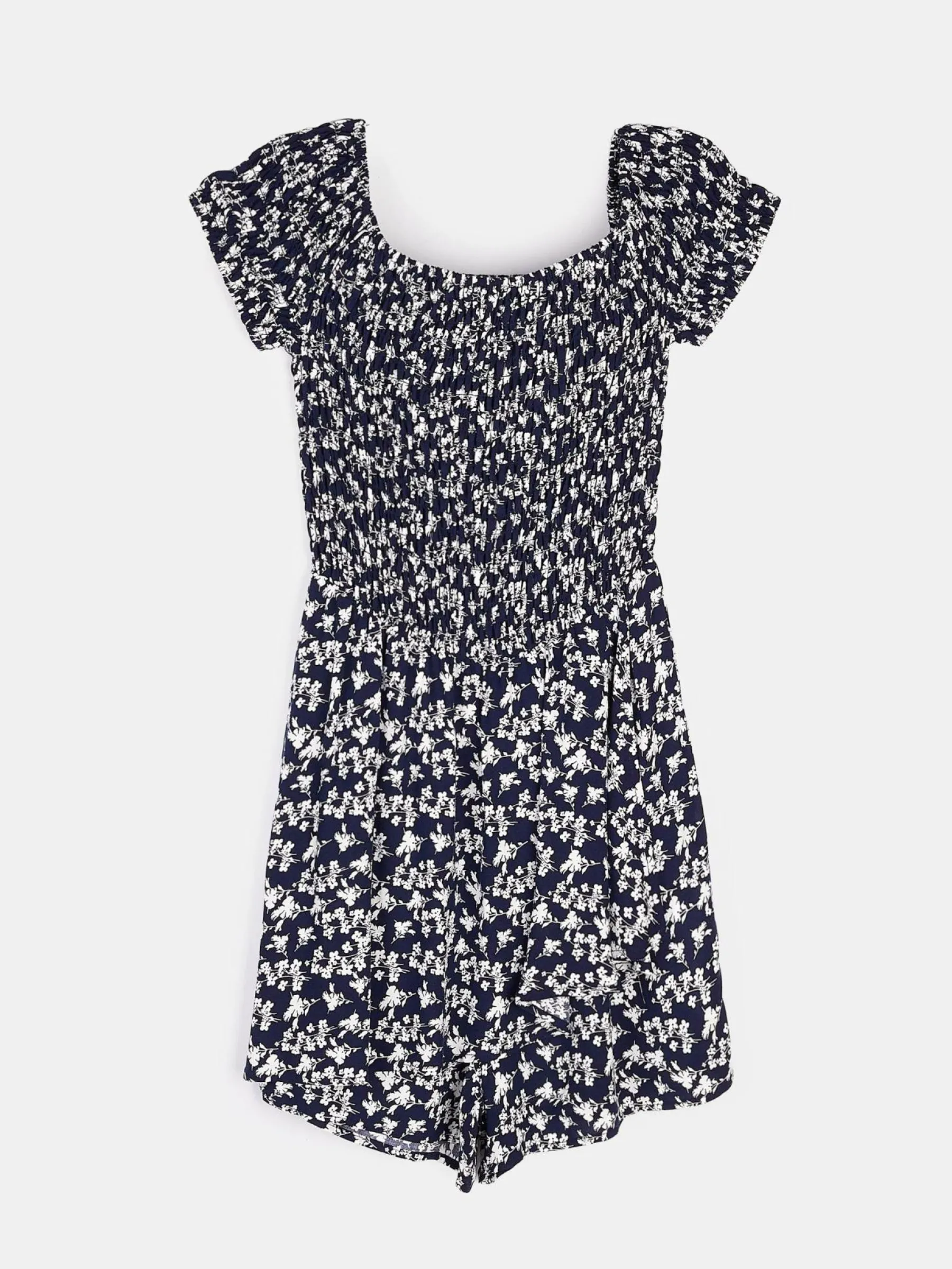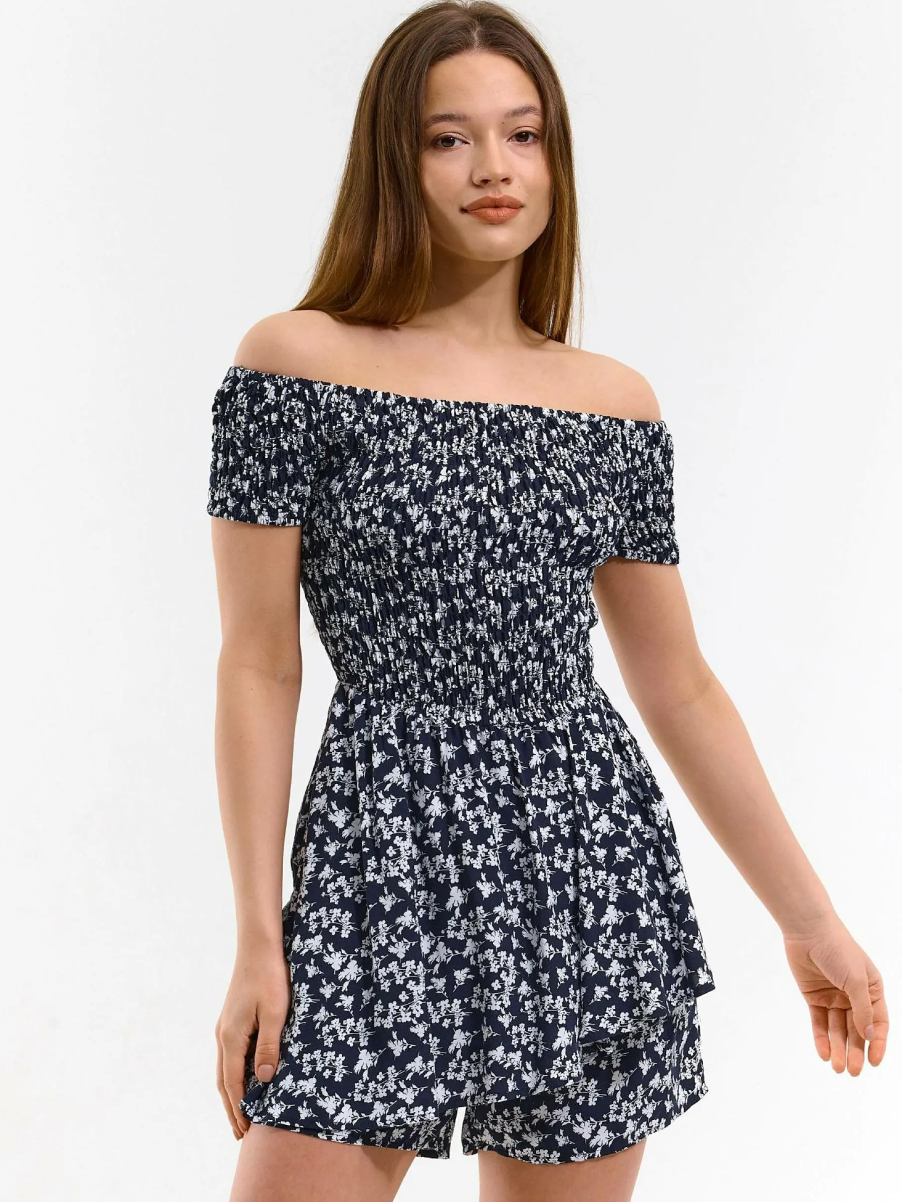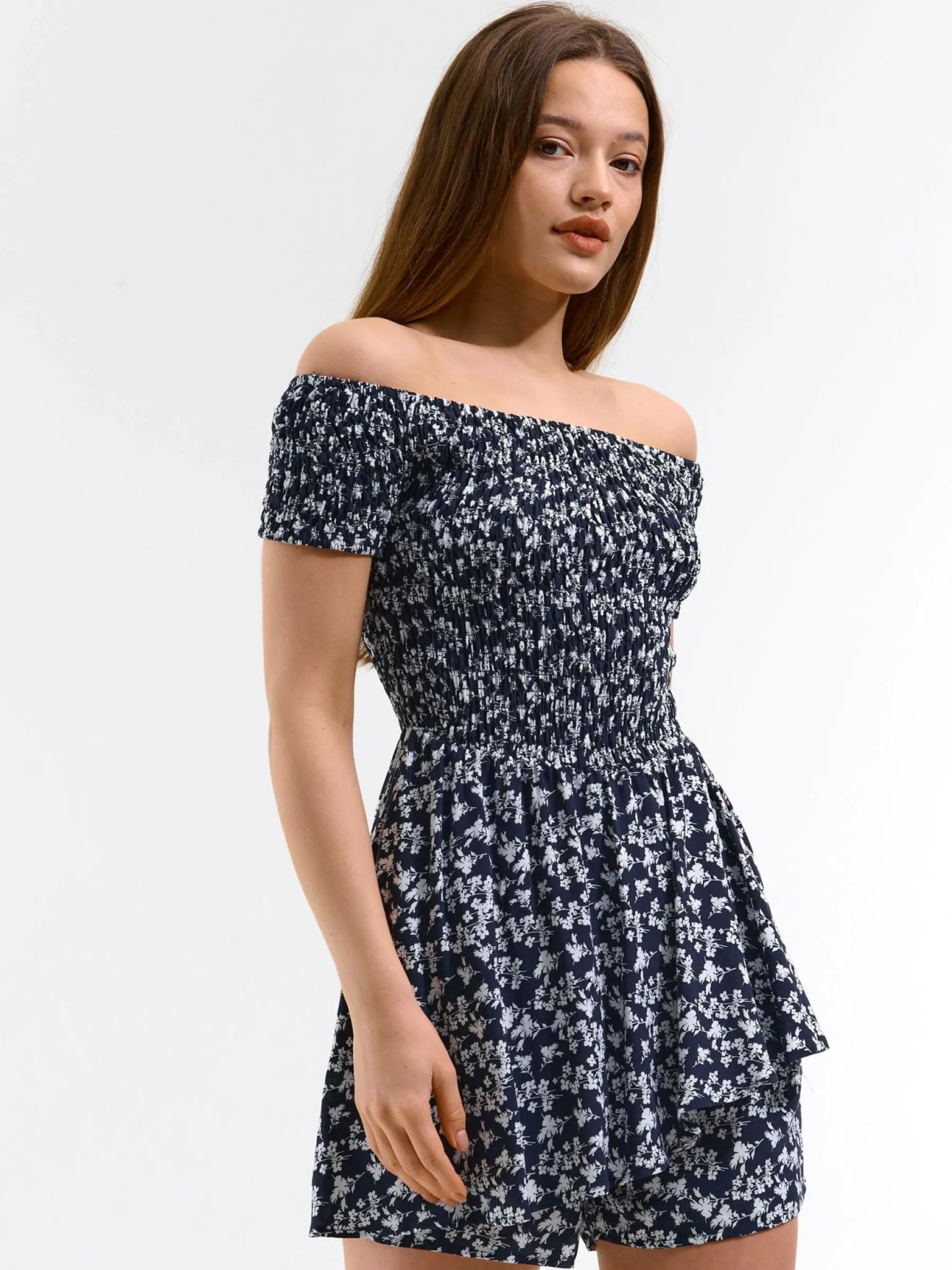 Kolor: granatowyKrój: asymetryczne, z falbanąTyp: kombinezonRekaw: krótki rękawDługość: krótkiPattern style: kwi…