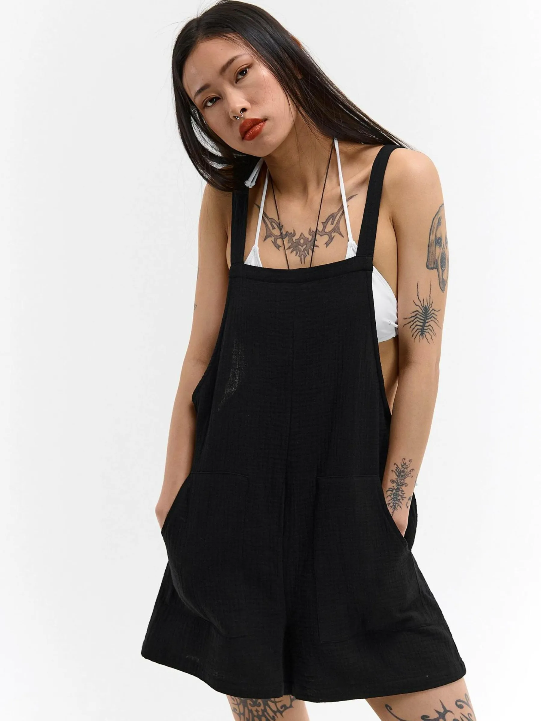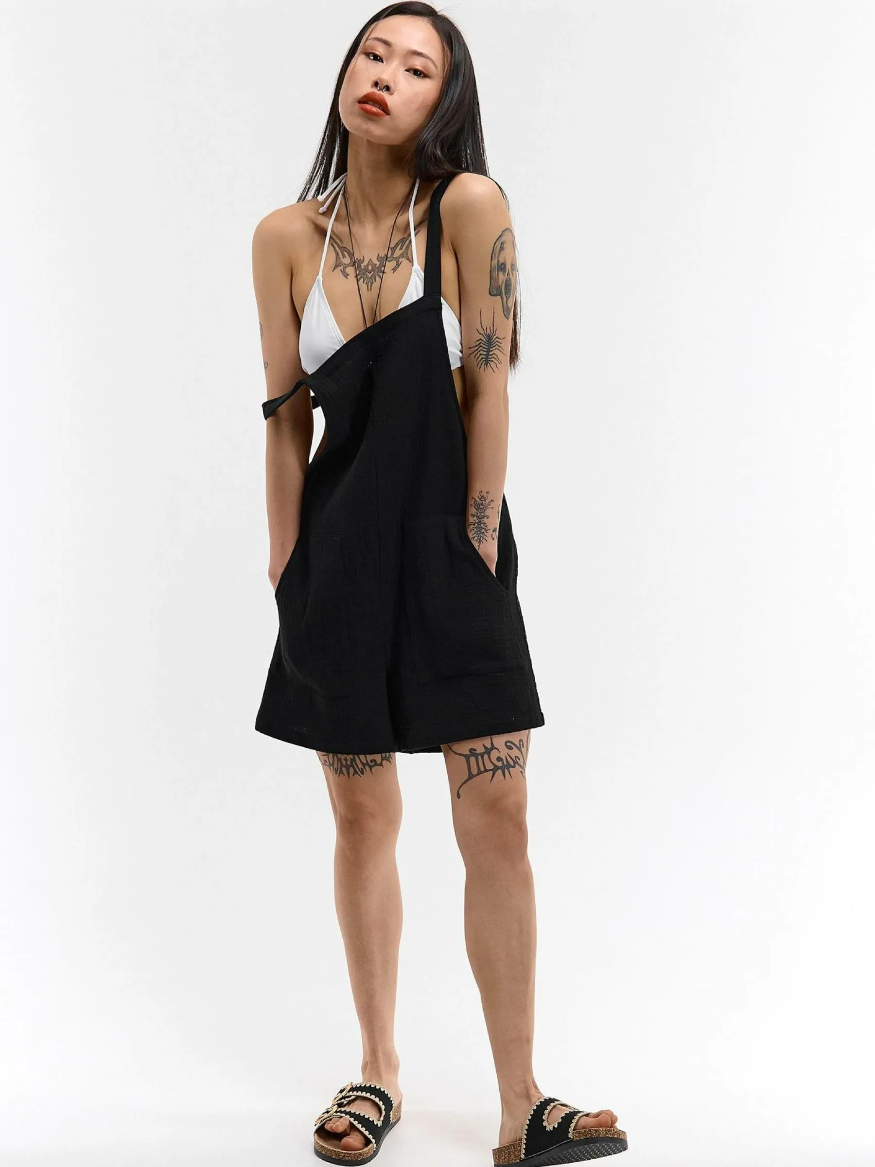 Kolor: czarnyKrój: na szelkachTyp: kombinezonRekaw: bez rękawówDługość: krótkiPattern style: pojedynczy kolorDeta…