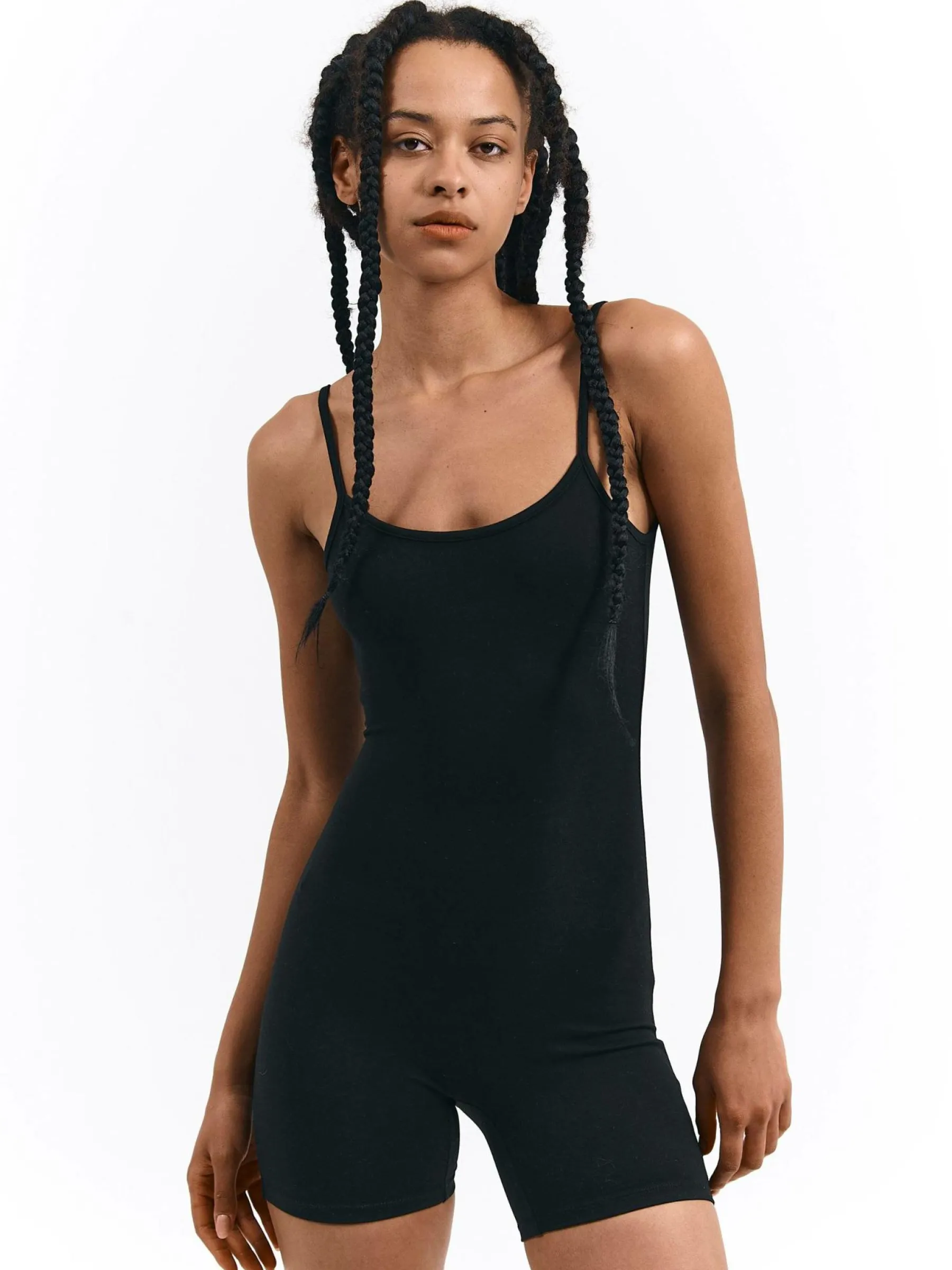 Kolor: czarnyKrój: slimTyp: kombinezonRekaw: bez rękawówDługość: krótkiPattern style: pojedynczy kolorDetal: z re…
