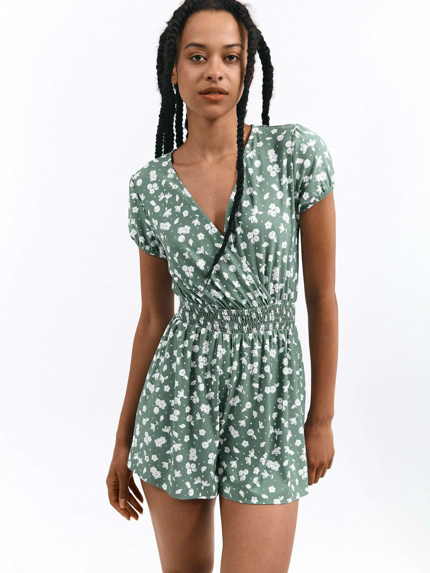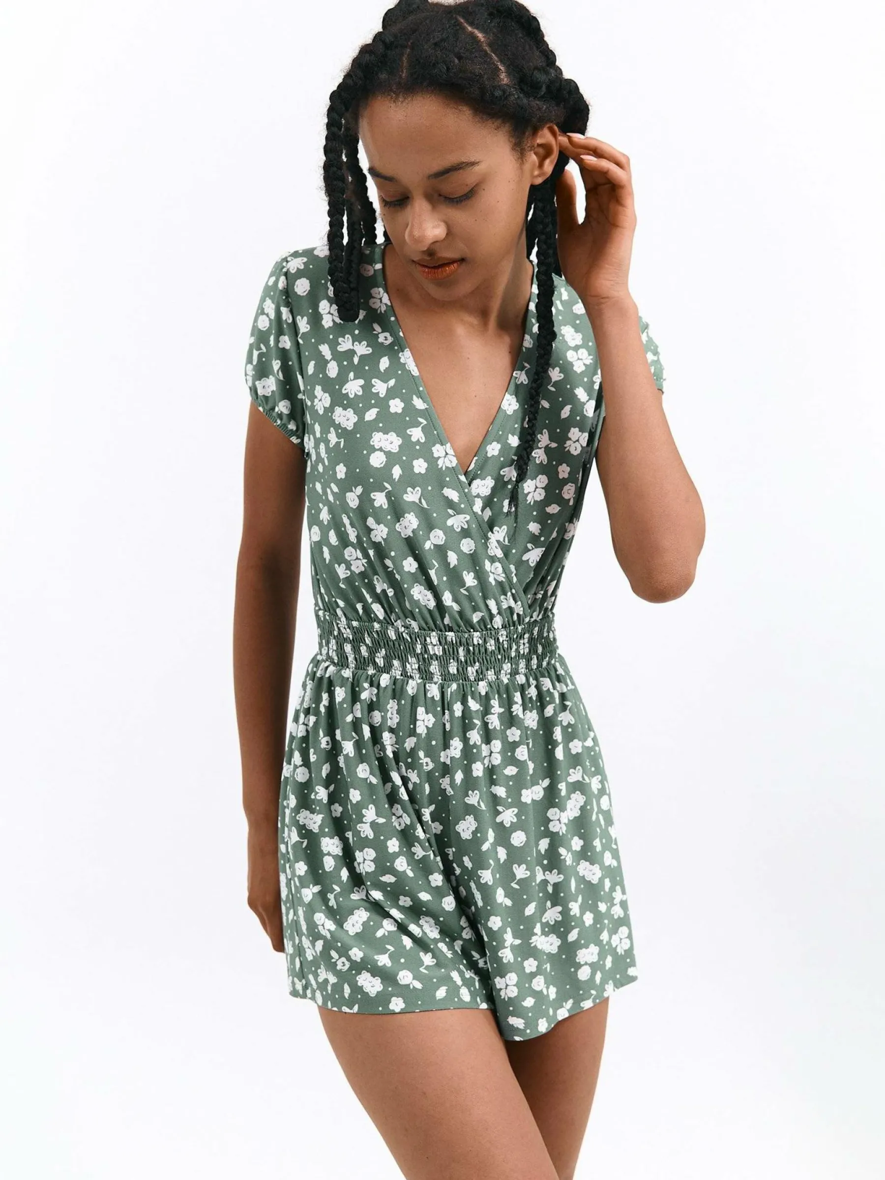 Kolor: zielonyKrój: kopertówkiTyp: kombinezonRekaw: krótki rękawDługość: krótkiPattern style: kwiatoweDetal: z f…