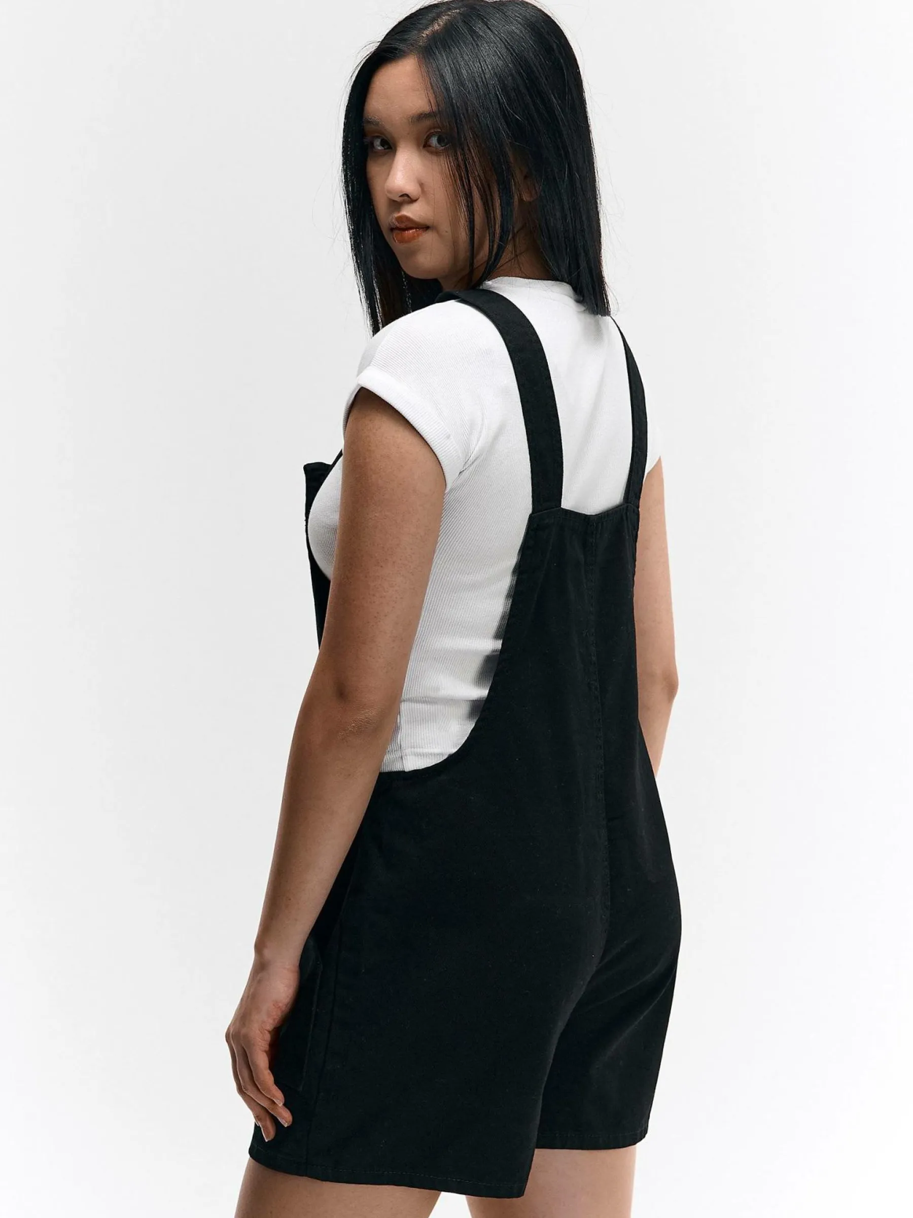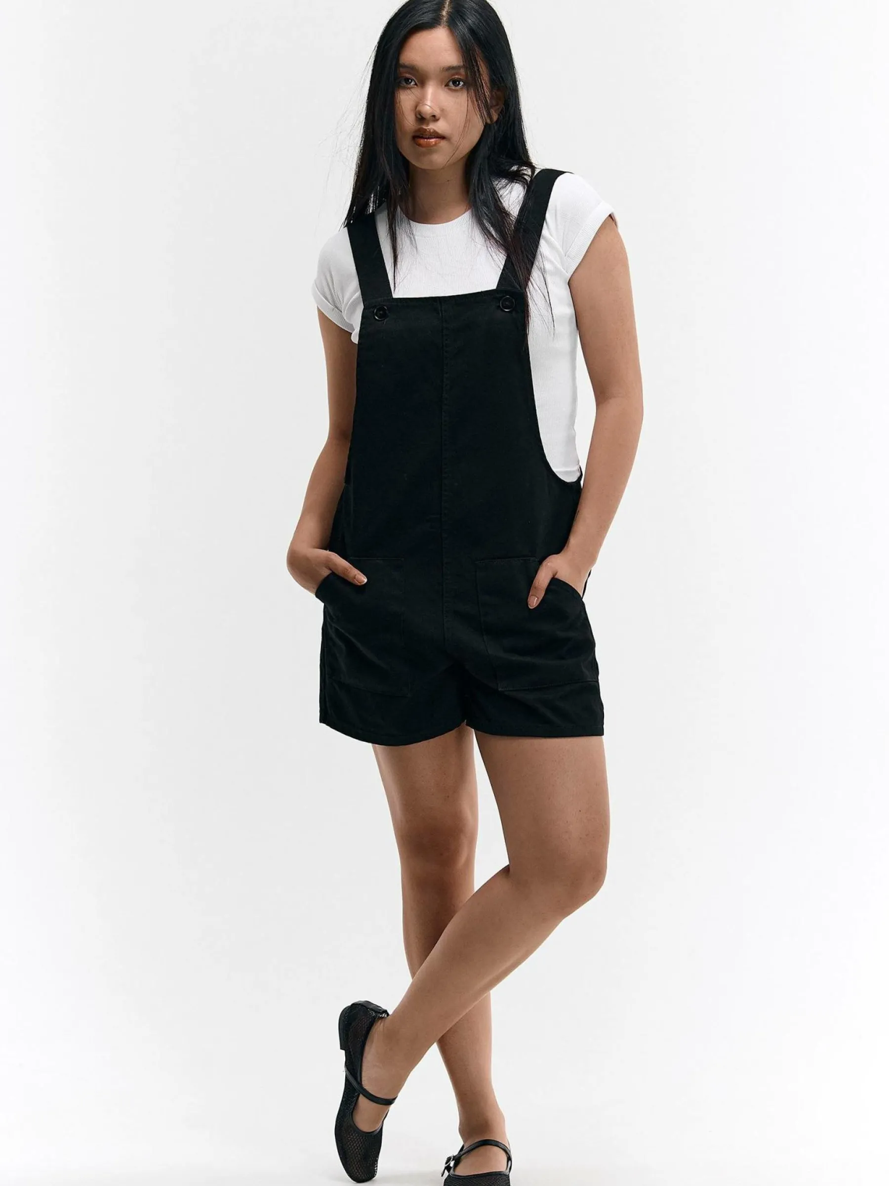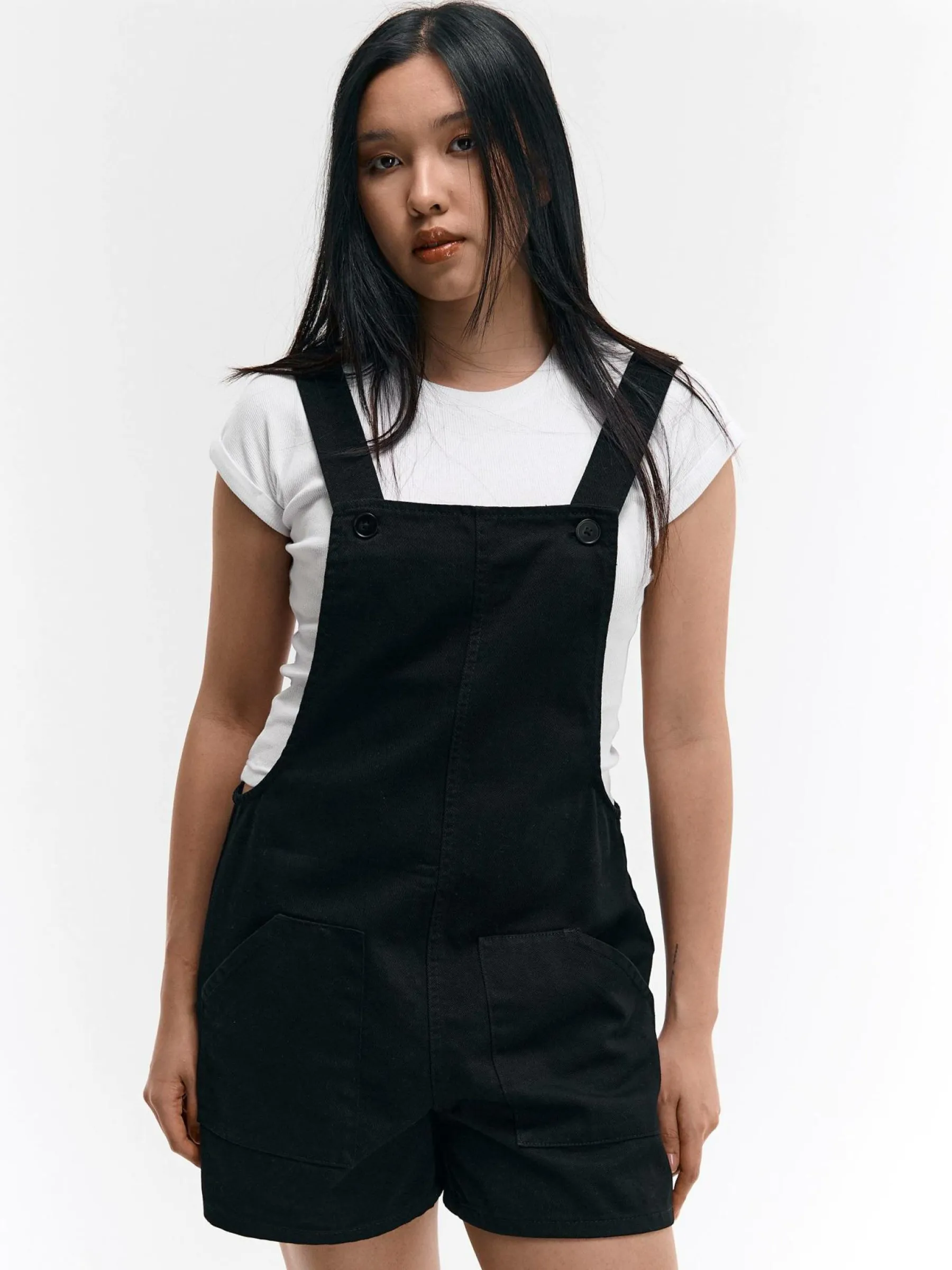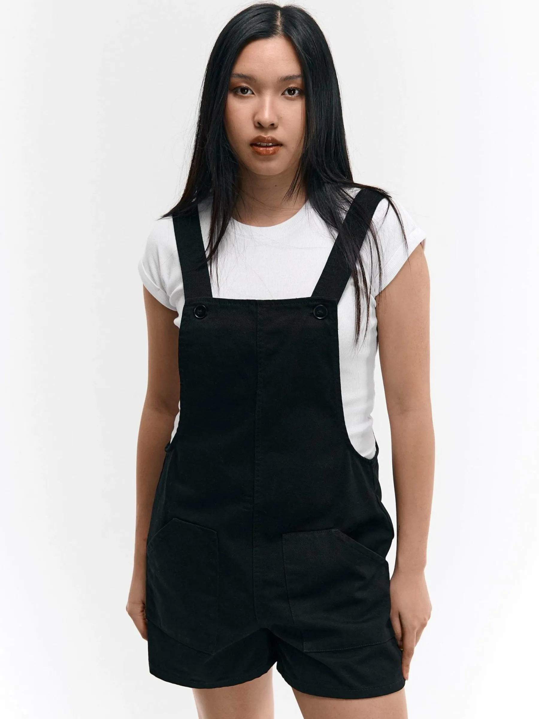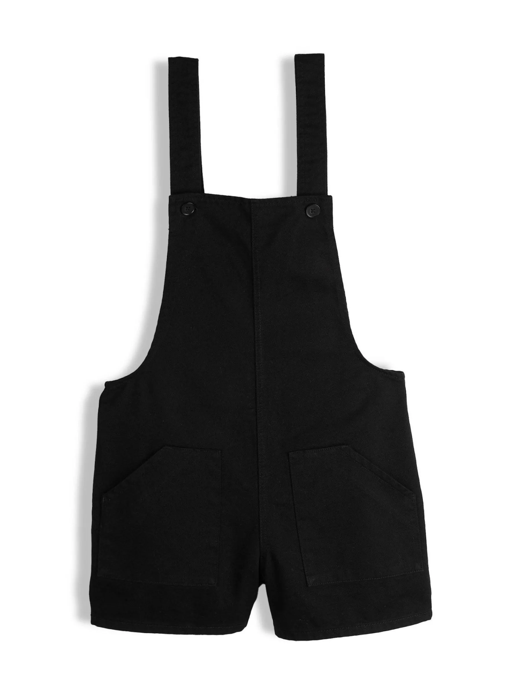 Kolor: czarnyKrój: na szelkachTyp: kombinezonDługość: krótkiPattern style: pojedynczy kolorDetal: z kieszeniamiMate…