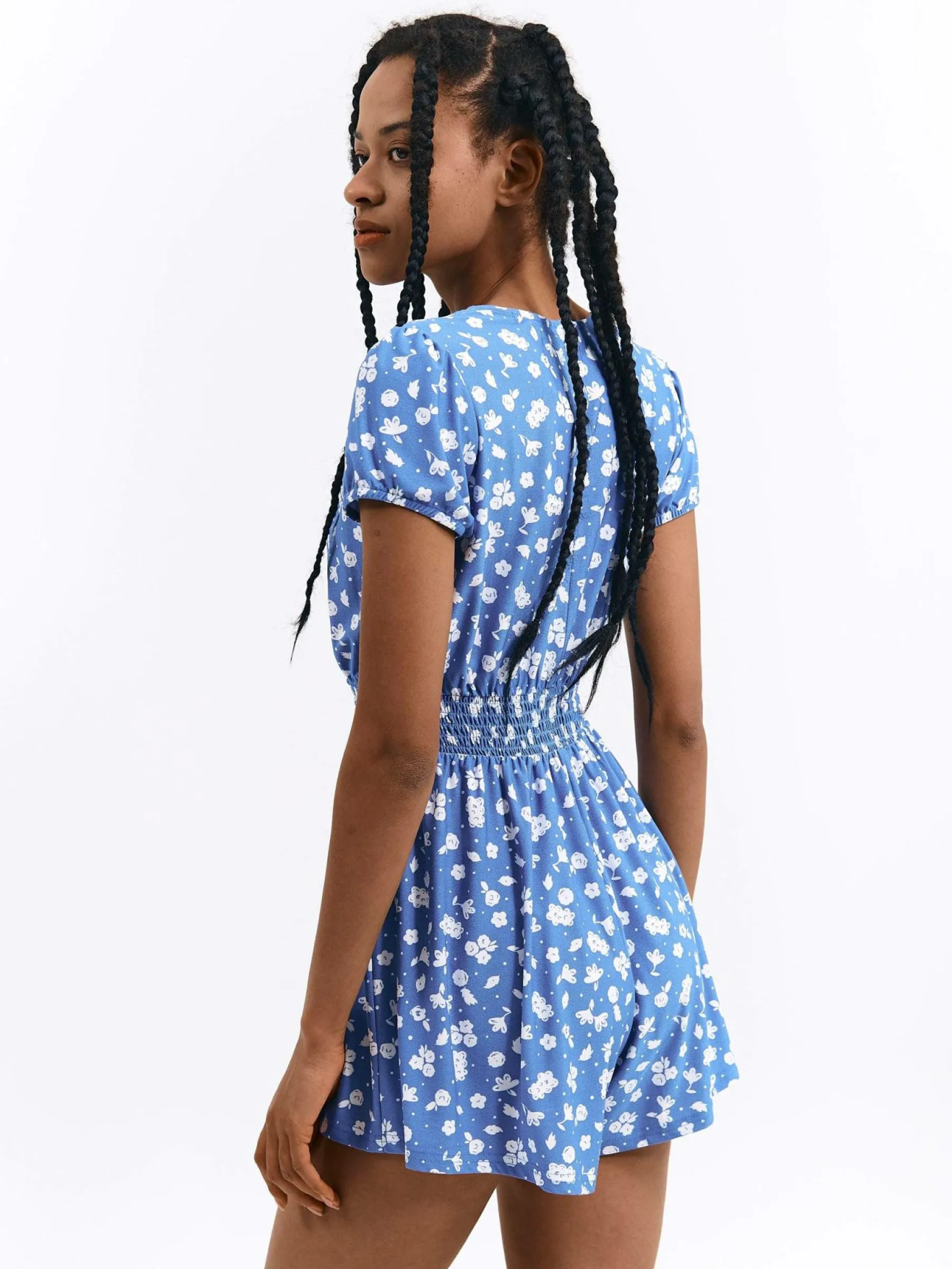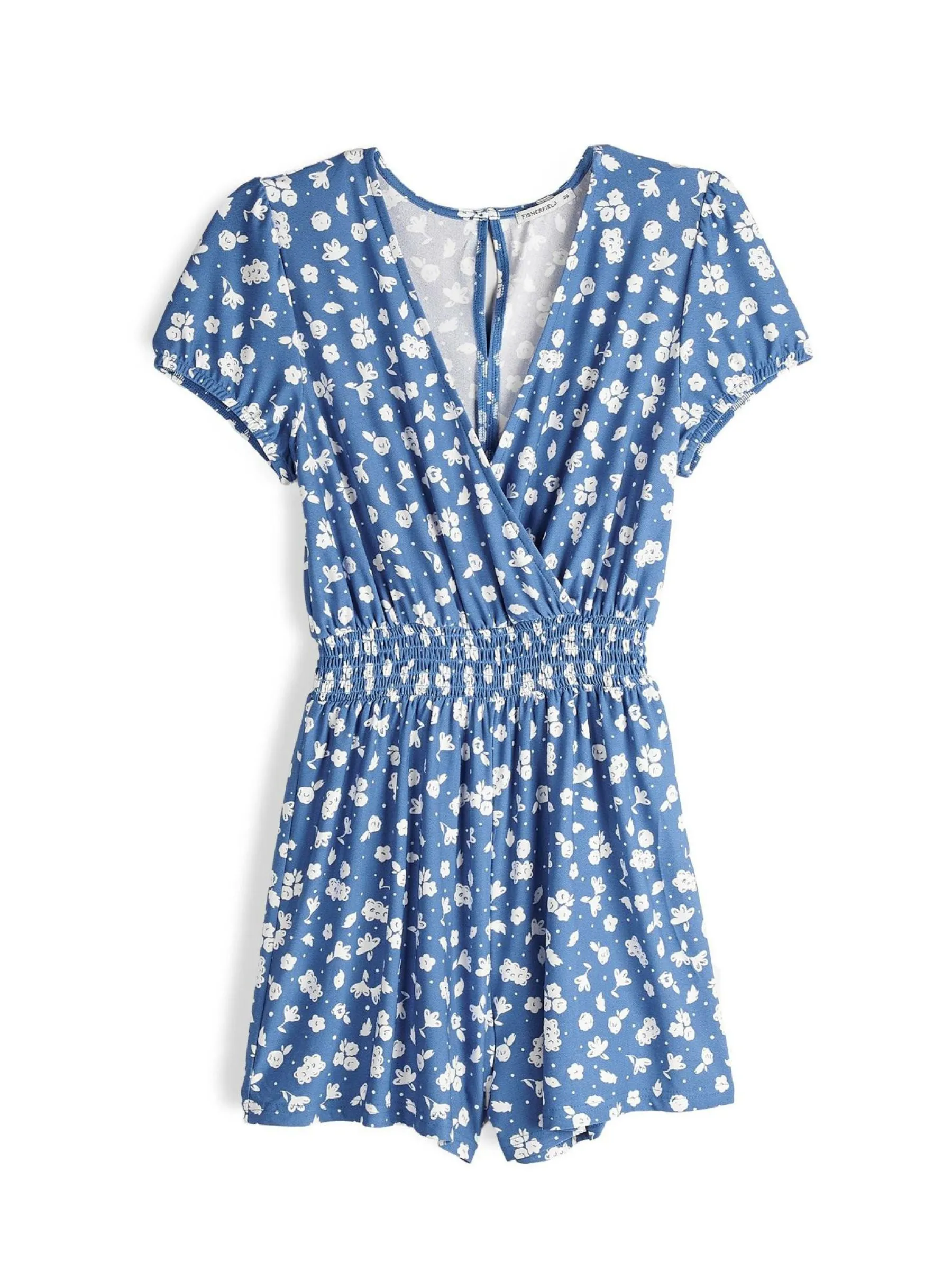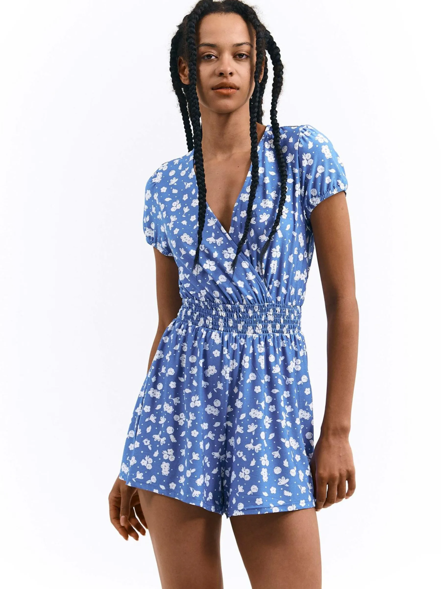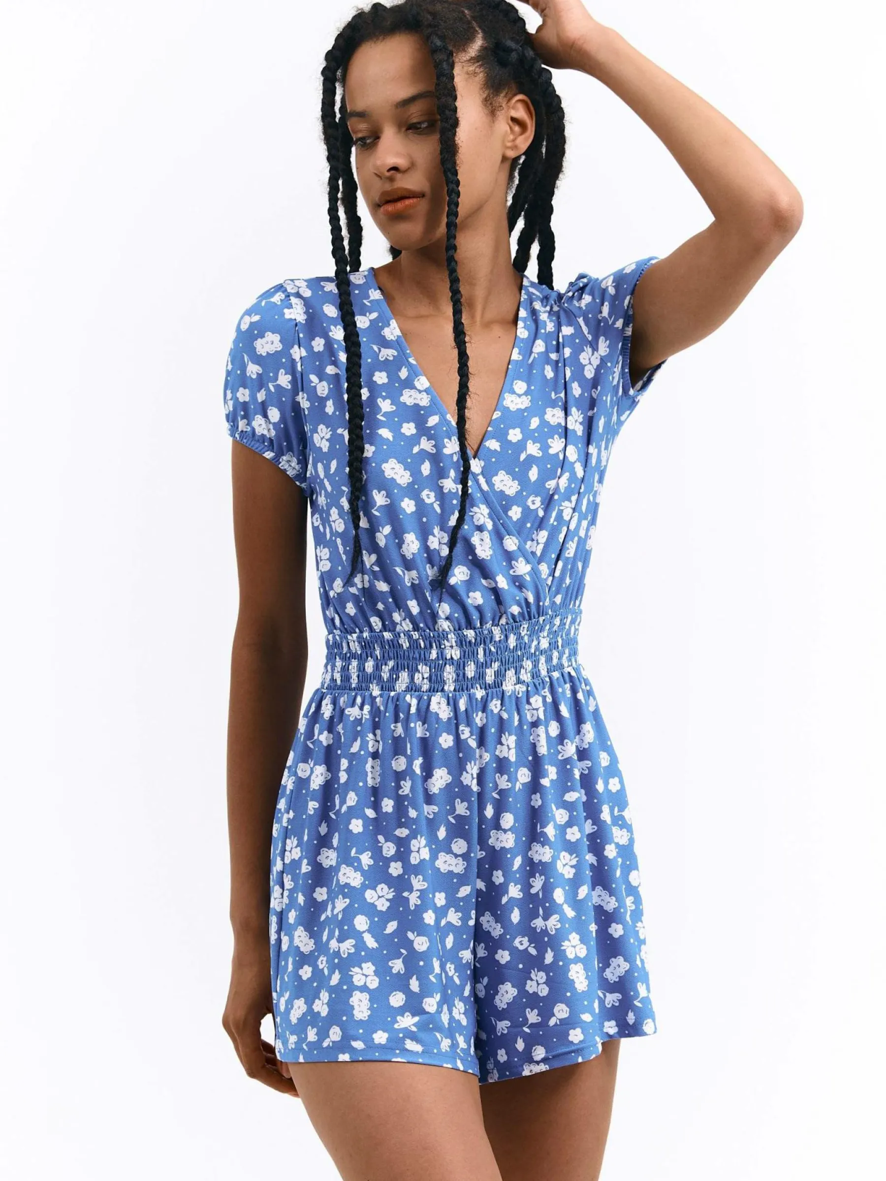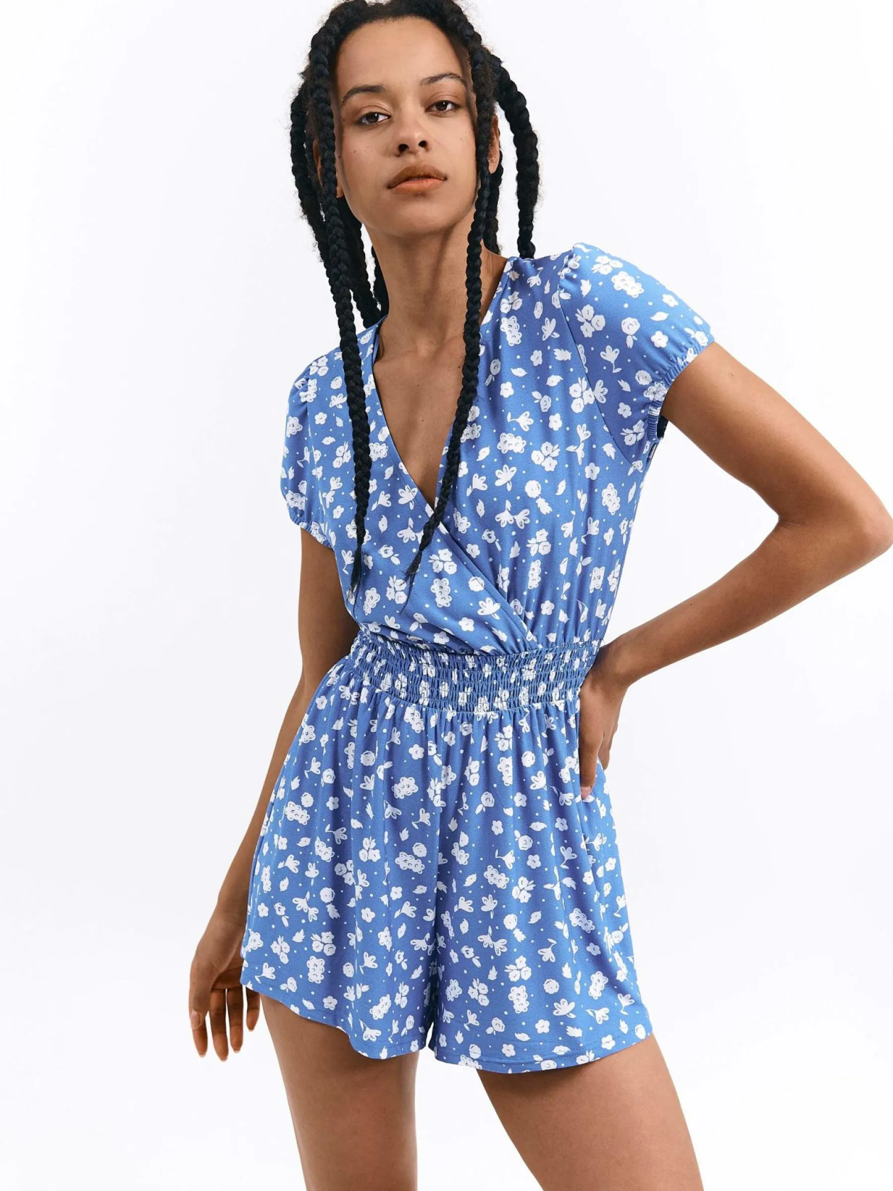 Kolor: niebieskiKrój: kopertówkiTyp: kombinezonRekaw: krótki rękawDługość: krótkiPattern style: kwiatoweDetal: v…
