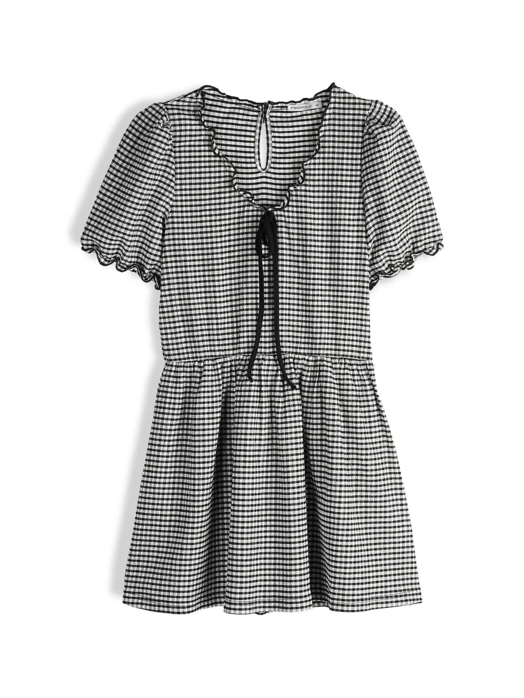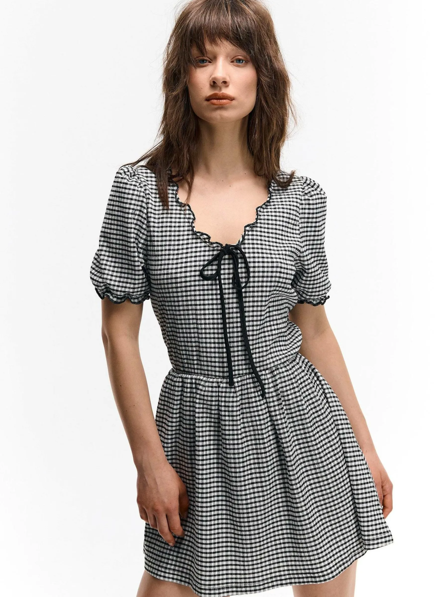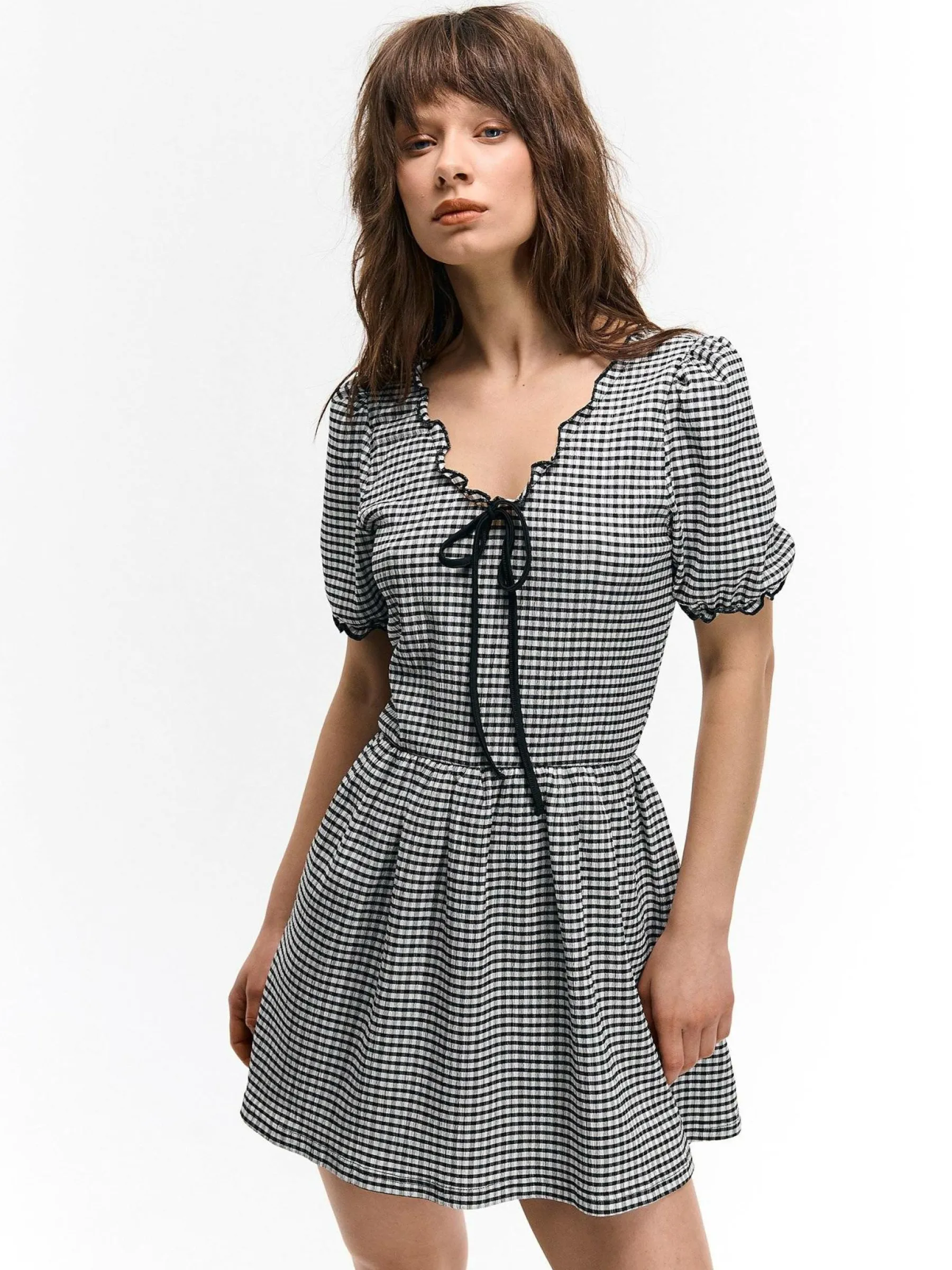 Kolor: czarnyKrój: z falbanąTyp: kombinezonRekaw: krótki rękawDługość: krótkiPattern style: w kratkęDetal: v-ne…