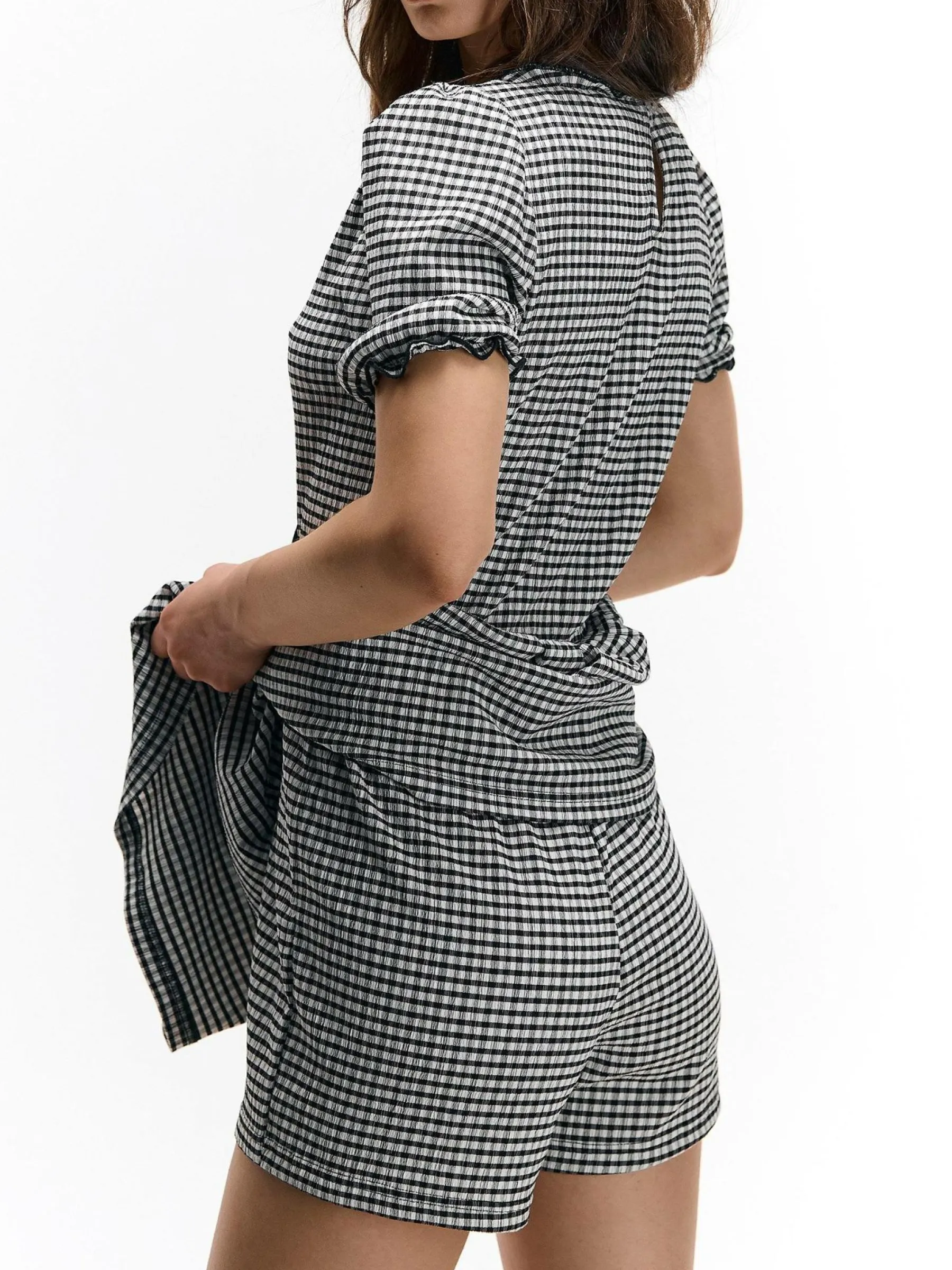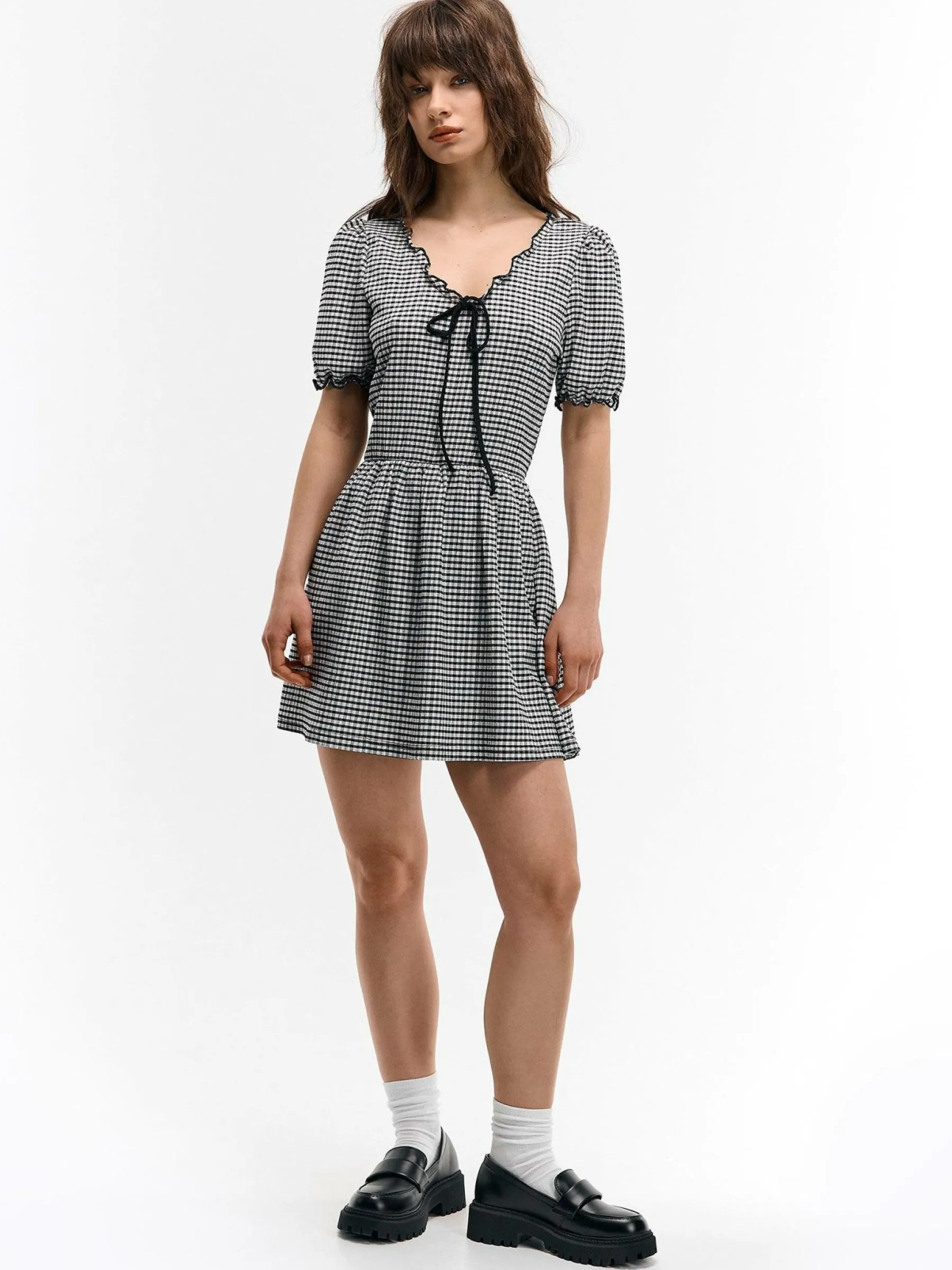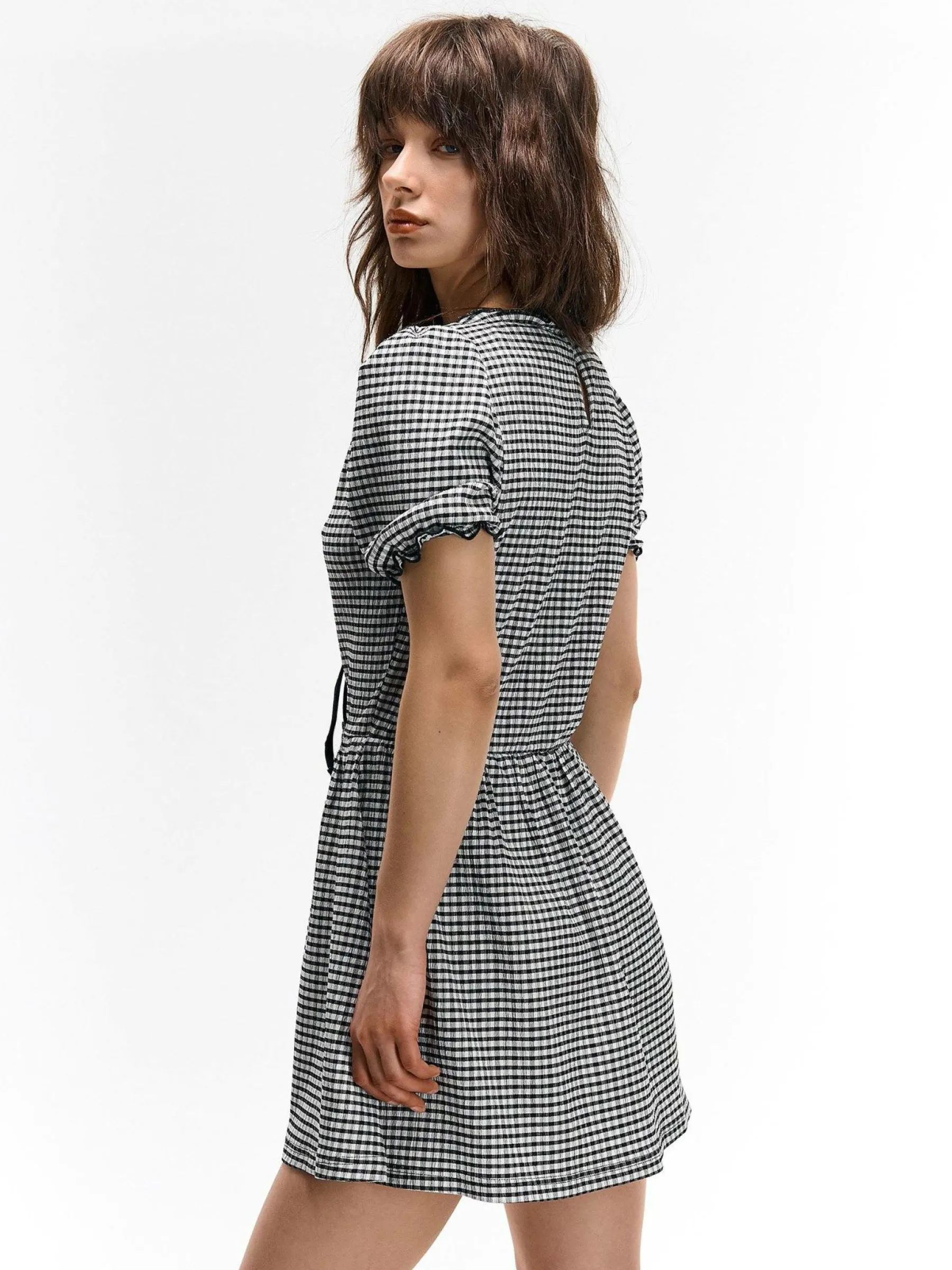 Kolor: czarnyKrój: z falbanąTyp: kombinezonRekaw: krótki rękawDługość: krótkiPattern style: w kratkęDetal: v-ne…