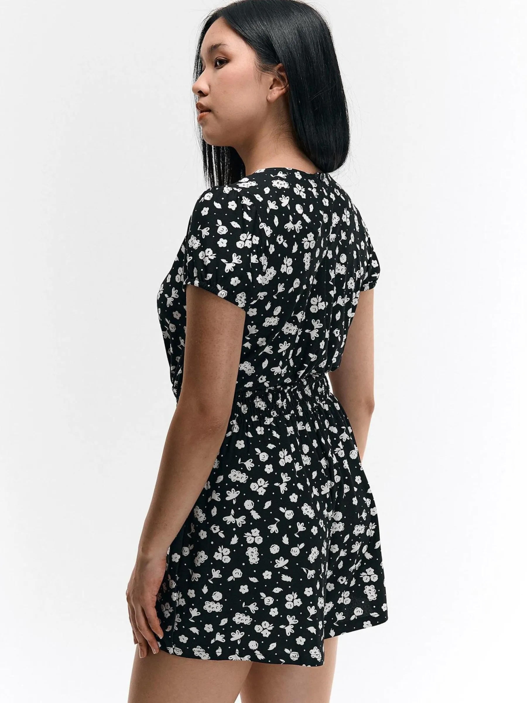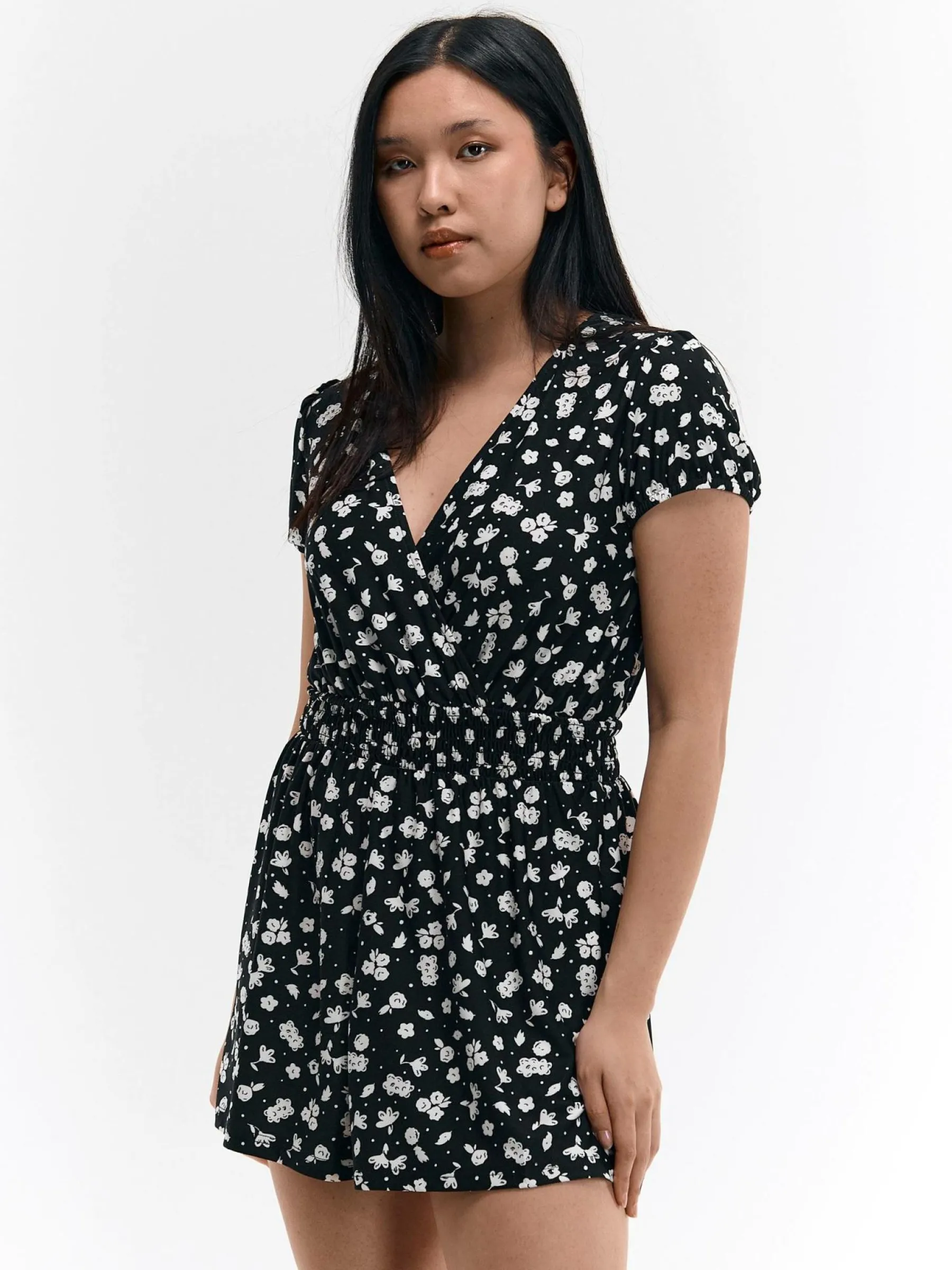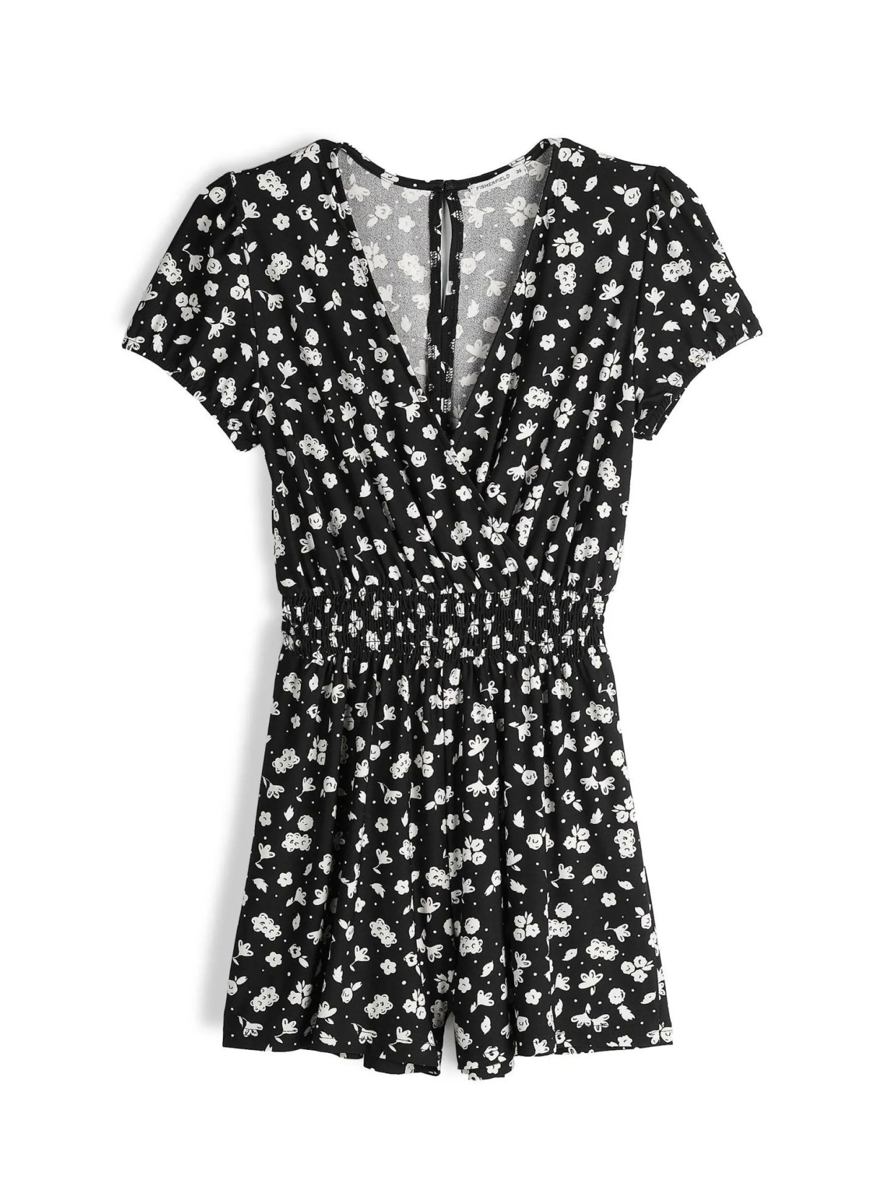 Kolor: czarnyKrój: kopertówkiTyp: kombinezonRekaw: krótki rękawDługość: krótkiPattern style: kwiatoweDetal: z fa…