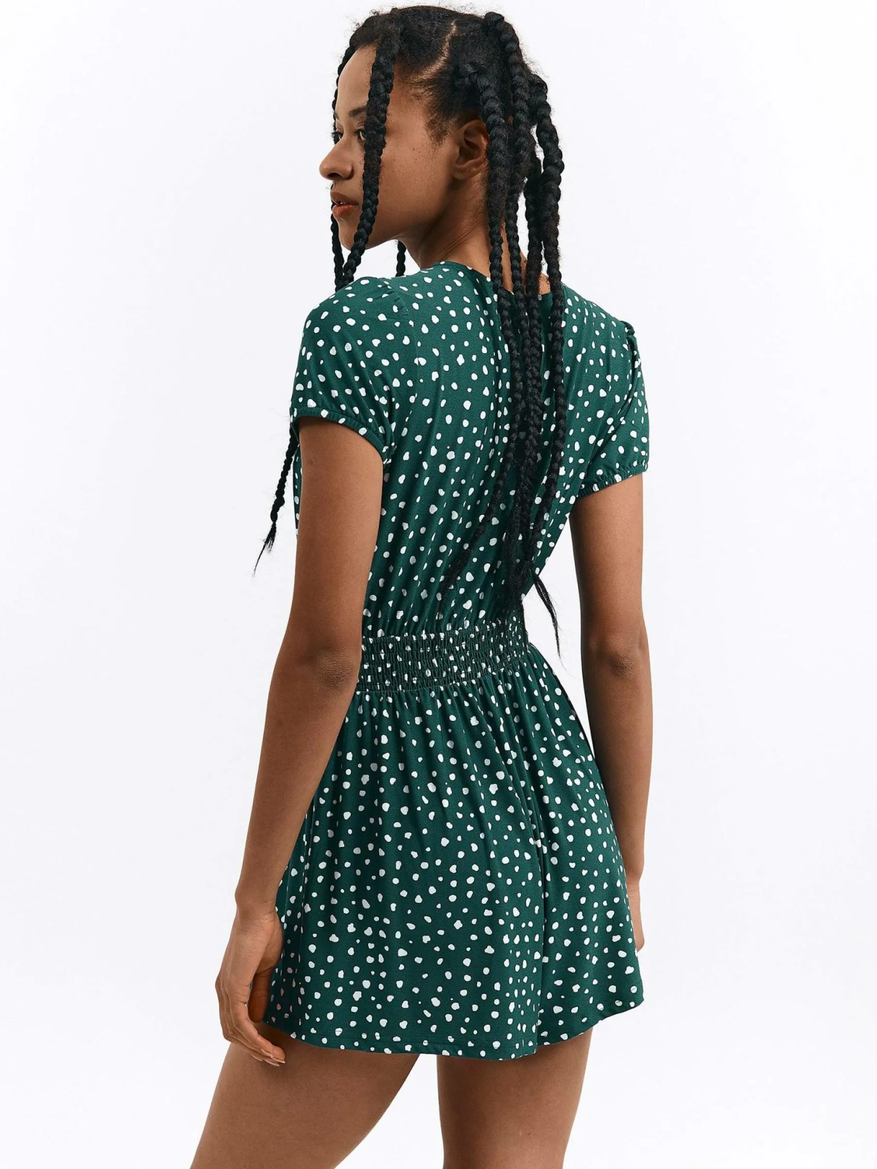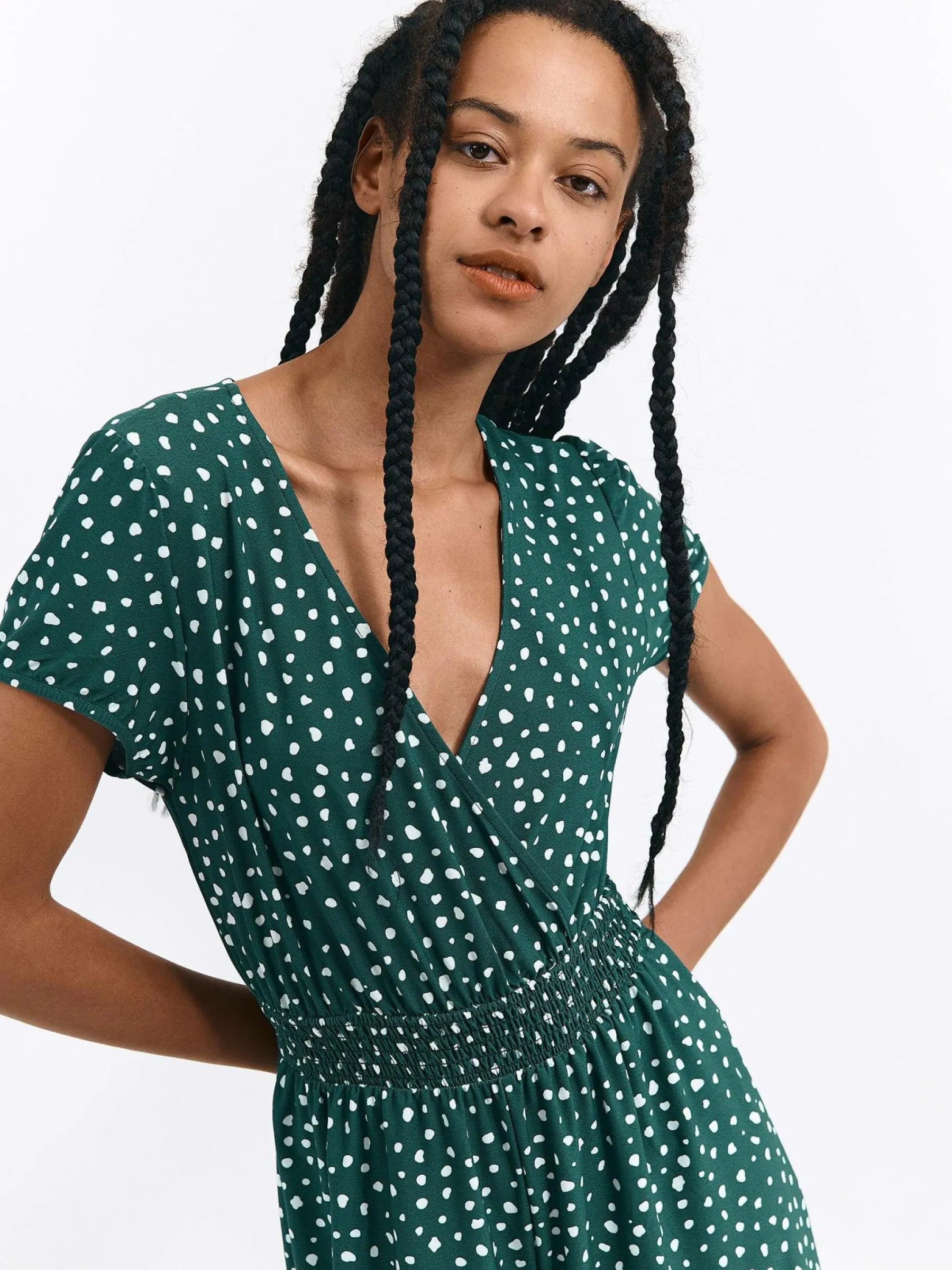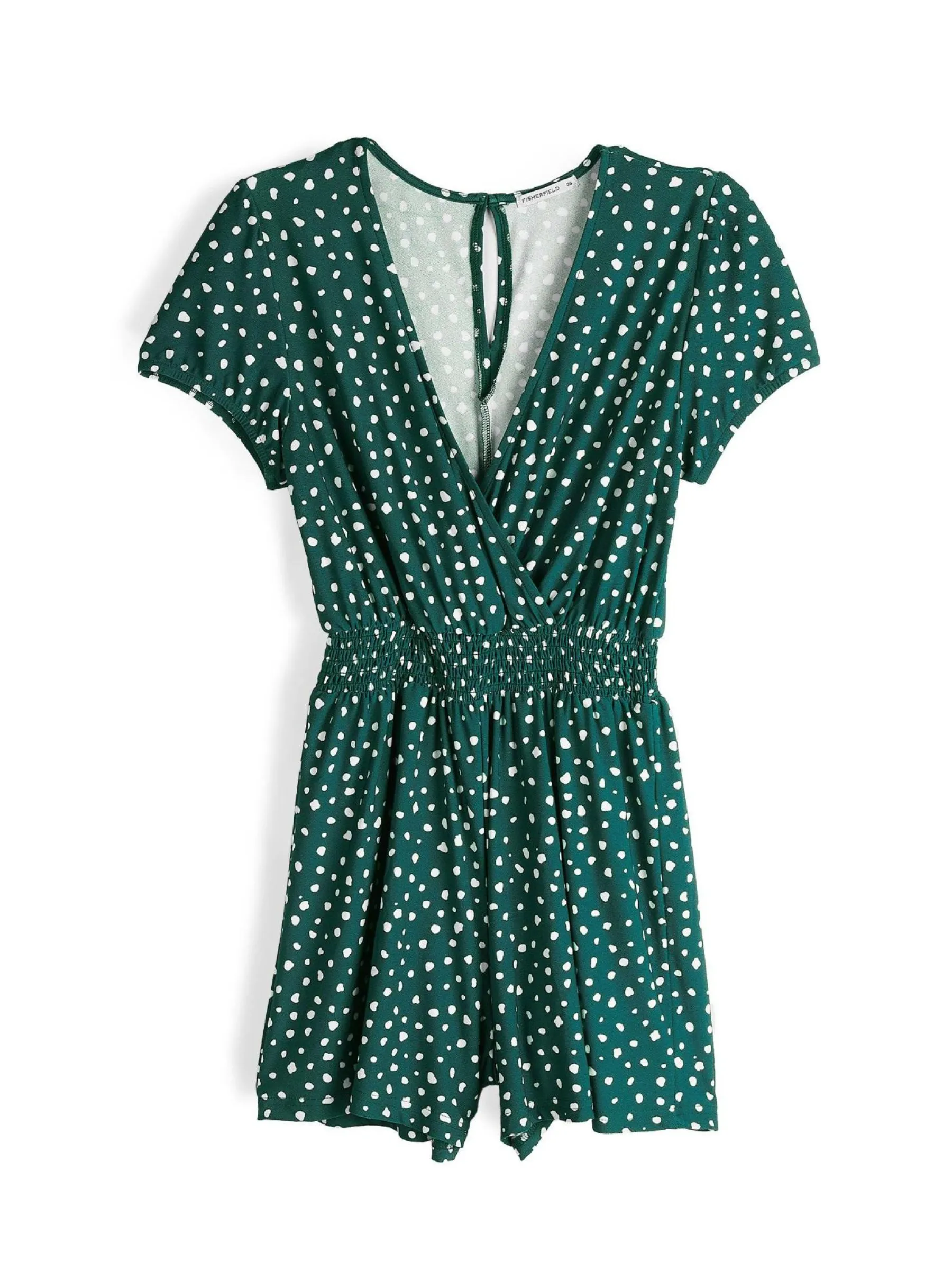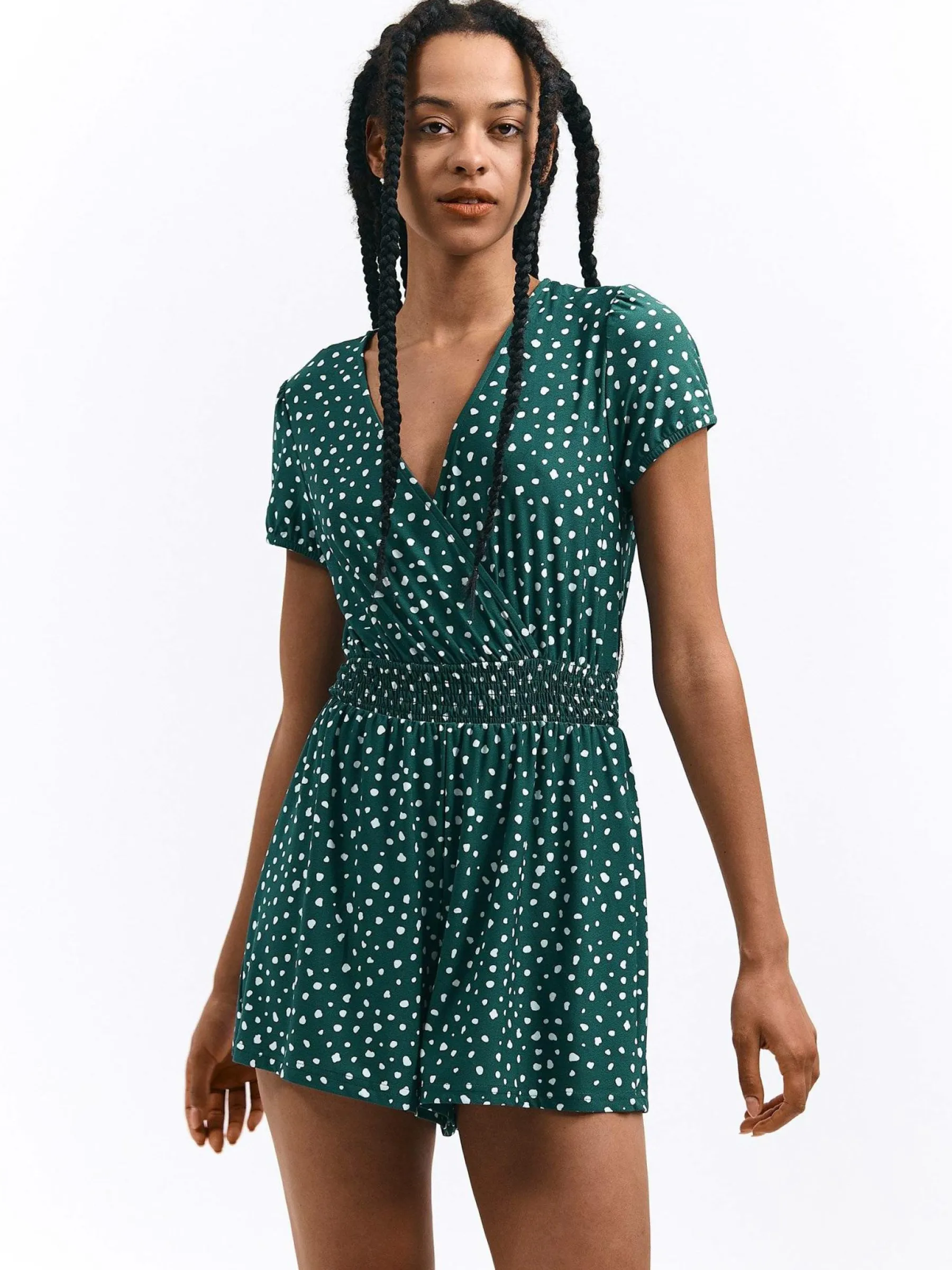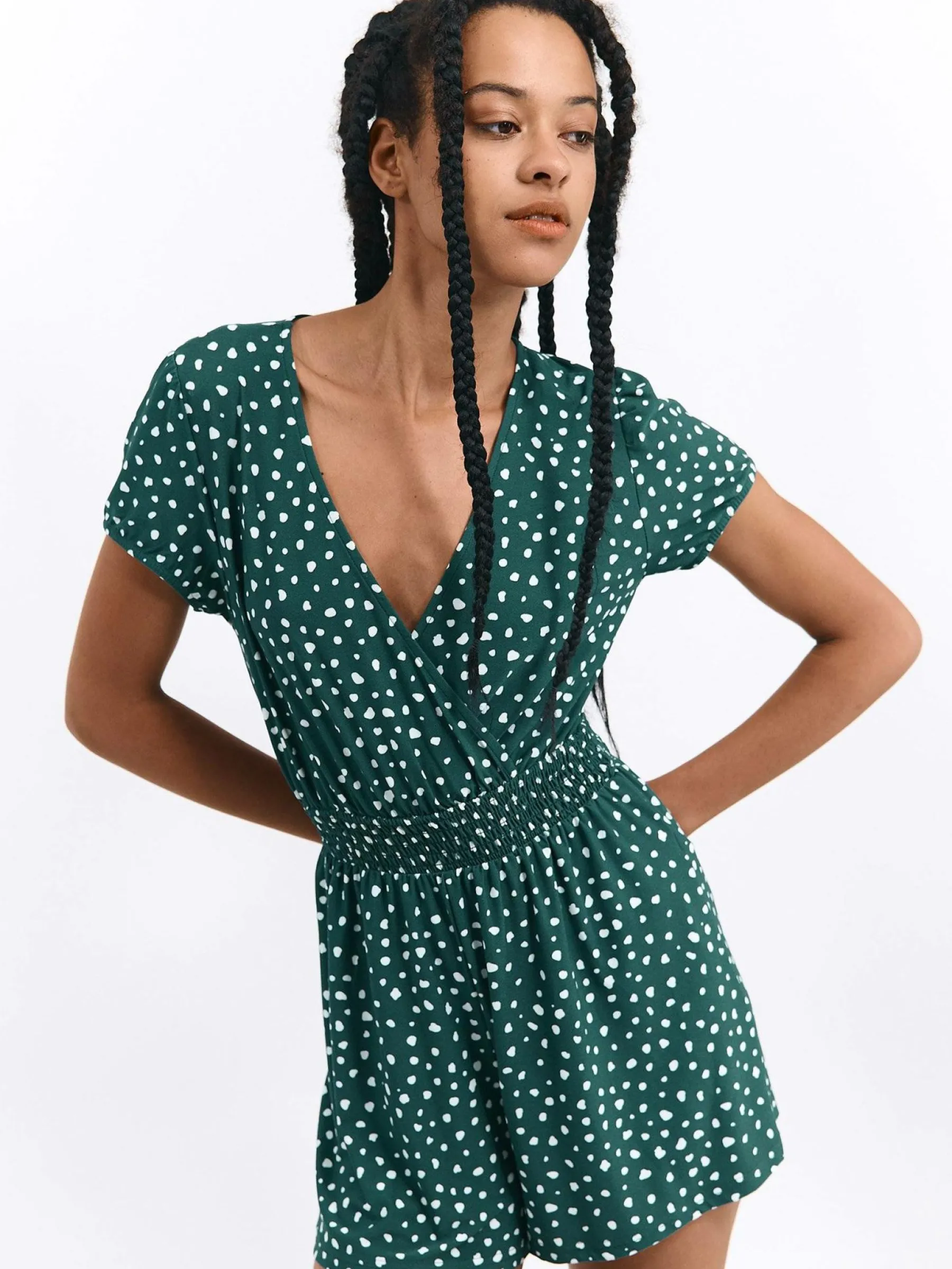 Kolor: zielonyKrój: kopertówkiTyp: kombinezonRekaw: krótki rękawDługość: krótkiPattern style: wzorzysteDetal: z …