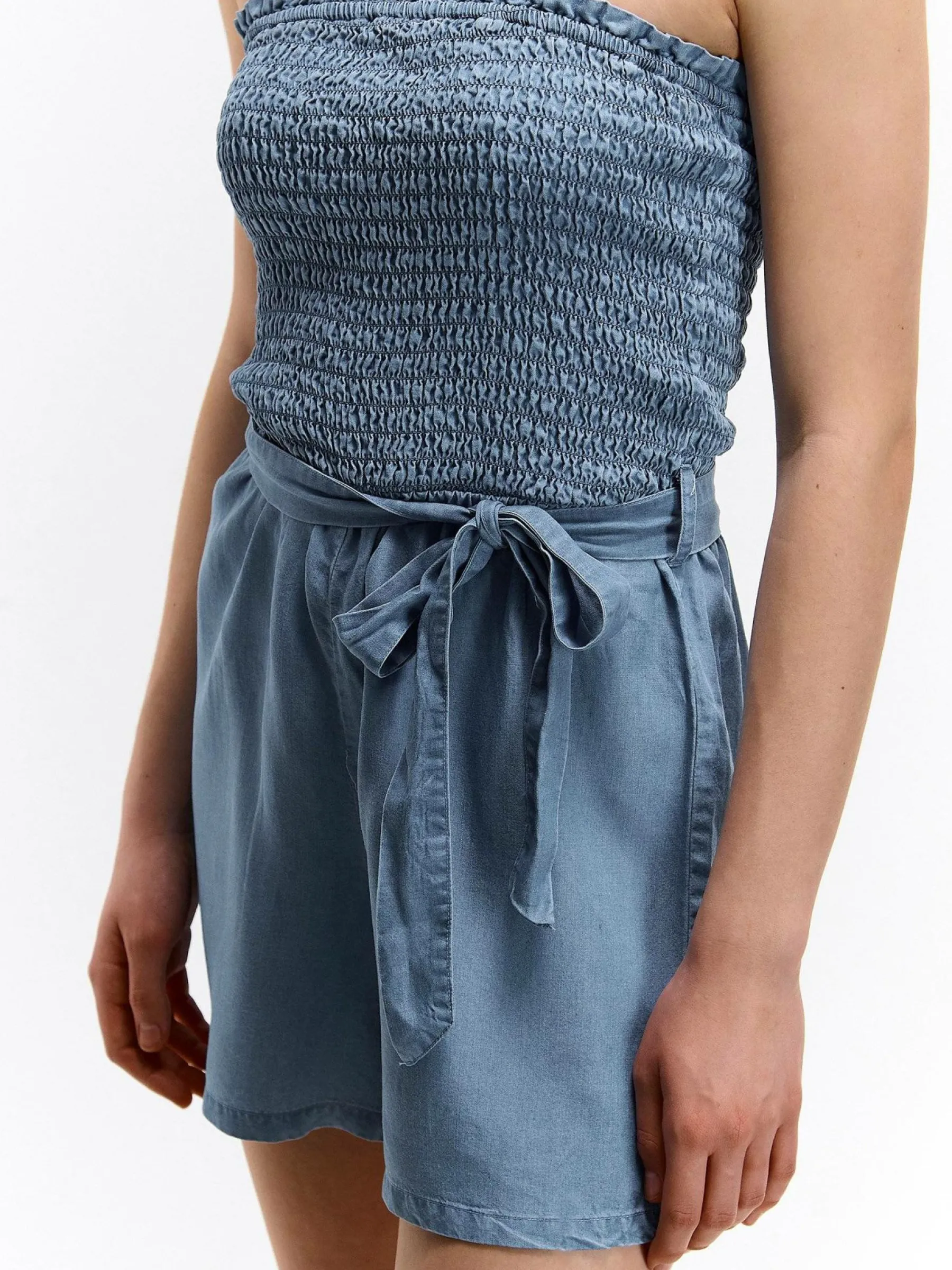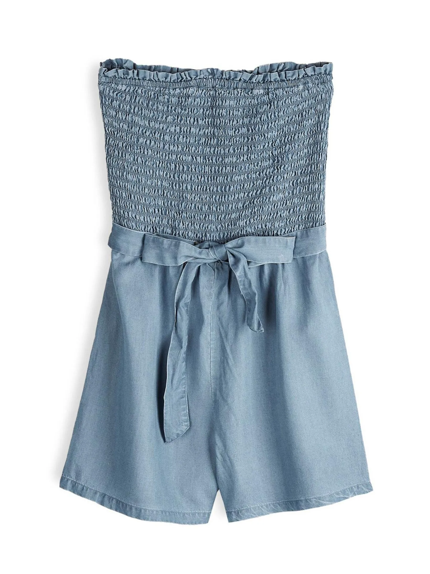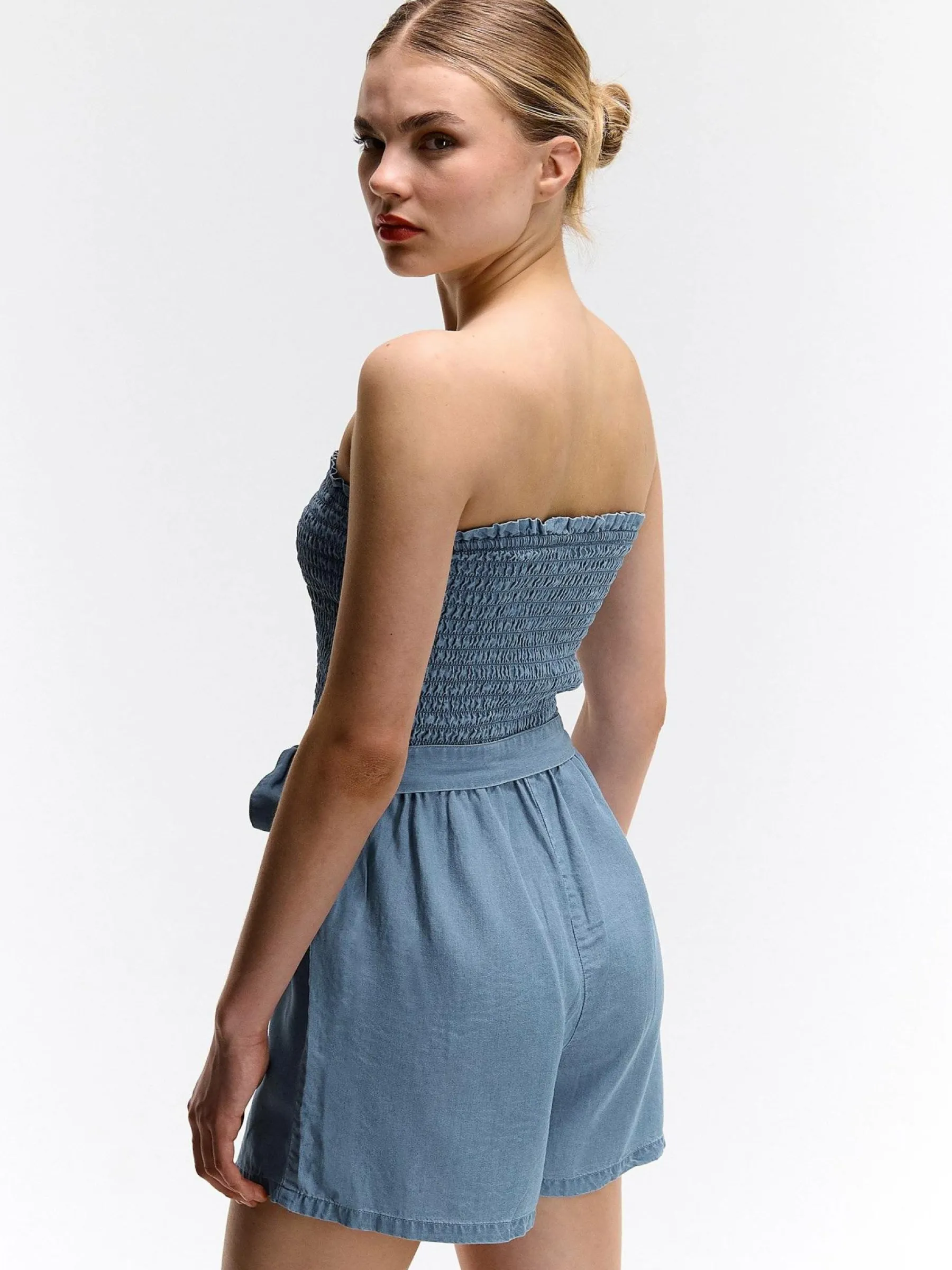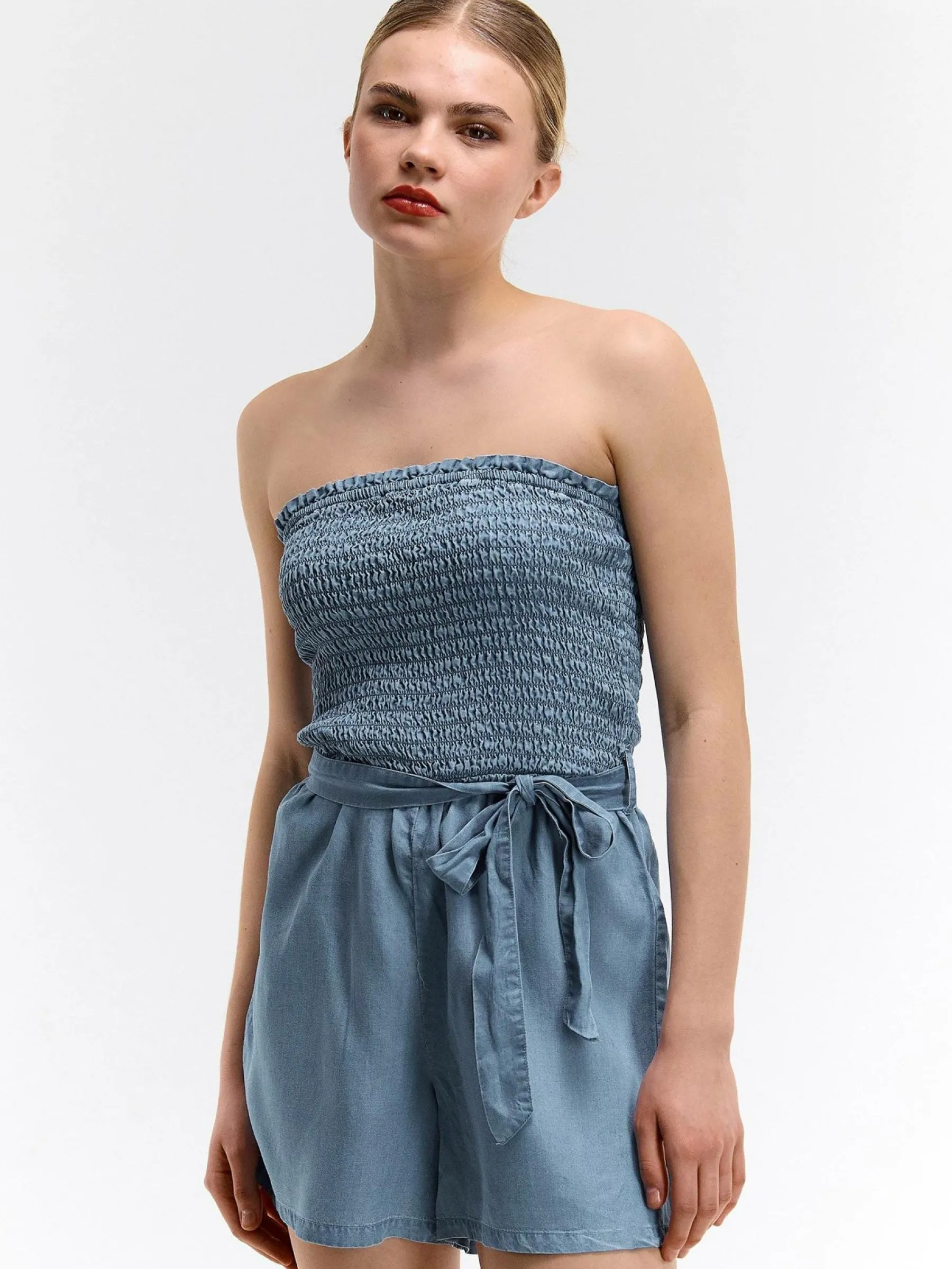 Kolor: niebieskiKrój: z odkrytymi ramionamiTyp: kombinezonRekaw: bez rękawówDługość: krótkiPattern style: pojedyn…