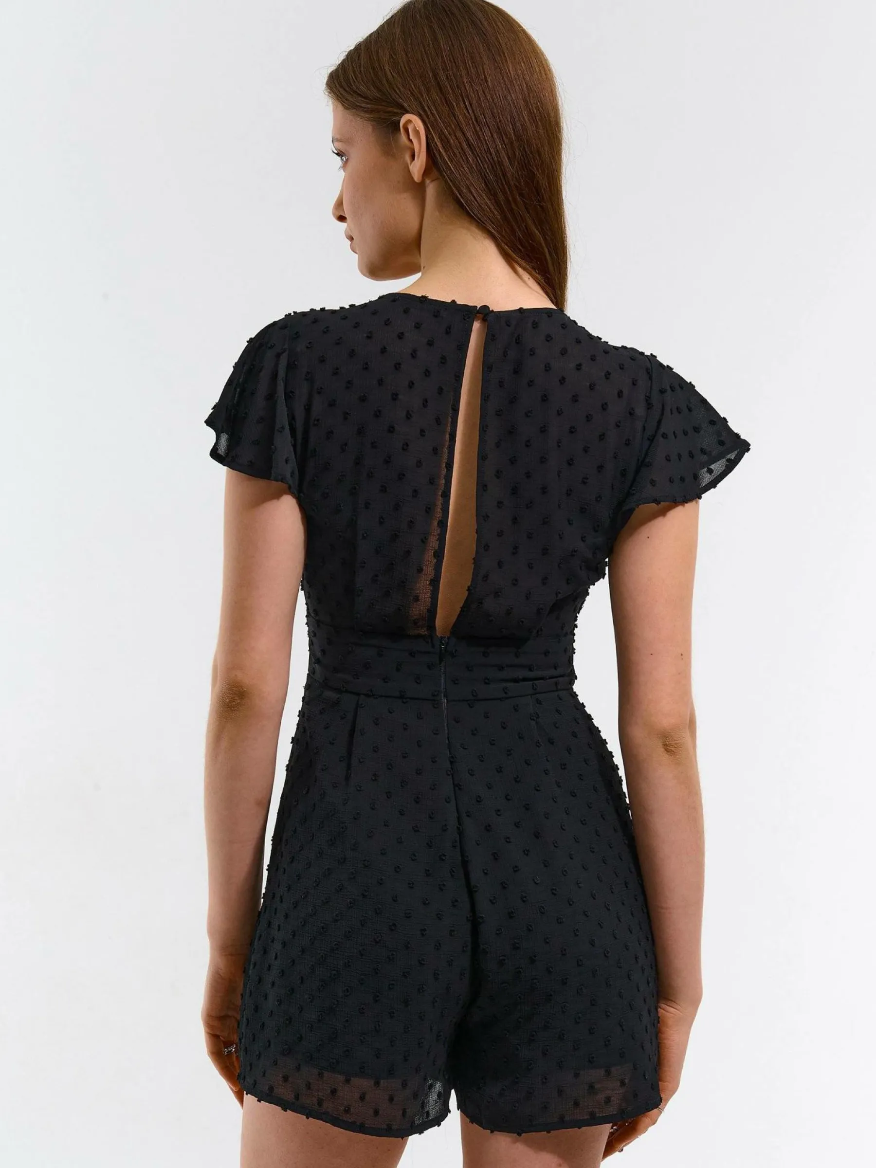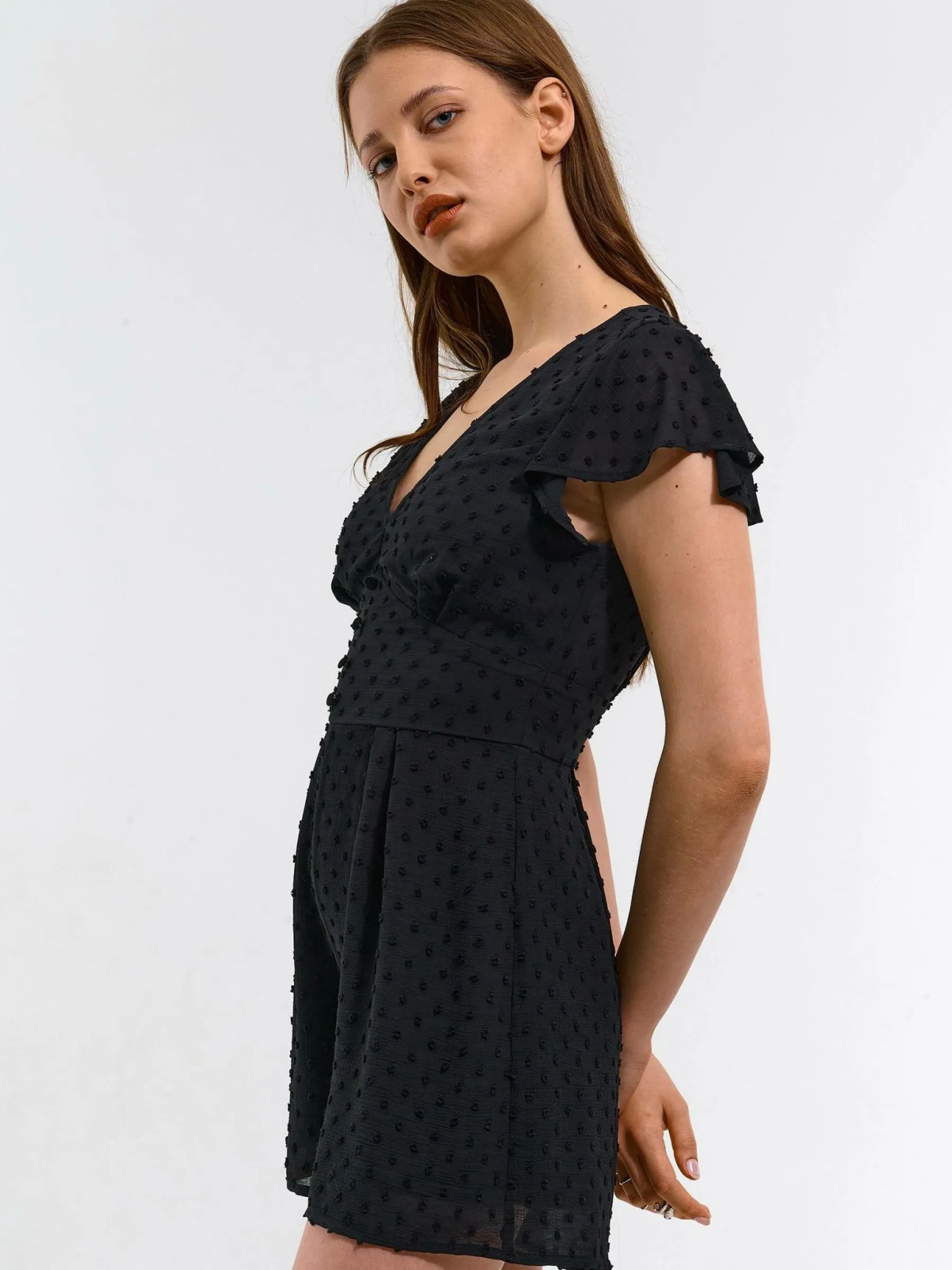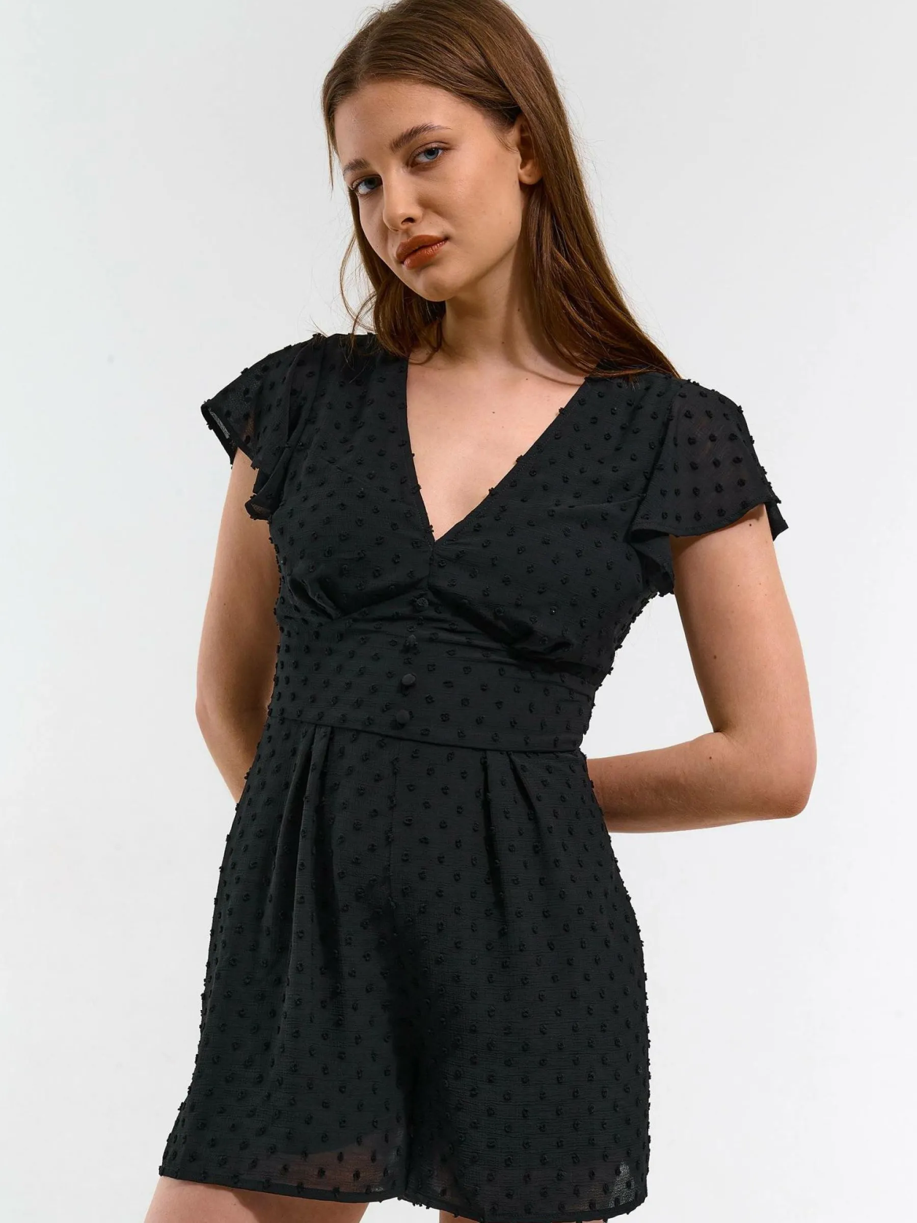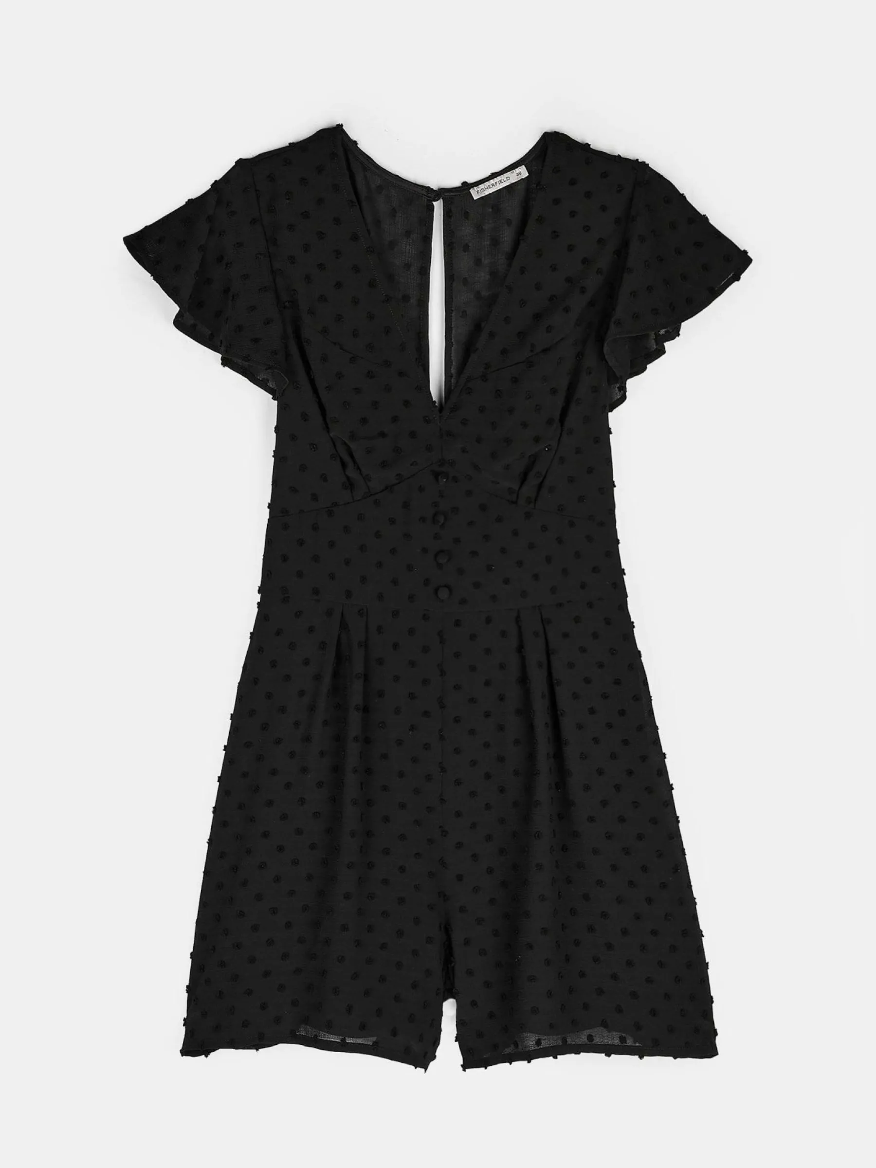 Kolor: czarnyKrój: z falbanąTyp: kombinezonRekaw: krótki rękawDługość: krótkiPattern style: pojedynczy kolor, w …
