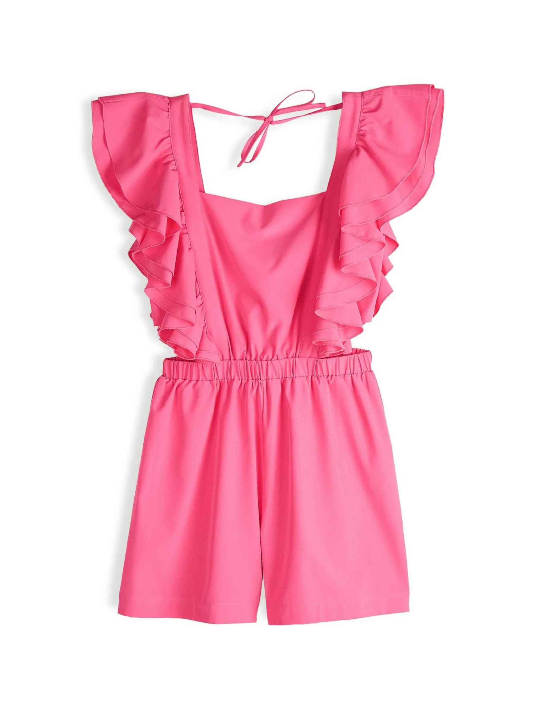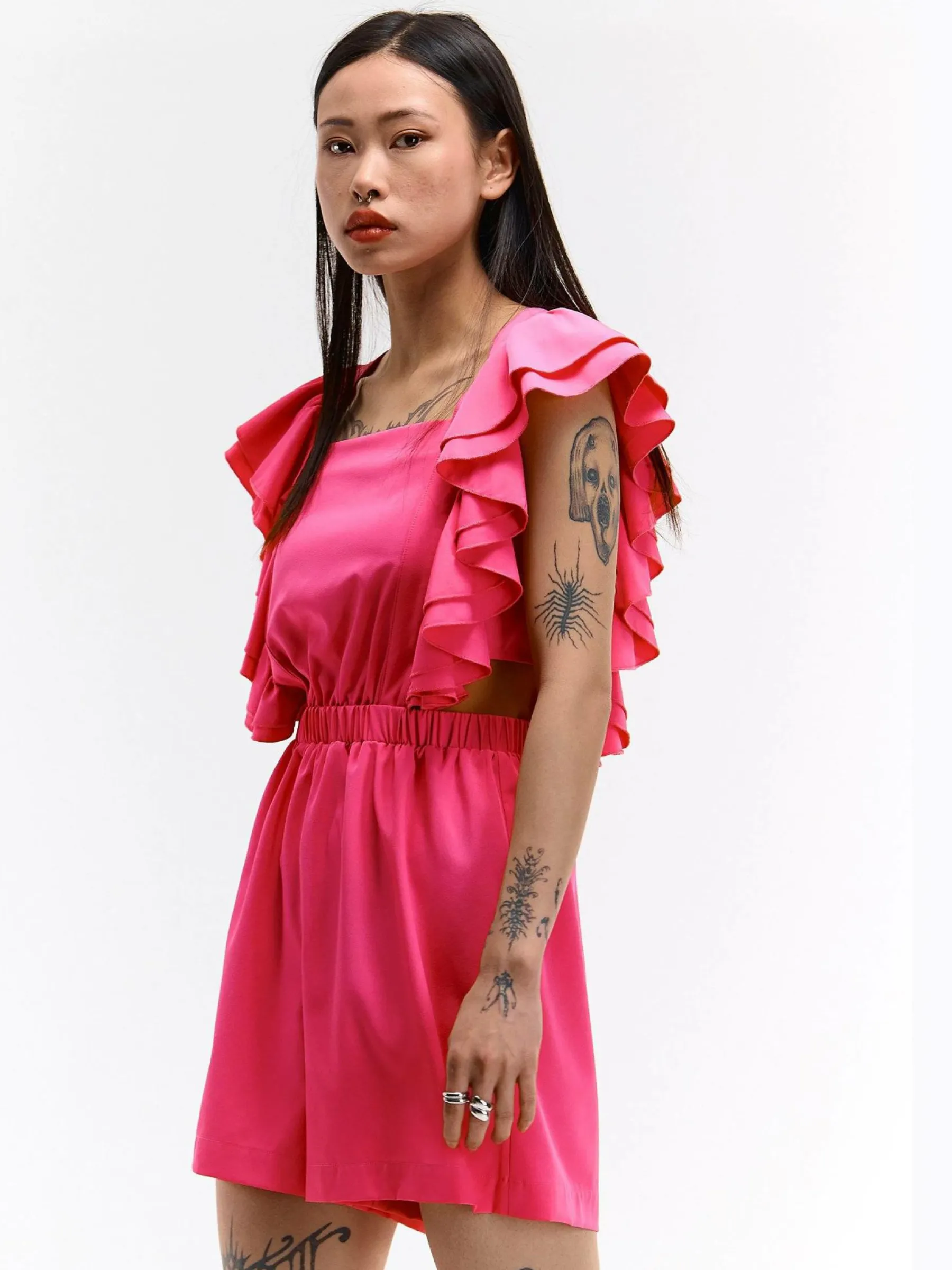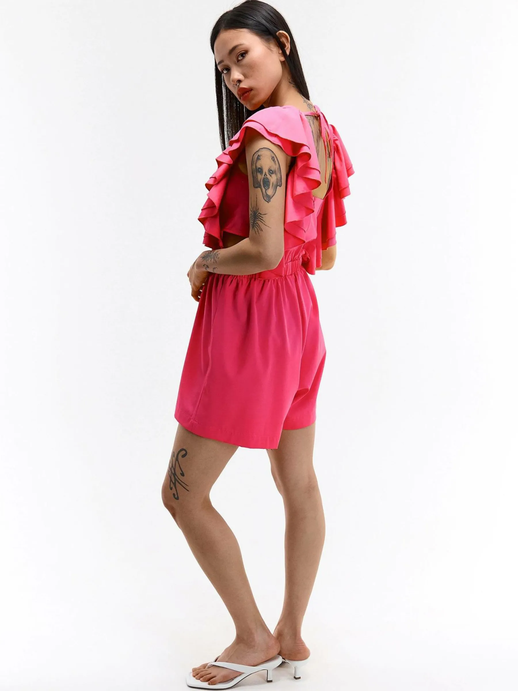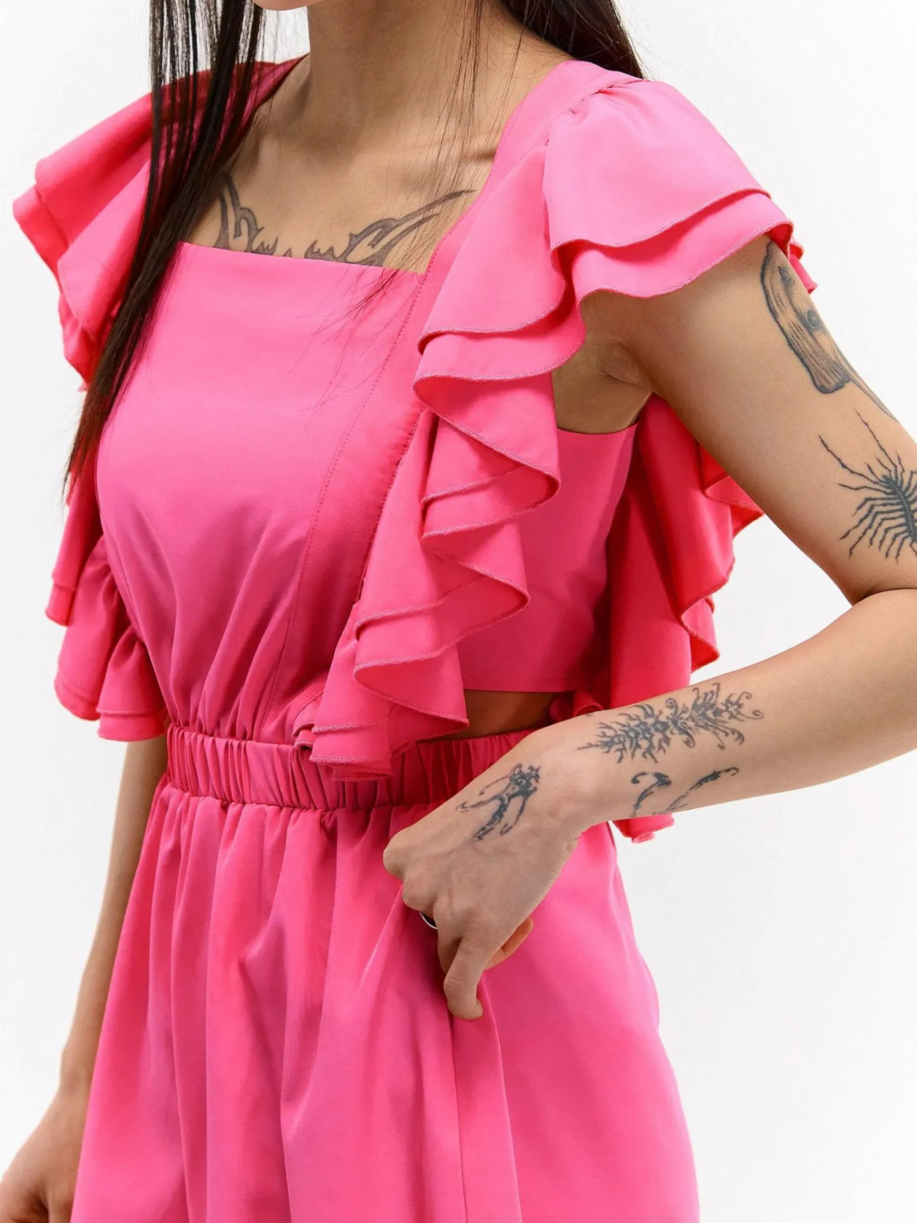 Kolor: różowyKrój: z falbanąTyp: kombinezonDługość: krótkiPattern style: pojedynczy kolorDetal: z wiązaniem na …