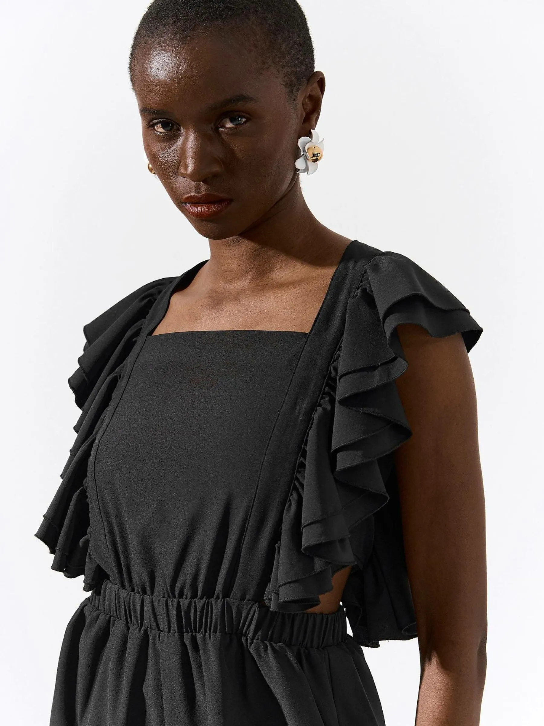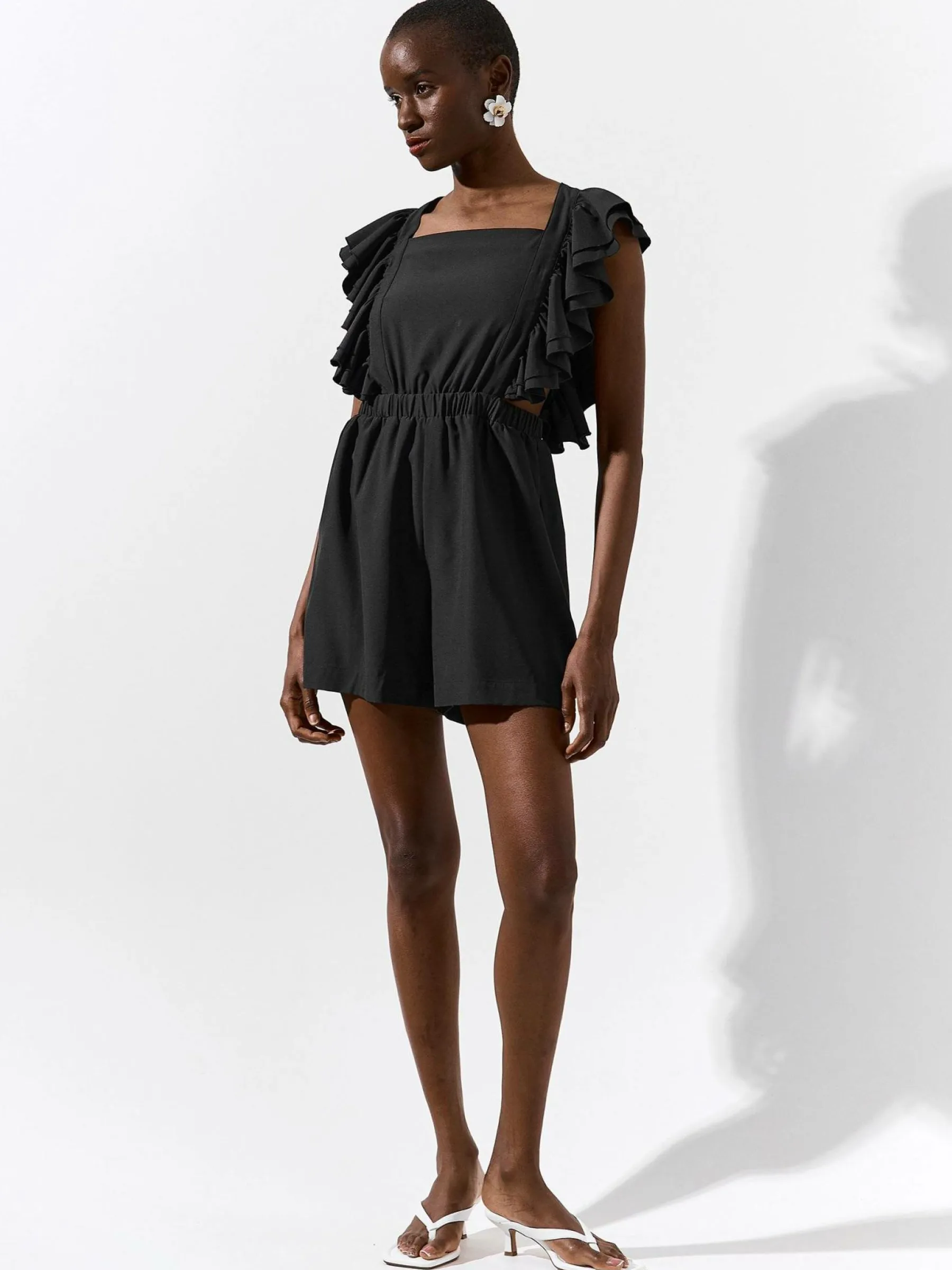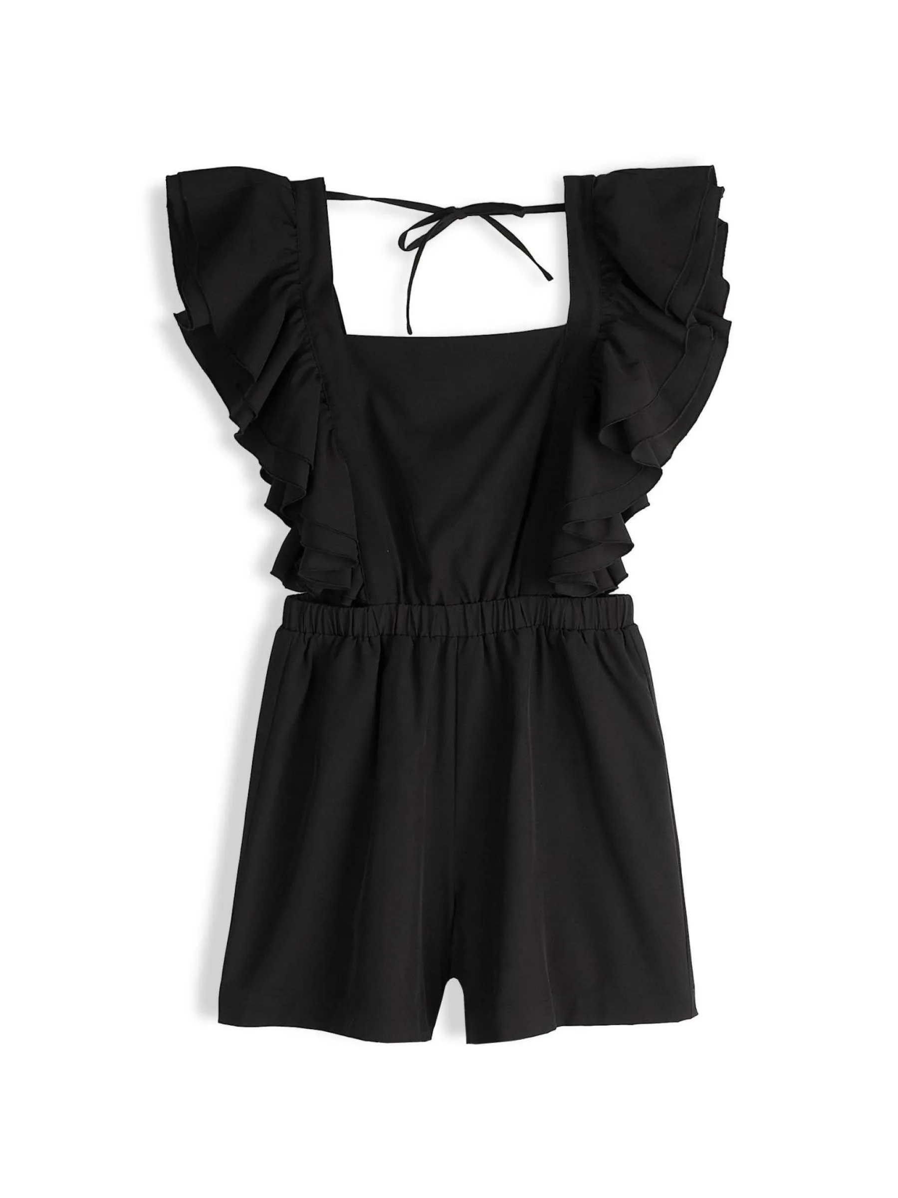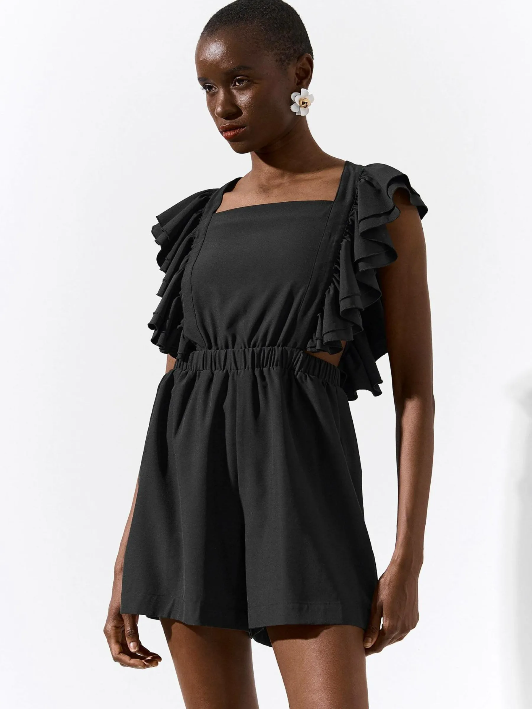 Kolor: czarnyKrój: z falbanąTyp: kombinezonDługość: krótkiPattern style: pojedynczy kolorDetal: z wiązaniem na sz…